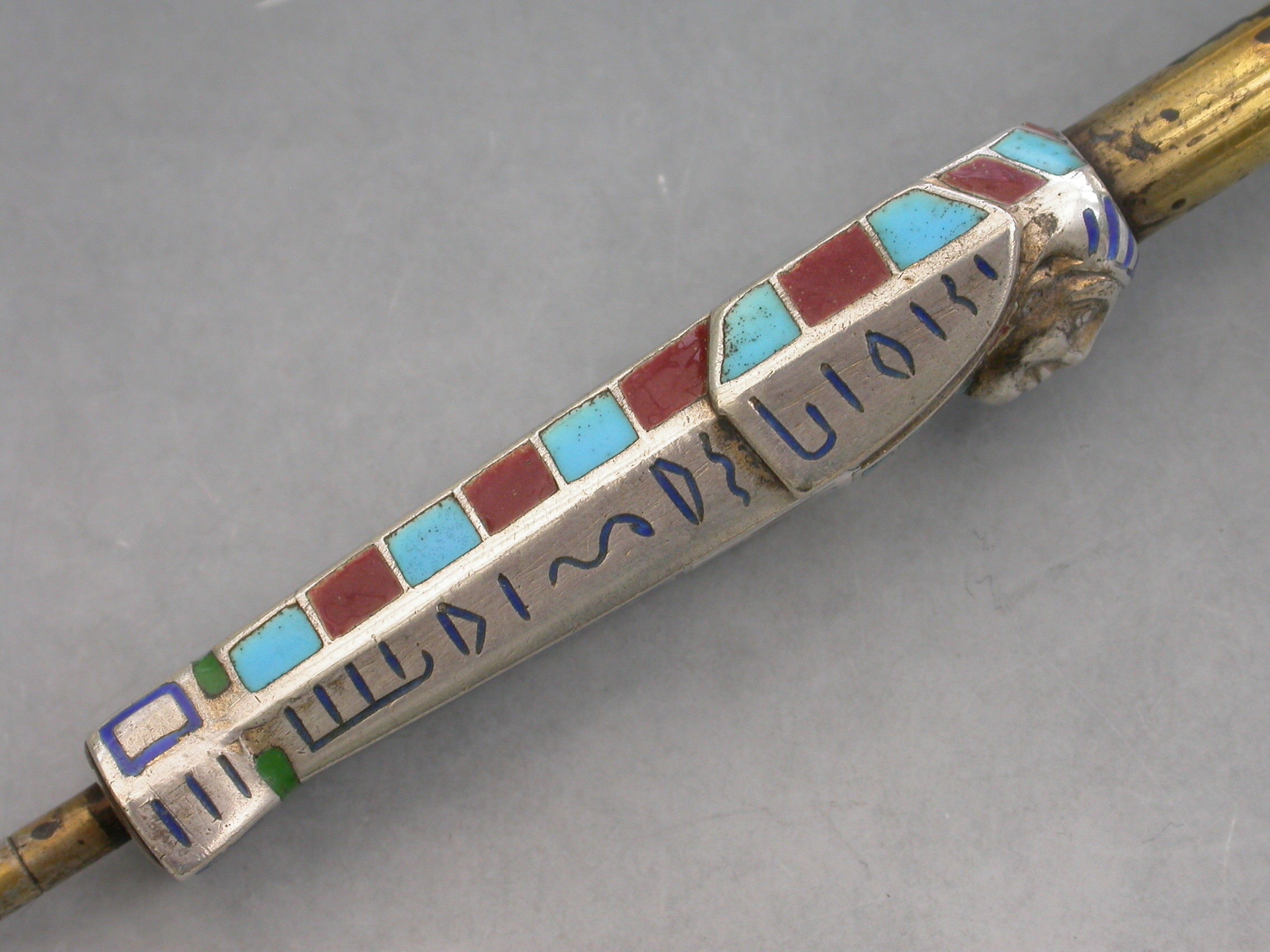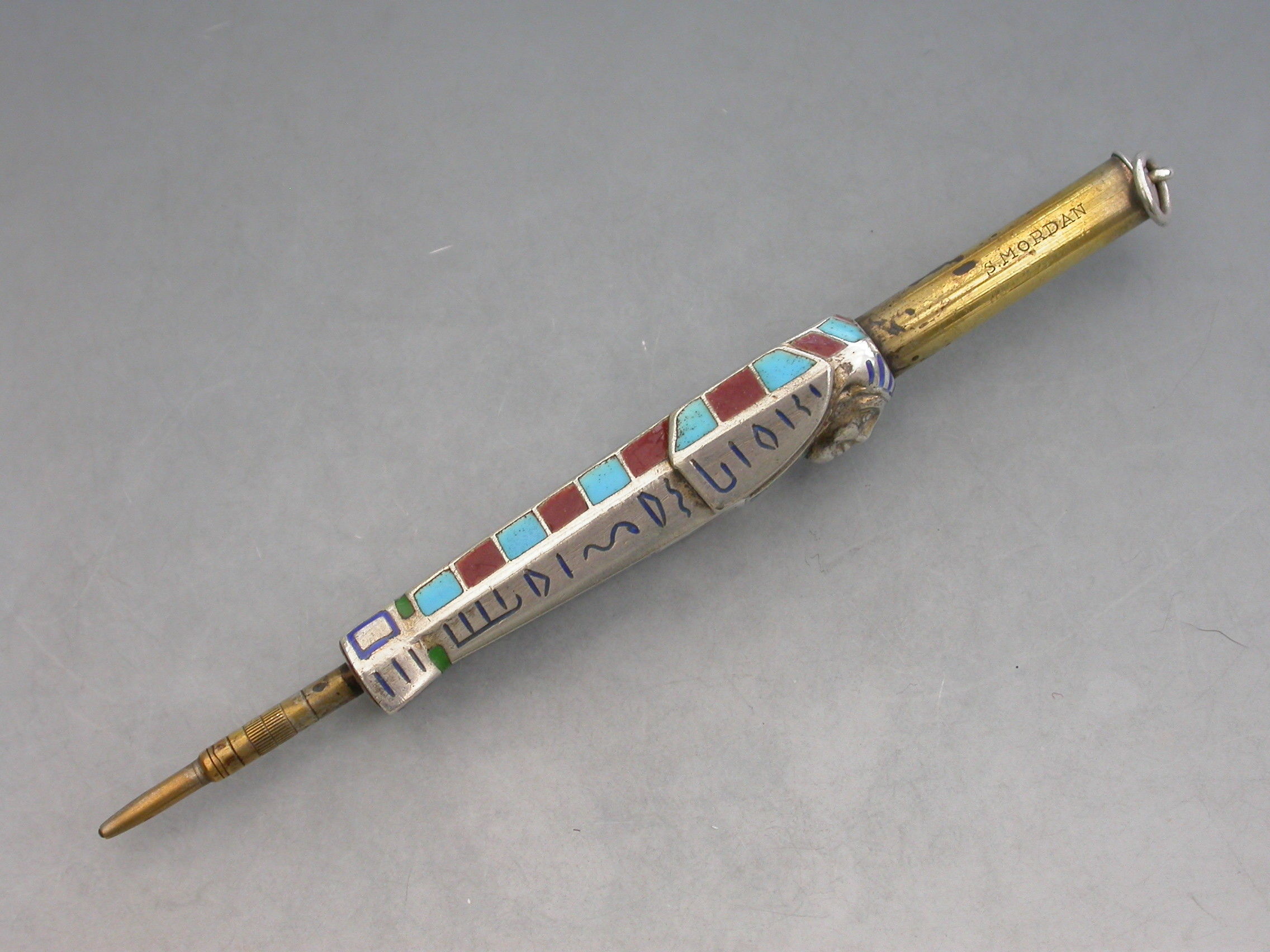 Victorian and early 20th century novelty Propelling Pencils with Egyptian influences made in the form of Pharaoh's, Mummies or Sarcophagi are quite common. The majority however were made in Continental silver or other base materials, but this example made, or at least retailed by Sampson Mordan is very scarce.