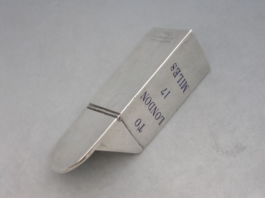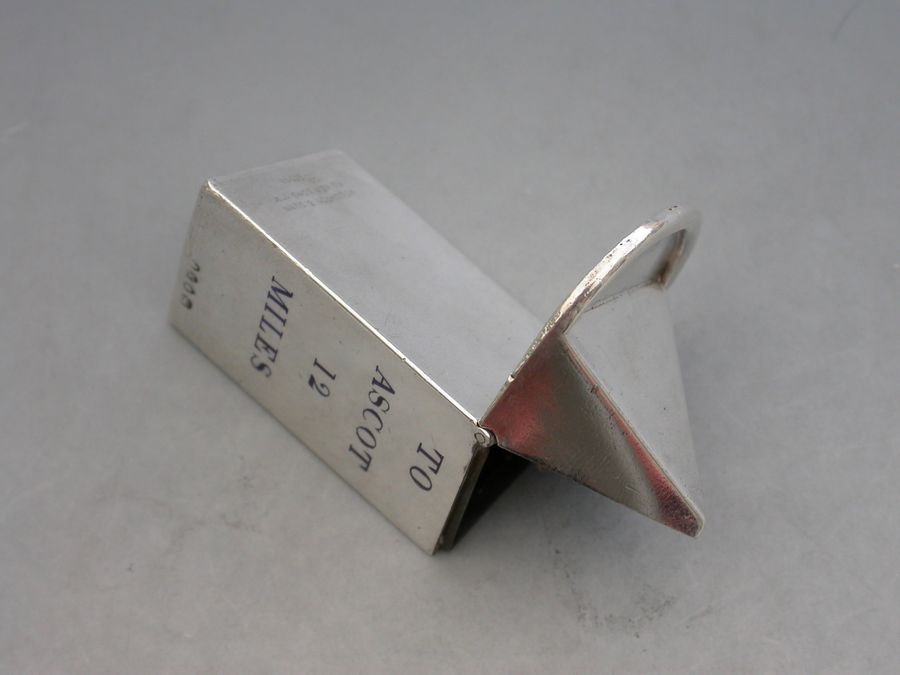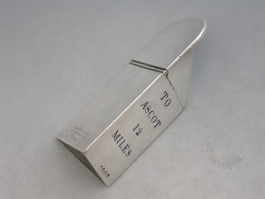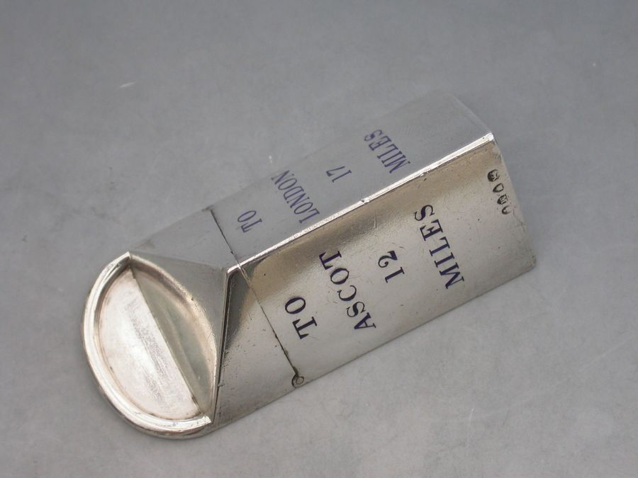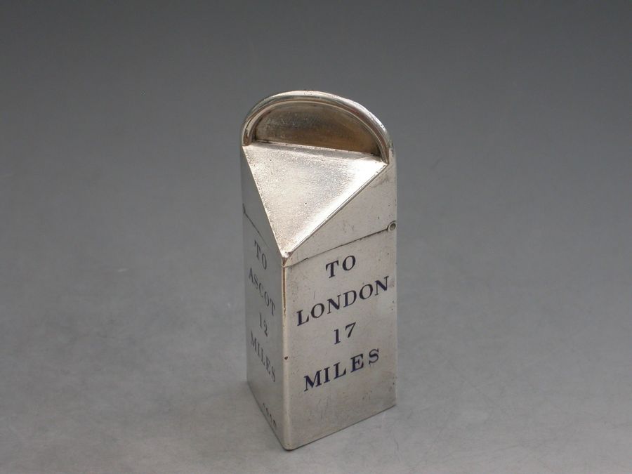 An extremely rare Victorian novelty silver and enamel Vesta Case made in the form of a triangular 'Milestone, with hinged lid and engraved striker to the base. Two sides enamelled with the distances: 'To Ascot 12 Miles' and 'To London 17 miles'.