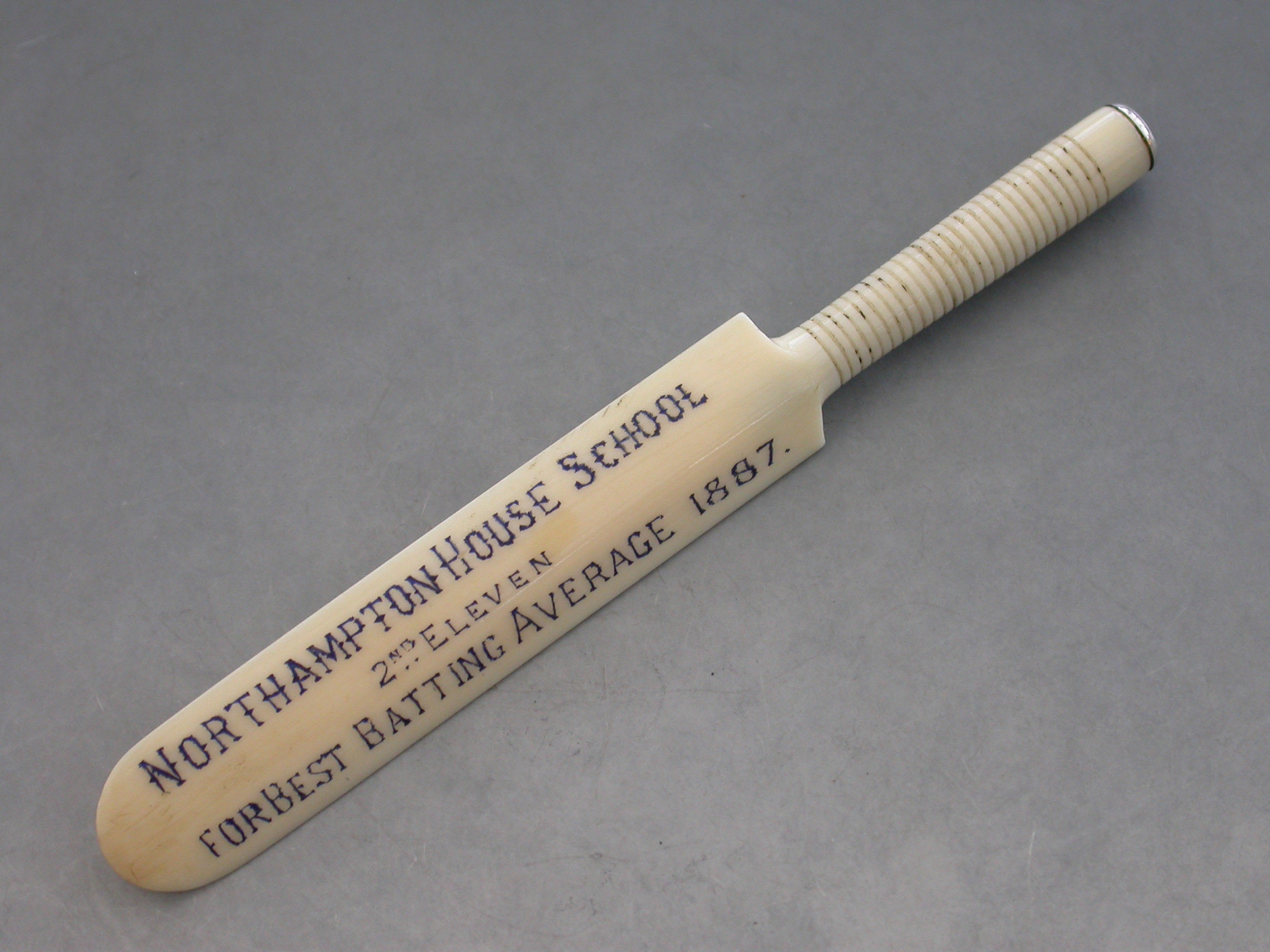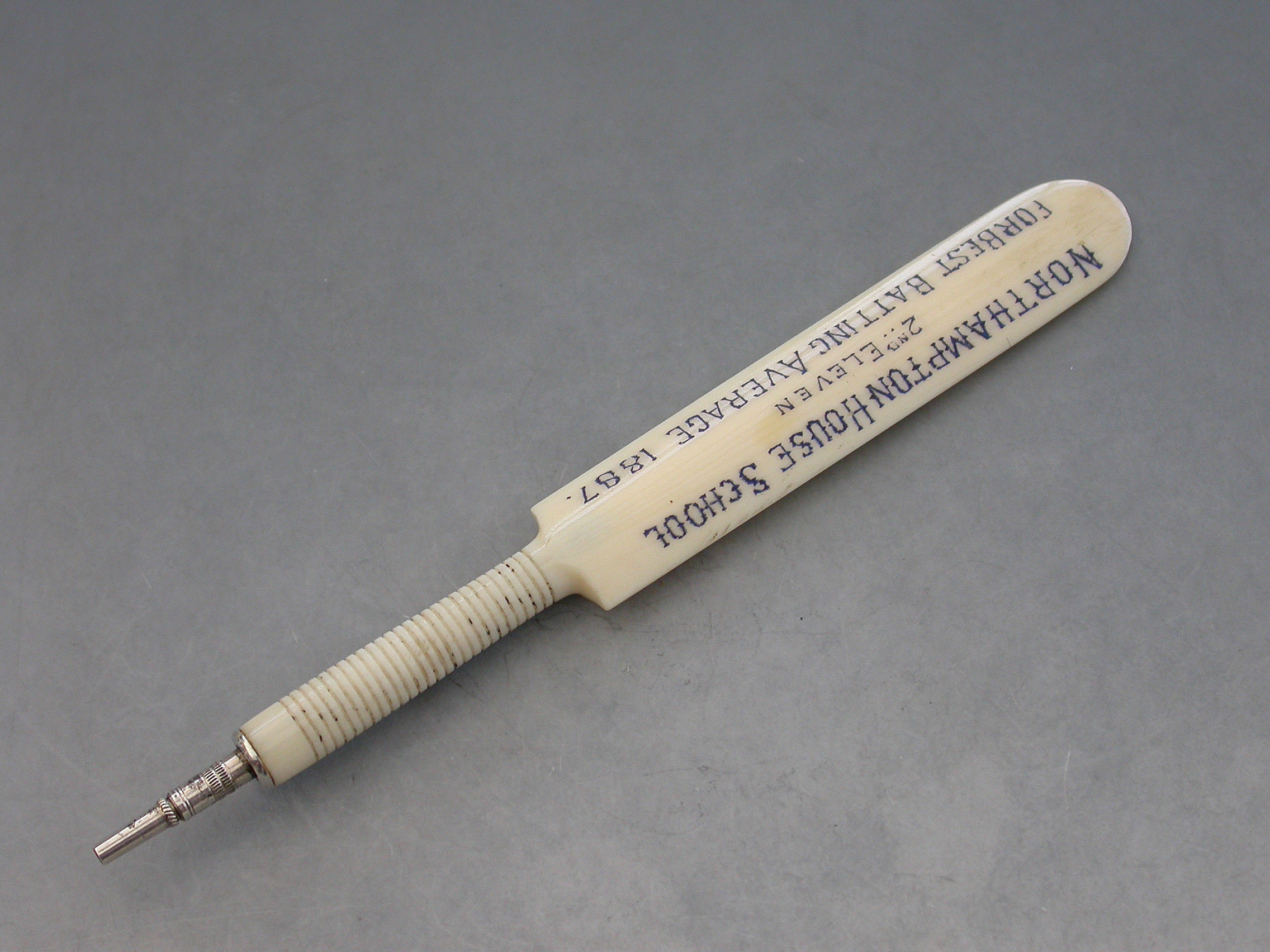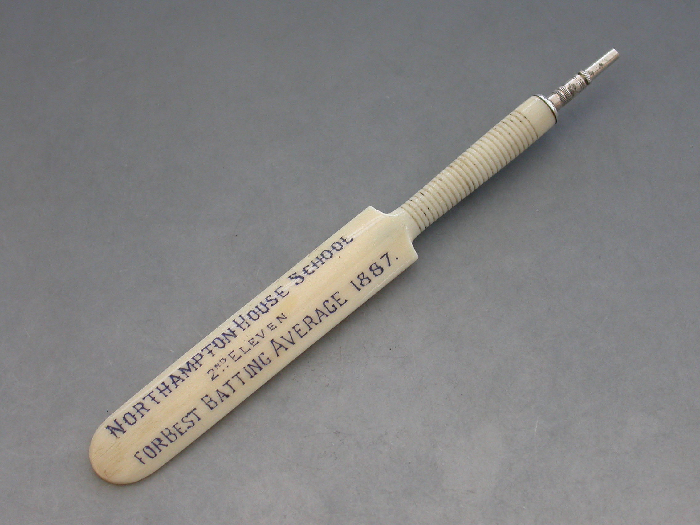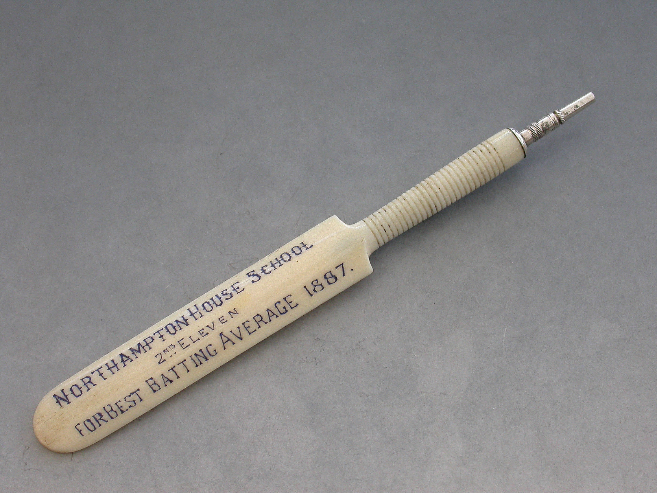 A rare Victorian novelty silver mounted ivory Propelling Pencil made in the form of a cricket bat, the blade incised with presentation inscription : ""Northampton House School, 2nd Eleven, For best batting average 1887"".