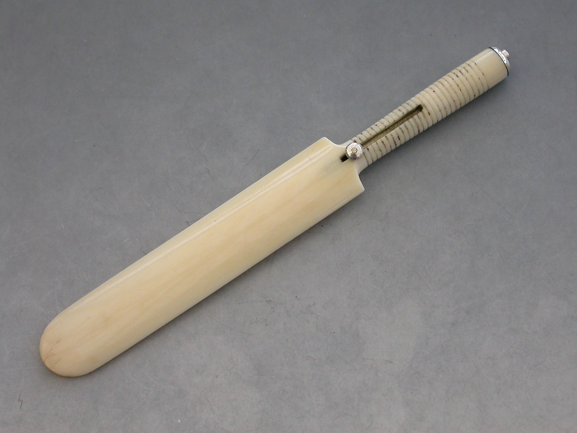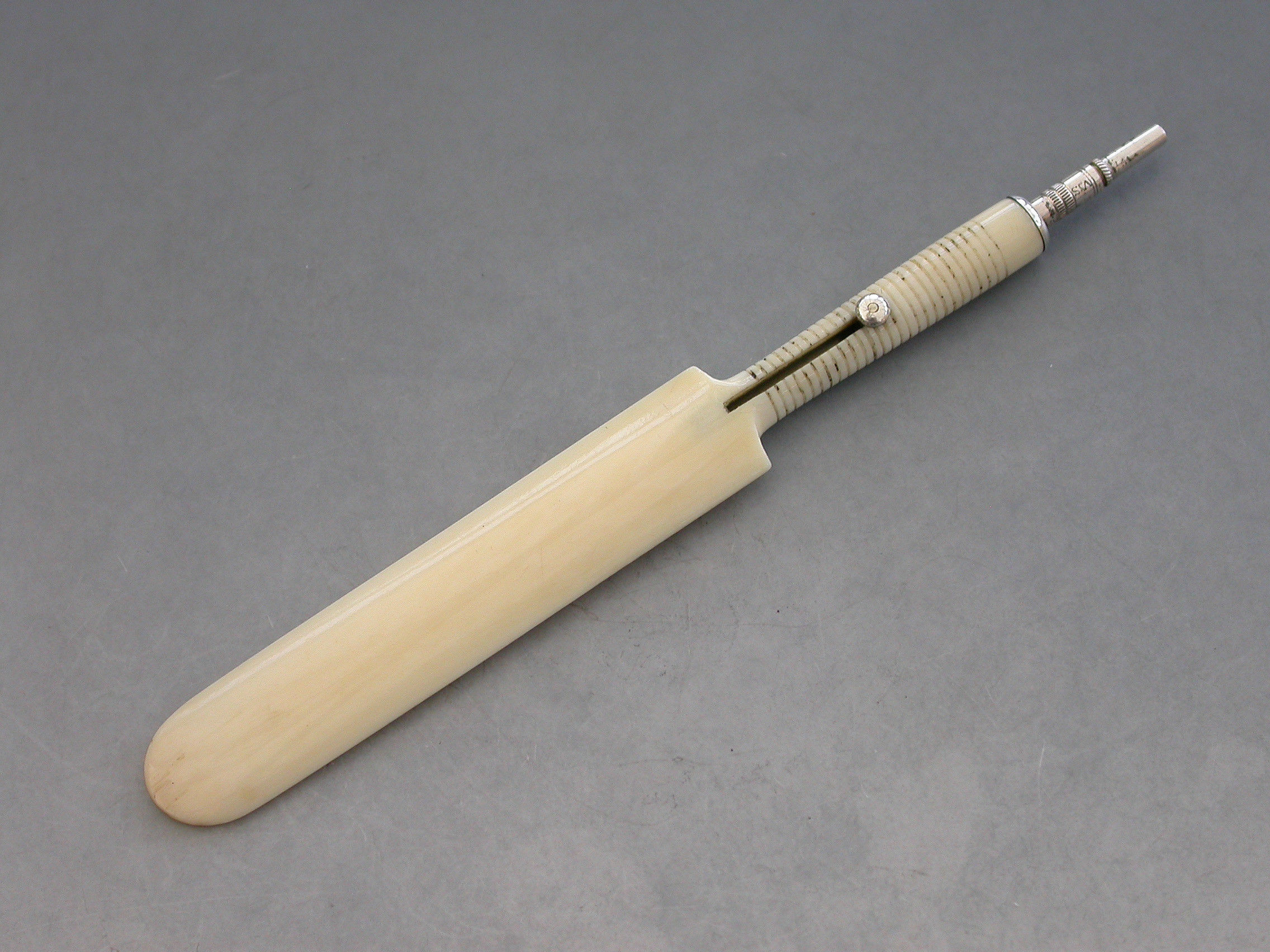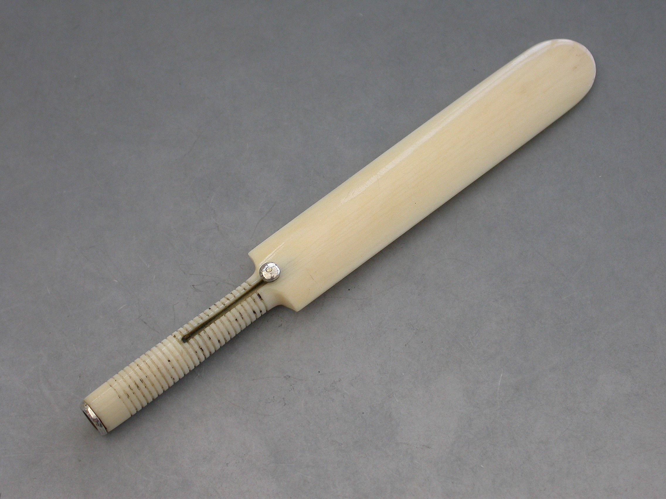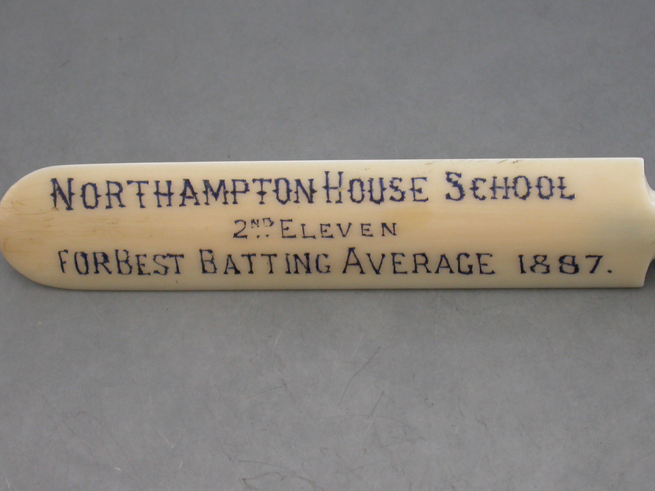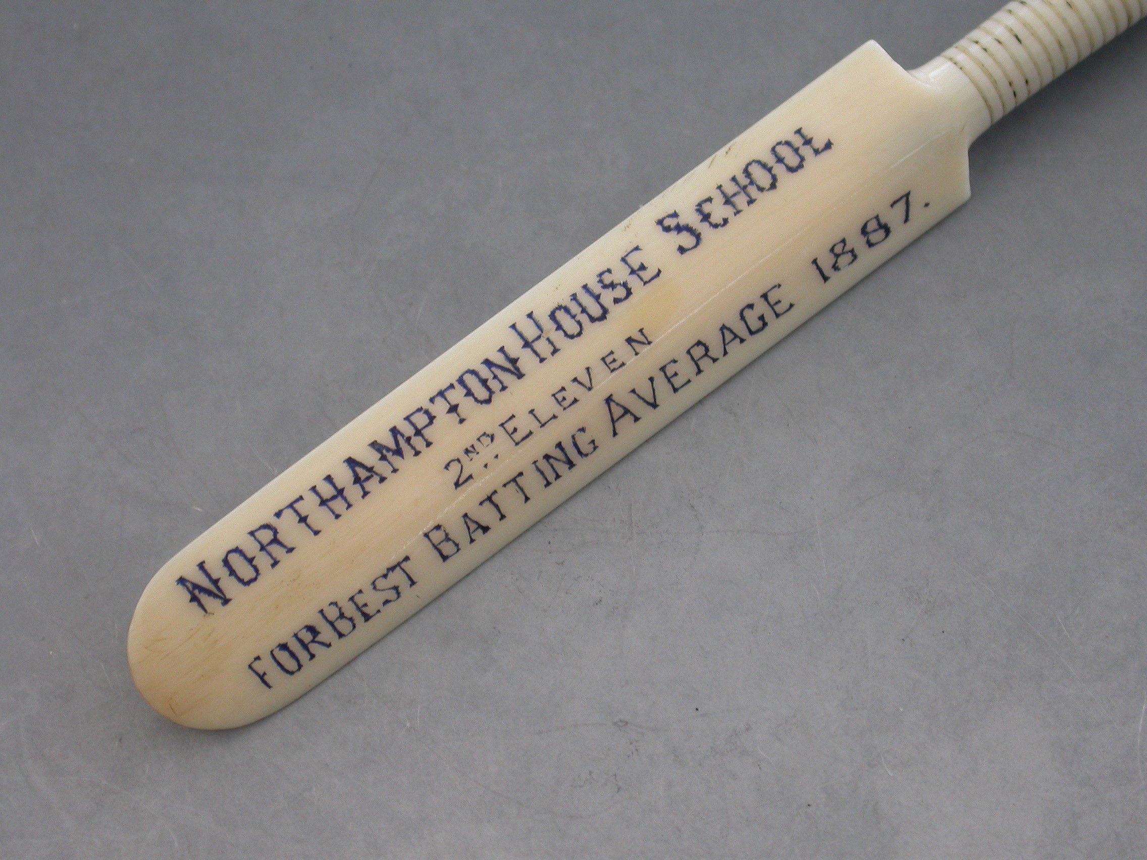 A rare Victorian novelty silver mounted ivory Propelling Pencil made in the form of a cricket bat, the blade incised with presentation inscription : ""Northampton House School, 2nd Eleven, For best batting average 1887"".