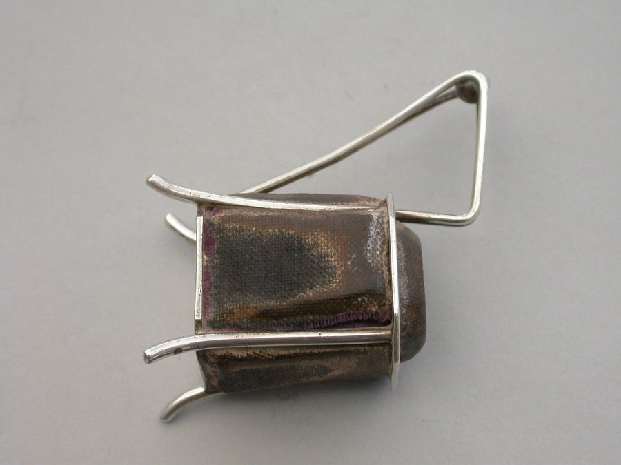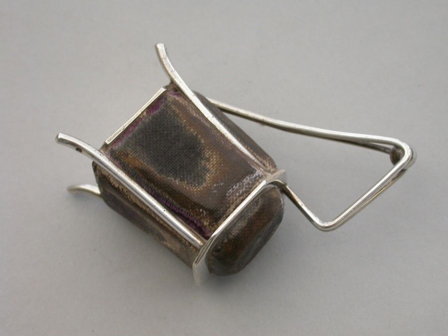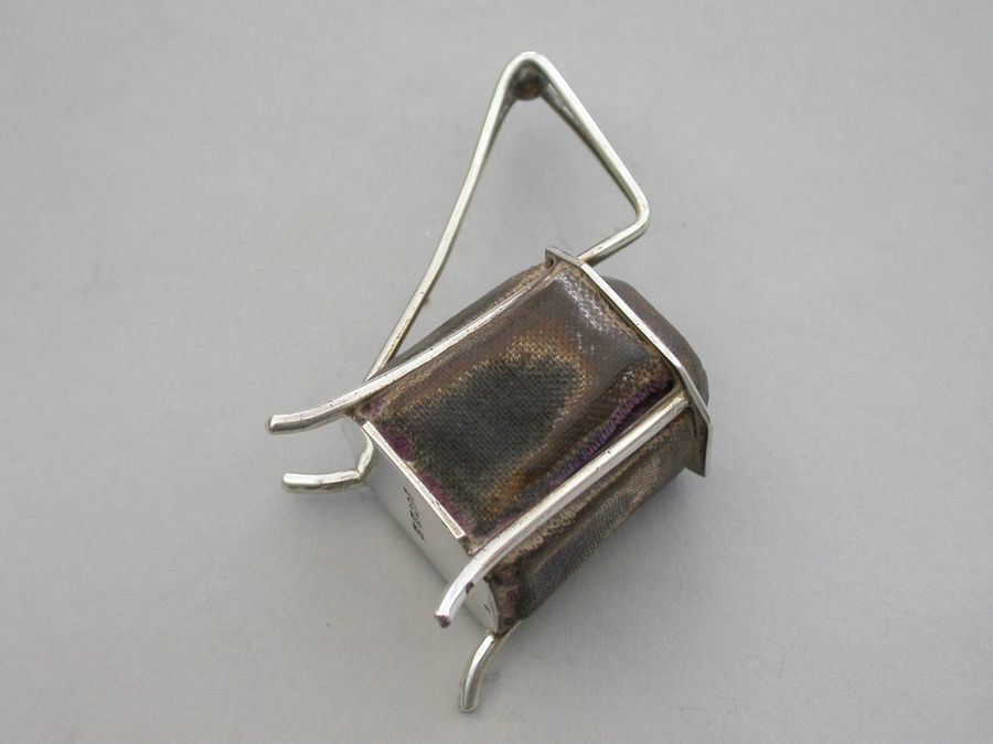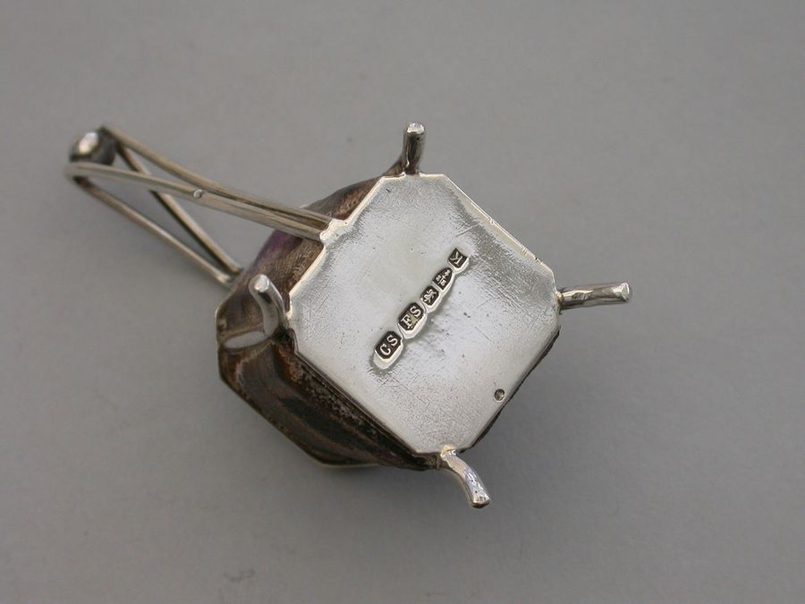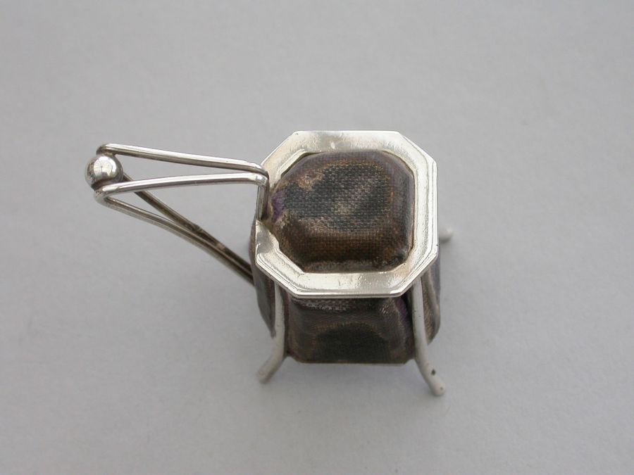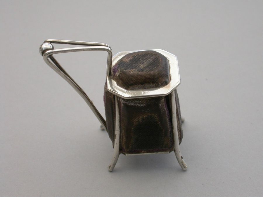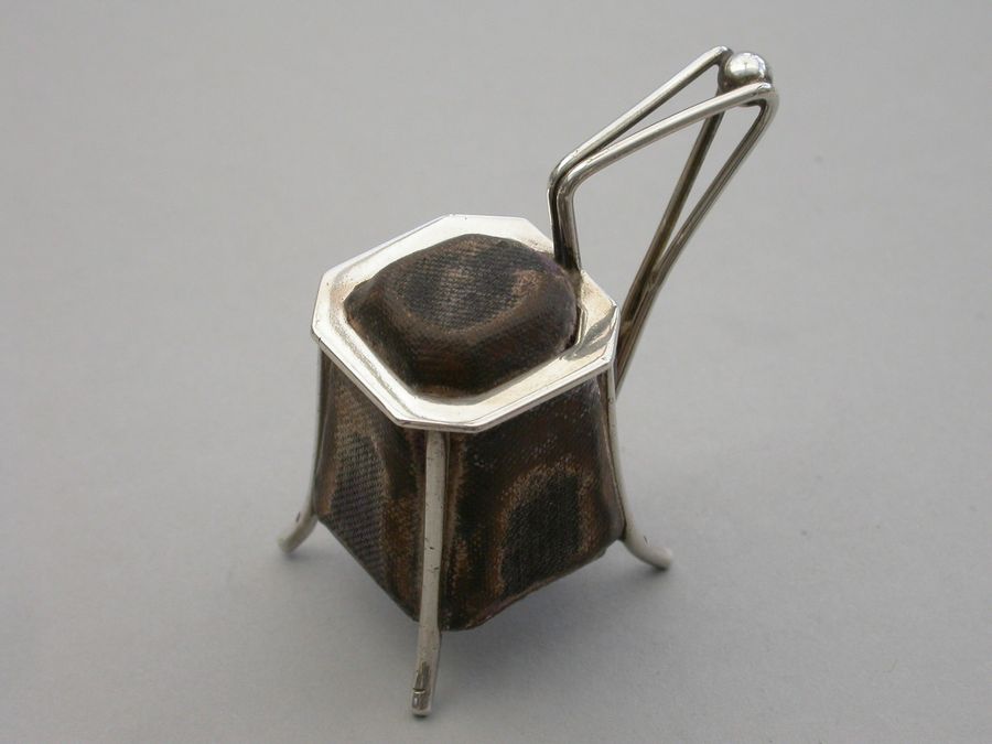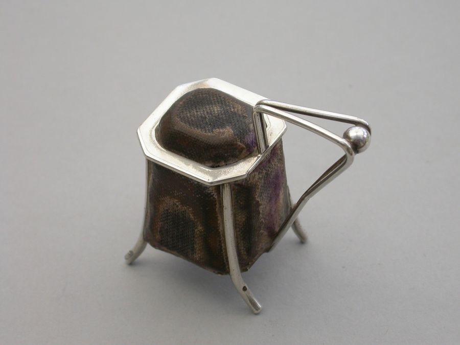 A very unusual Victorian novelty silver Pin cushion made in the form of an Arts & Crafts style vessel or tankard standing on four feet, velvet covered cushions on five sides. Possibly after a design by Christopher Dresser.