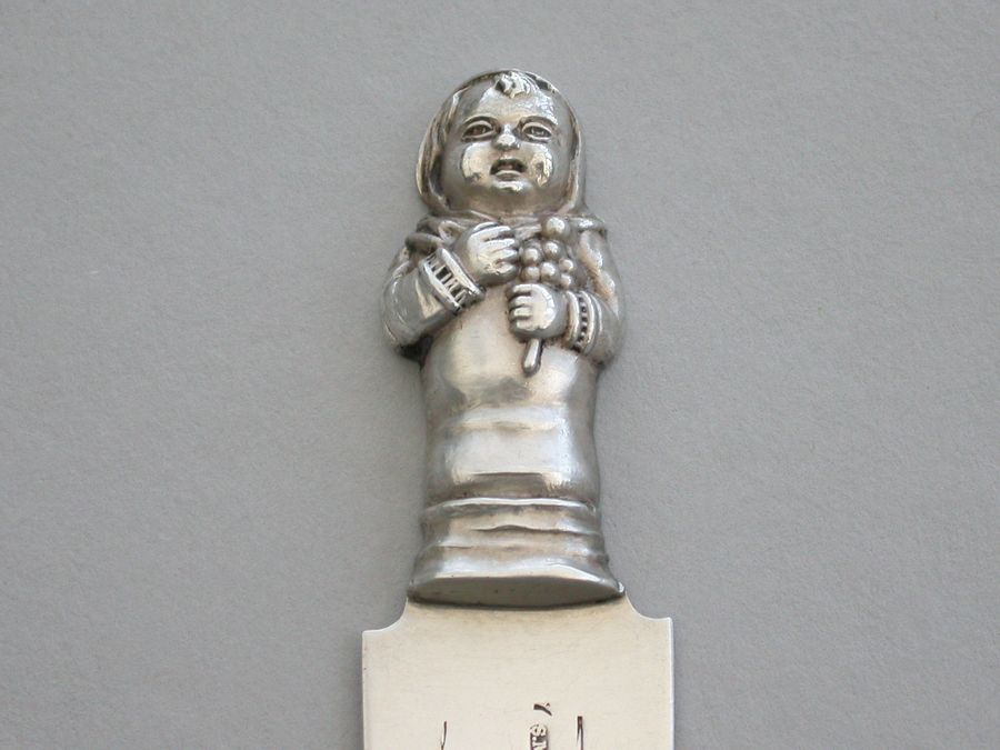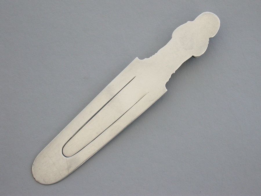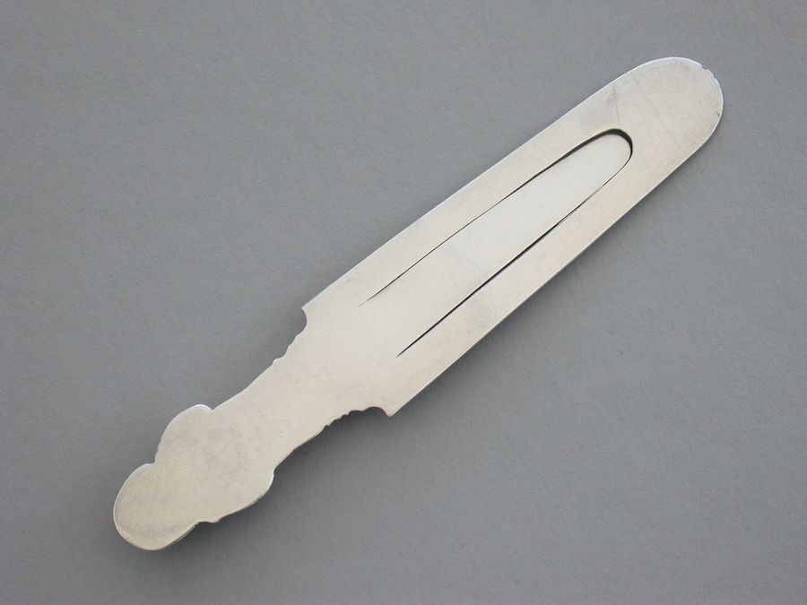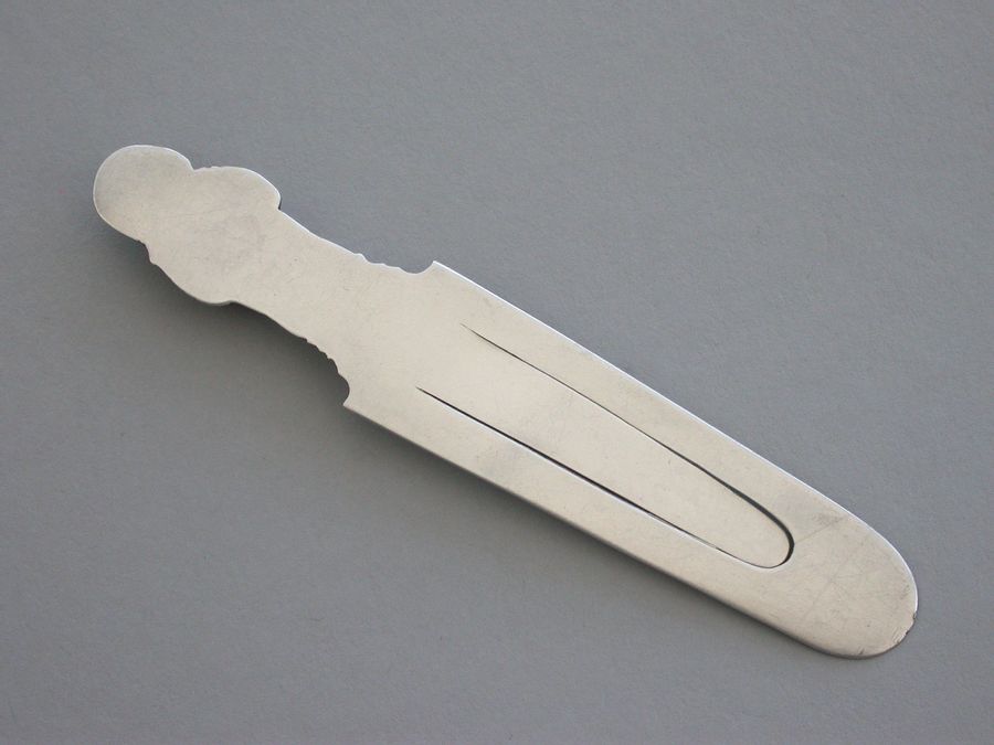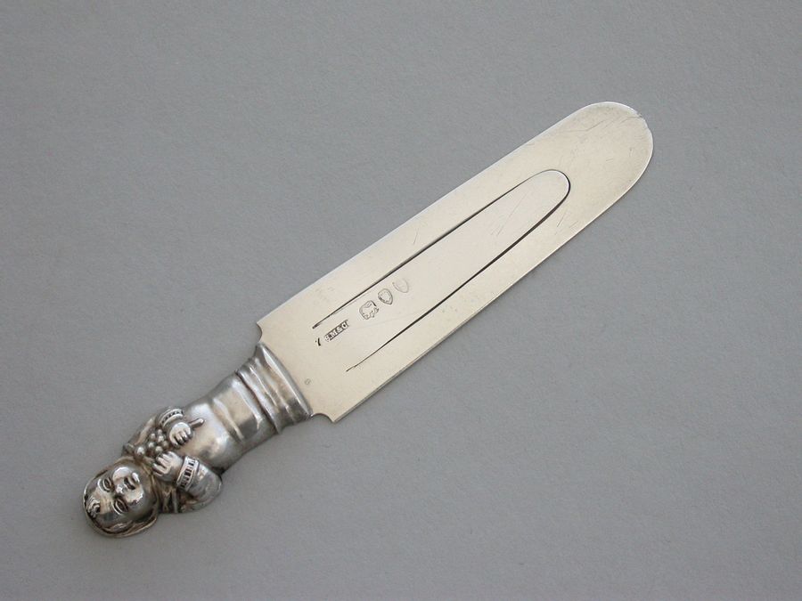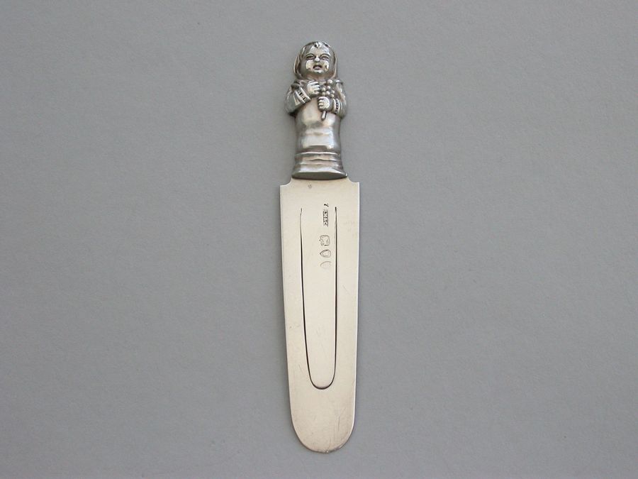 A rare Victorian novelty silver Bookmark, the terminal formed as a baby in swaddling clothes holding a rattle.