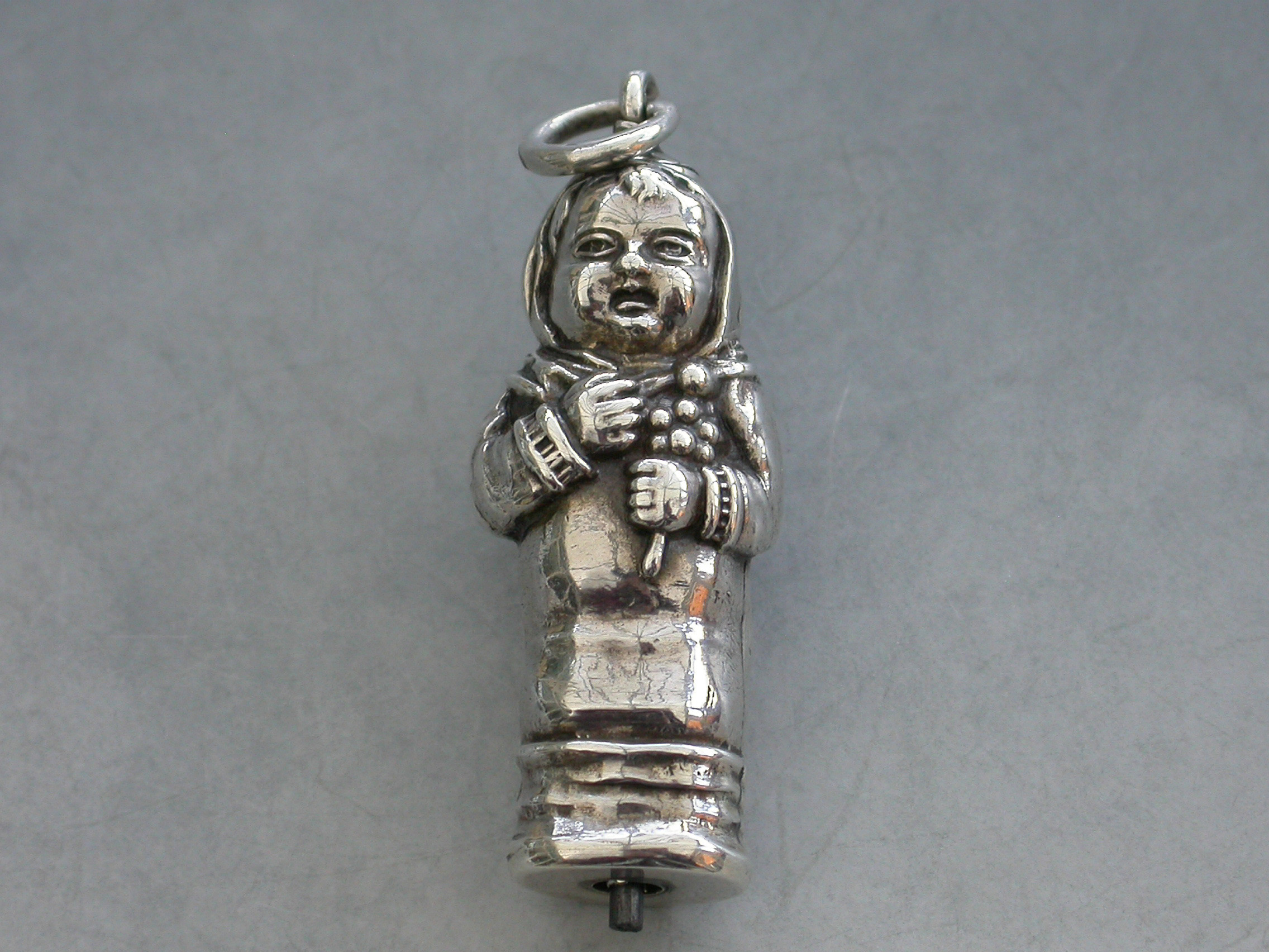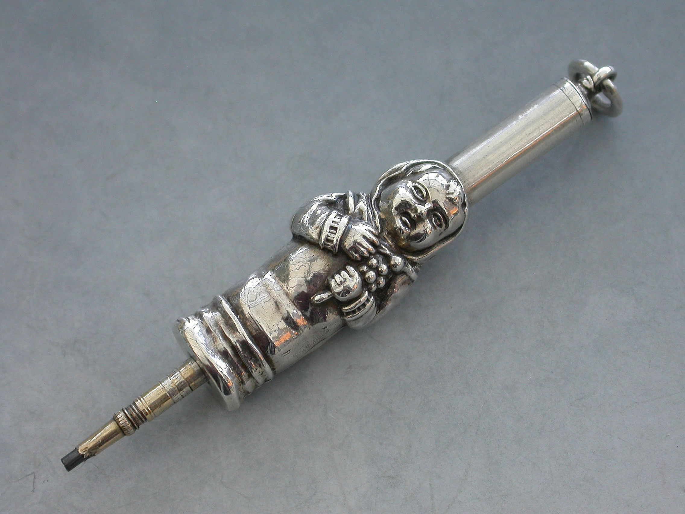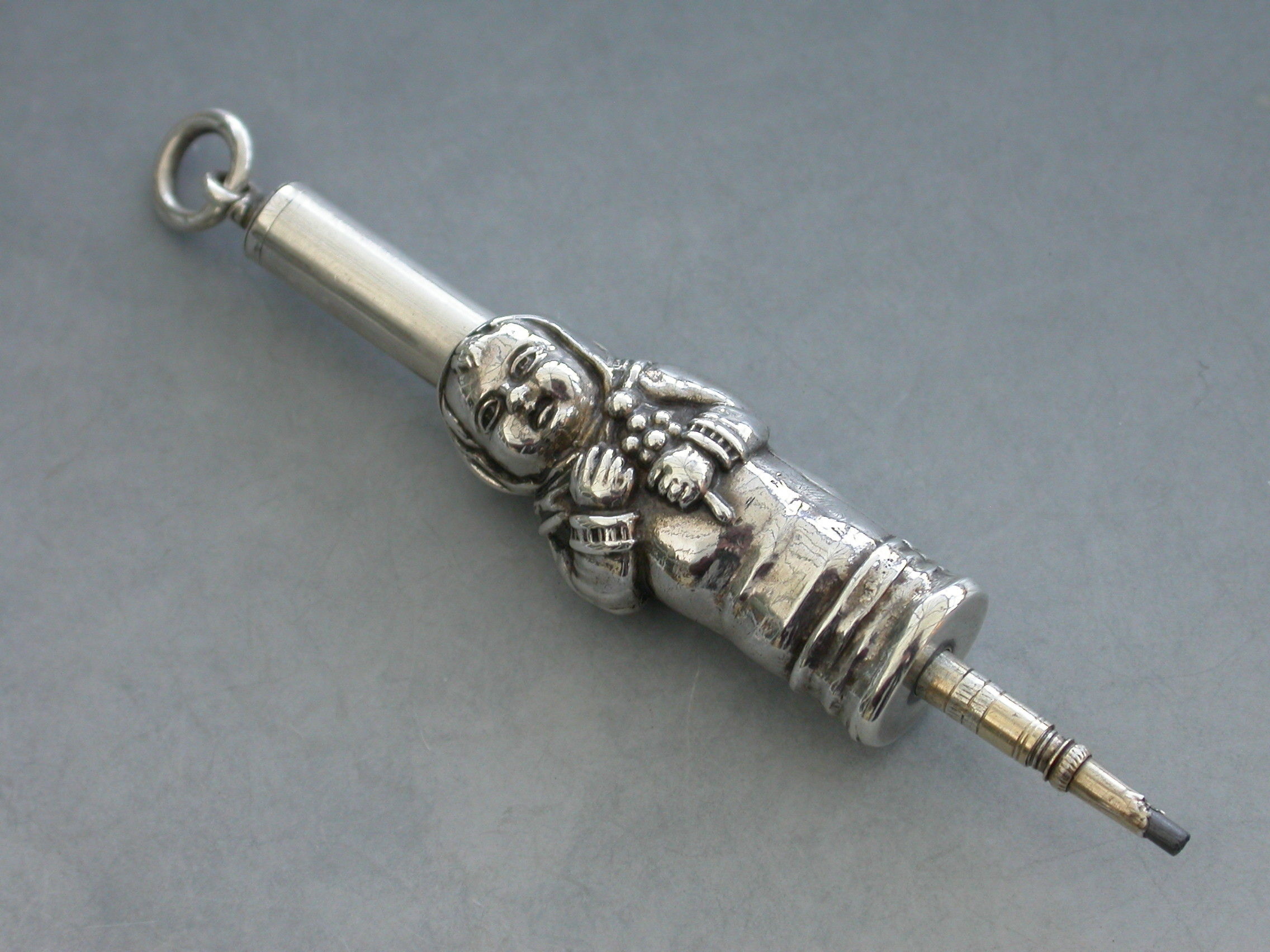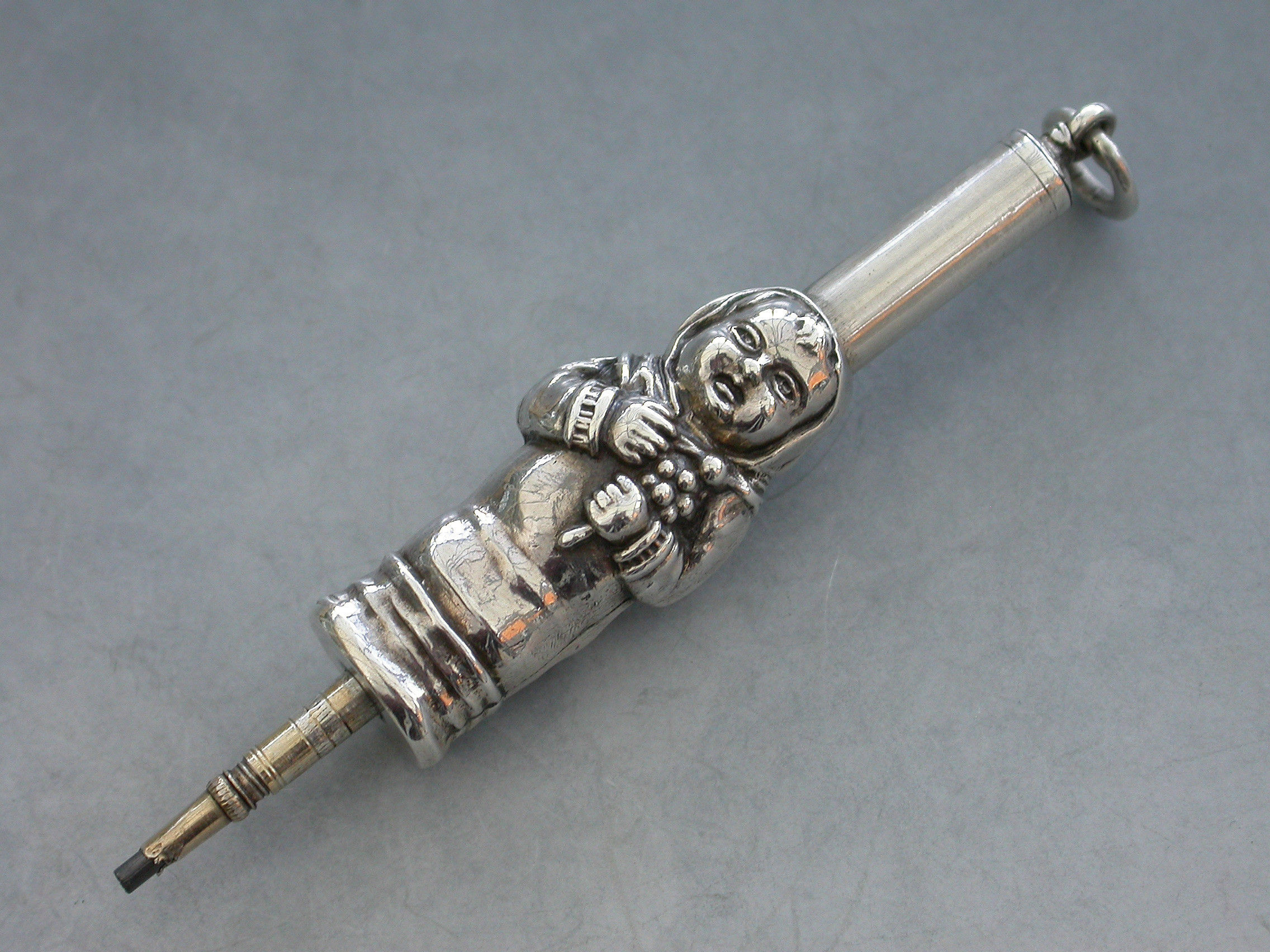 A rare Victorian novelty silver Propelling Pencil formed as a baby in swaddling clothes holding a rattle.