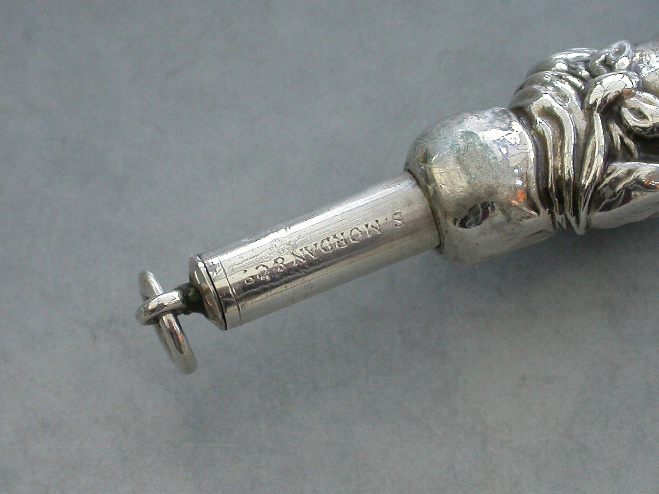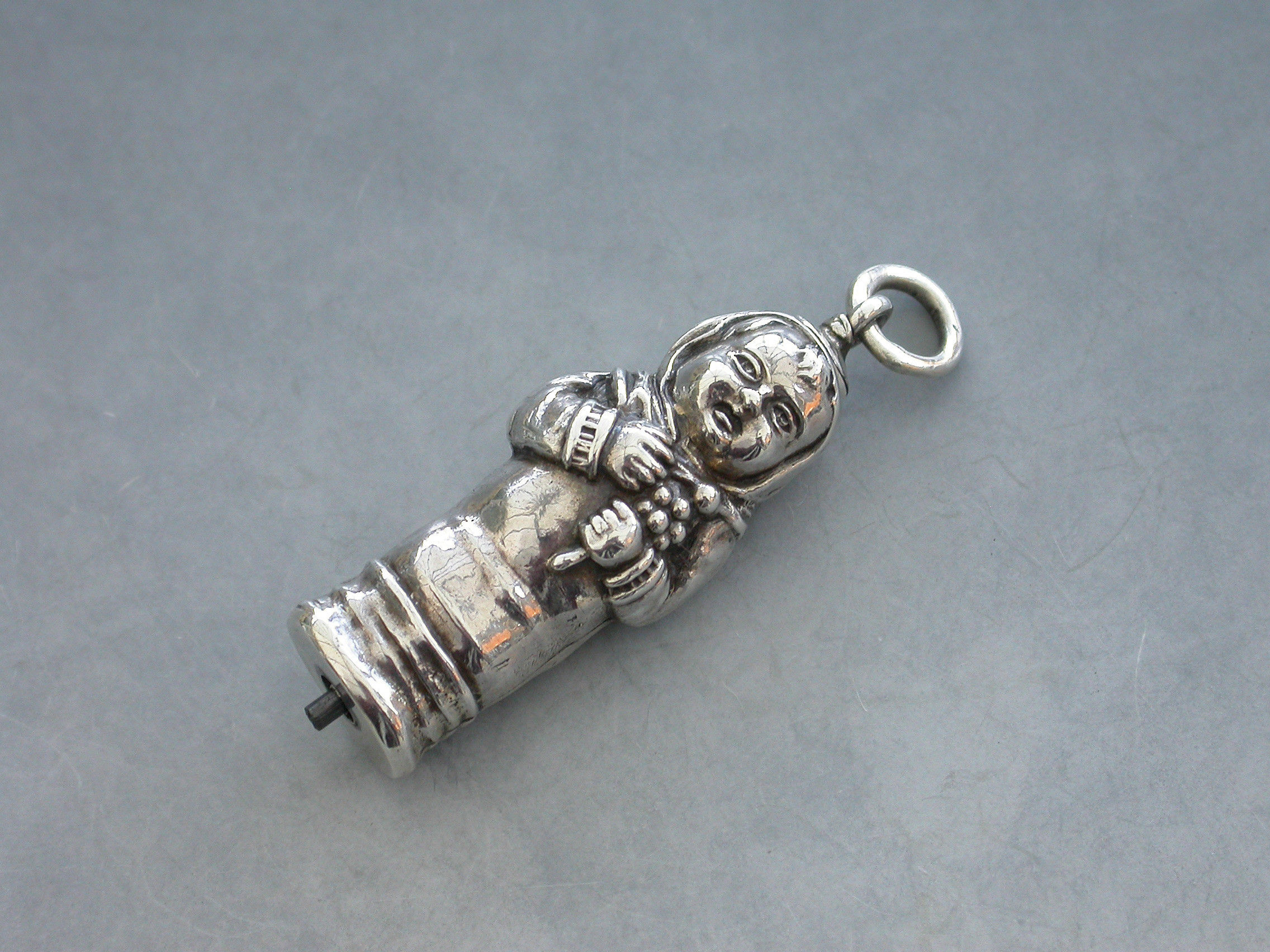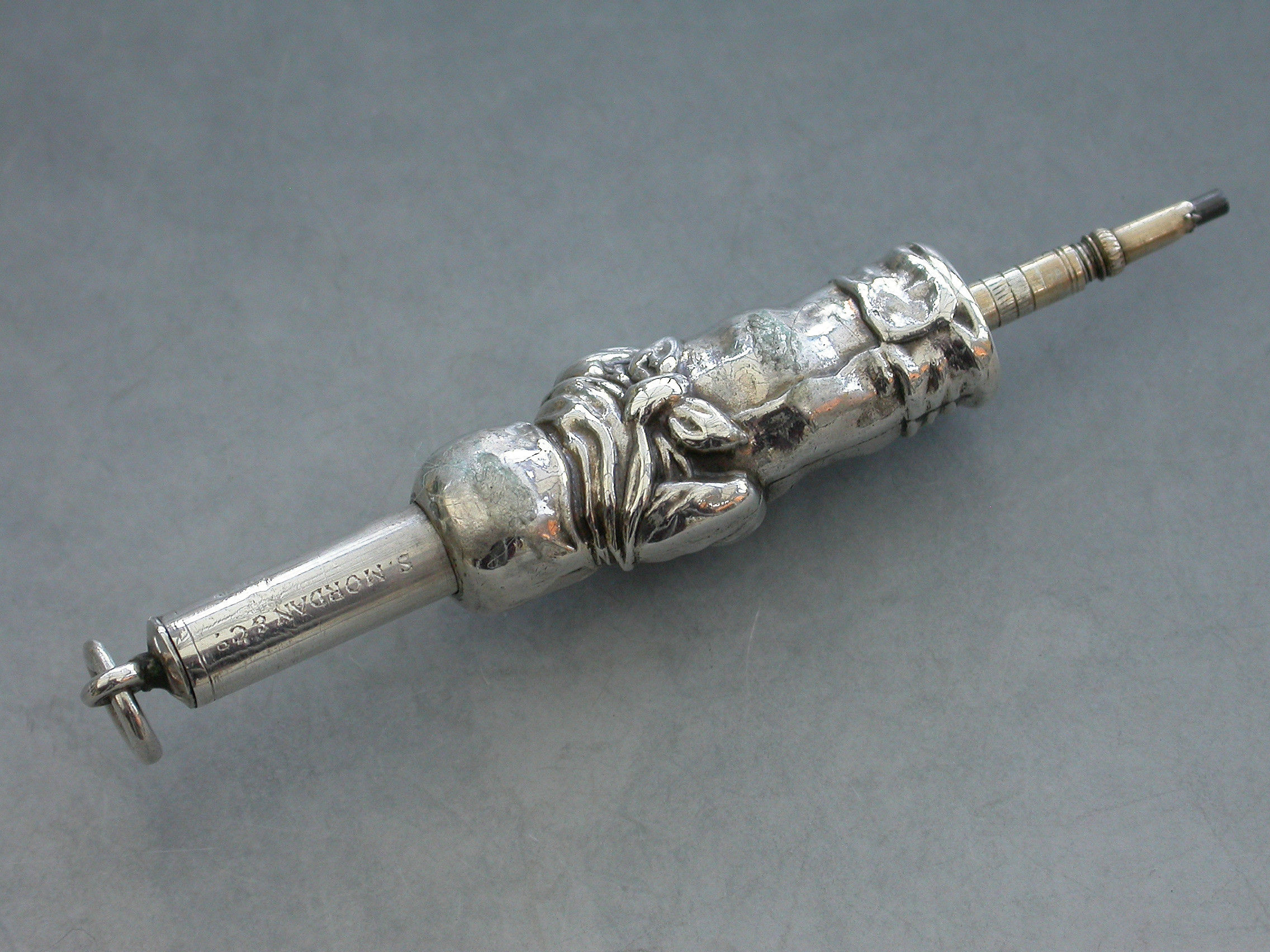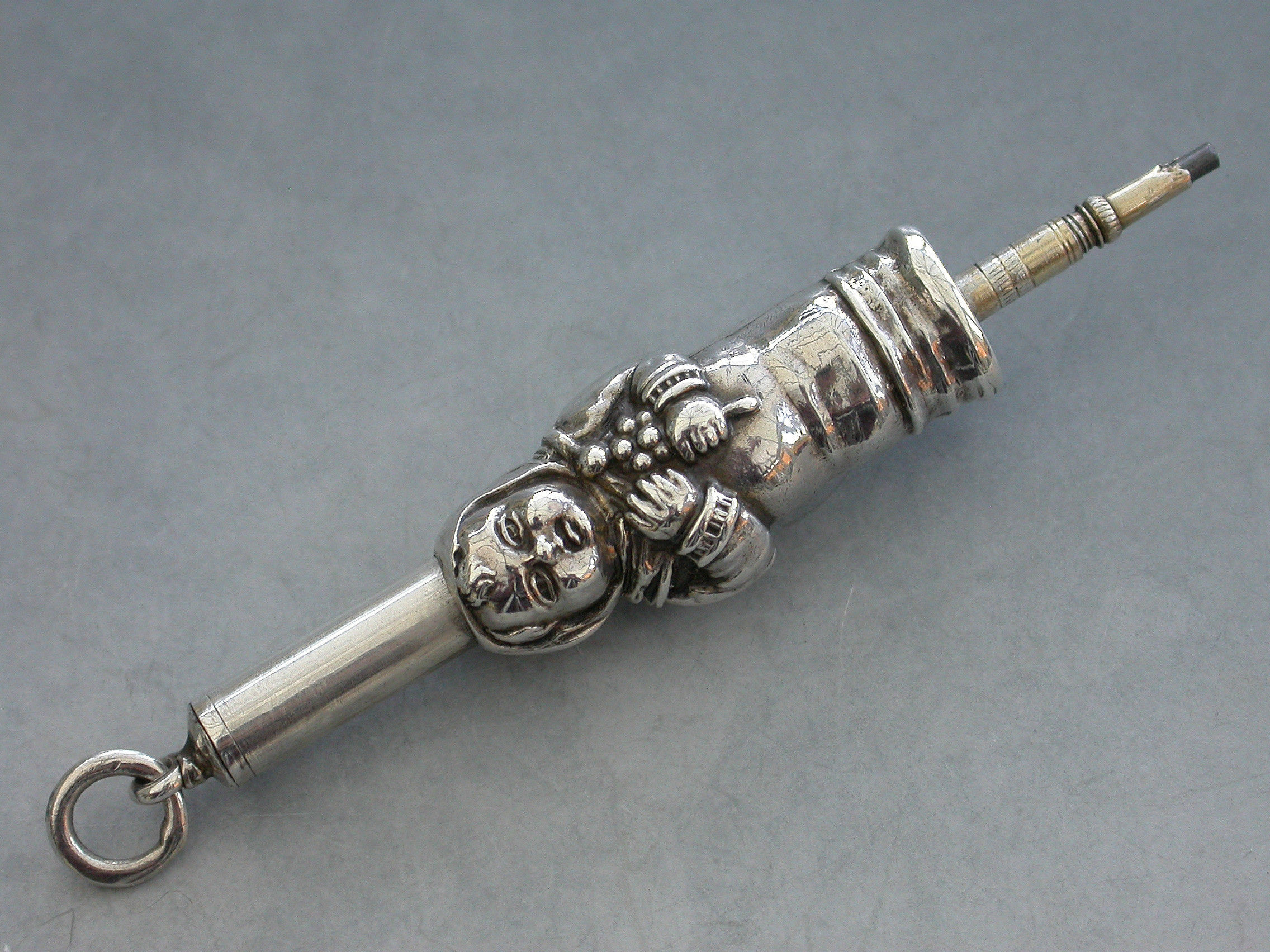 A rare Victorian novelty silver Propelling Pencil formed as a baby in swaddling clothes holding a rattle.
