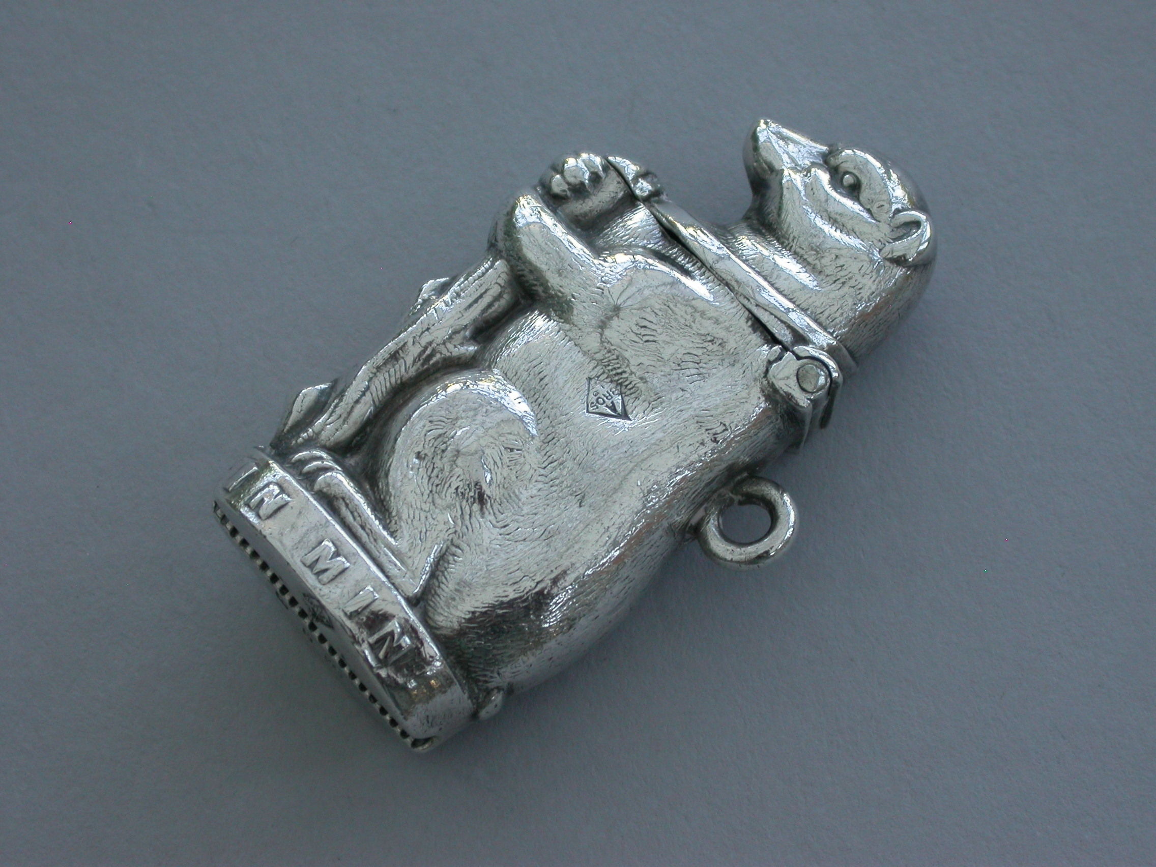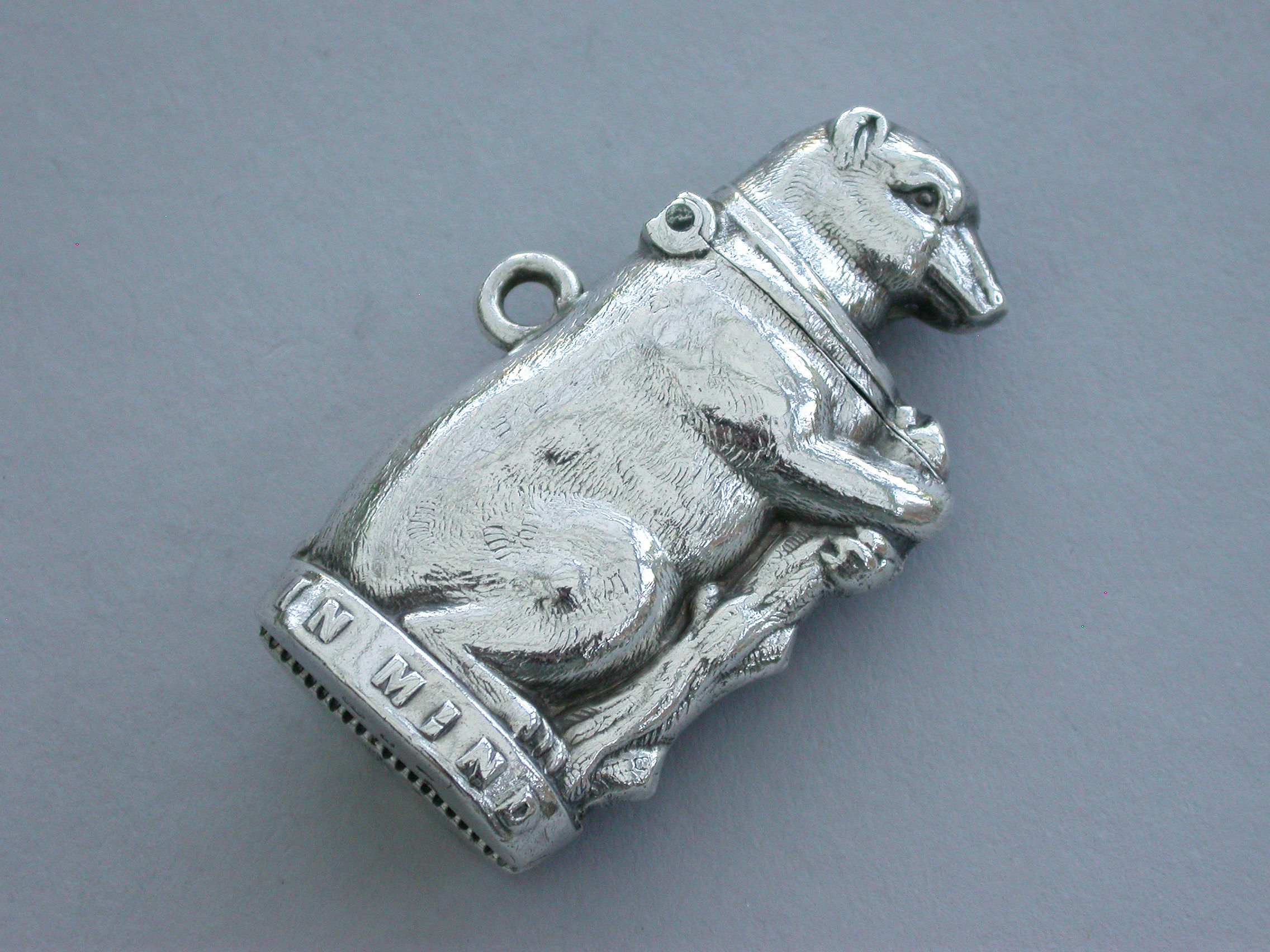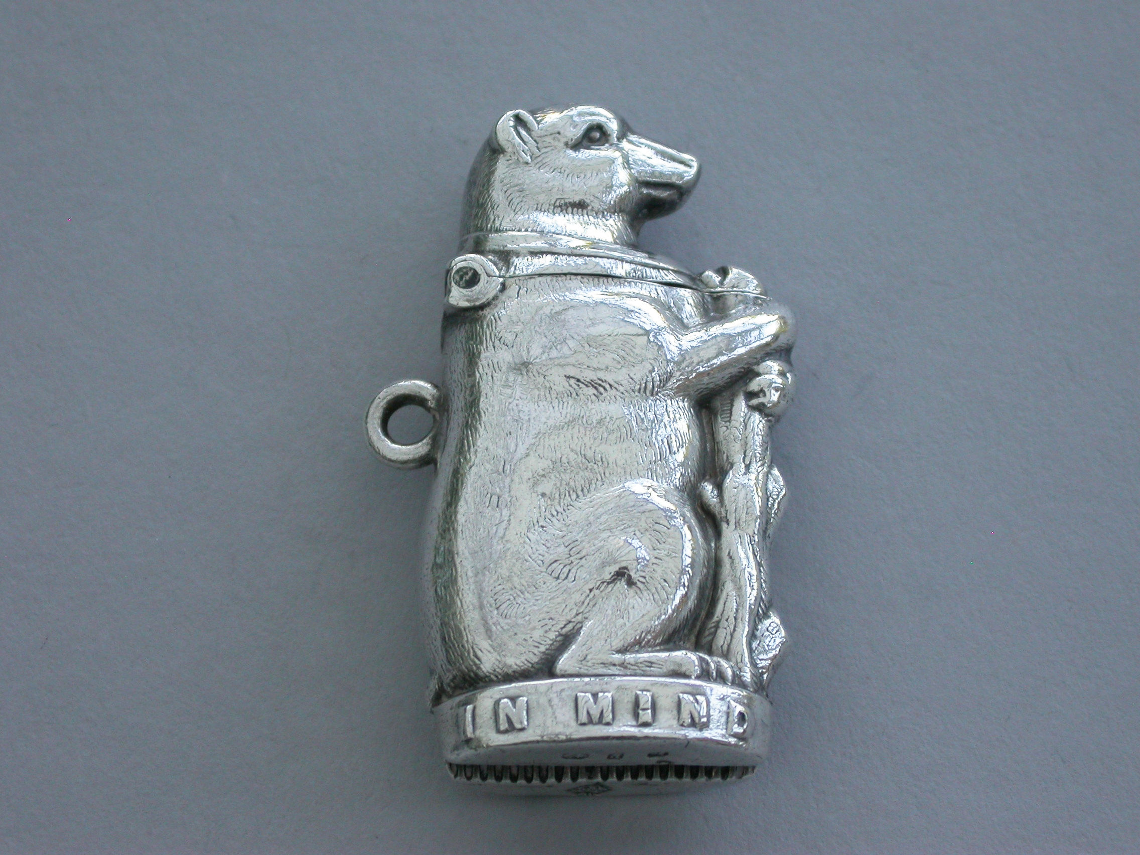 A Victorian novelty silver Vesta Case formed as a Bear and Ragged Staff and applied with the pun ""In Mind"" around the base. Hinged lid and attached suspension ring.