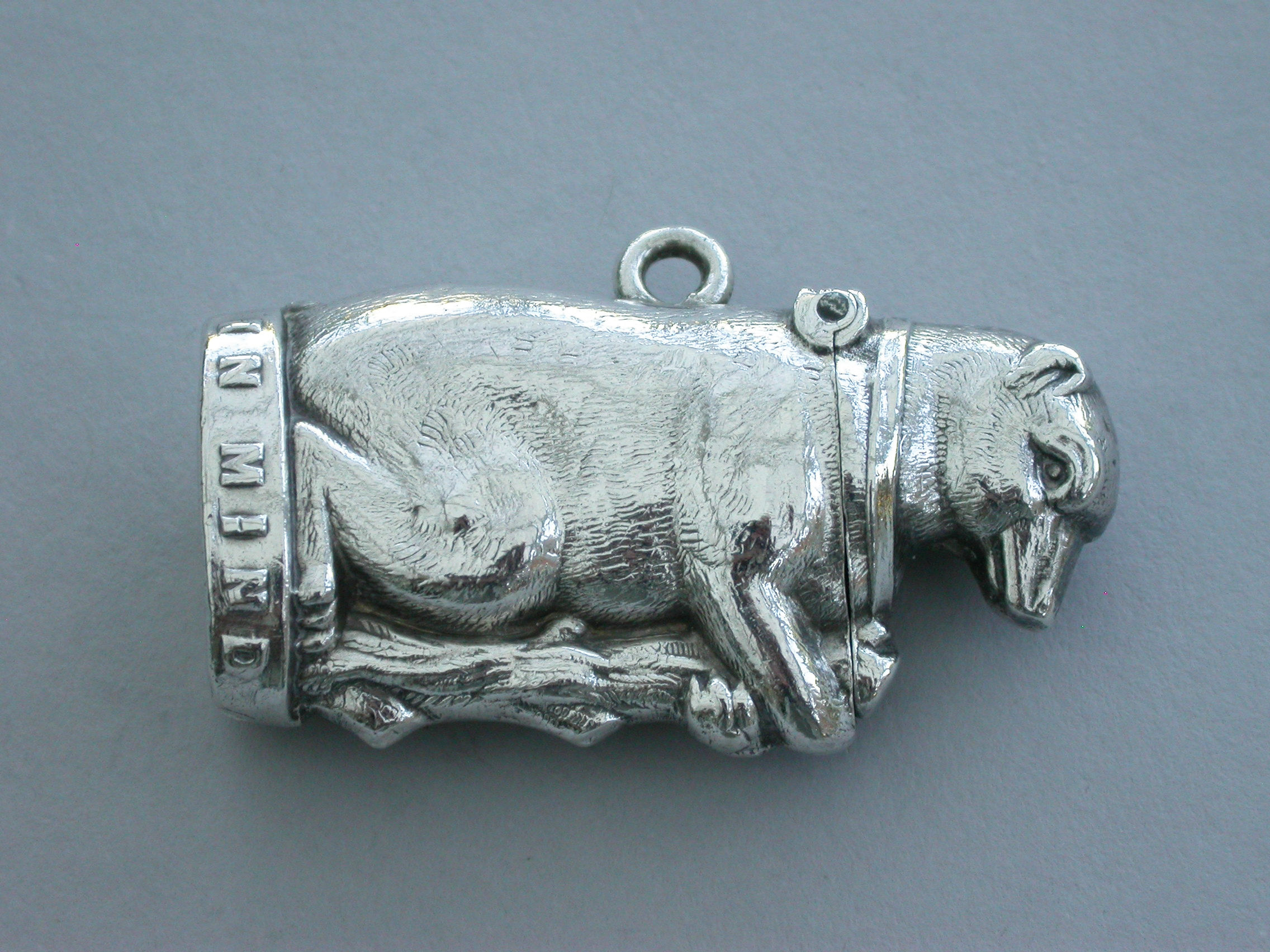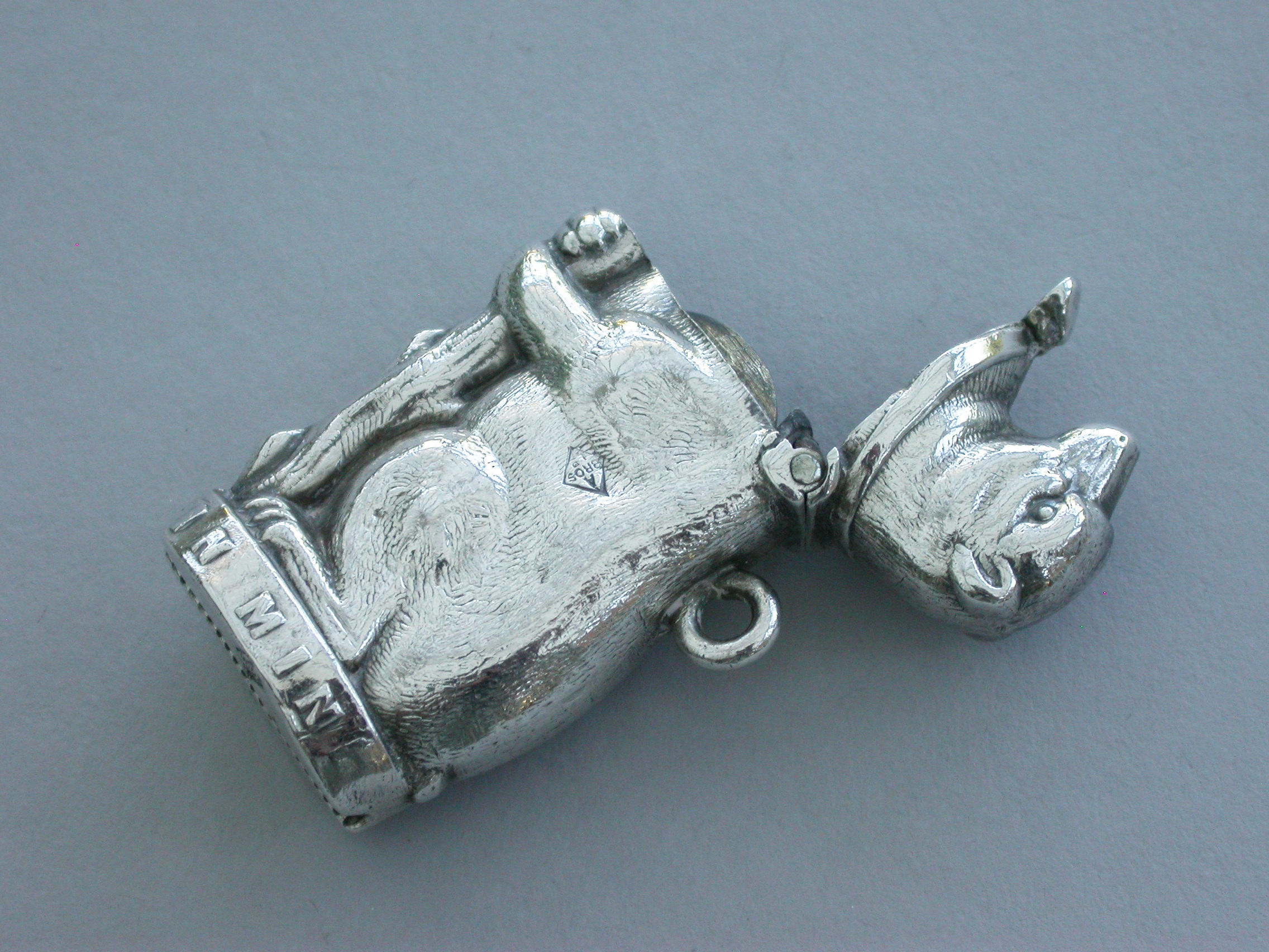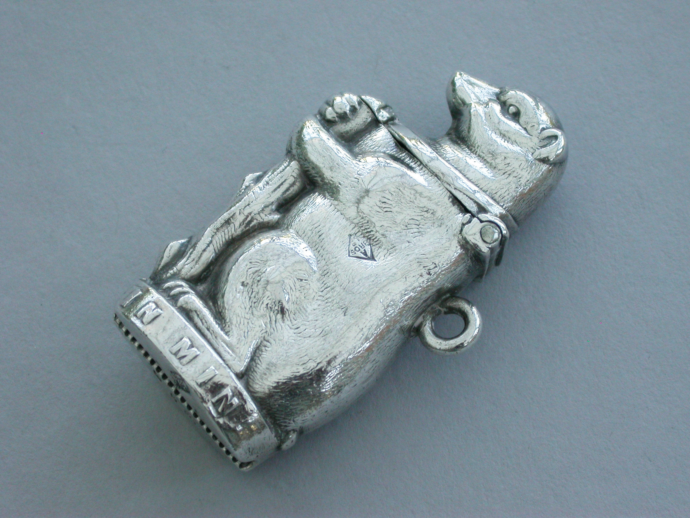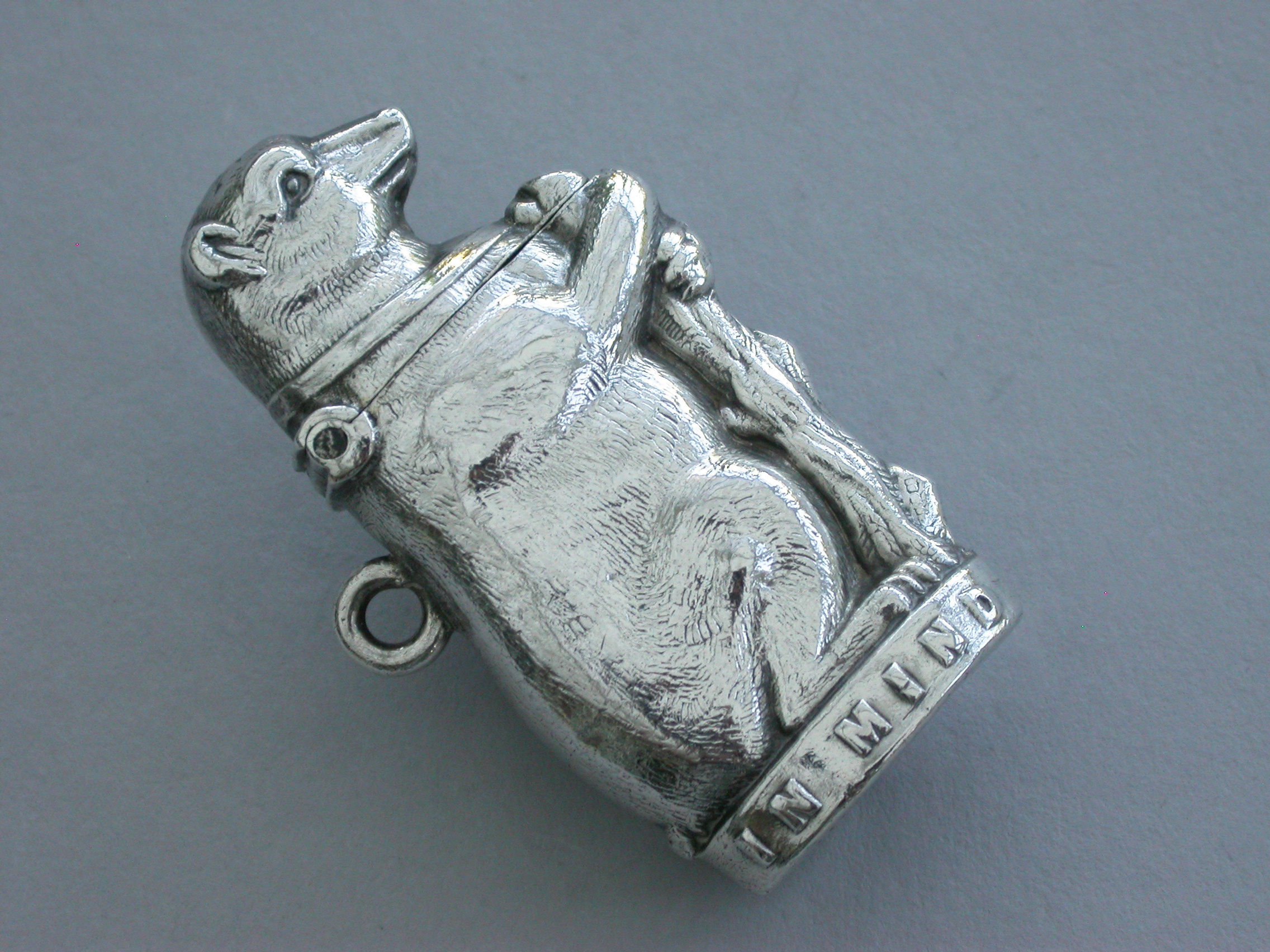 A Victorian novelty silver Vesta Case formed as a Bear and Ragged Staff and applied with the pun ""In Mind"" around the base. Hinged lid and attached suspension ring.