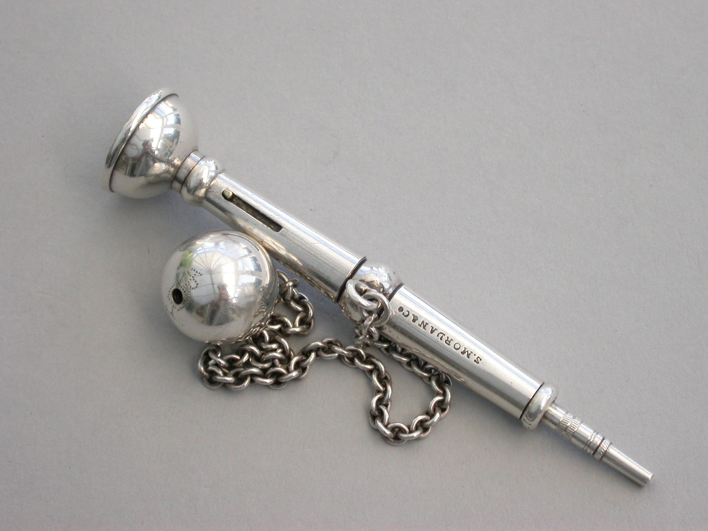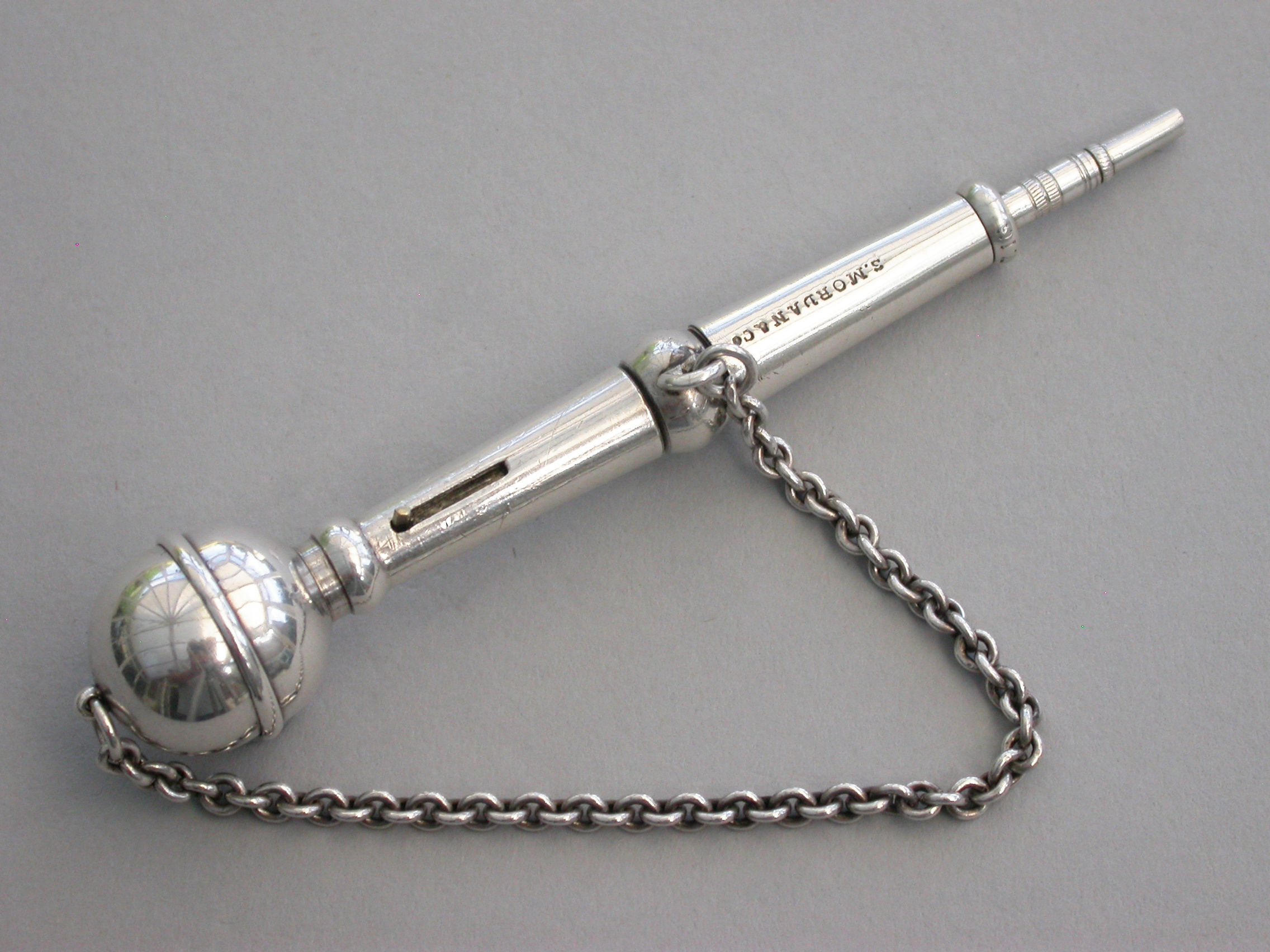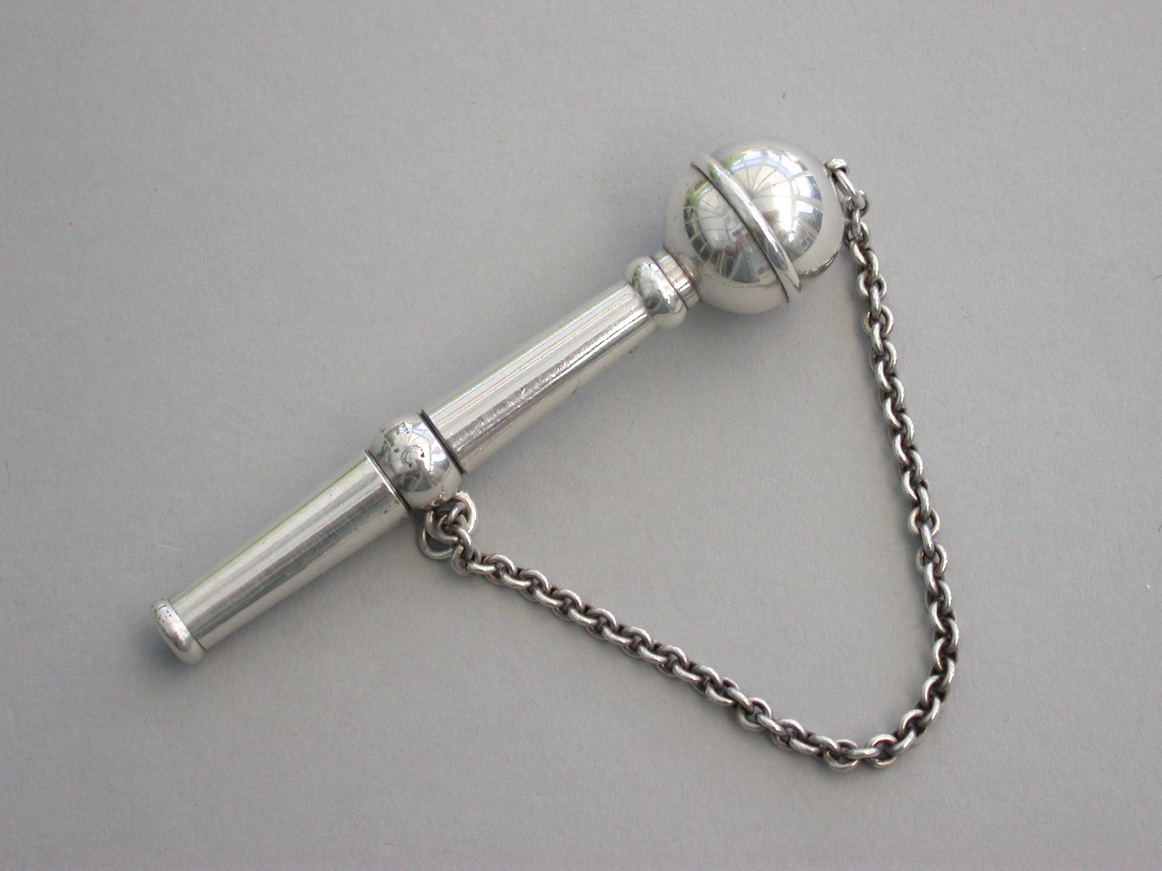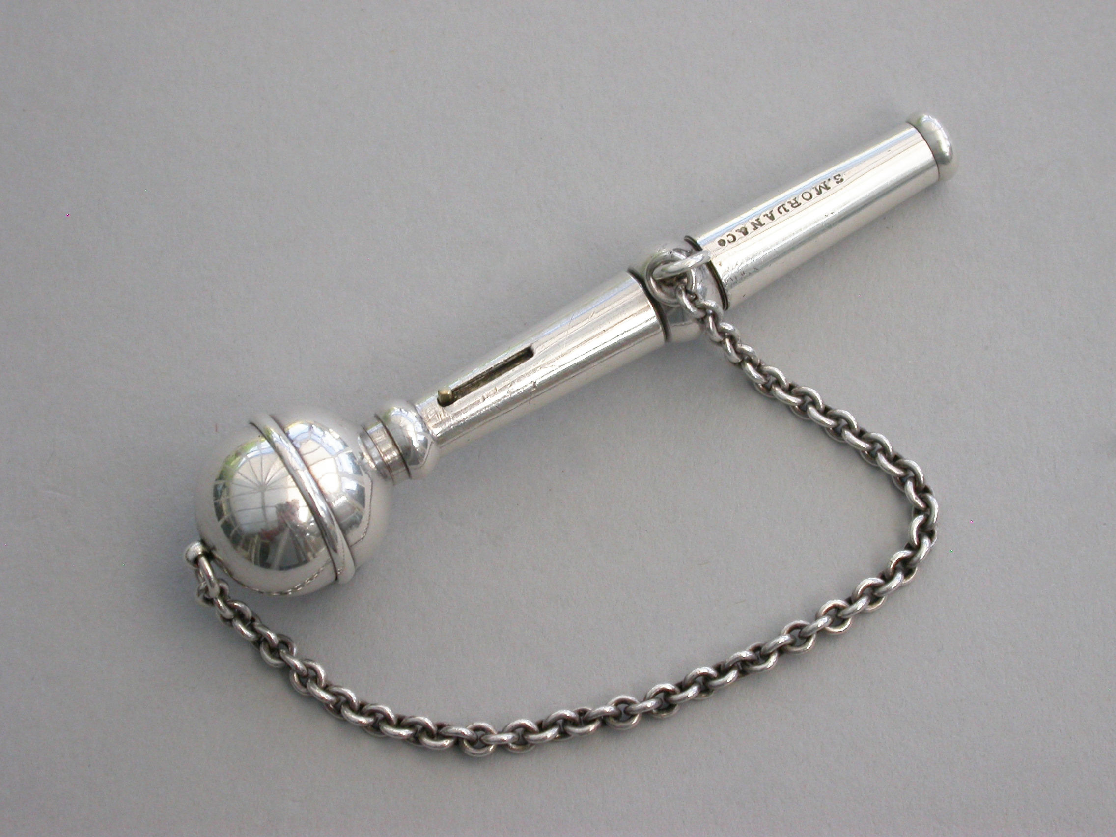 An extremely rare Victorian novelty silver Propelling Pencil, made in the form of a 'Bilboquet' or Cup & Ball Game. The silver ball is secured by a suspension chain and screws onto a metal peg located at the base of the cup. The peg can be extended or repelled by a sliding mechanism on the side of the pencil. The pencil itself is extended by a twist mechanism.