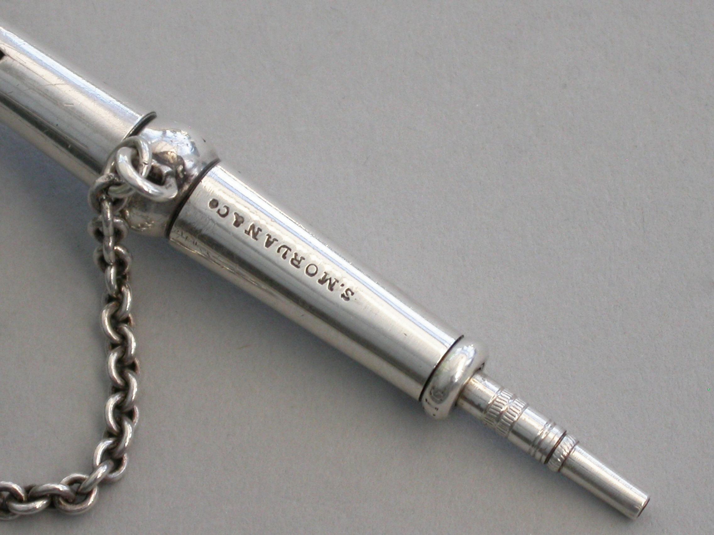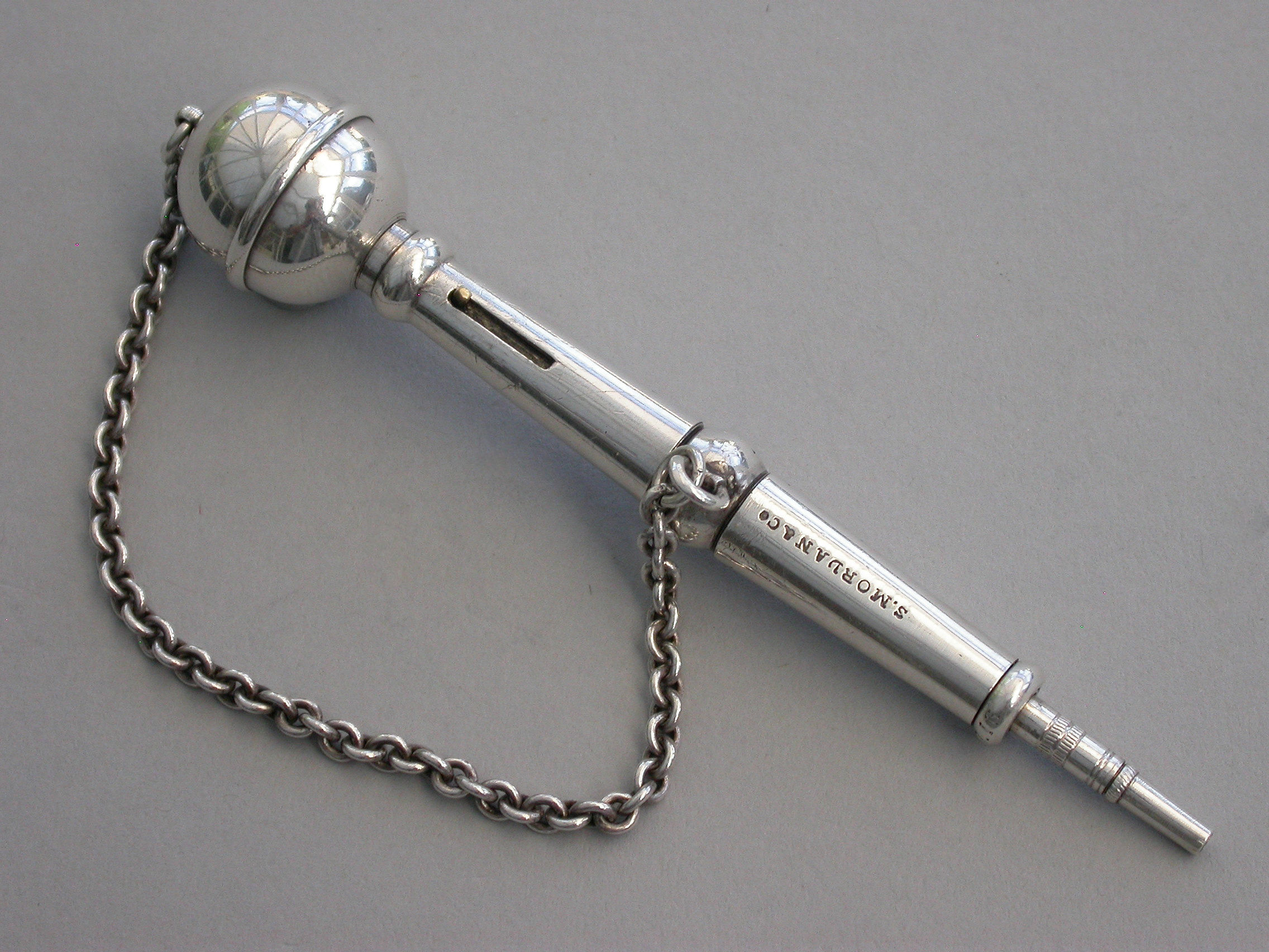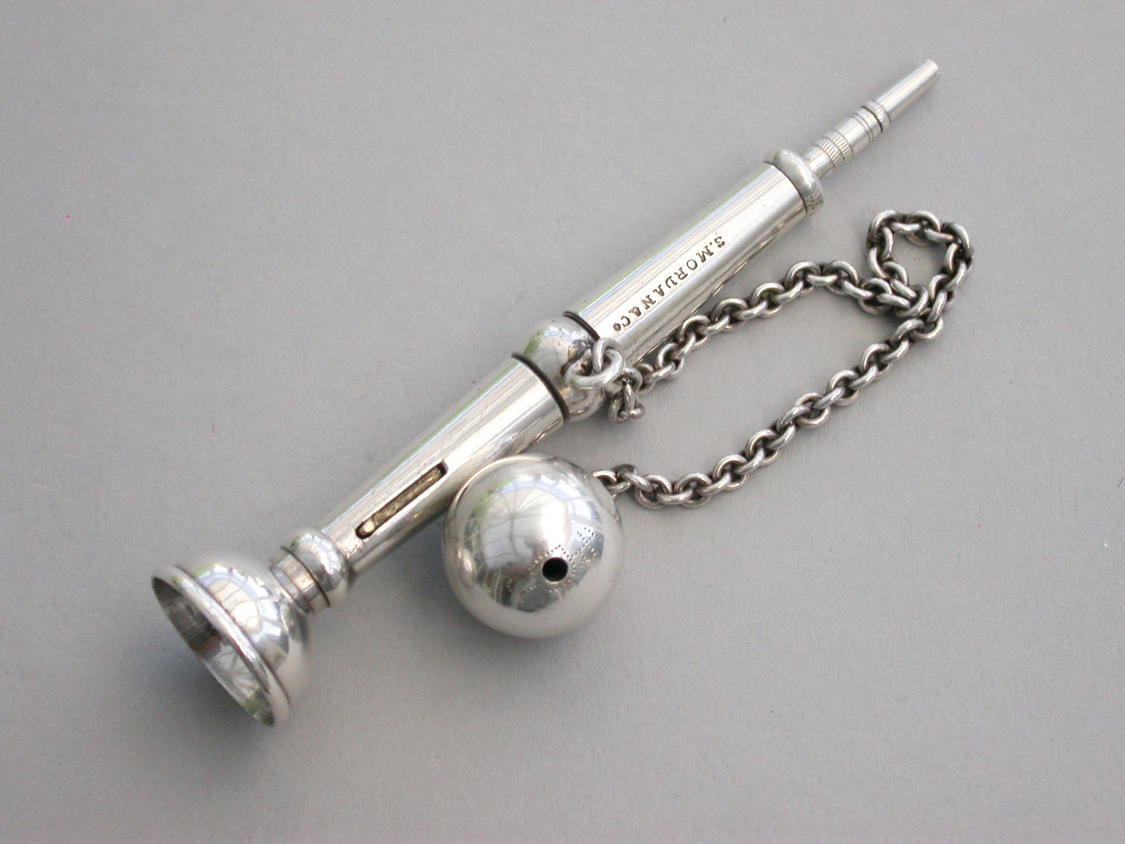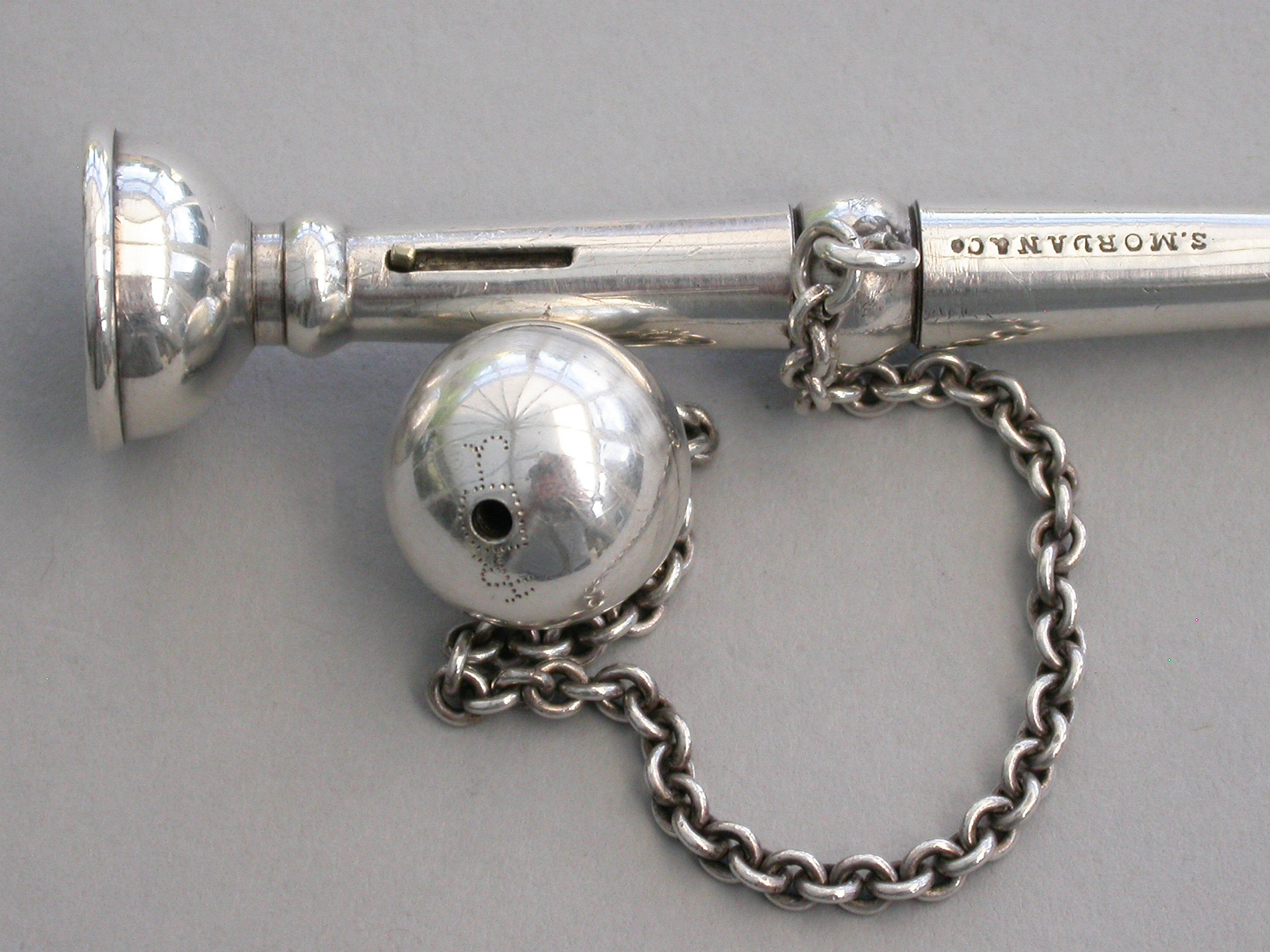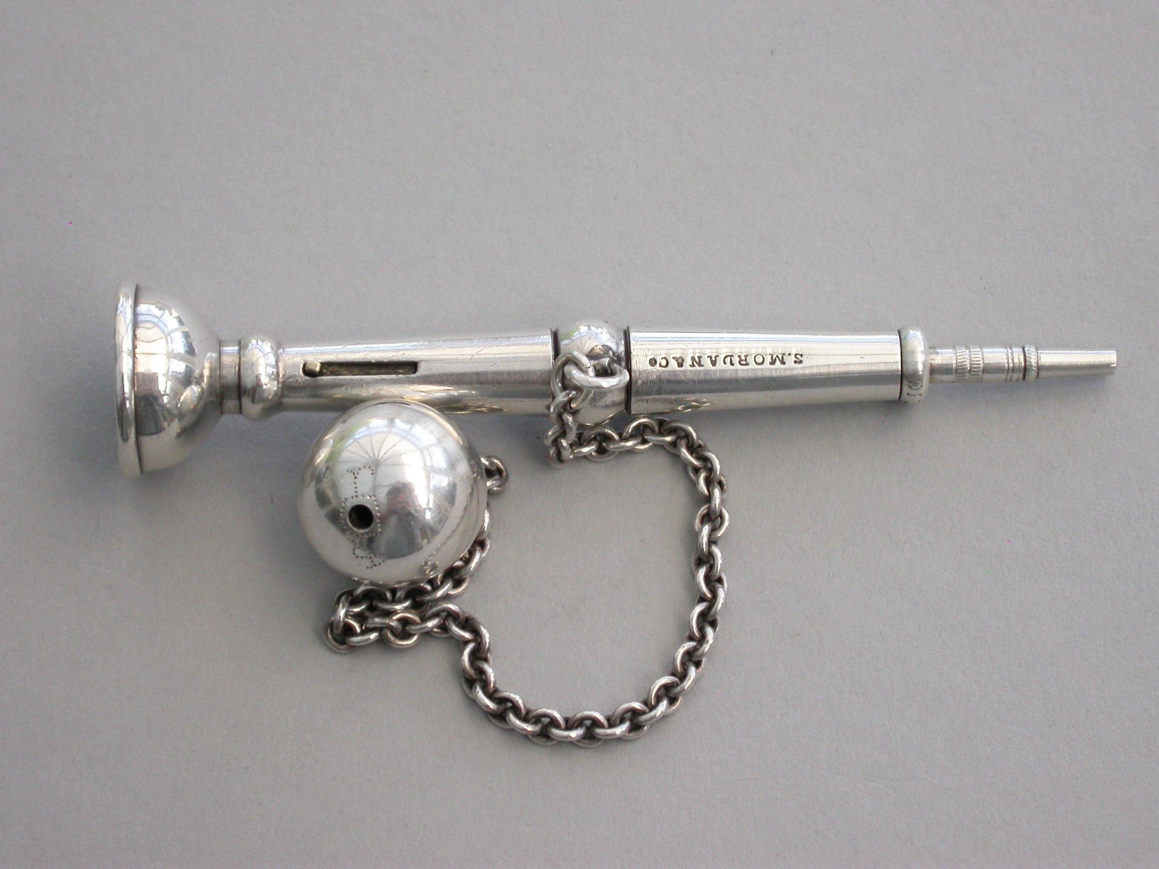 An extremely rare Victorian novelty silver Propelling Pencil, made in the form of a 'Bilboquet' or Cup & Ball Game. The silver ball is secured by a suspension chain and screws onto a metal peg located at the base of the cup. The peg can be extended or repelled by a sliding mechanism on the side of the pencil. The pencil itself is extended by a twist mechanism.