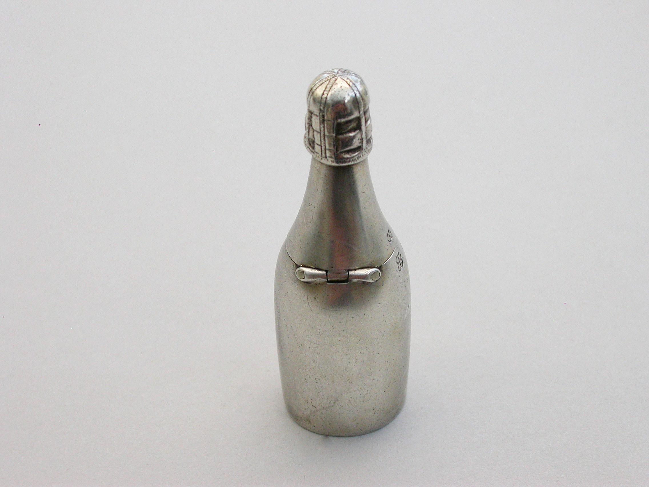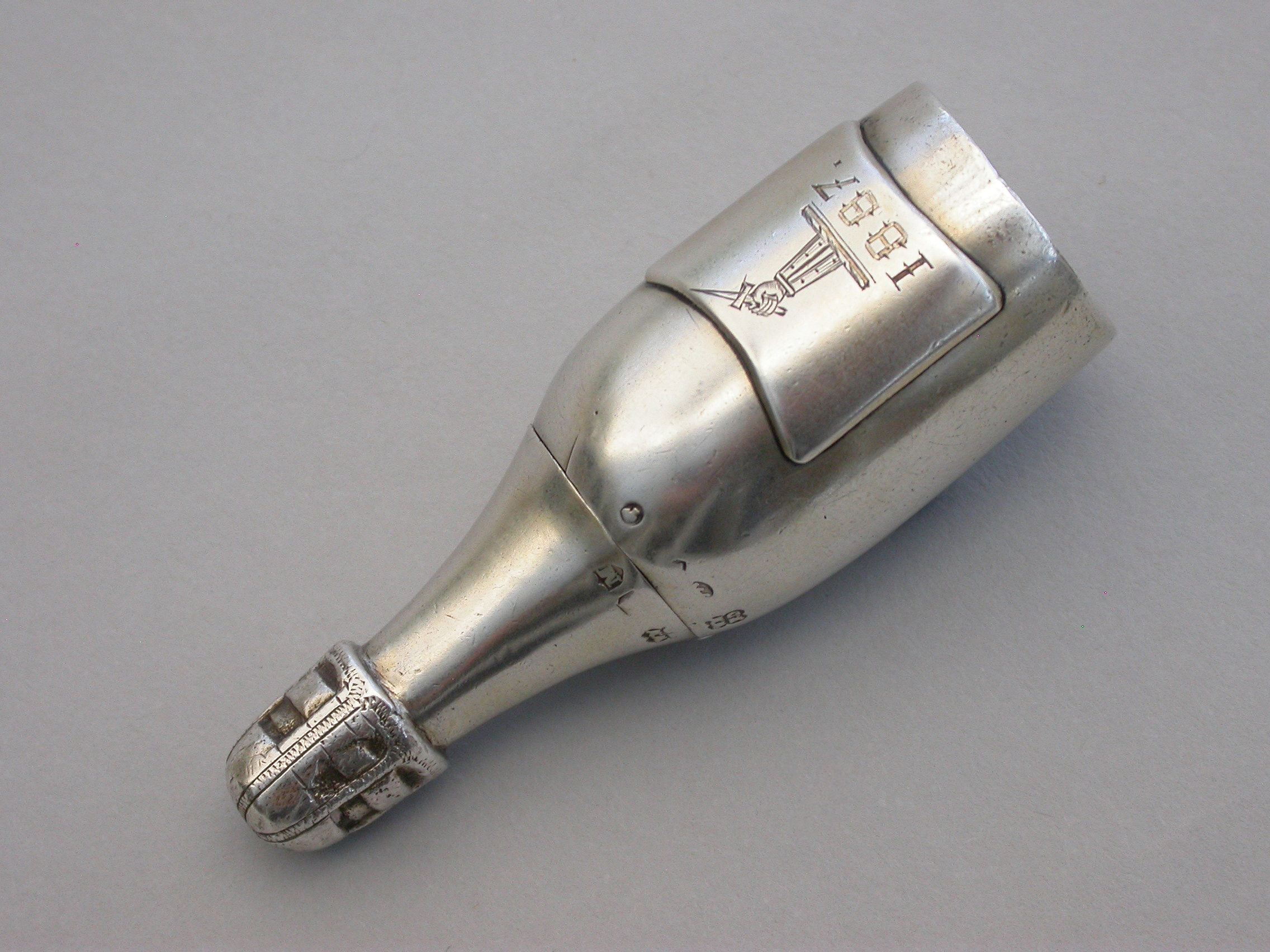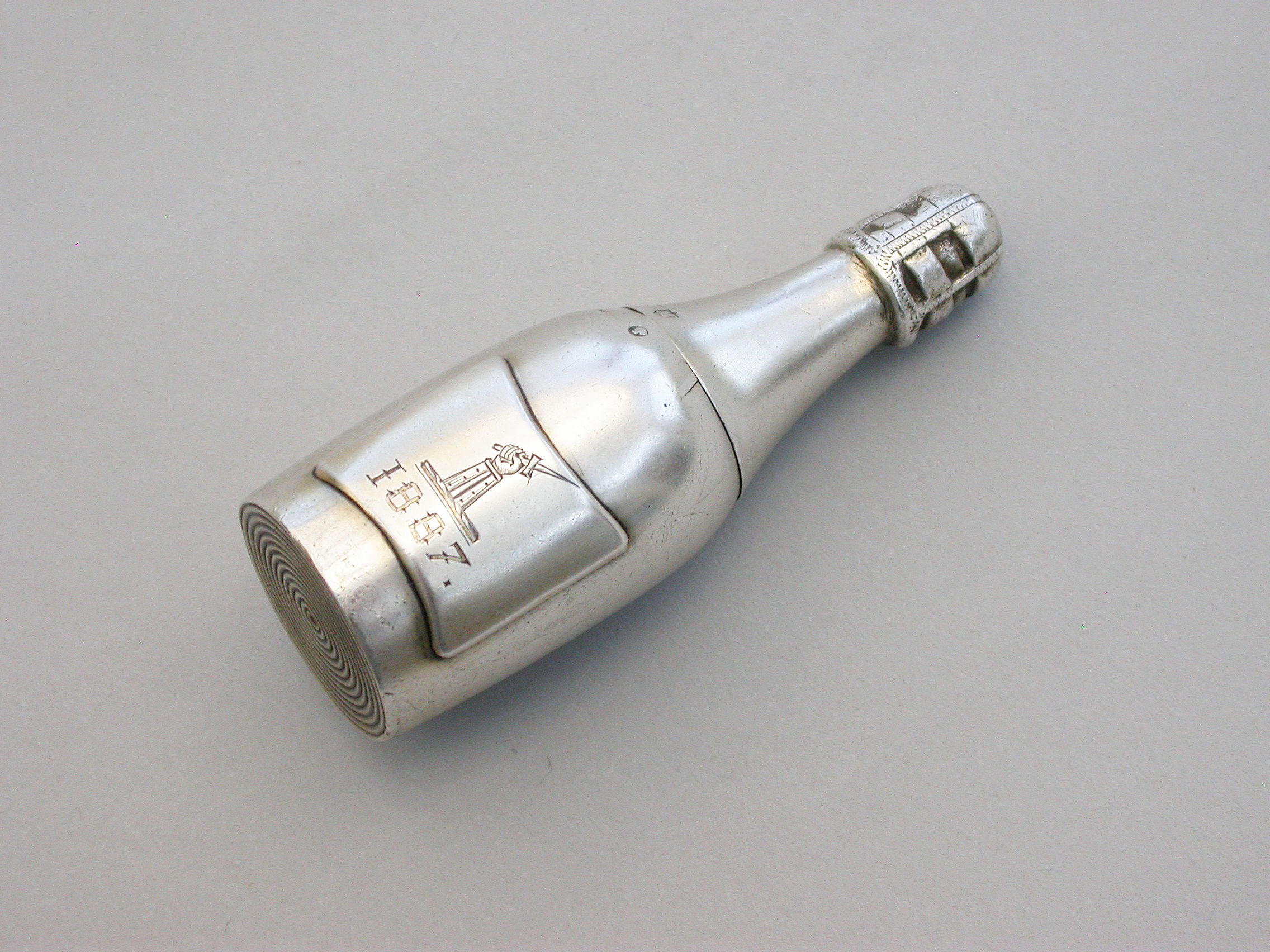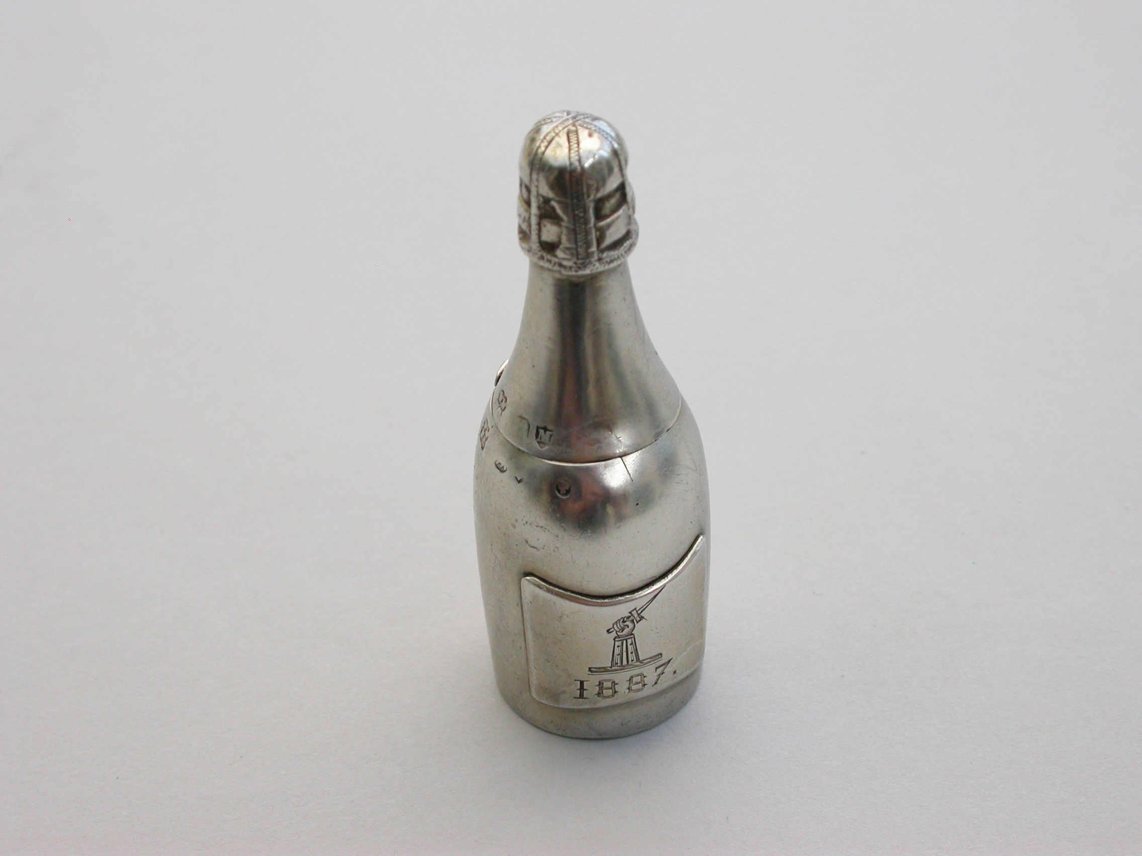 A rare Victorian novelty silver Vesta Case made in the form of a Champagne Bottle hinging at its centre and with a striker to the base. The label engraved with a family crest and dated 1887.
