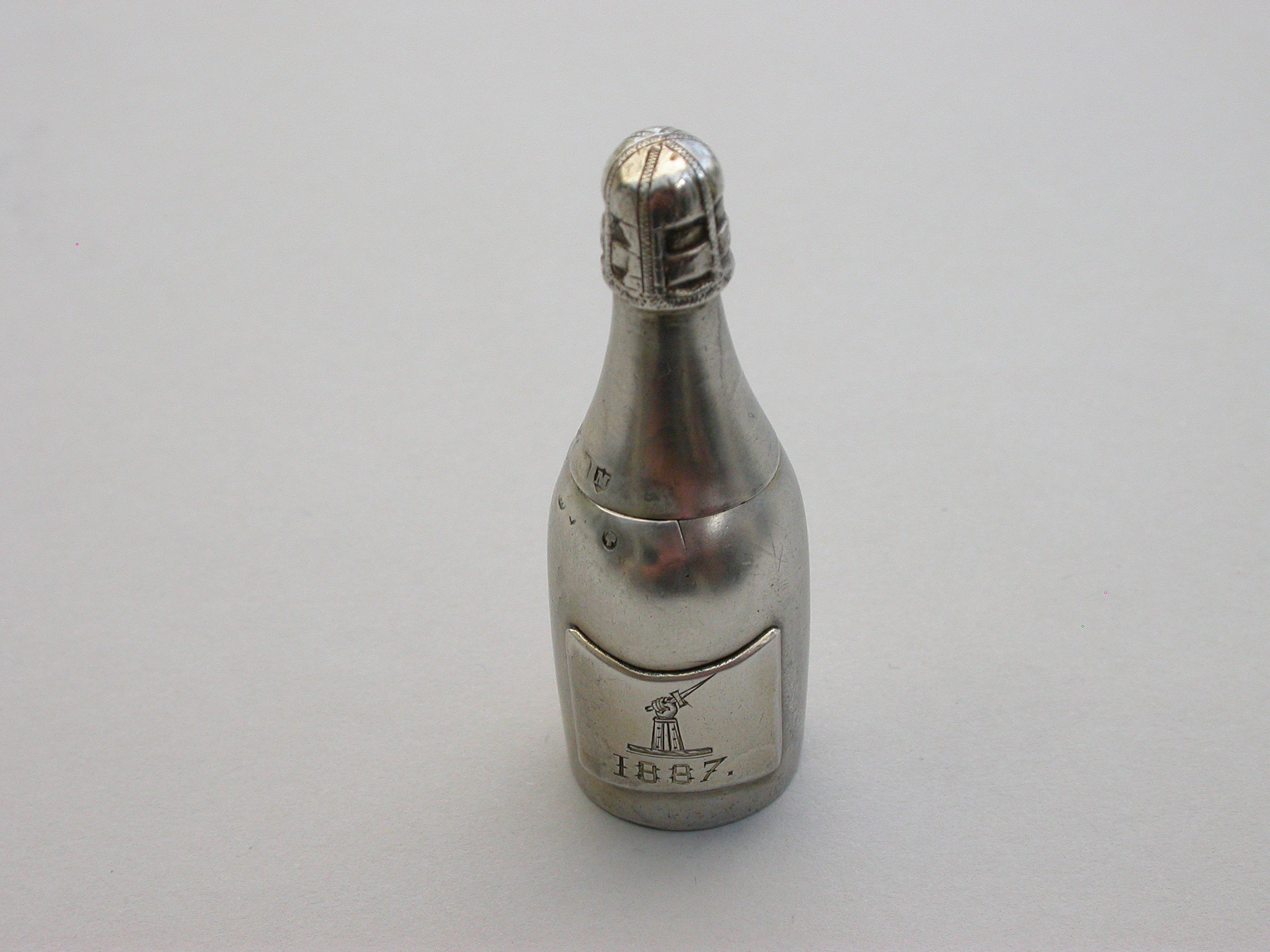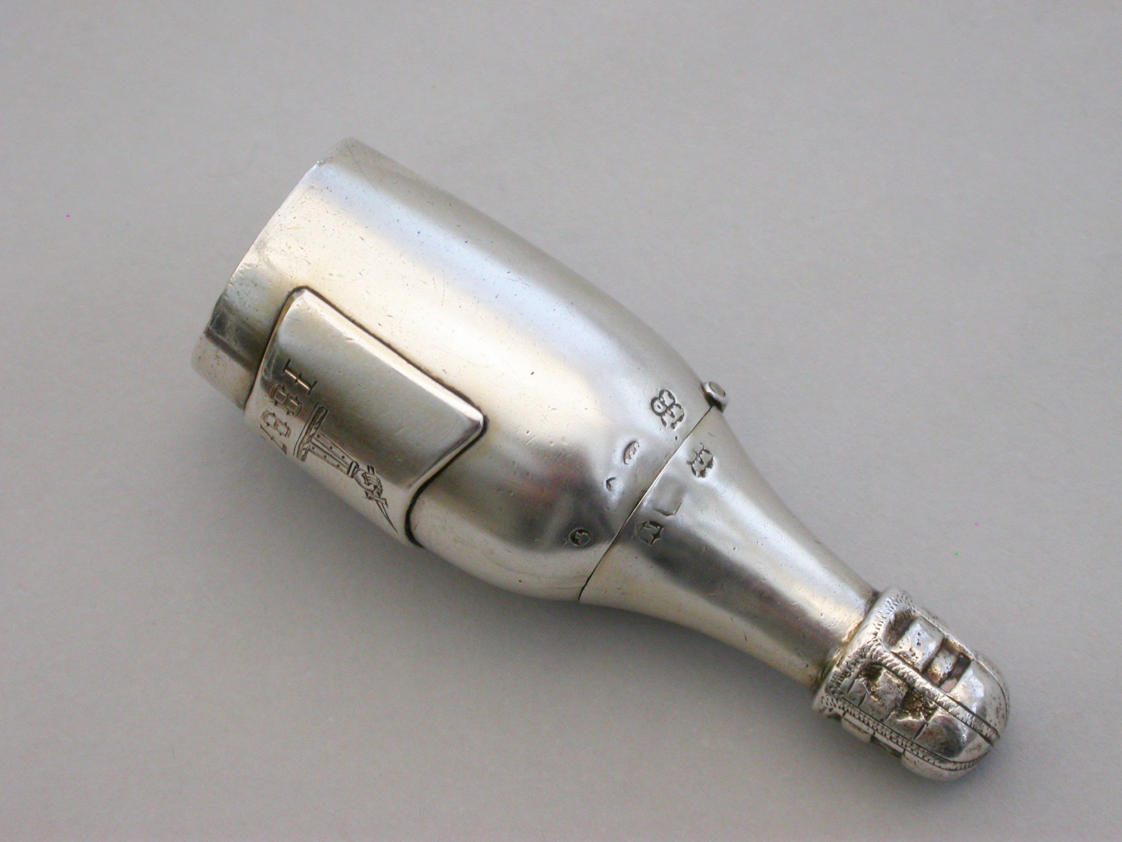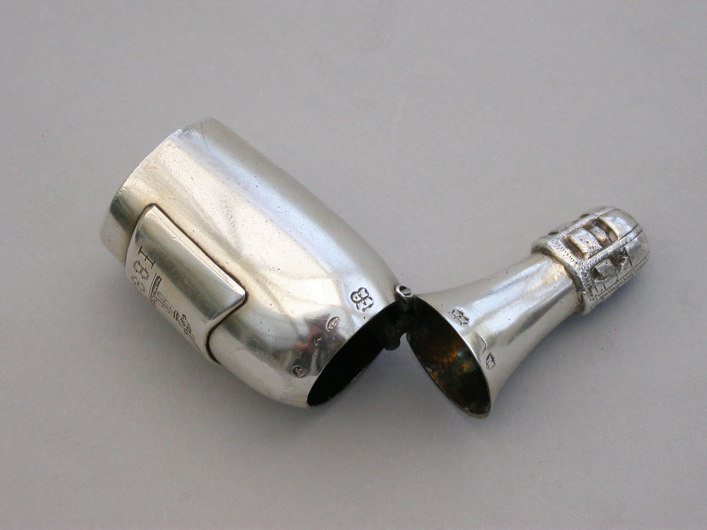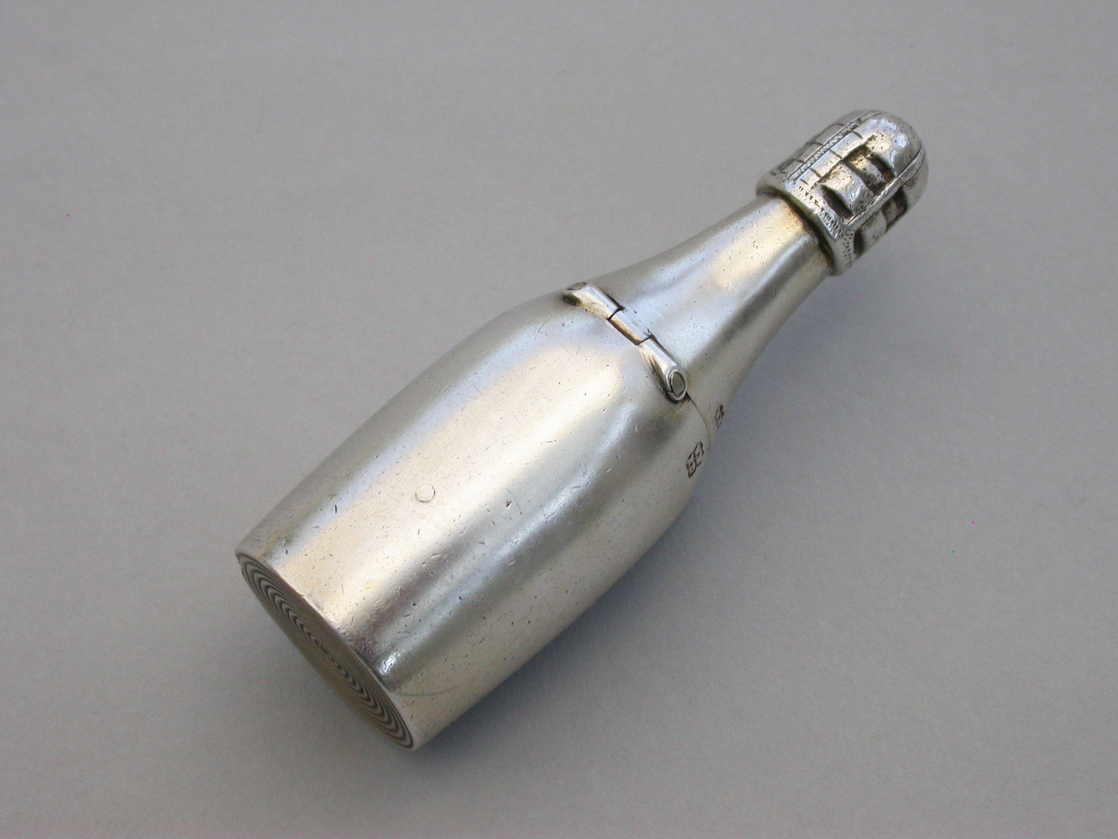 A rare Victorian novelty silver Vesta Case made in the form of a Champagne Bottle hinging at its centre and with a striker to the base. The label engraved with a family crest and dated 1887.