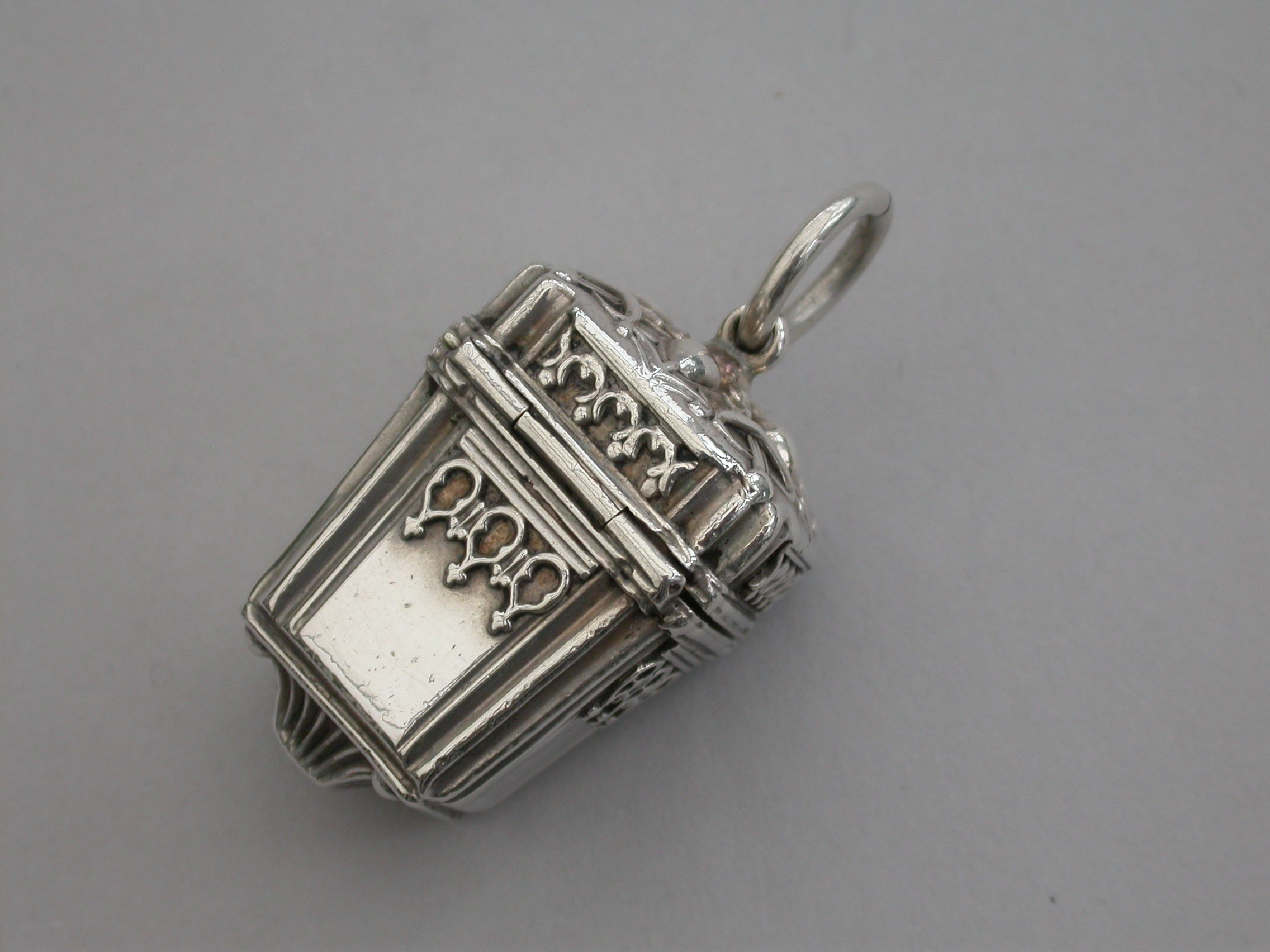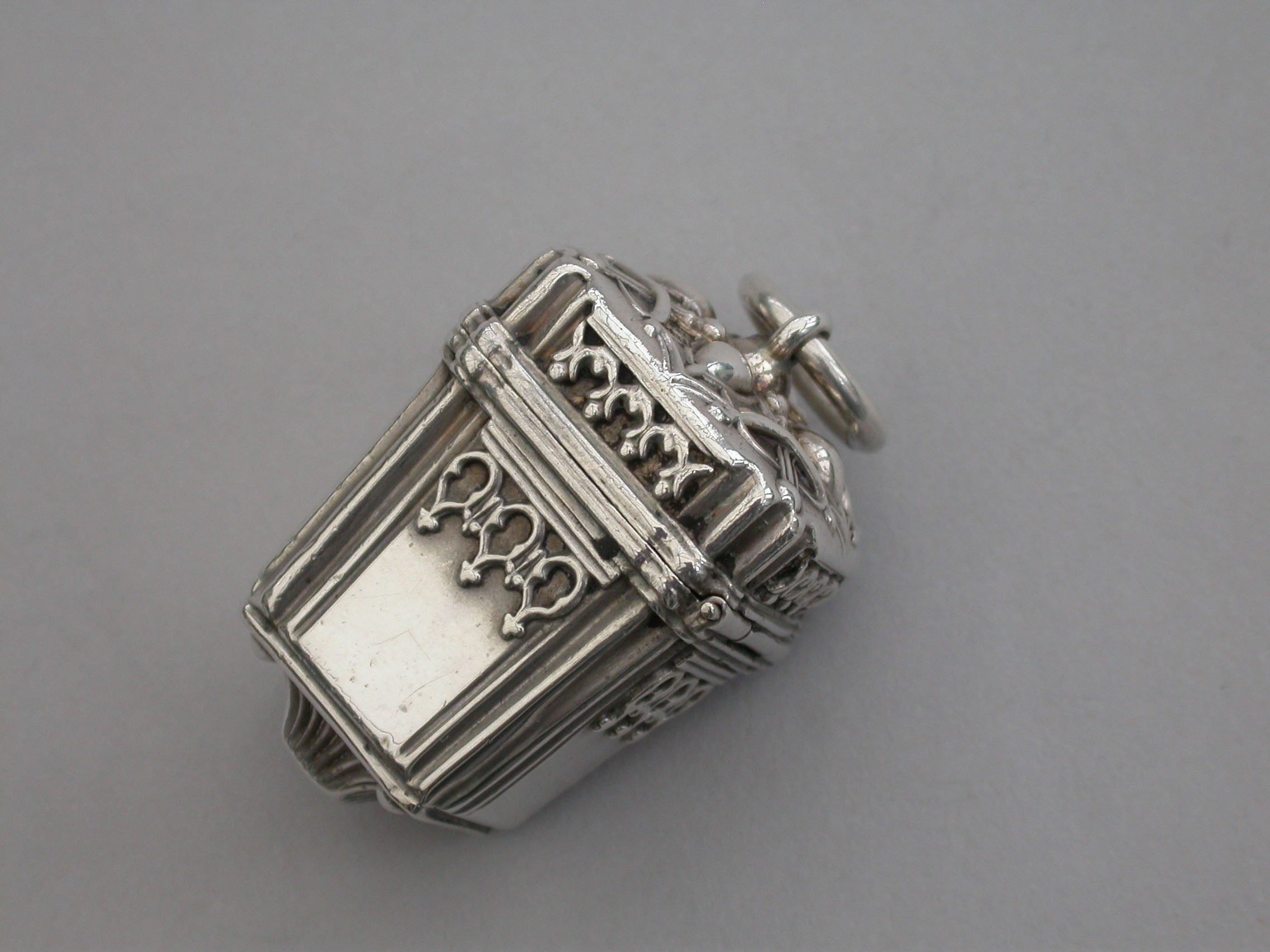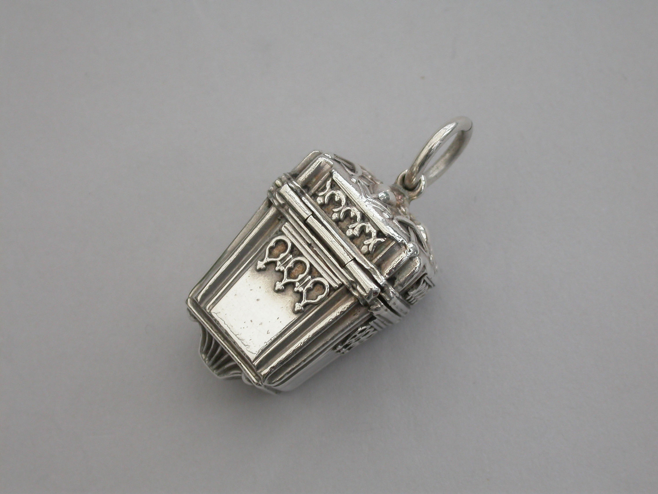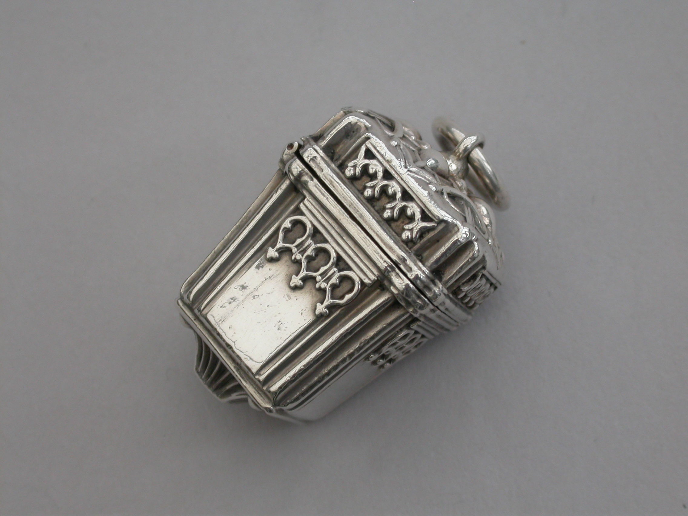 A rare Victorian novelty silver Vinaigrette formed as a Chinese Lantern, with reeded corners and applied bands of pierced fretwork, hinged at the shoulder with decorated lid and base, a suspension ring to the lid. The silver gilt interior with slightly domed pierced grille with a raised cross to the centre within a decorative border.