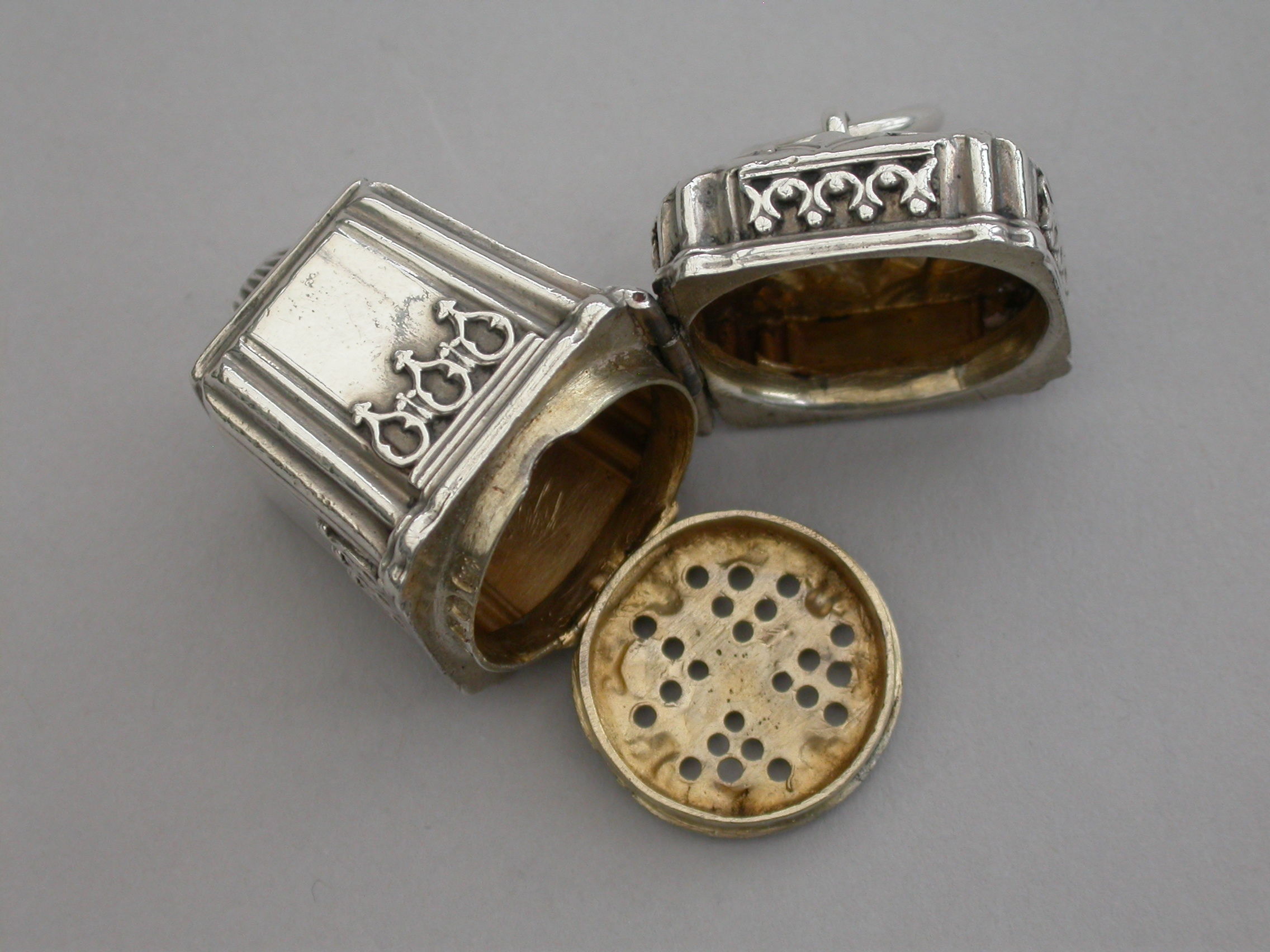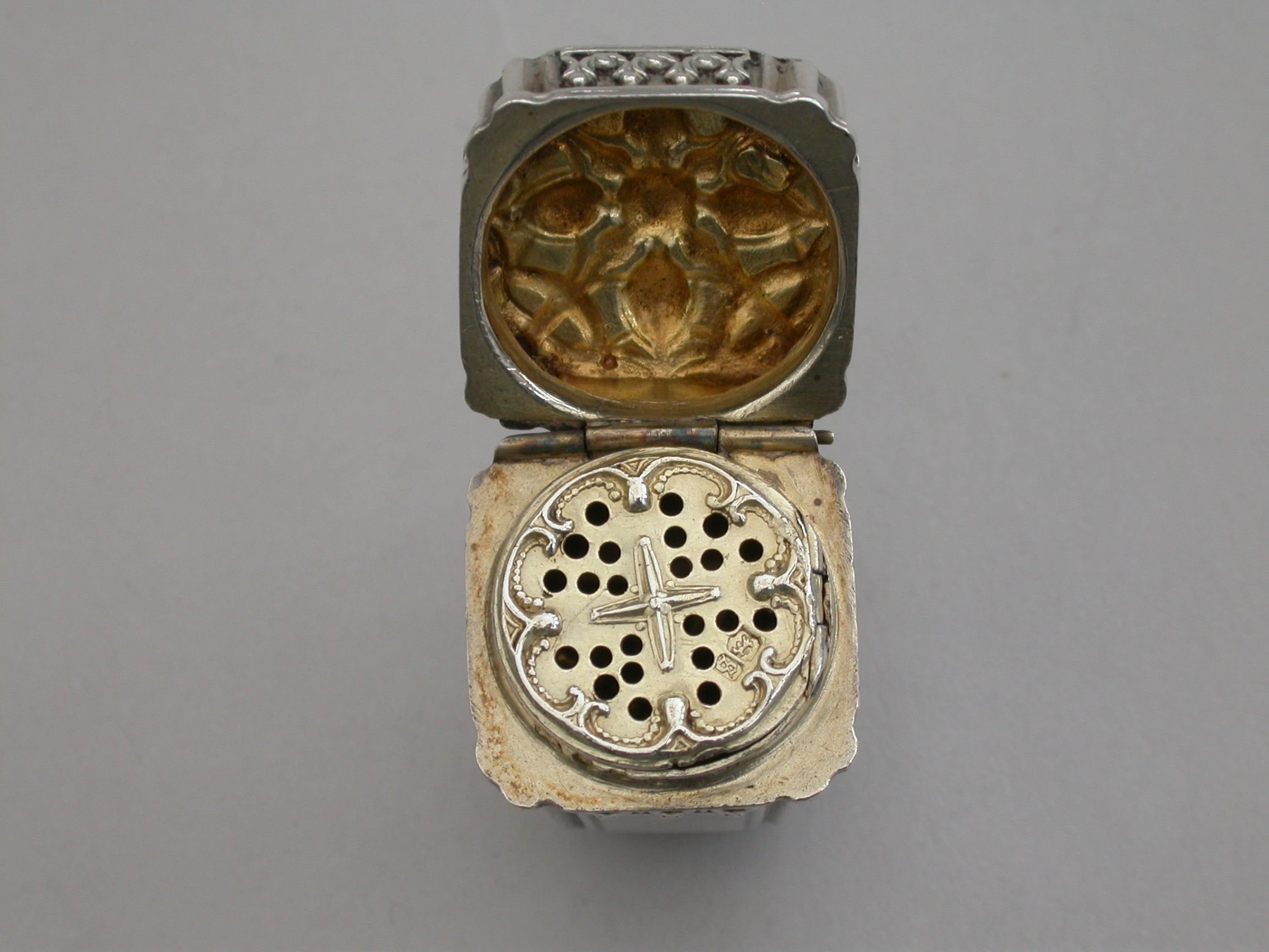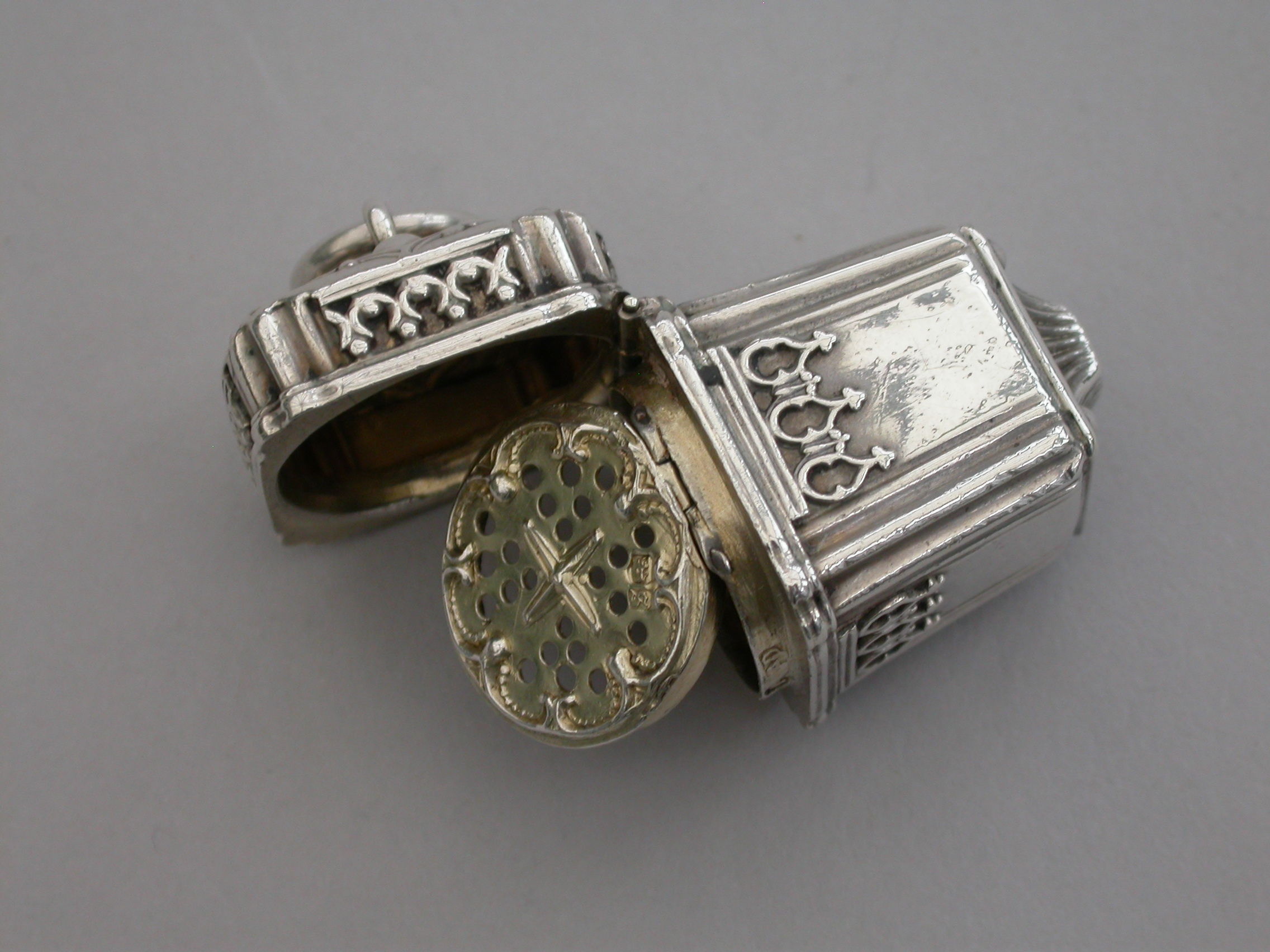 A rare Victorian novelty silver Vinaigrette formed as a Chinese Lantern, with reeded corners and applied bands of pierced fretwork, hinged at the shoulder with decorated lid and base, a suspension ring to the lid. The silver gilt interior with slightly domed pierced grille with a raised cross to the centre within a decorative border.