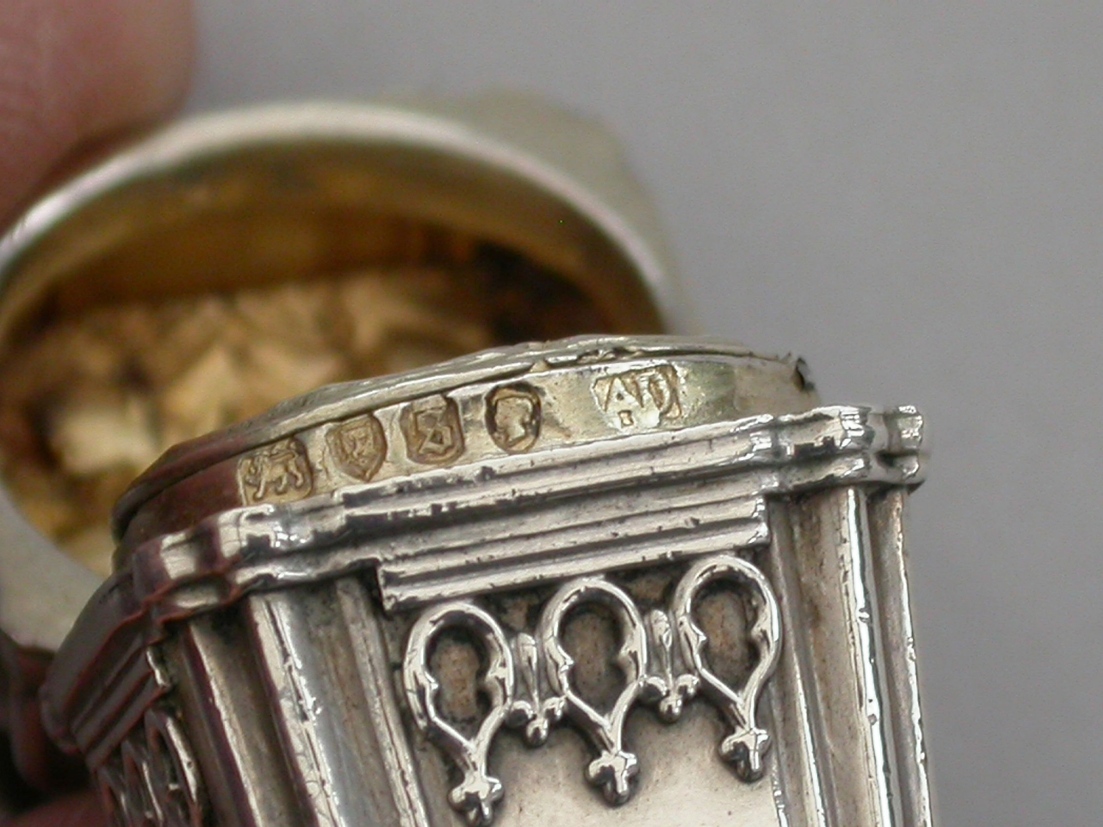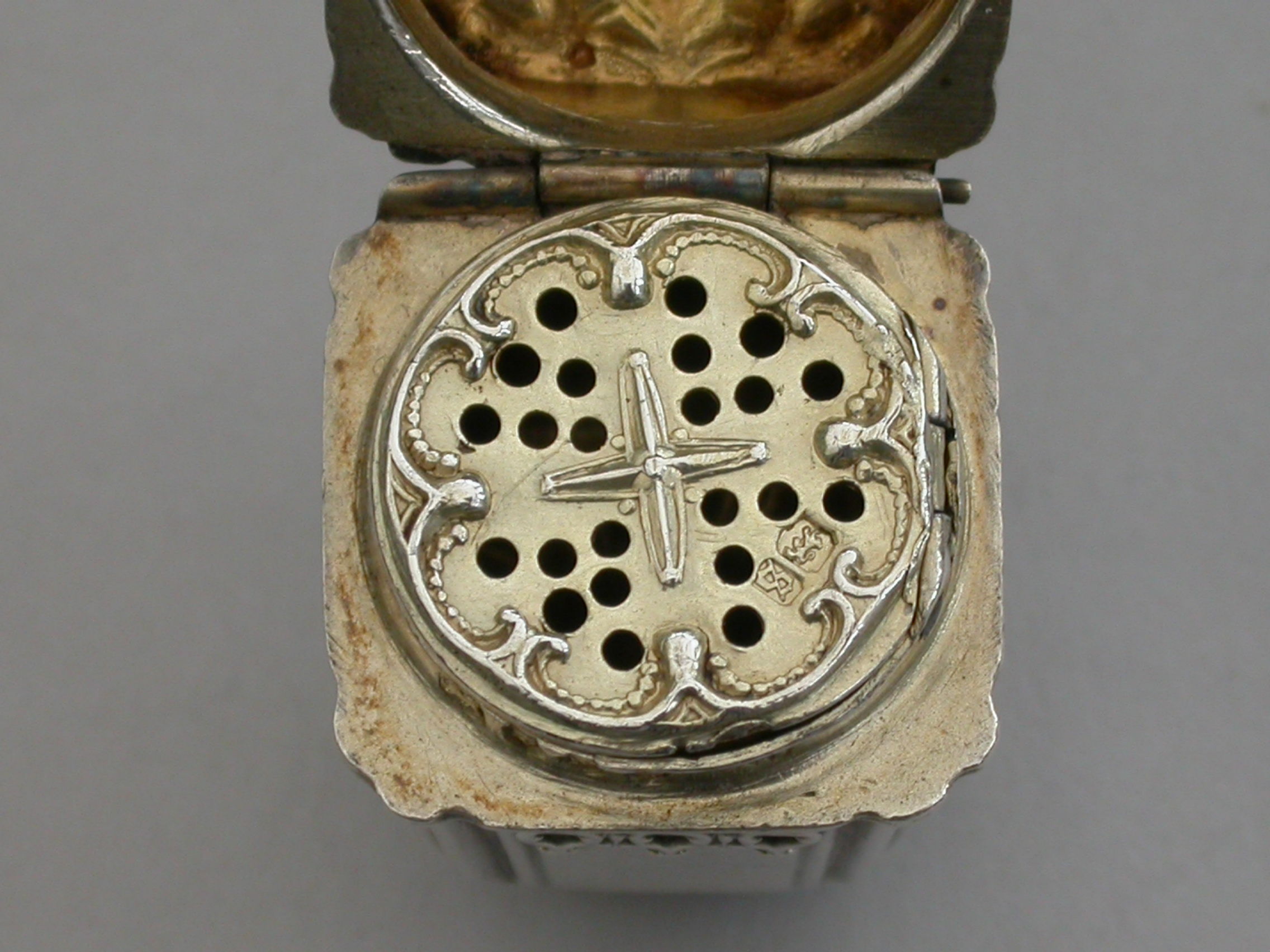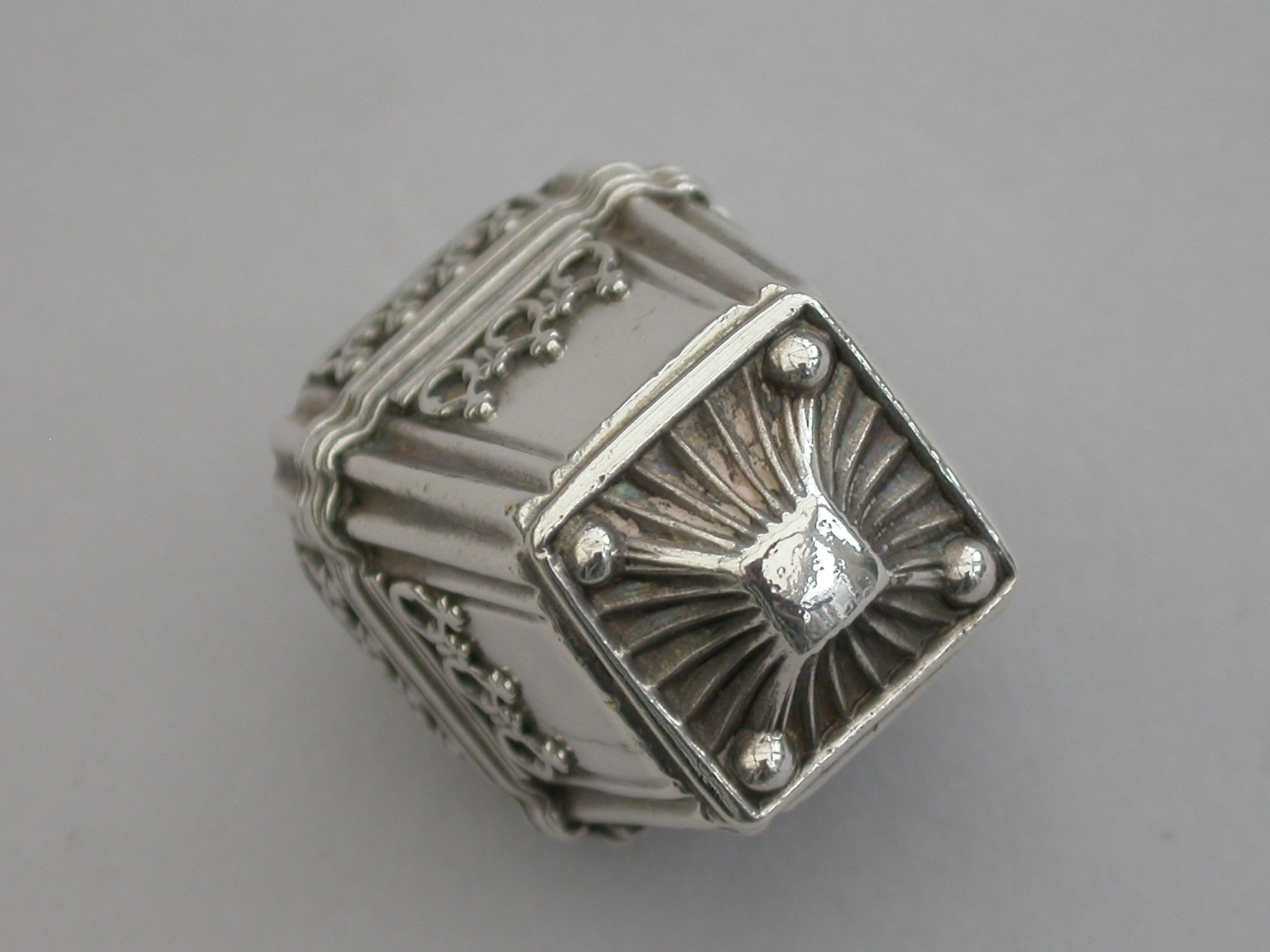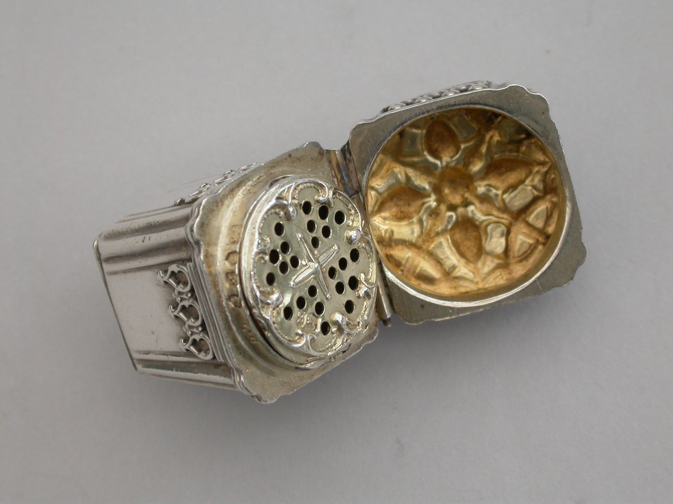 A rare Victorian novelty silver Vinaigrette formed as a Chinese Lantern, with reeded corners and applied bands of pierced fretwork, hinged at the shoulder with decorated lid and base, a suspension ring to the lid. The silver gilt interior with slightly domed pierced grille with a raised cross to the centre within a decorative border.