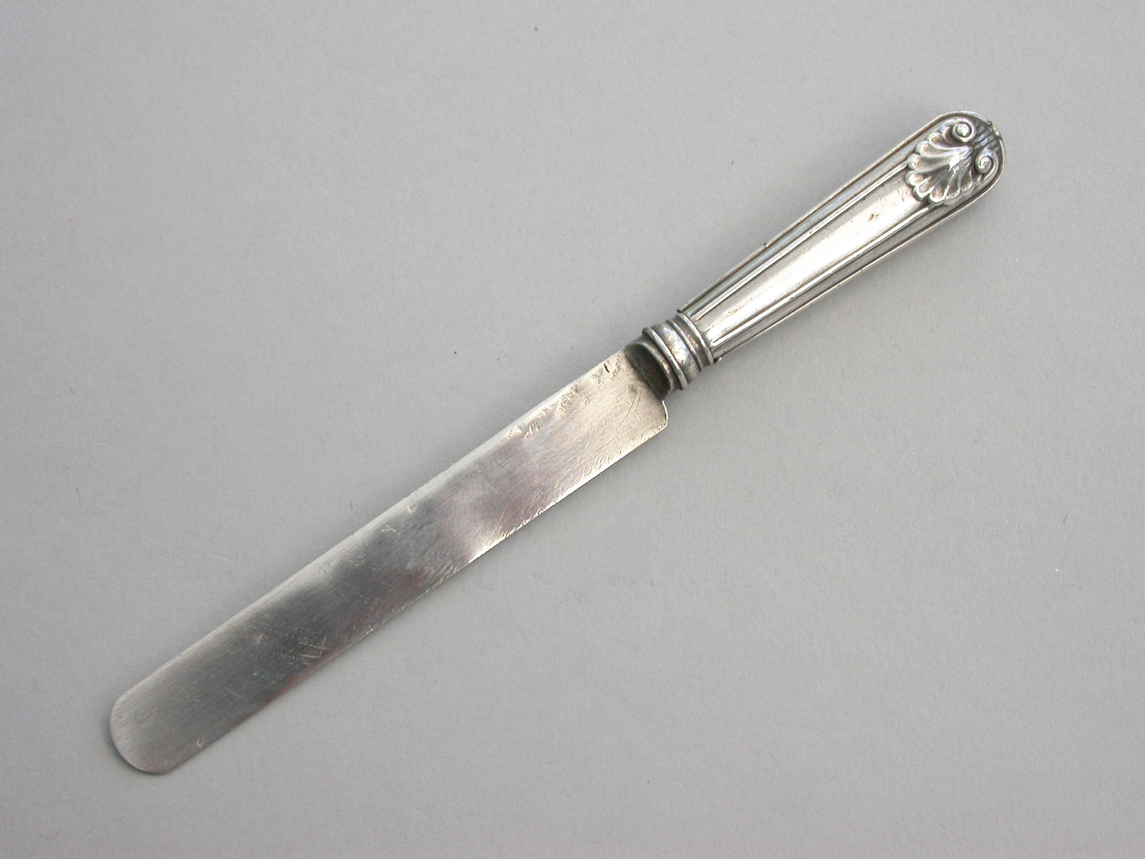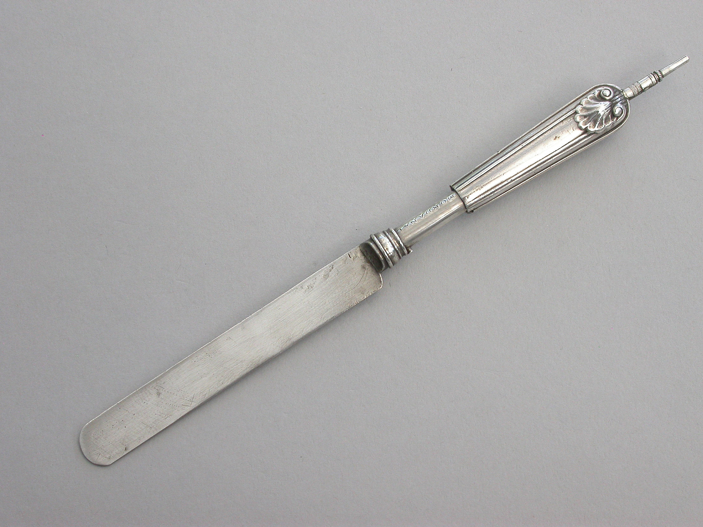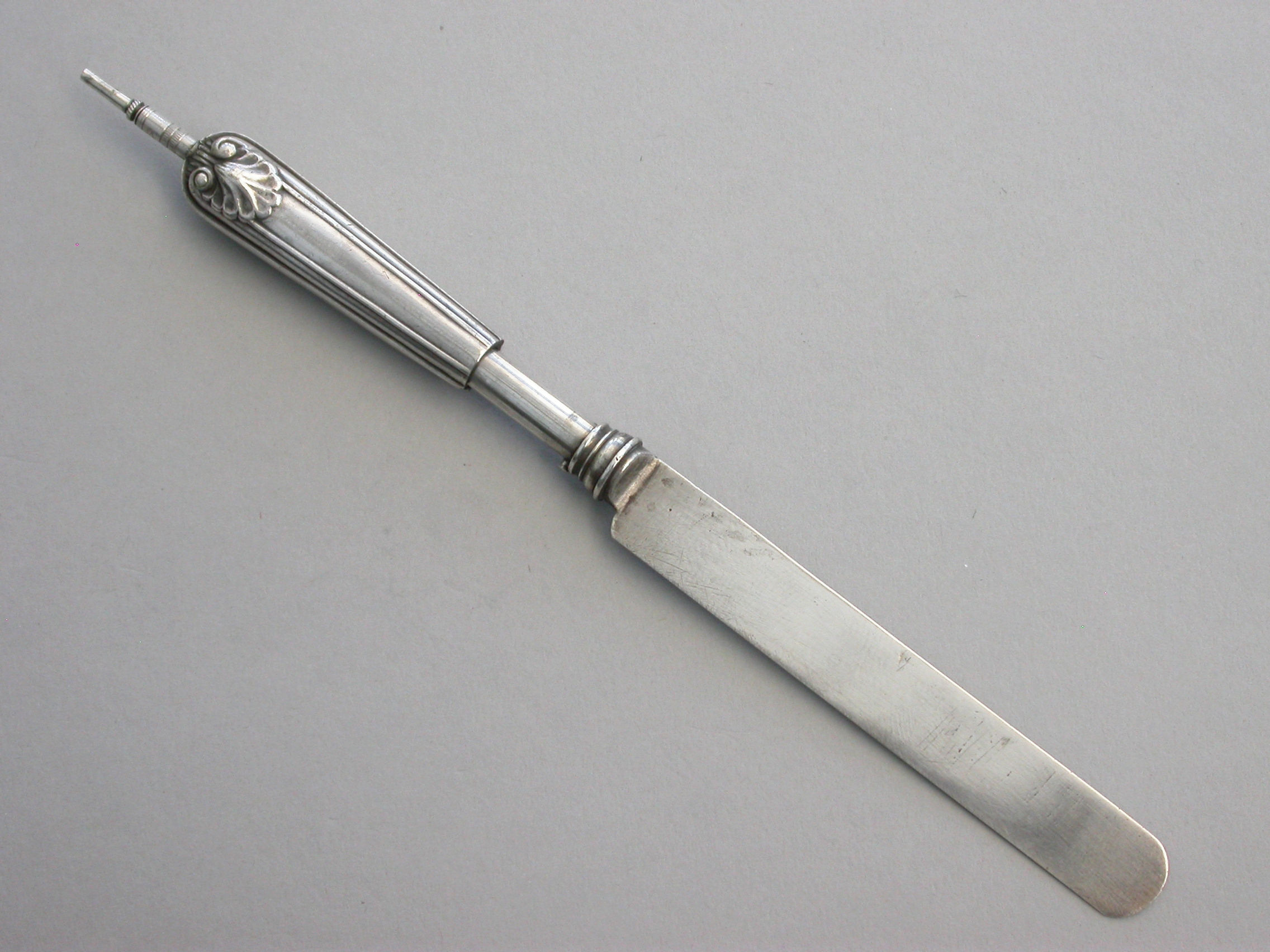 A rare Victorian novelty silver telescopic Propelling Pencil, made in the form of a Dessert Knife with Old English thread and shell pattern handle.