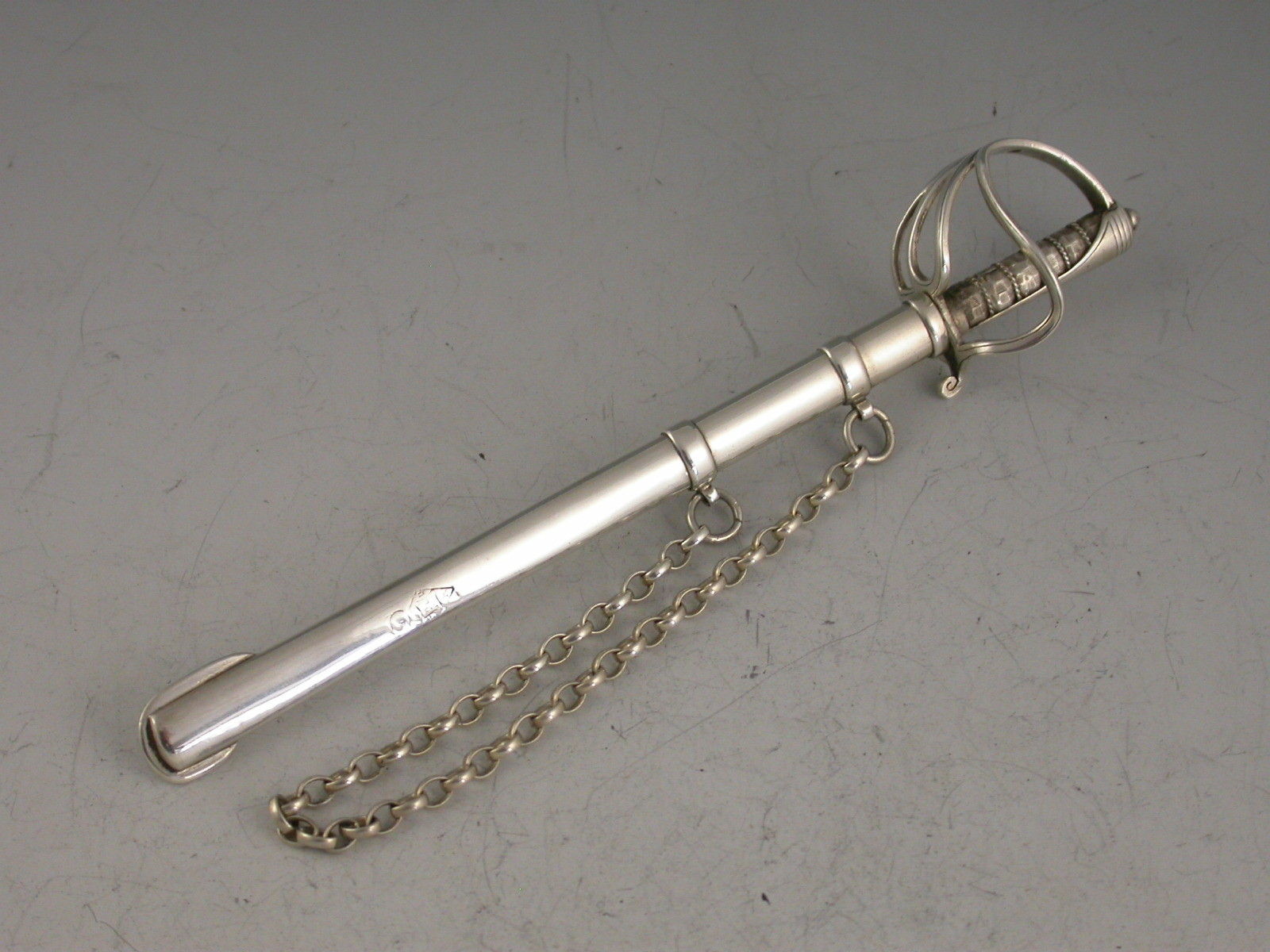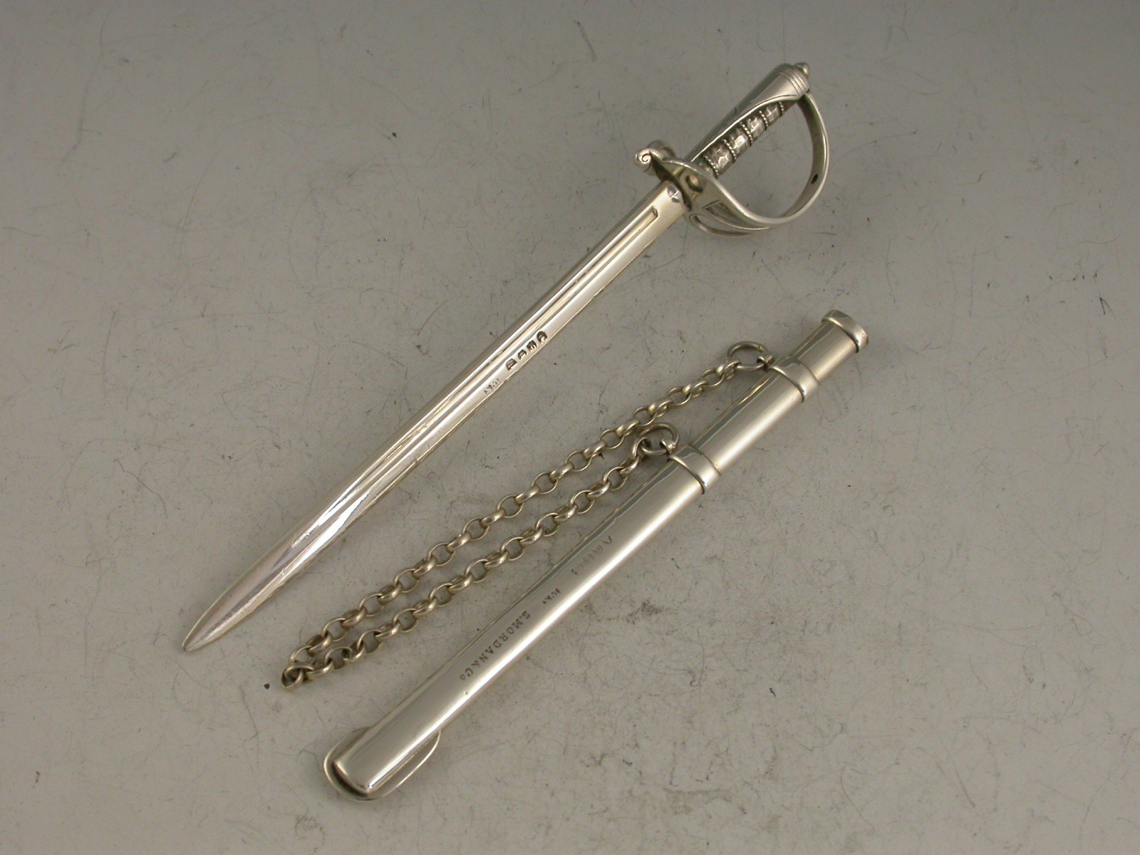 A rare Victorian novelty silver Letter Opener, made in the form of an Officers Dress Sword, complete with scabbard and suspension chain.