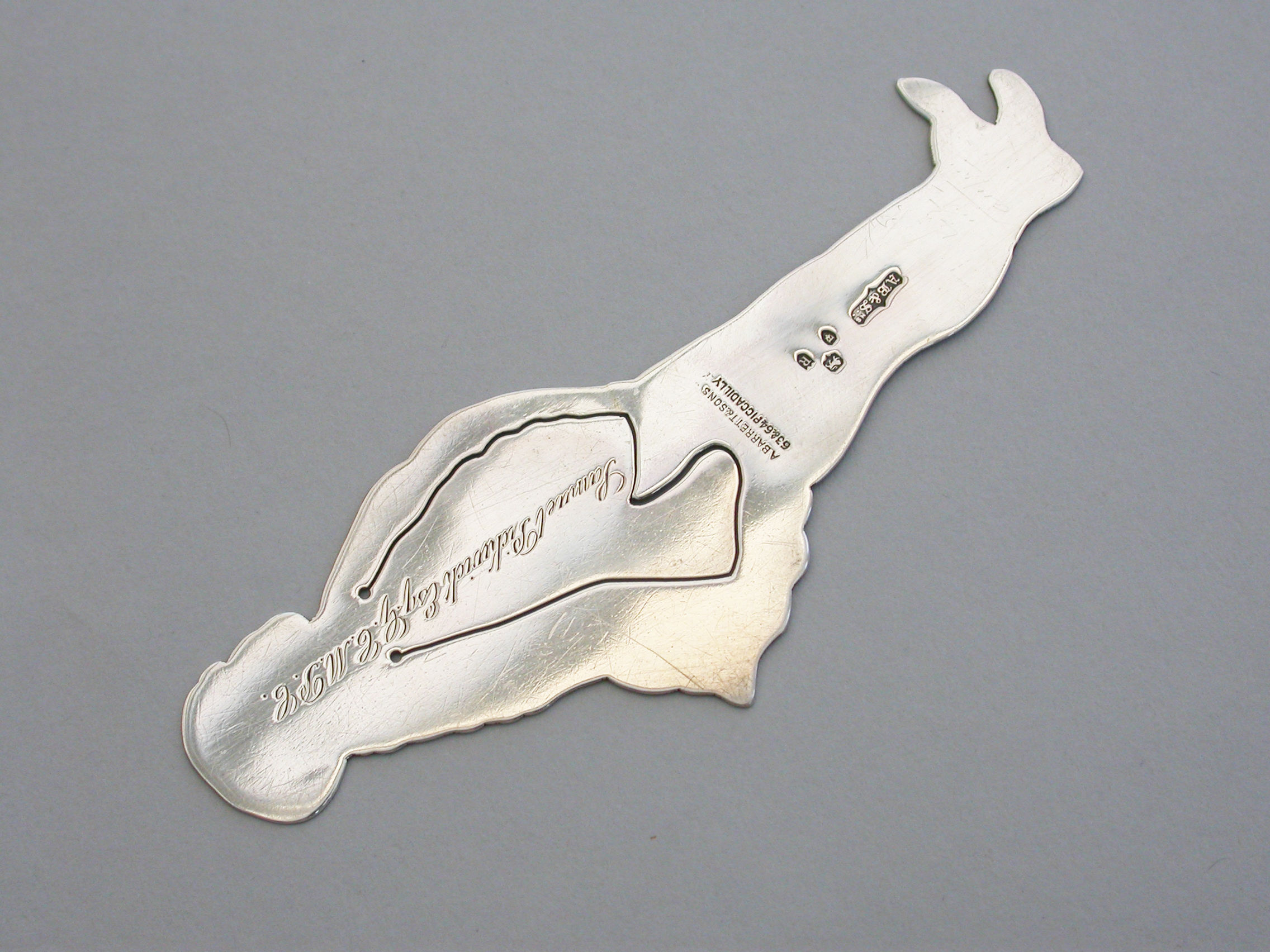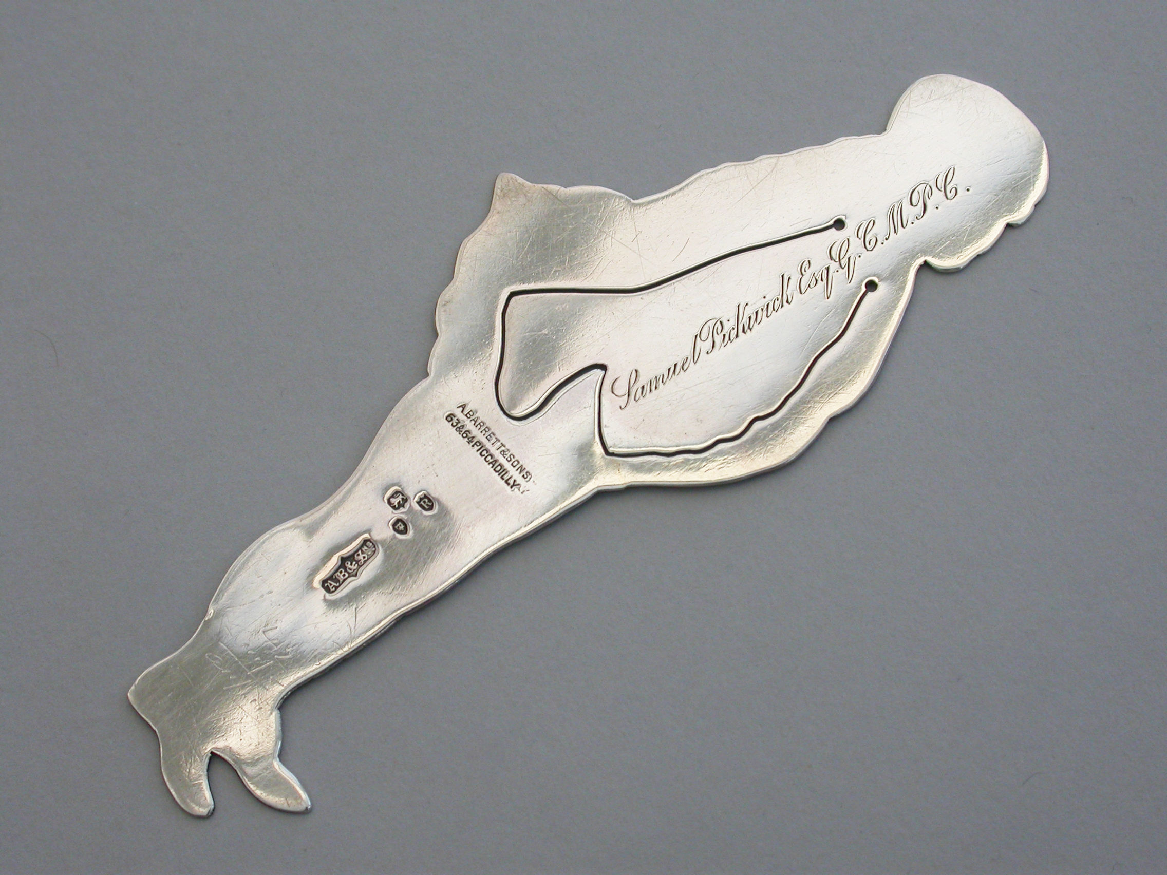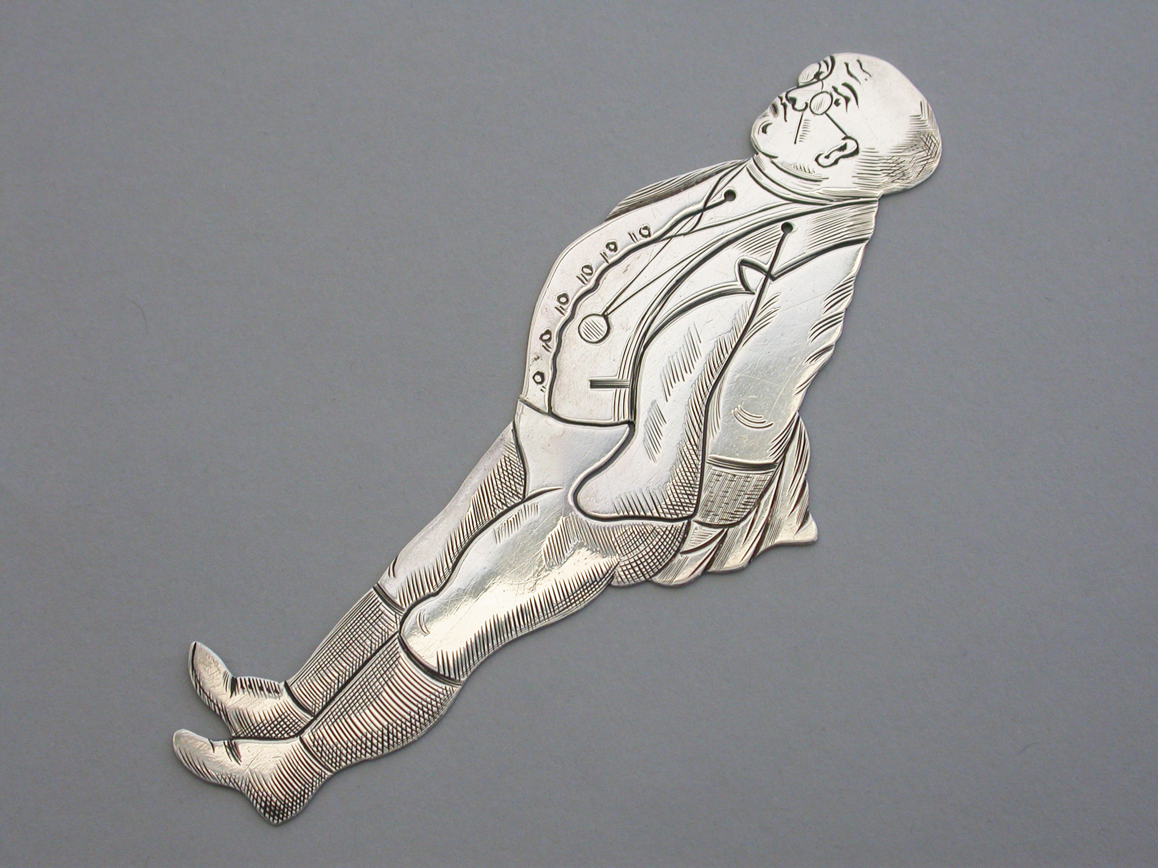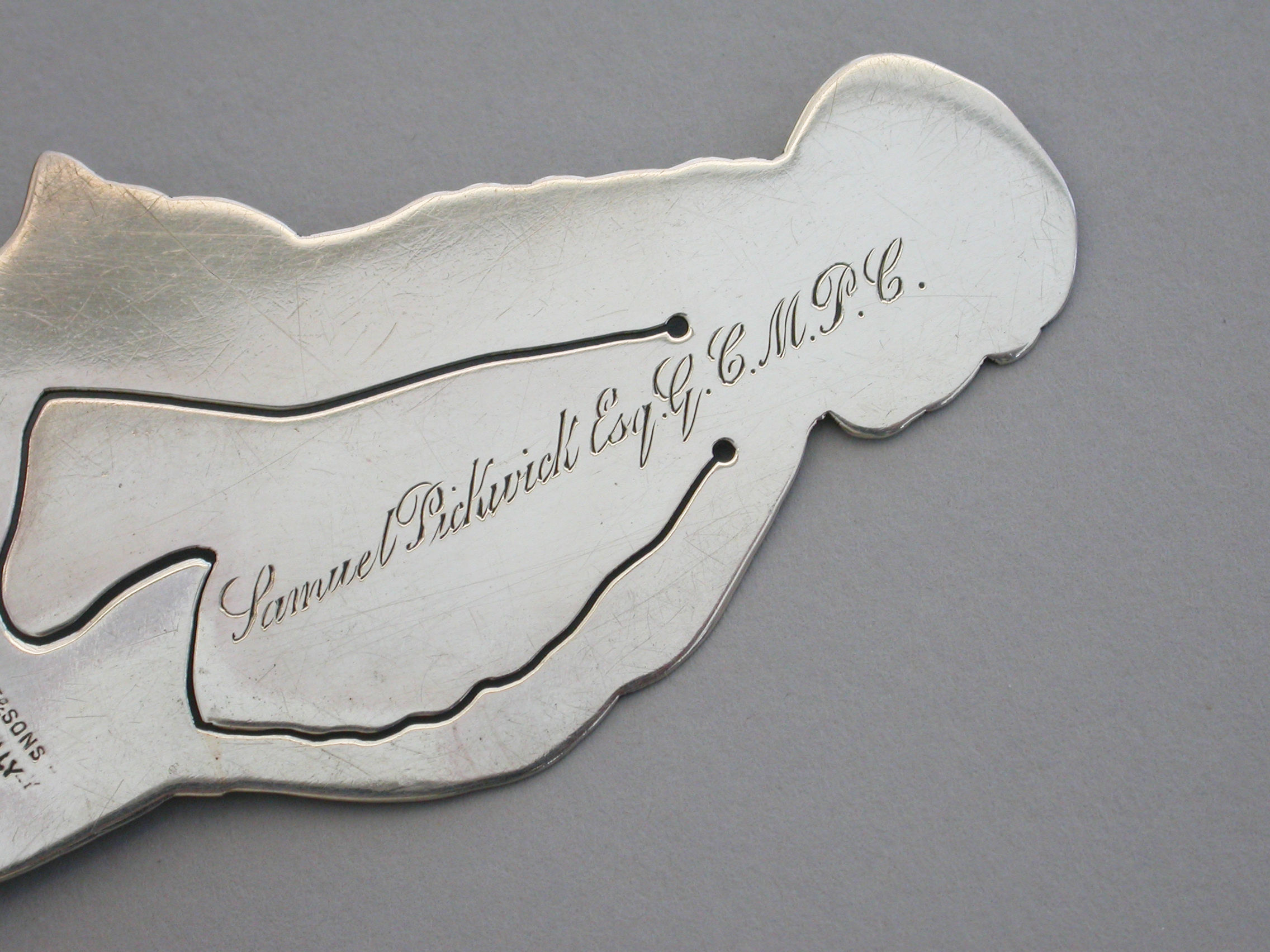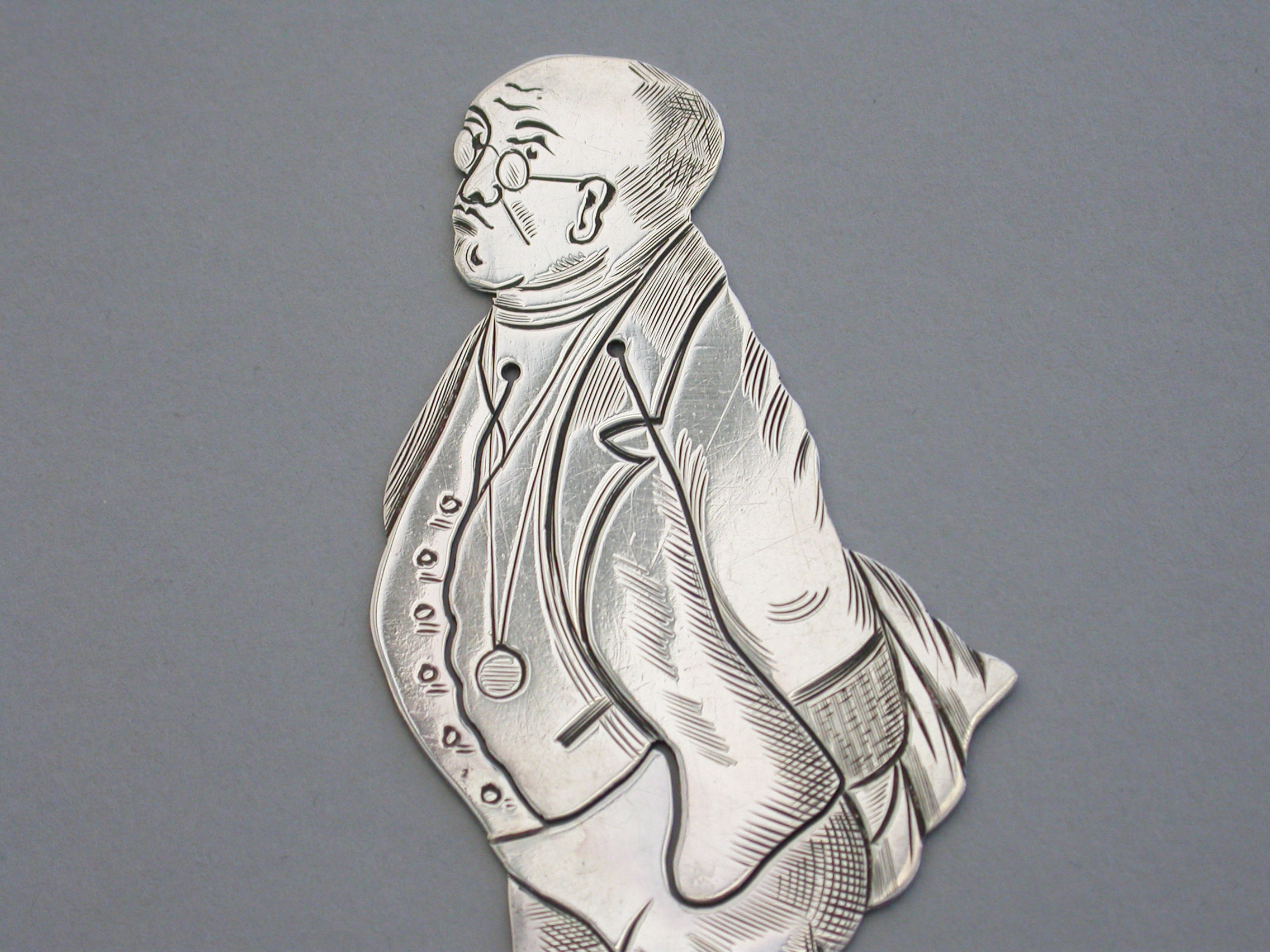 A rare Victorian novelty silver figural Bookmark depicting the character of Samuel Pickwick from Charles Dickens's novel 'Pickwick Papers', of flat cut-out form with engraved decoration depicting Mr Pickwick (General Chairman - Member Pickwick Club, addressing the club). Engraved to the reverse - 'Samuel Pickwick Esq. G.C.M.P.C.'