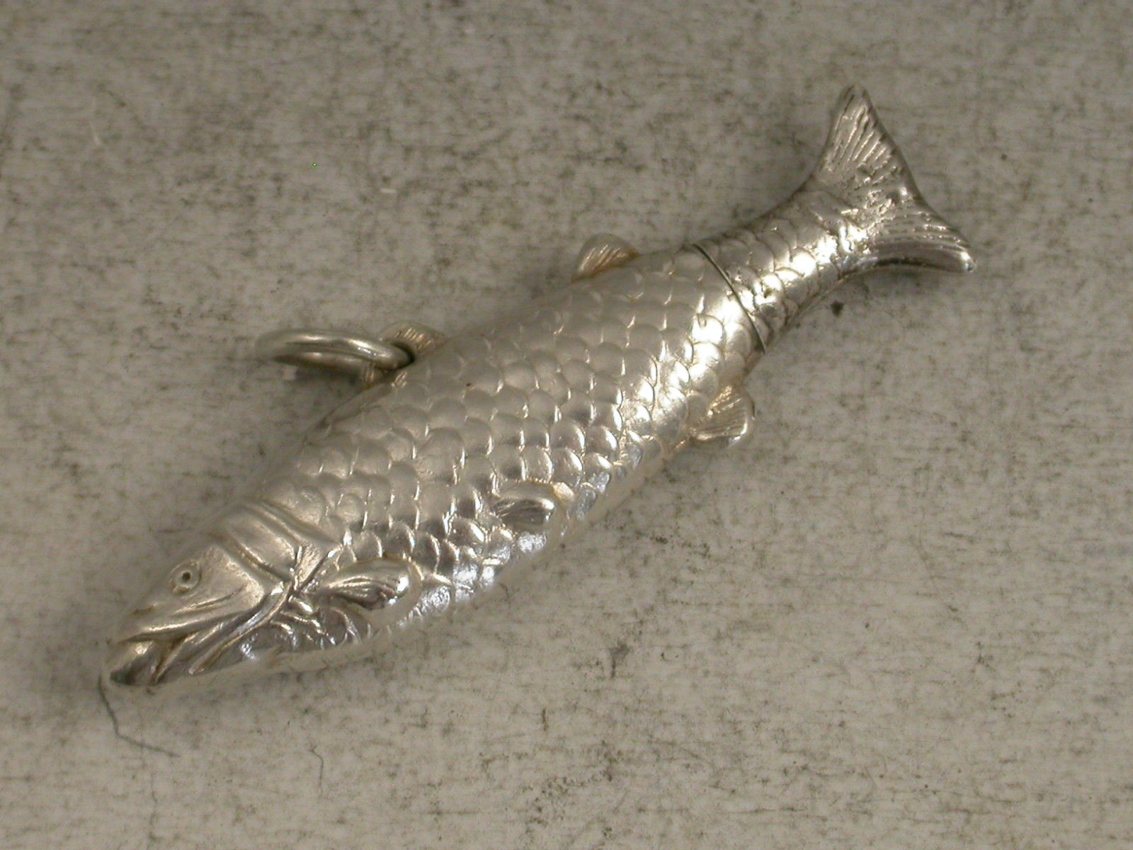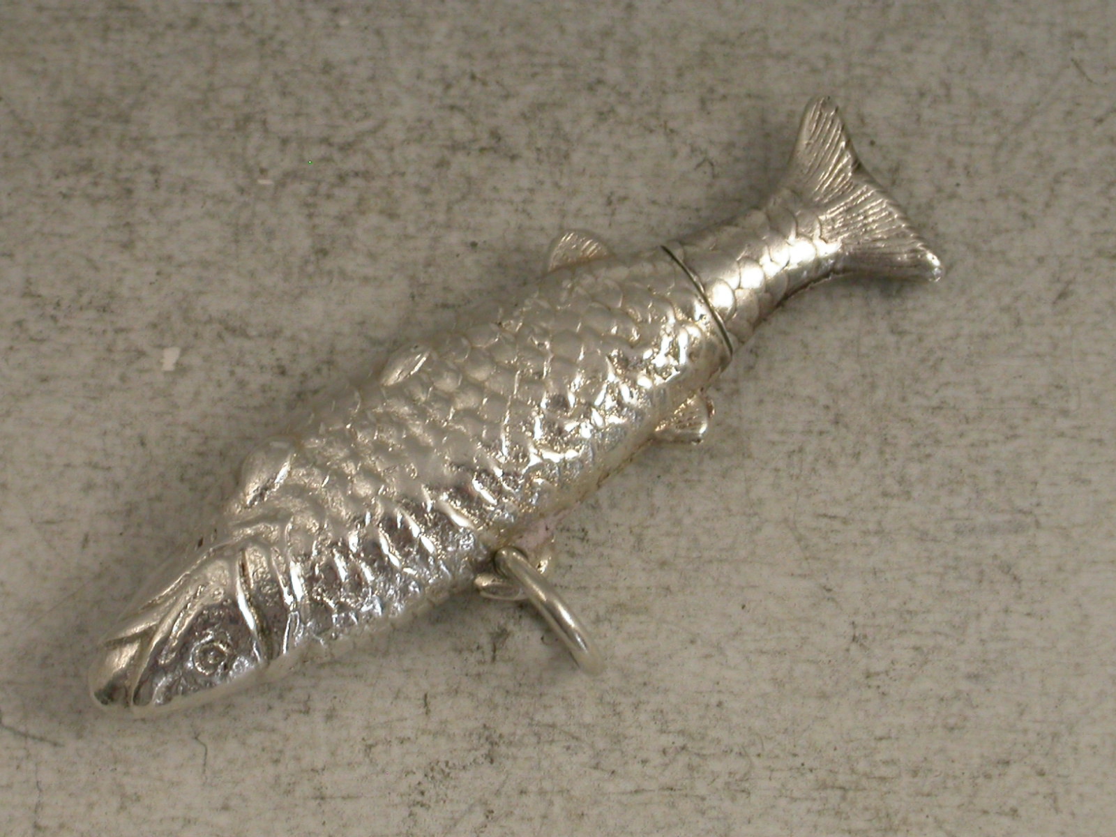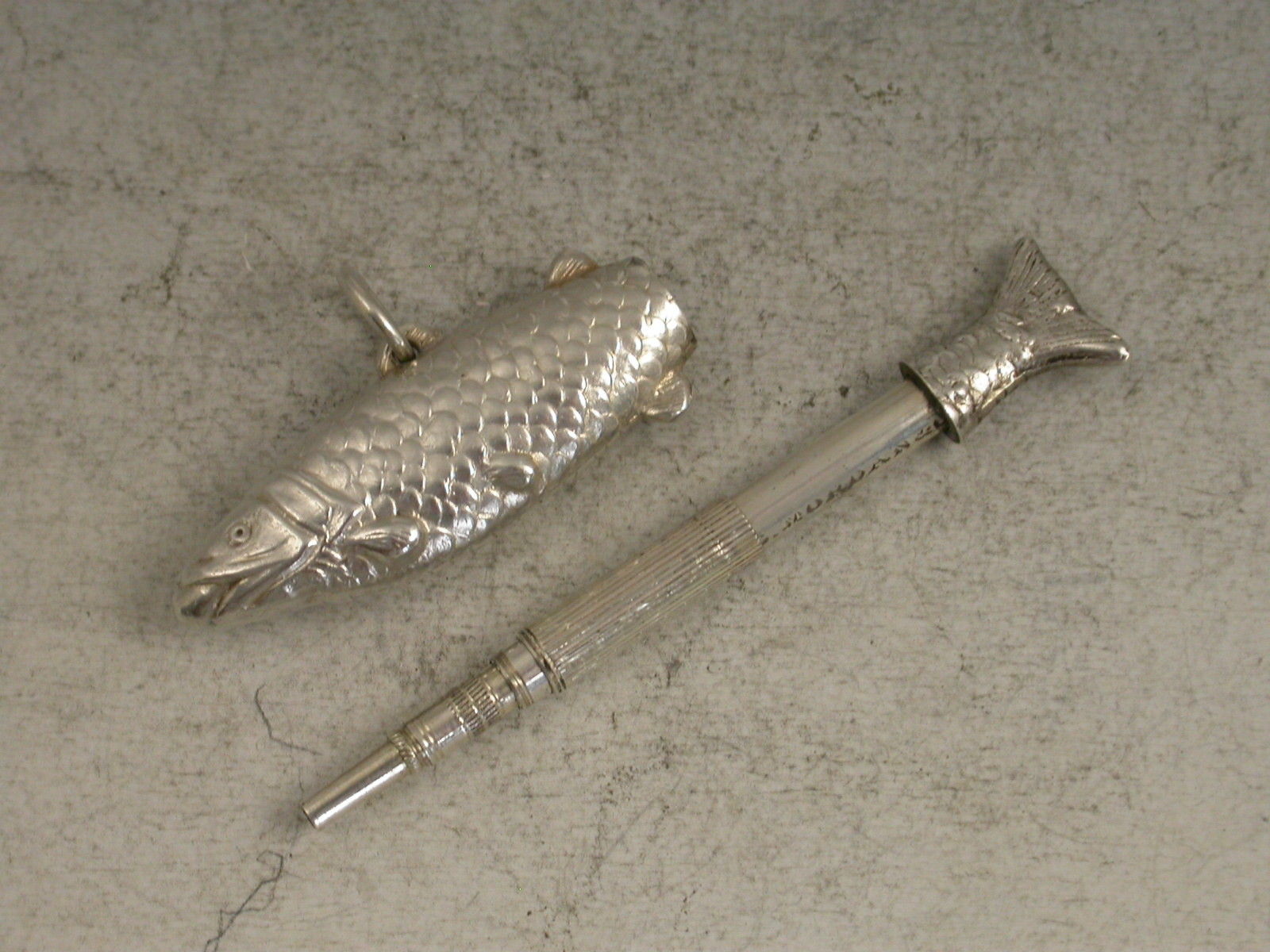 A rare Victorian novelty silver Propelling Pencil made in the form of Salmon, the pencil pulling out from the tail and automatically extending.