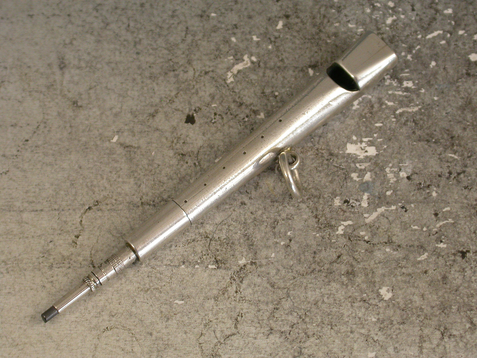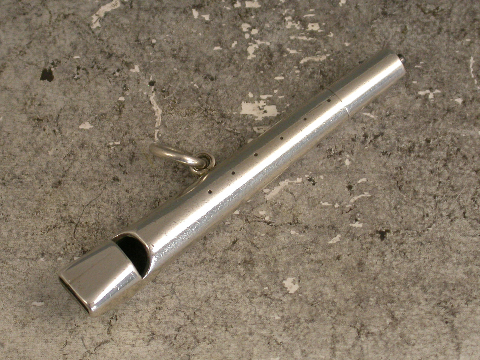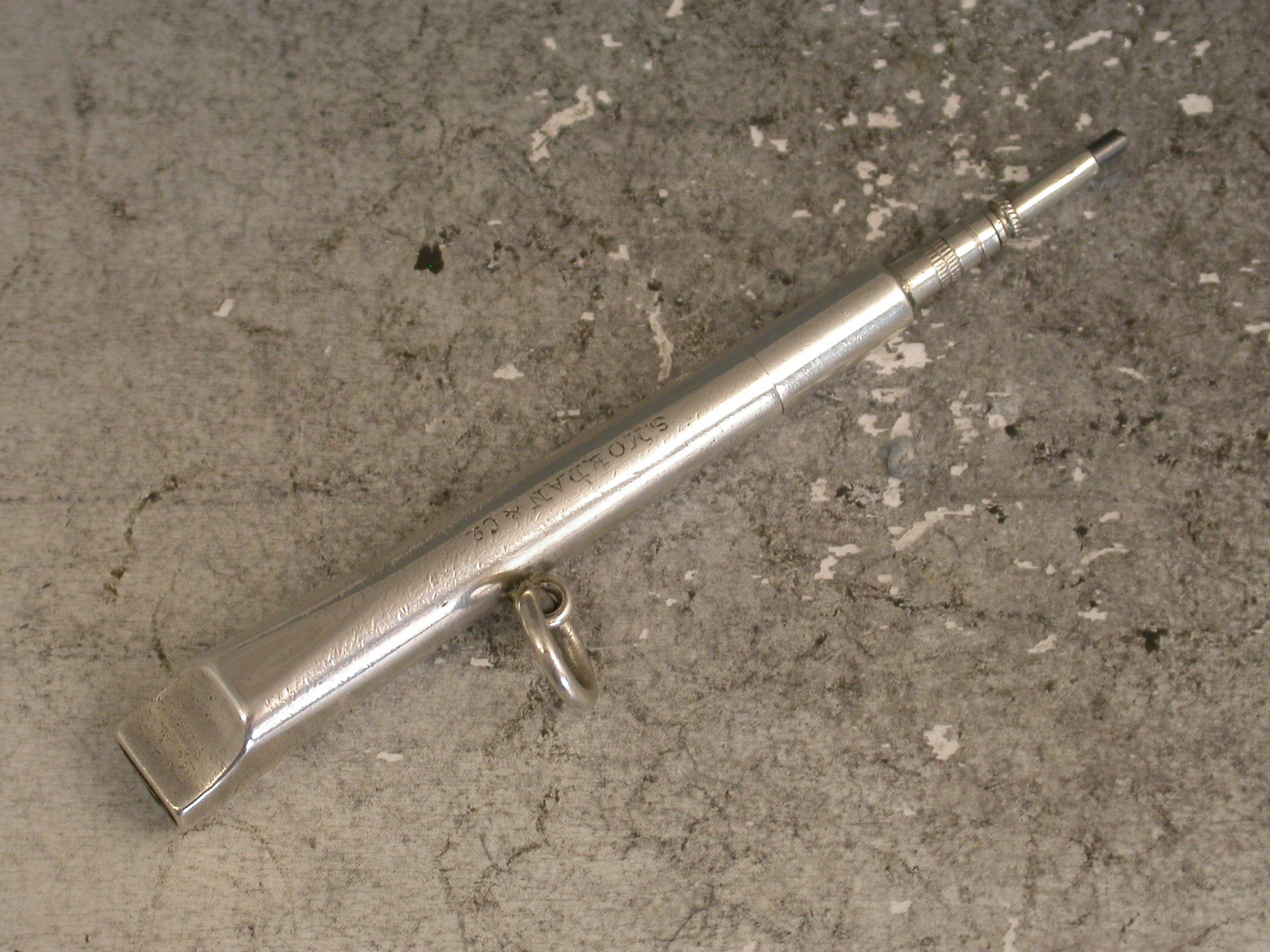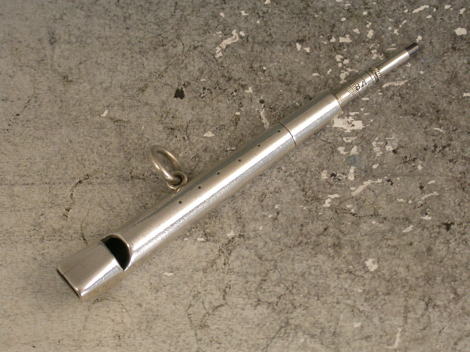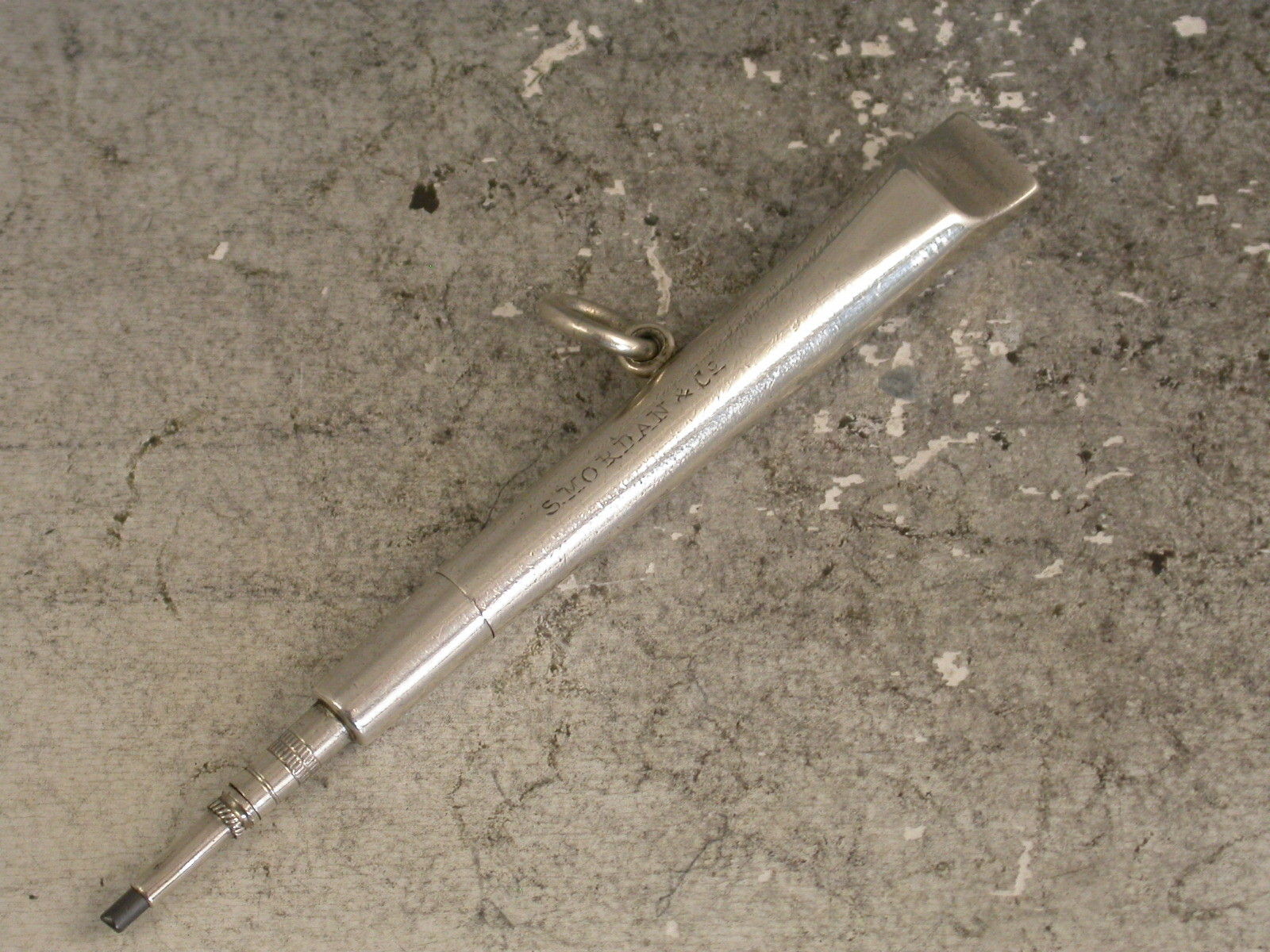 A rare Victorian novelty silver Propelling Pencil made in the form of a flute or penny whistle, engraved with six dots to simulate the holes. Twist action to propel the pencil and attached suspension ring.