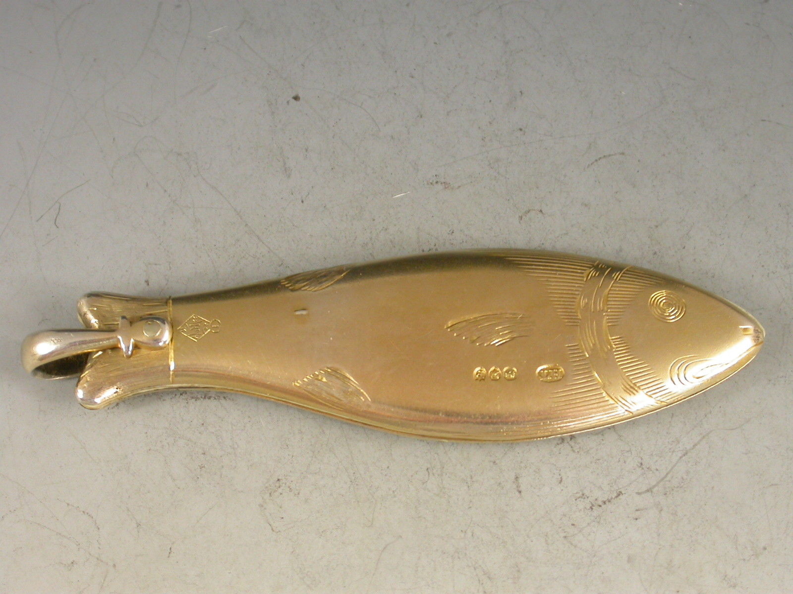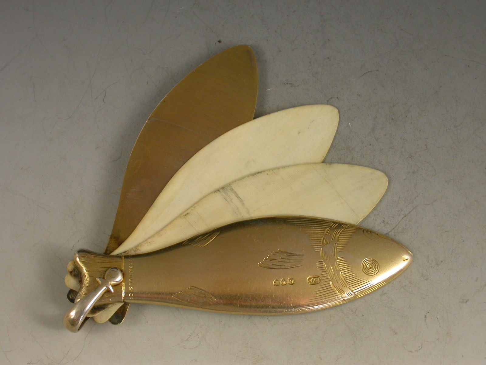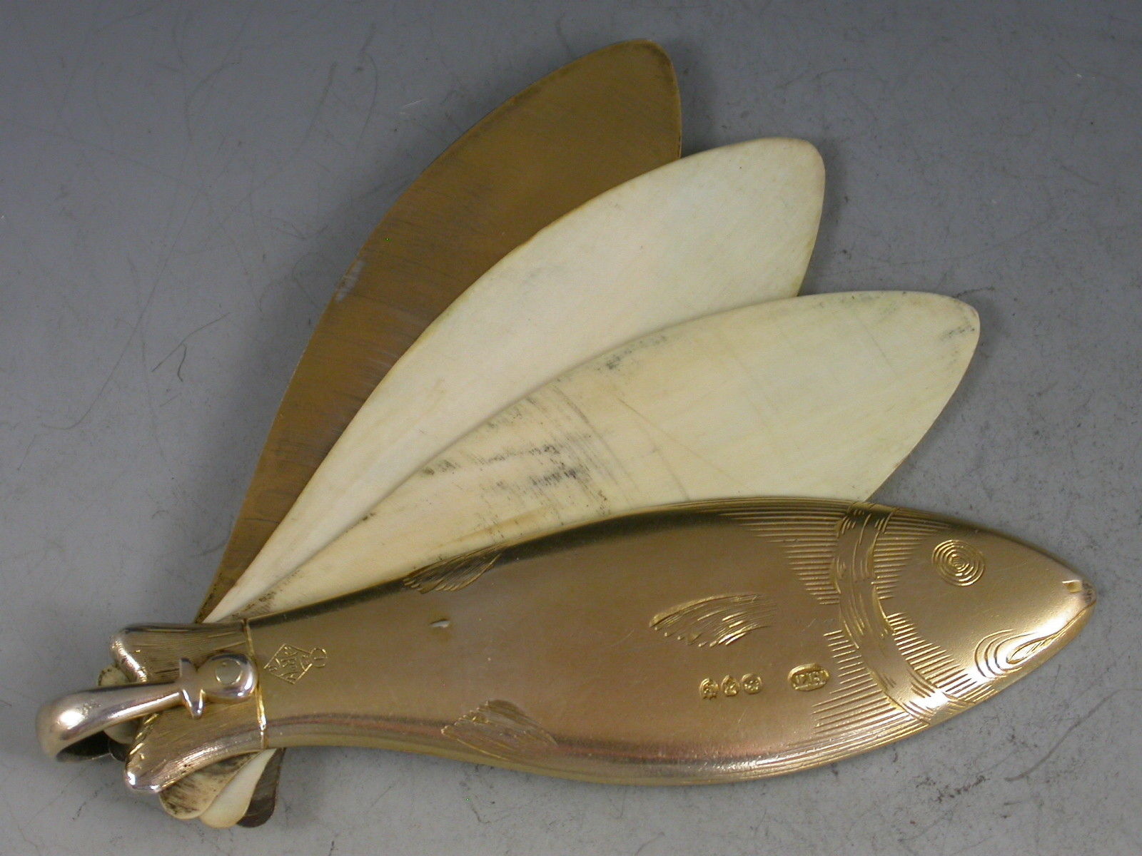An unusual Victorian novelty silver gilt Aide Memoire made in the form of a fish with engraved fins and details, containing two swiveling ivory pages and held together with a stirrup shaped loop.