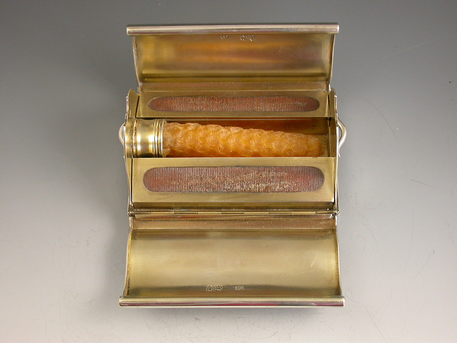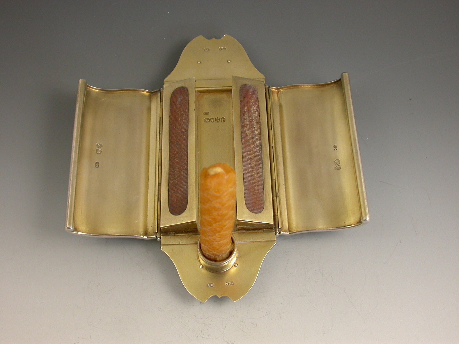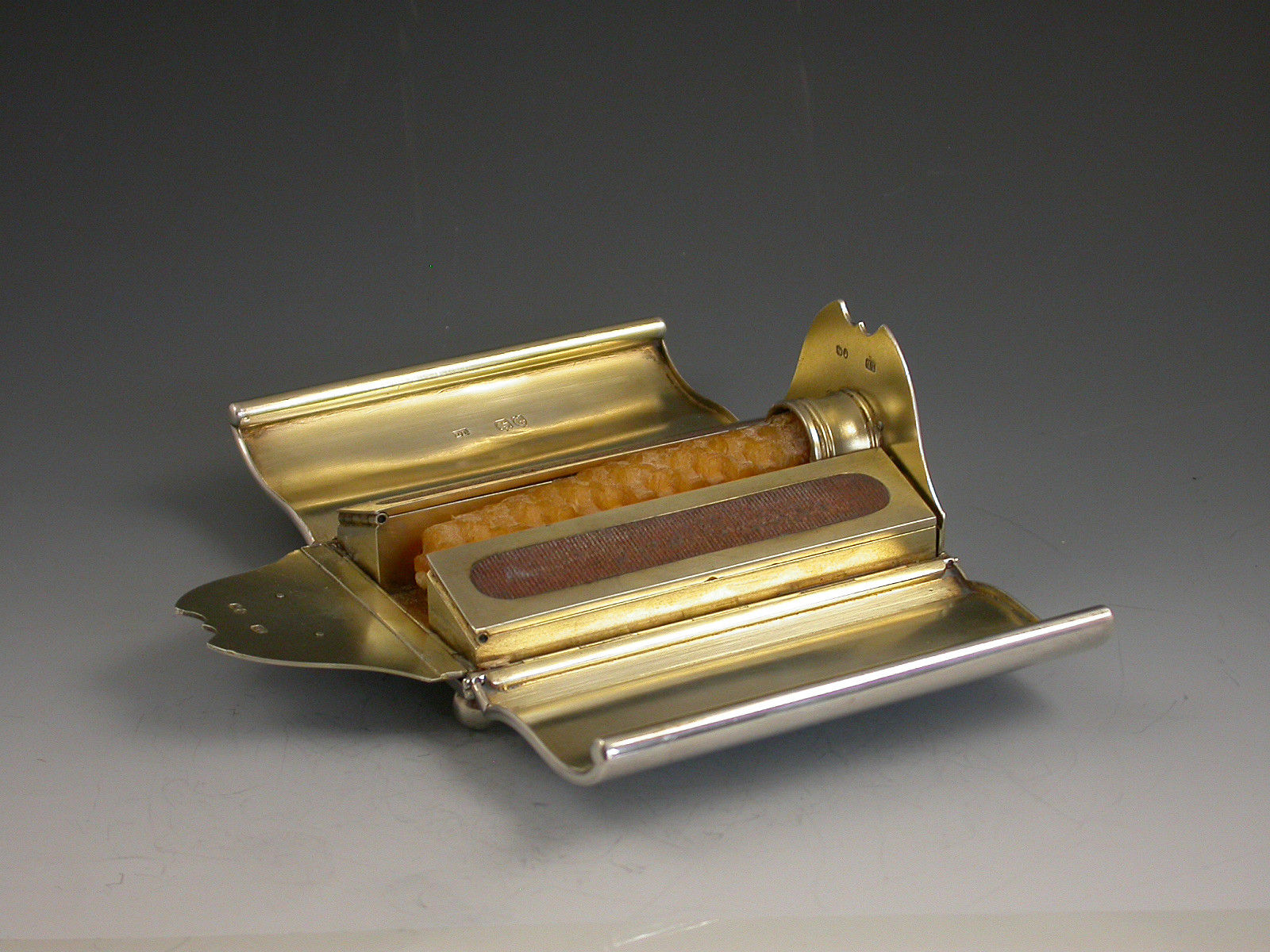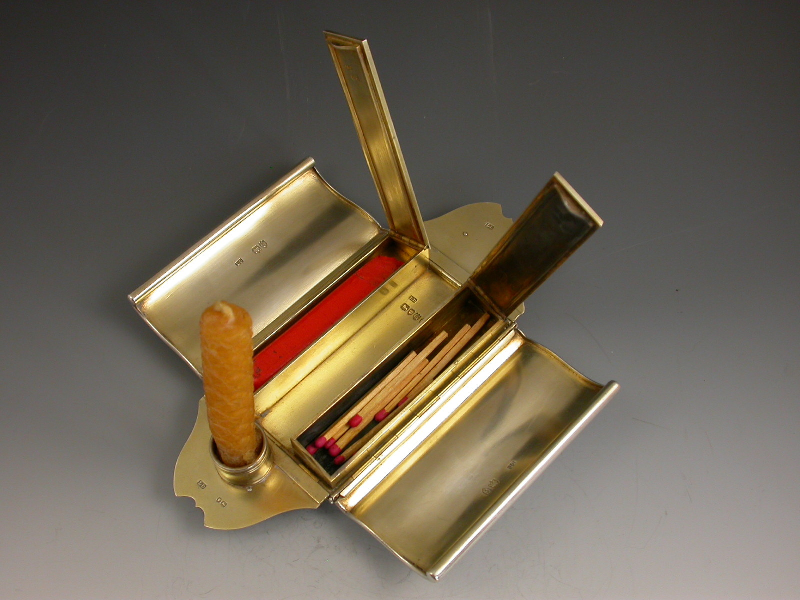 An extremely rare novelty silver table Vesta Case / Go To Bed, made in the form of a Gladstone Bag standing on four ball feet and with two carrying handles. The four sides are all hinged and open to reveal the silver gilt interior with two long hinged vesta boxes and a fold-out taper stick.