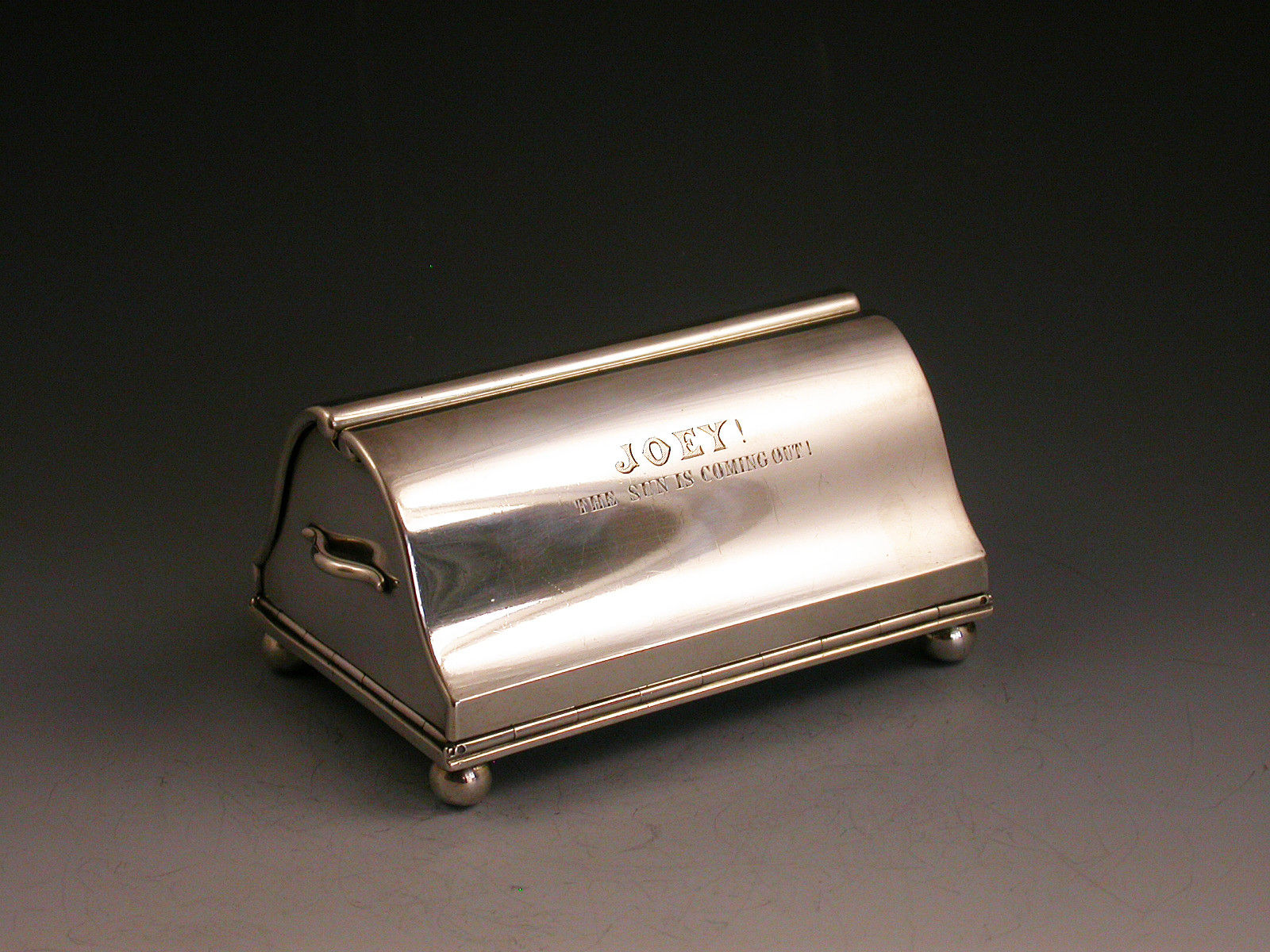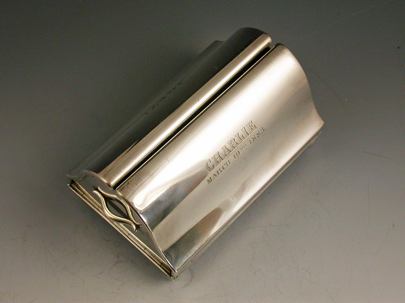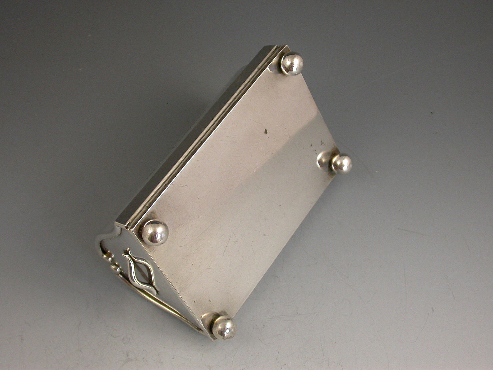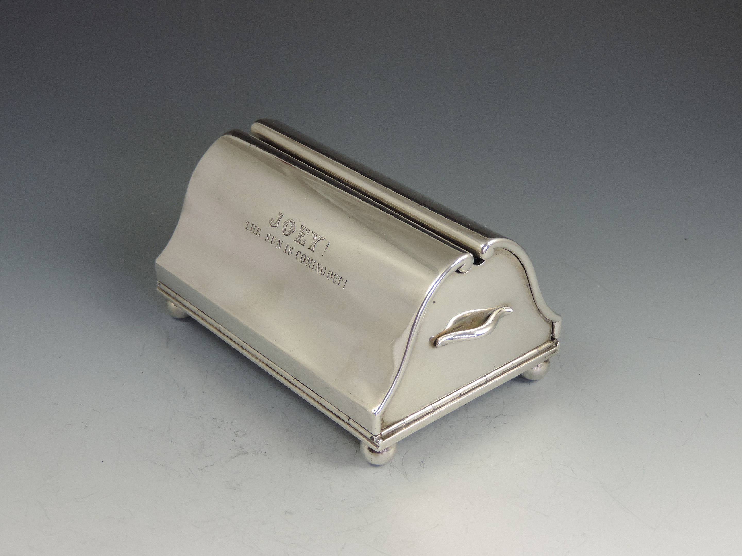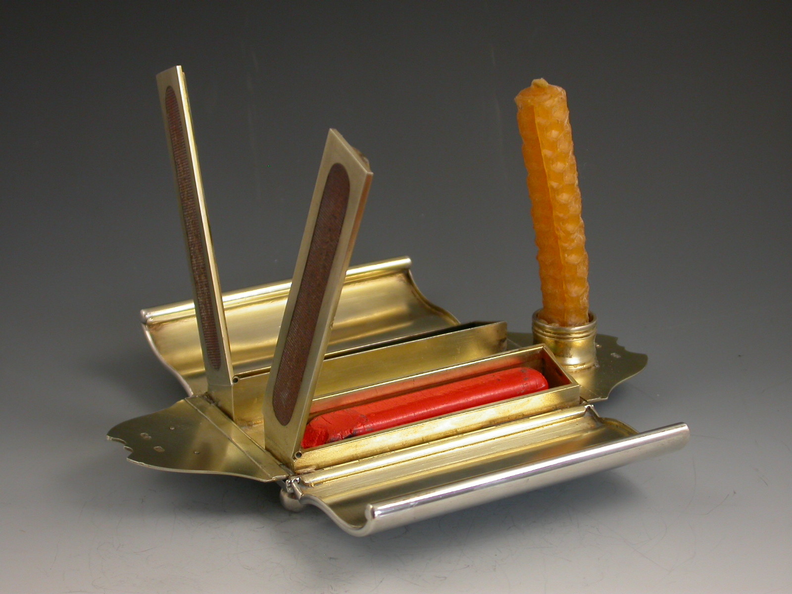 An extremely rare novelty silver table Vesta Case / Go To Bed, made in the form of a Gladstone Bag standing on four ball feet and with two carrying handles. The four sides are all hinged and open to reveal the silver gilt interior with two long hinged vesta boxes and a fold-out taper stick.
