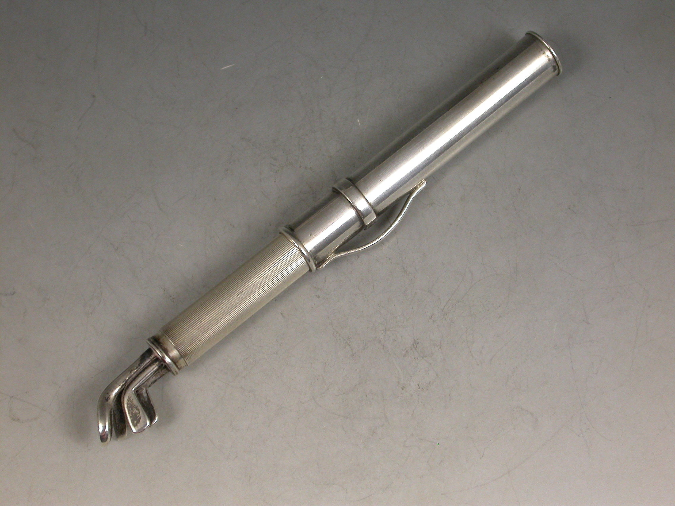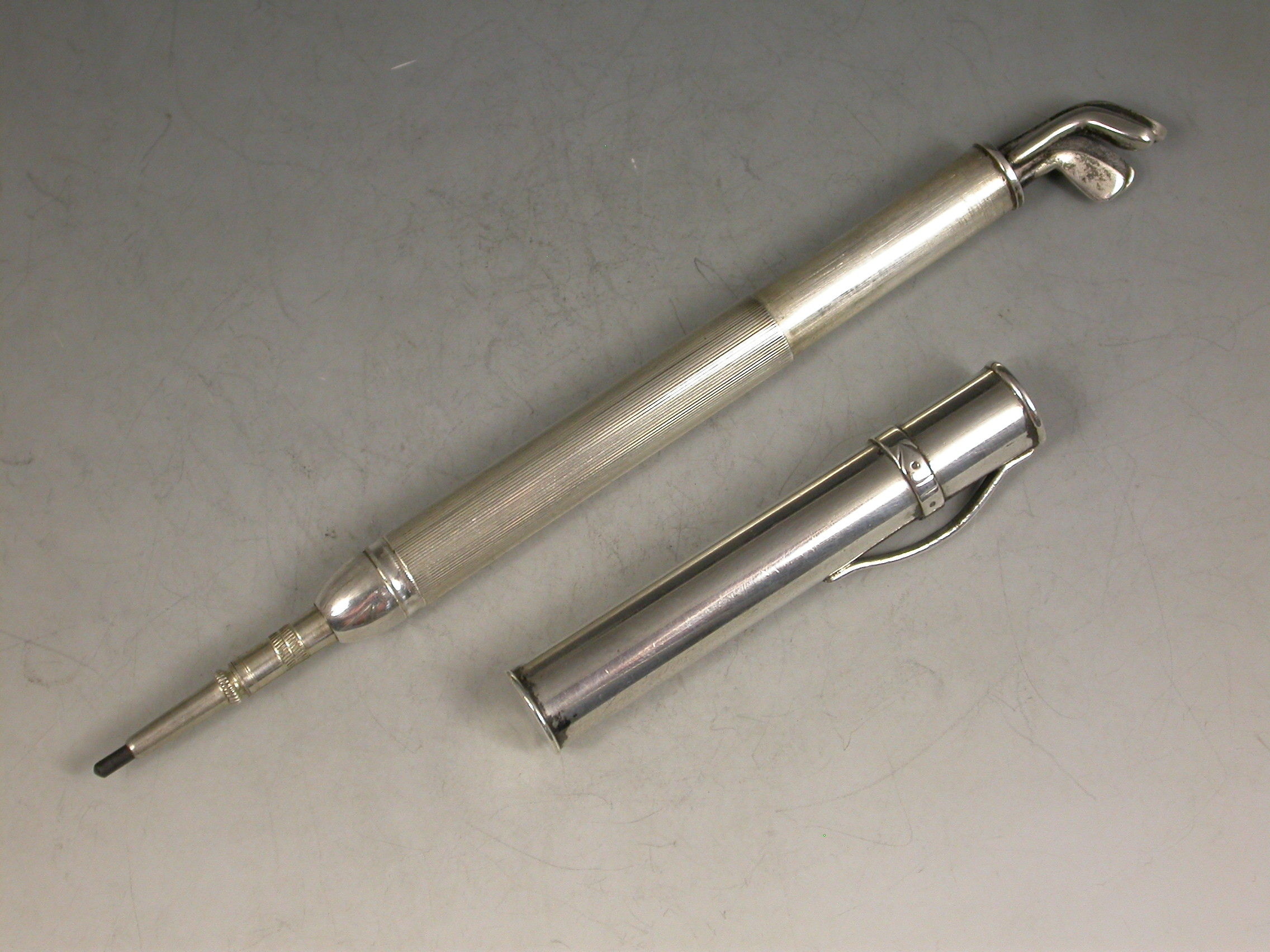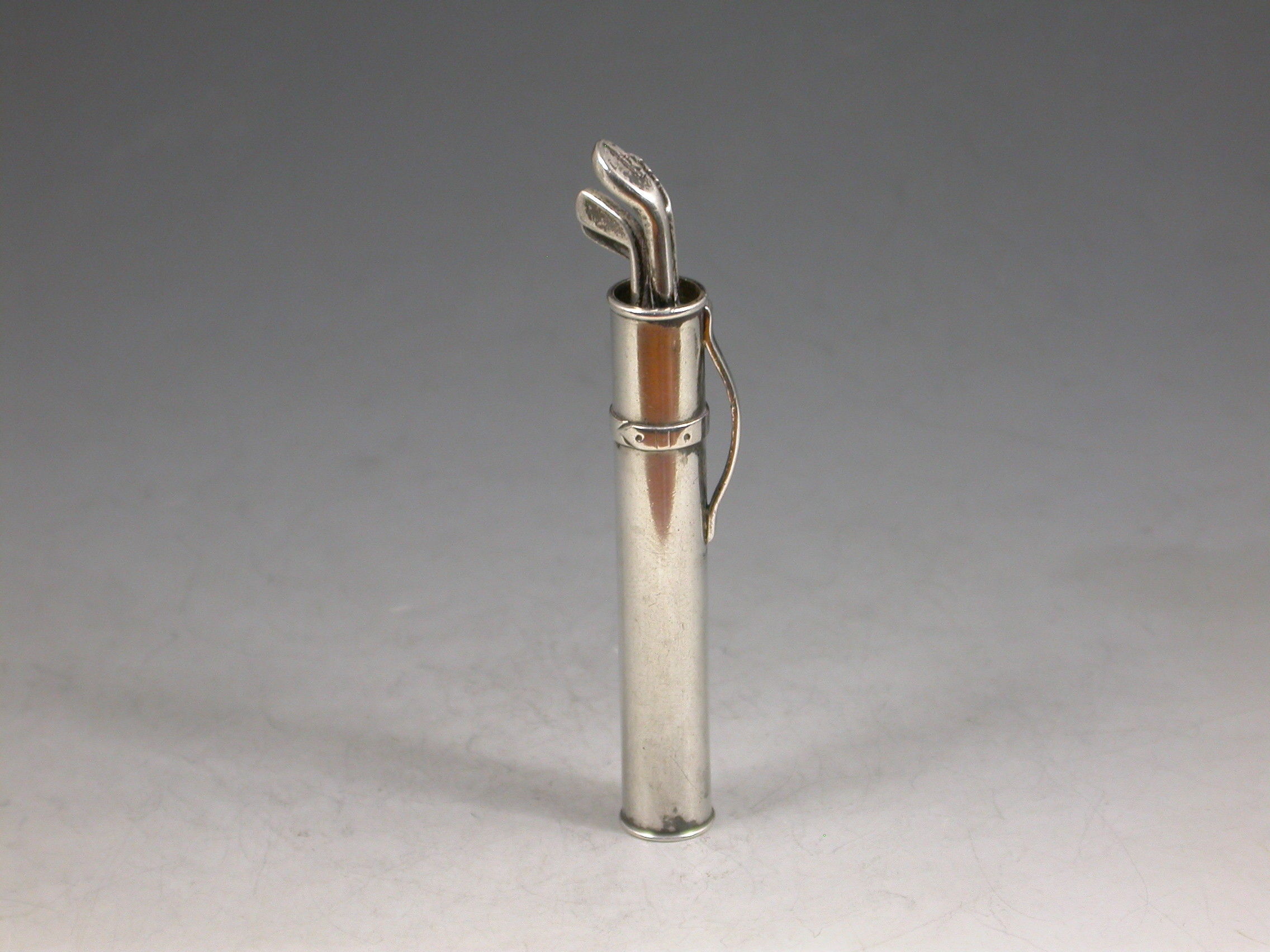 A good late Victorian novelty silver Propelling Pencil, the terminal formed as a set of Golf Clubs and the sheath as a Golf Bag. The telescopic Pencil with reeded barrel.