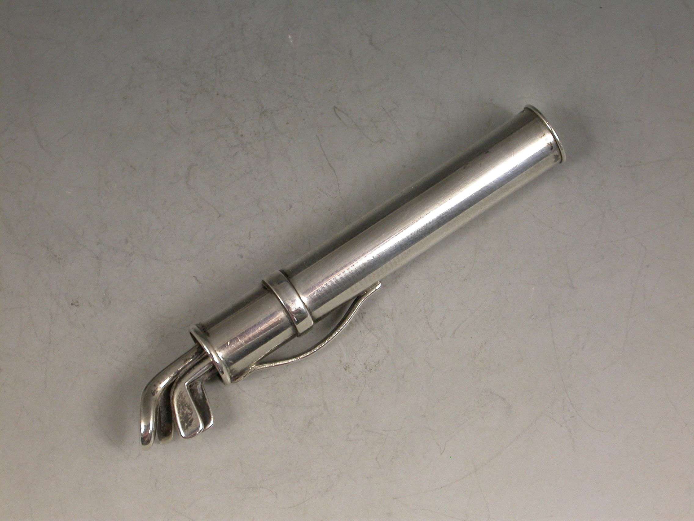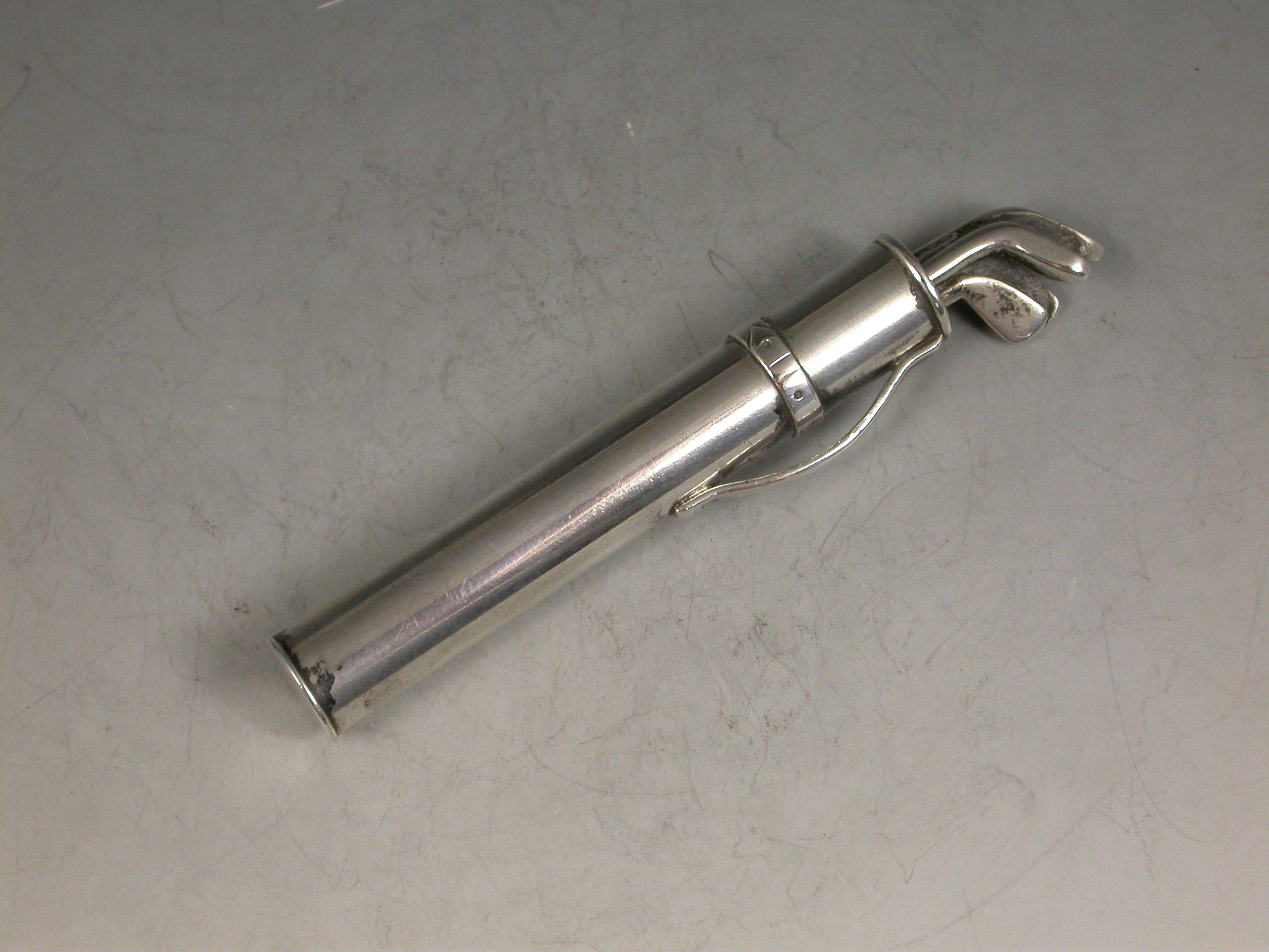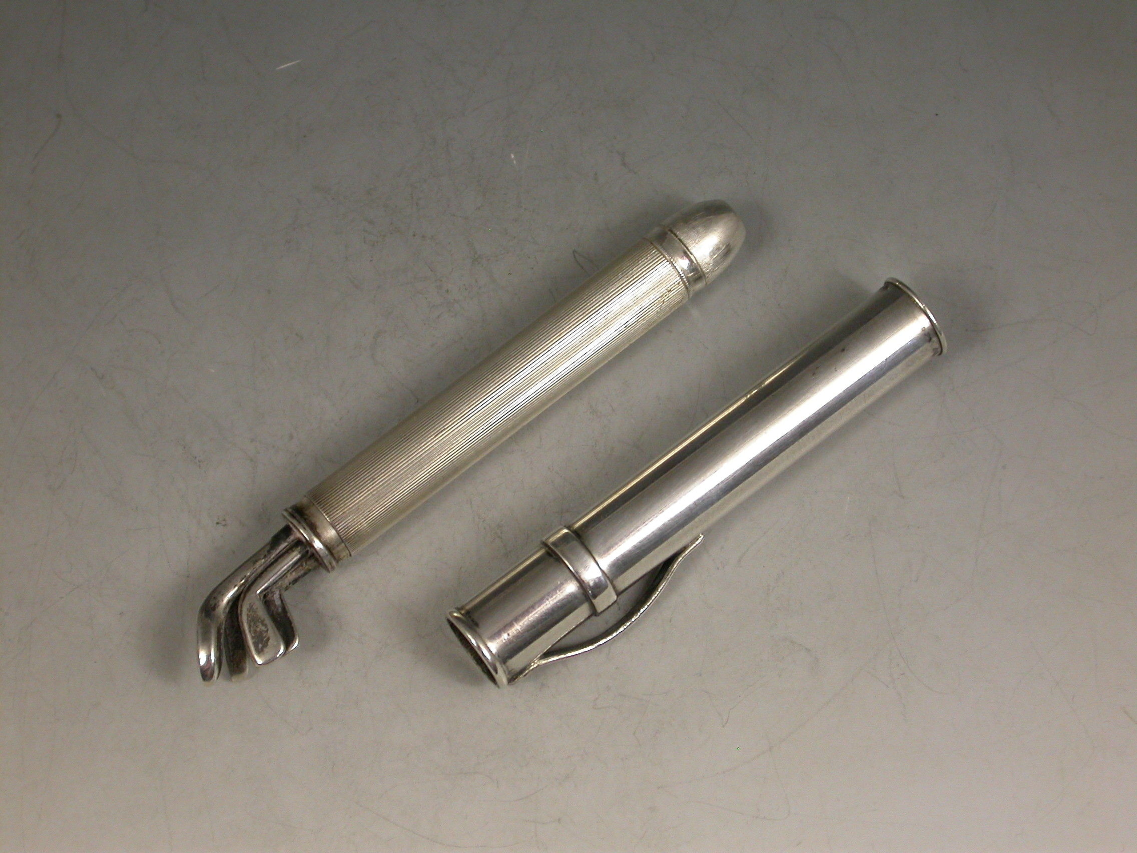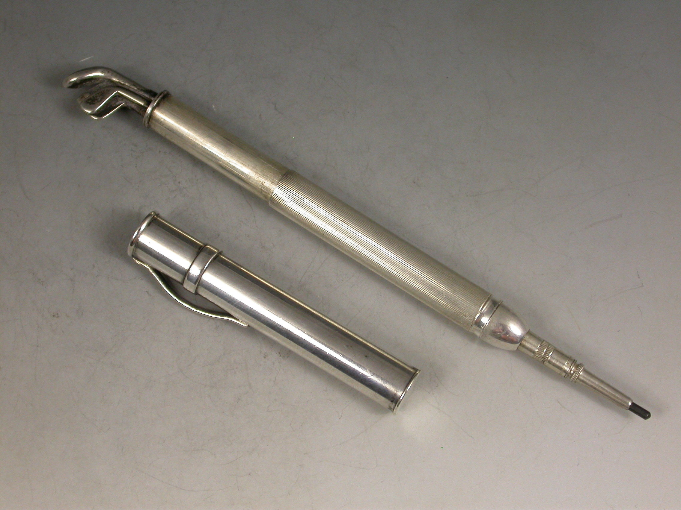 A good late Victorian novelty silver Propelling Pencil, the terminal formed as a set of Golf Clubs and the sheath as a Golf Bag. The telescopic Pencil with reeded barrel.