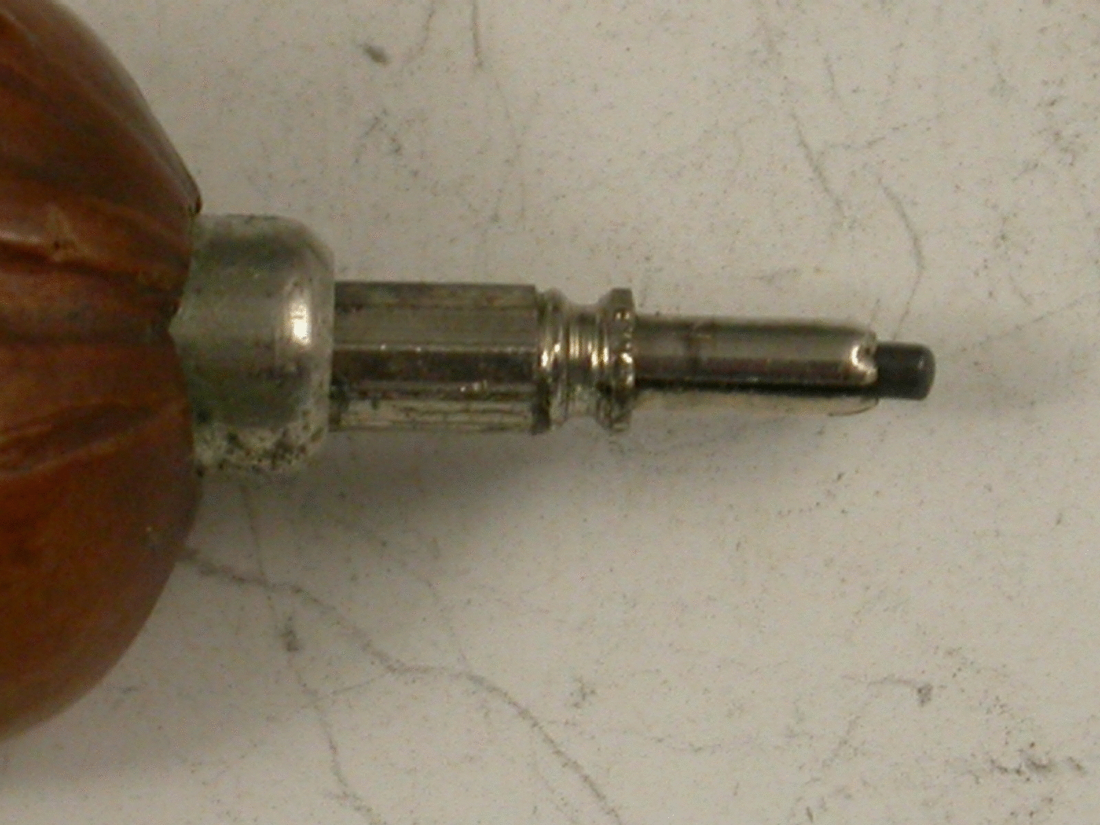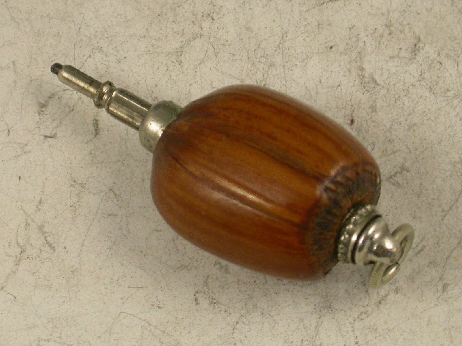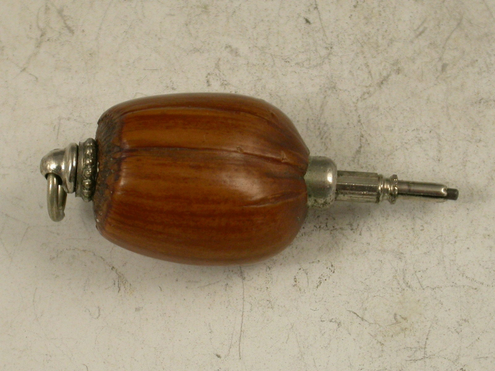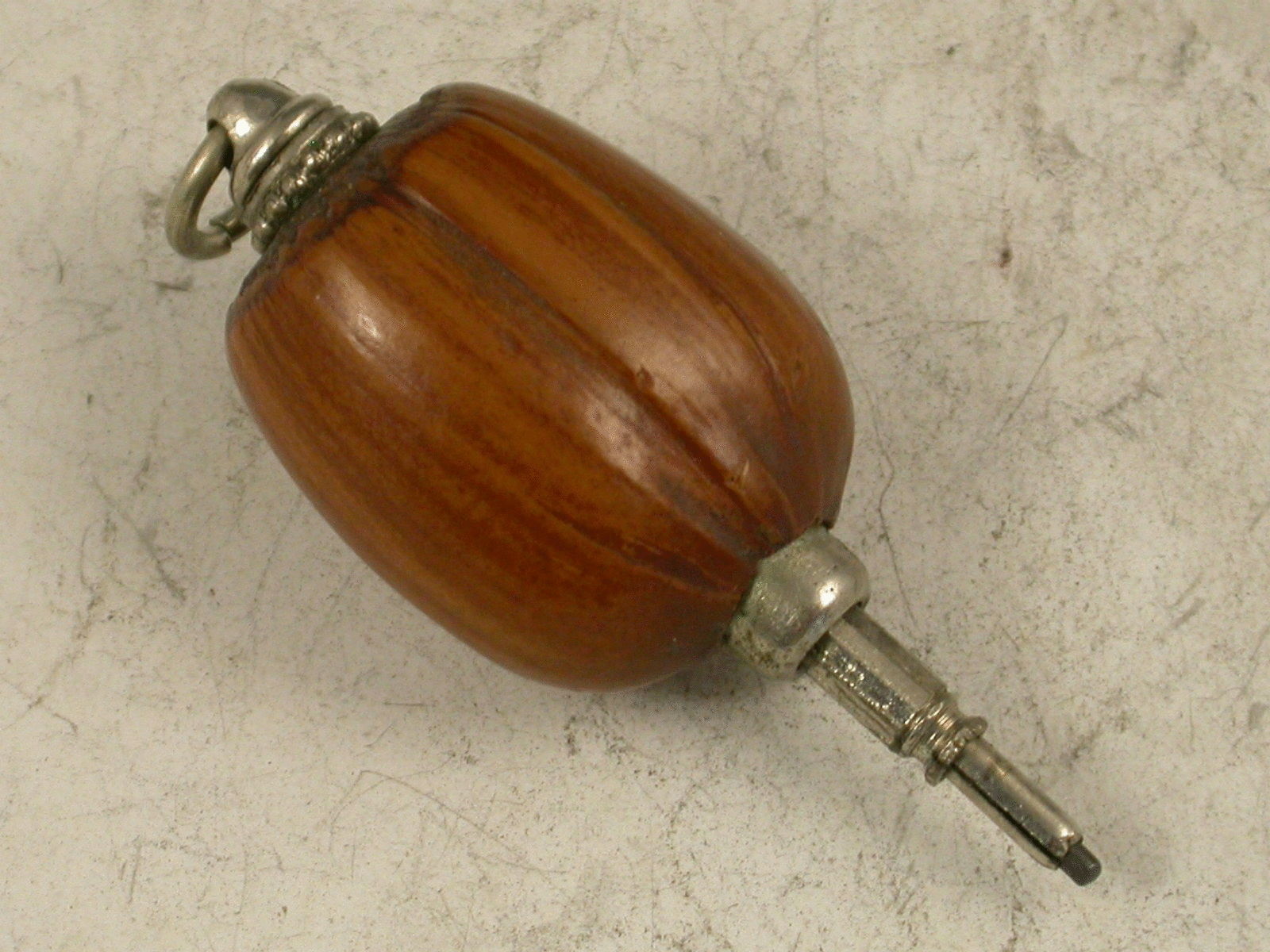 A Victorian novelty silver Propelling Pencil formed from a mounted Hazelnut, the pencil propelling when the nut is turned. attached suspension ring.