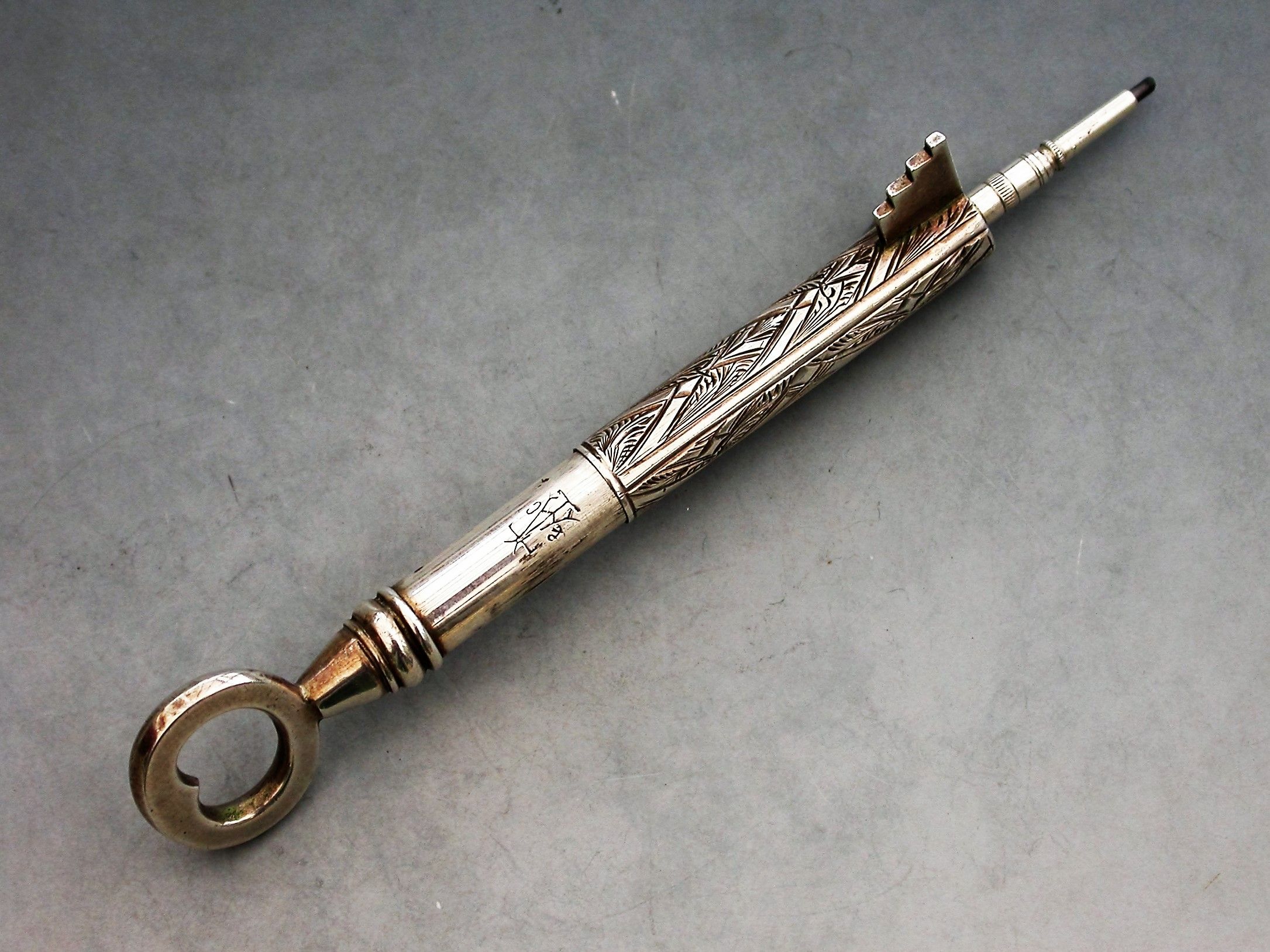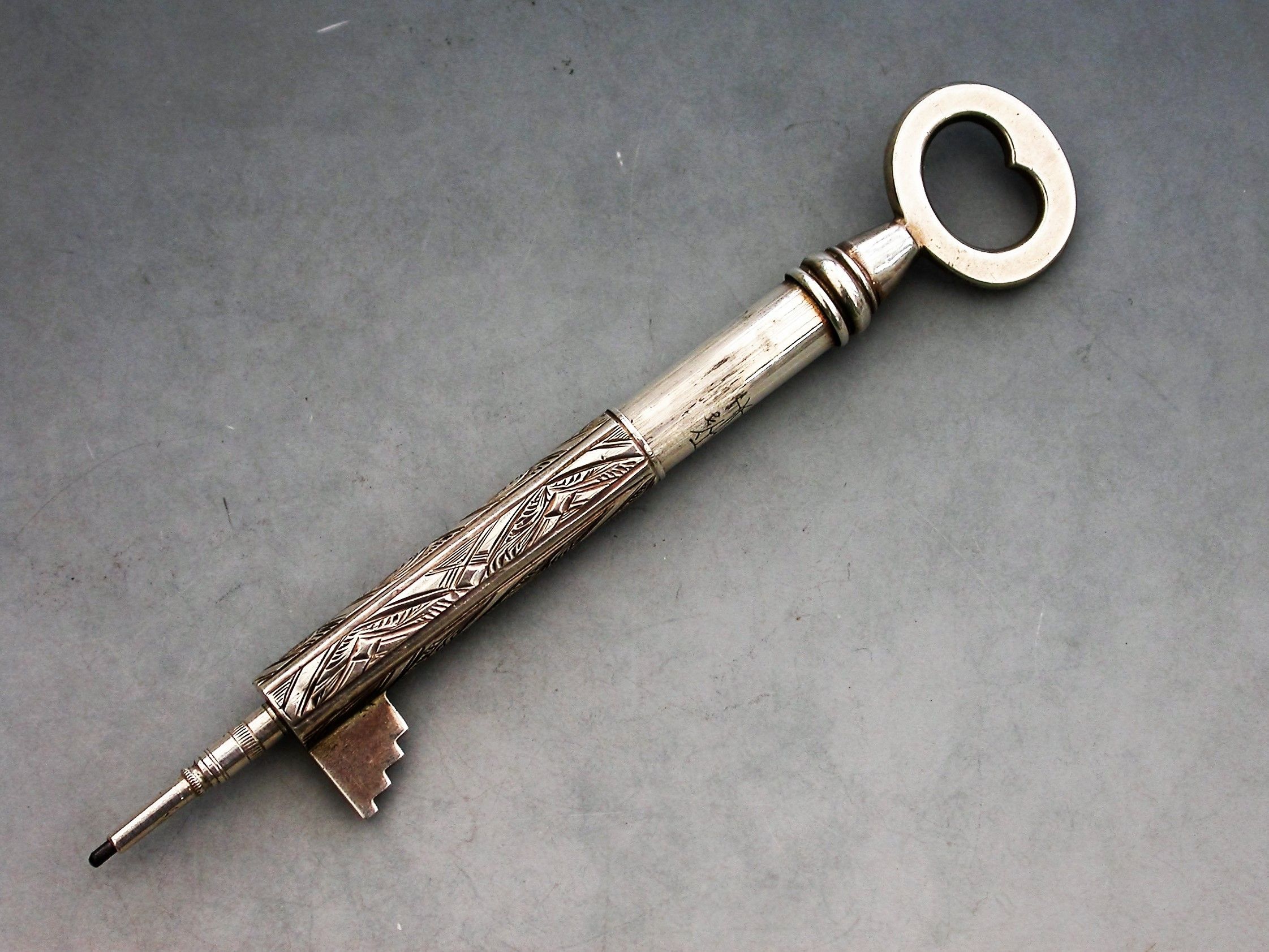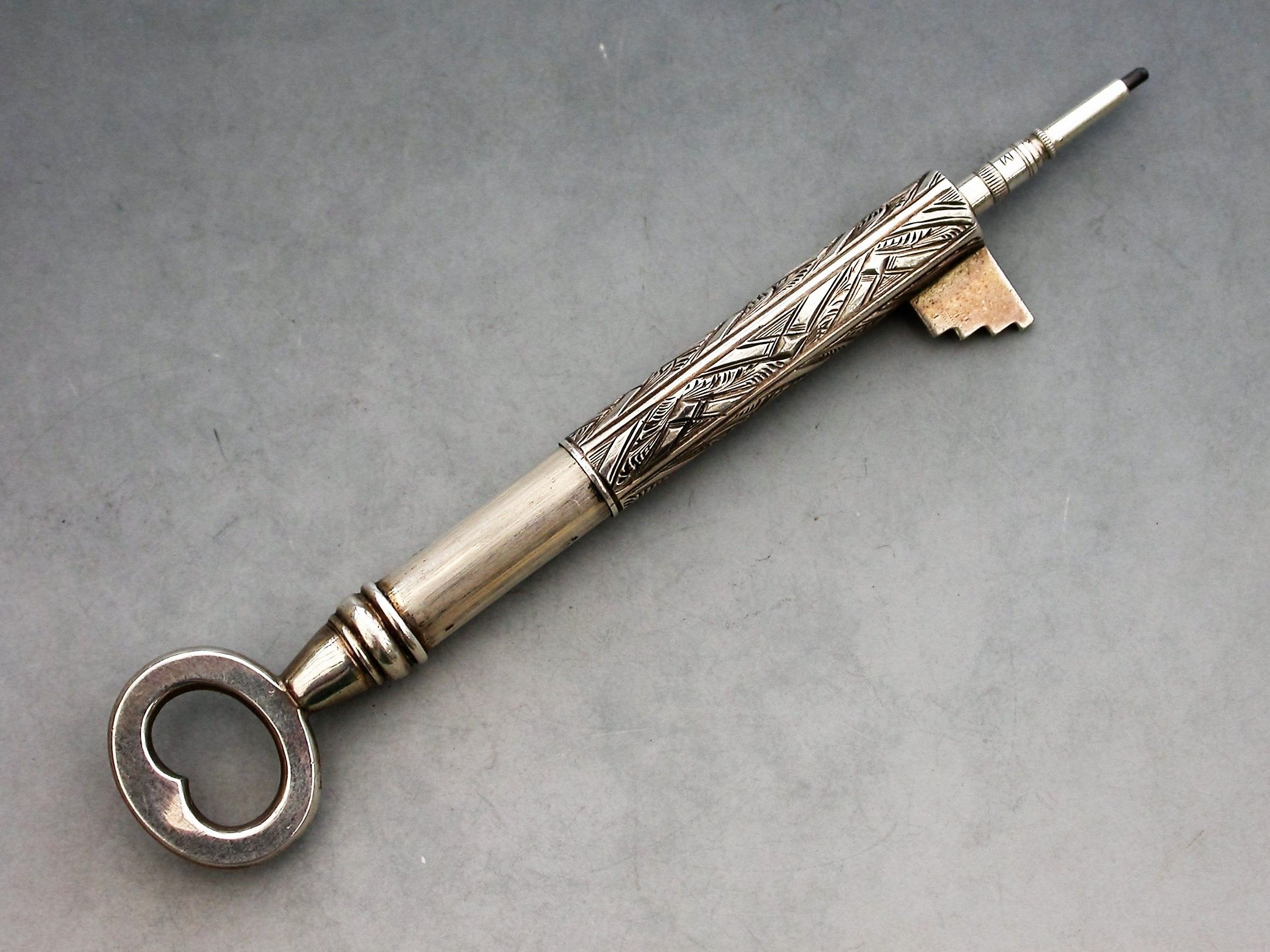 A rare Victorian novelty silver telescopic Propelling Pencil made in the form of a Key, with engraved decoration to the barrel.