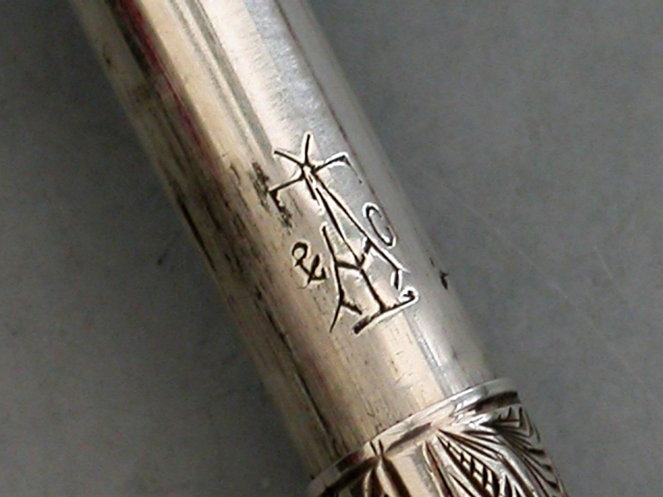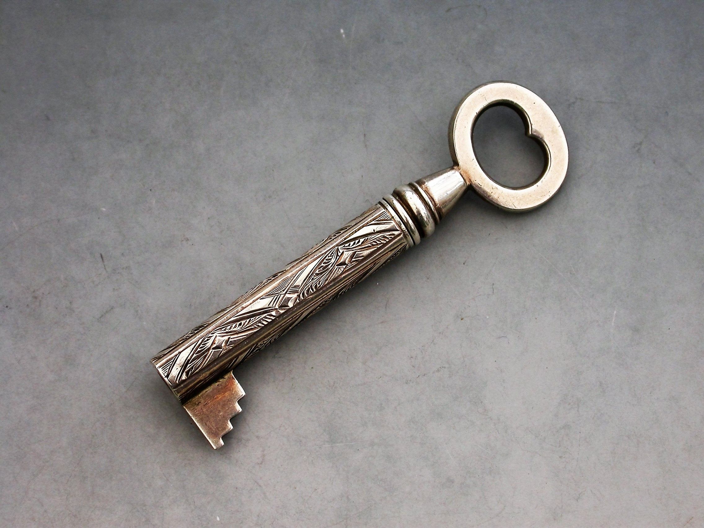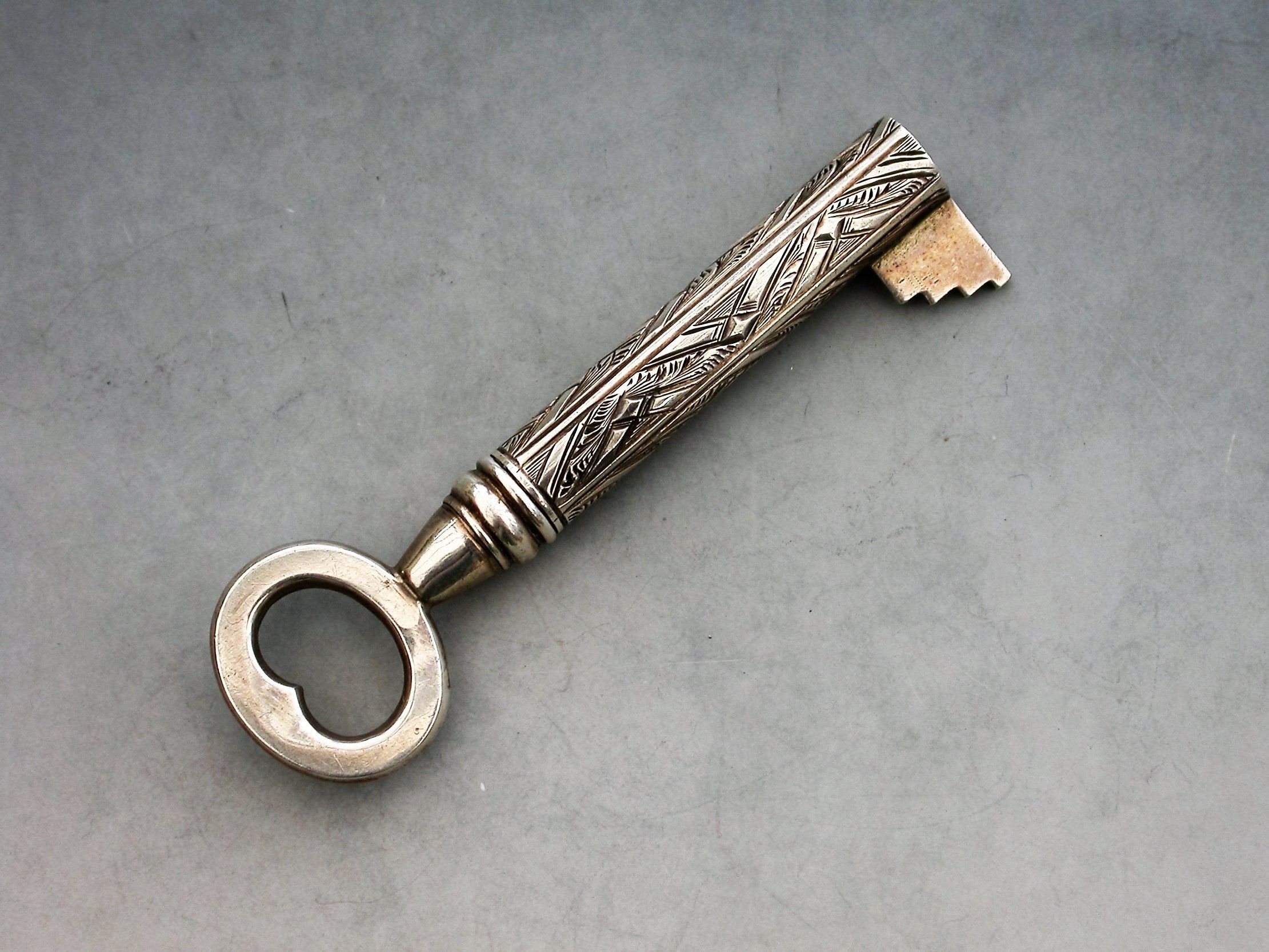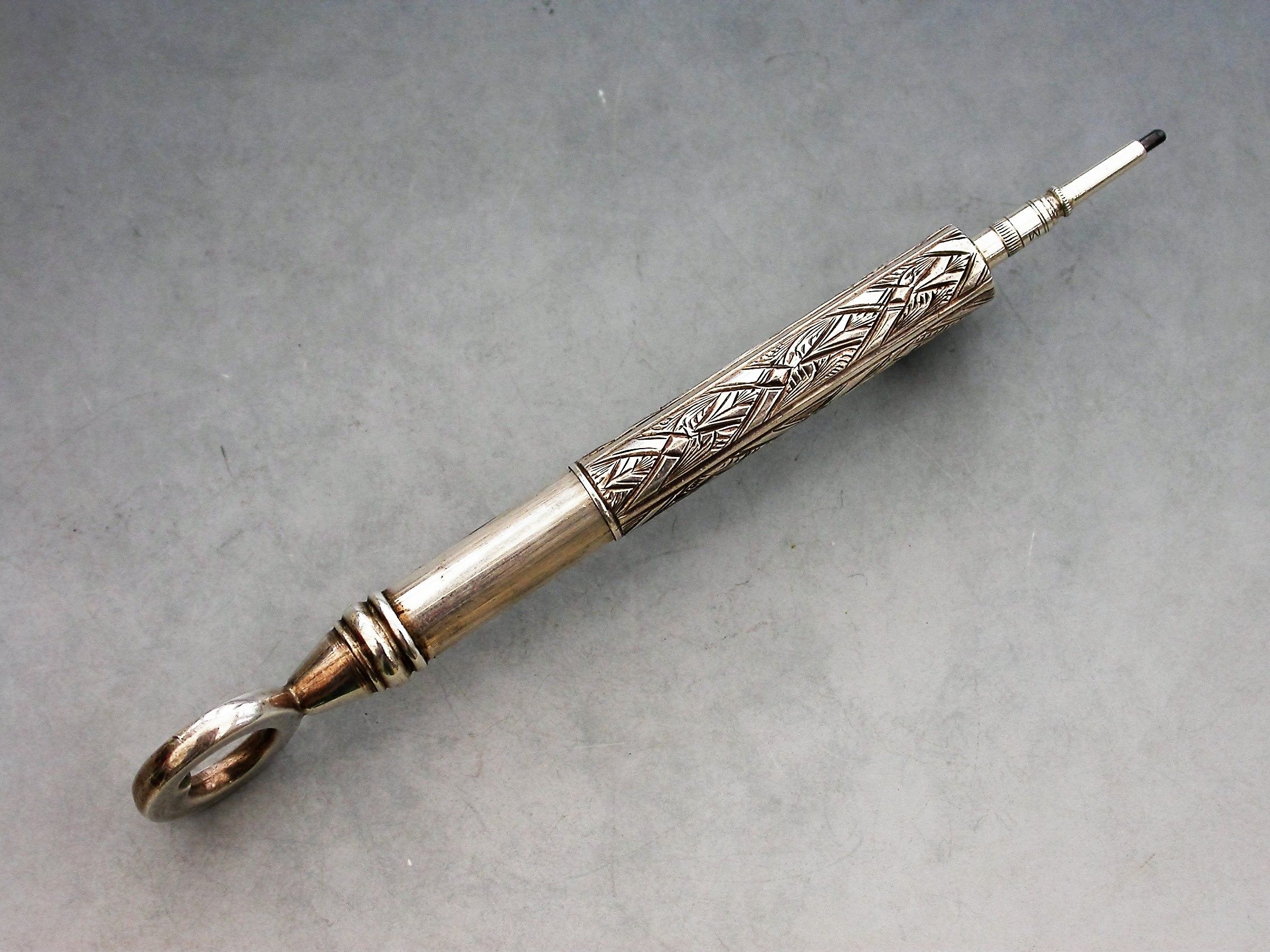 A rare Victorian novelty silver telescopic Propelling Pencil made in the form of a Key, with engraved decoration to the barrel.