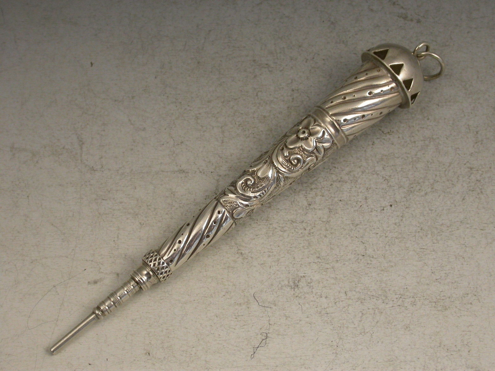 A Victorian novelty silver Propelling Pencil in the form of a stylised Lantern with embossed decoration. Twist action to propel.