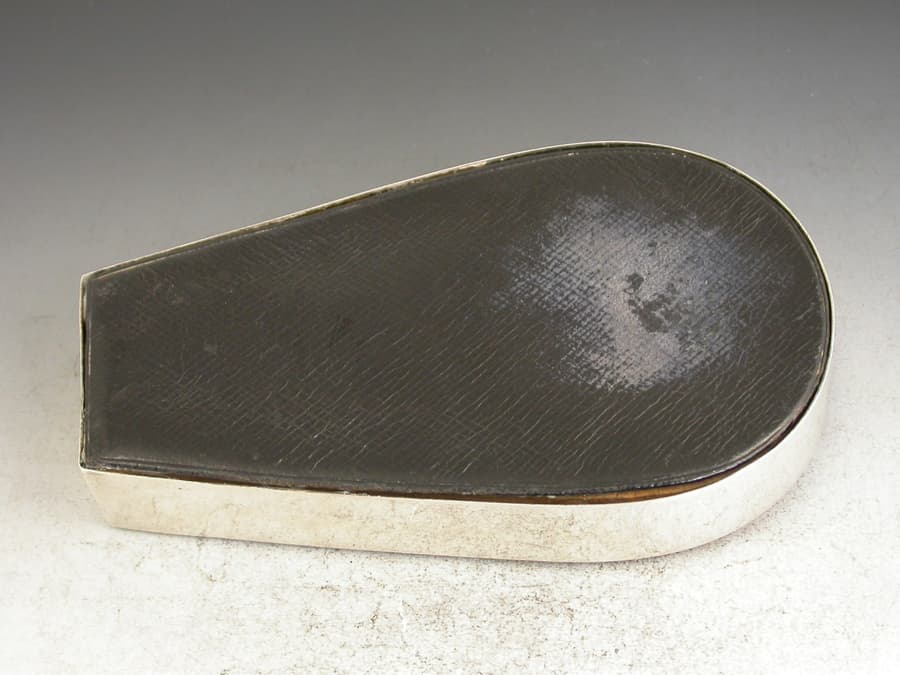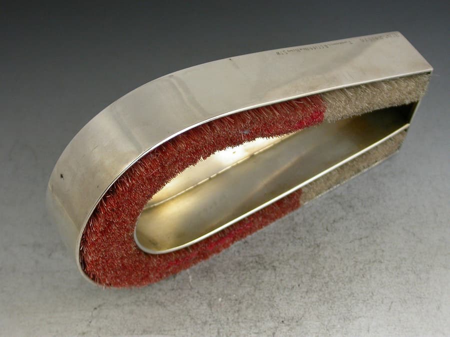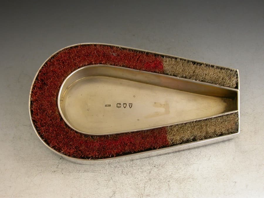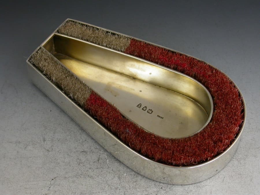 An extremely rare Victorian novelty silver Pen Wipe / Desk Tidy made in the form of a large horseshoe shaped magnet. The brushes of the pen wipe have been coloured to simulate a magnet, the central gilded area for storage, leather covered base.