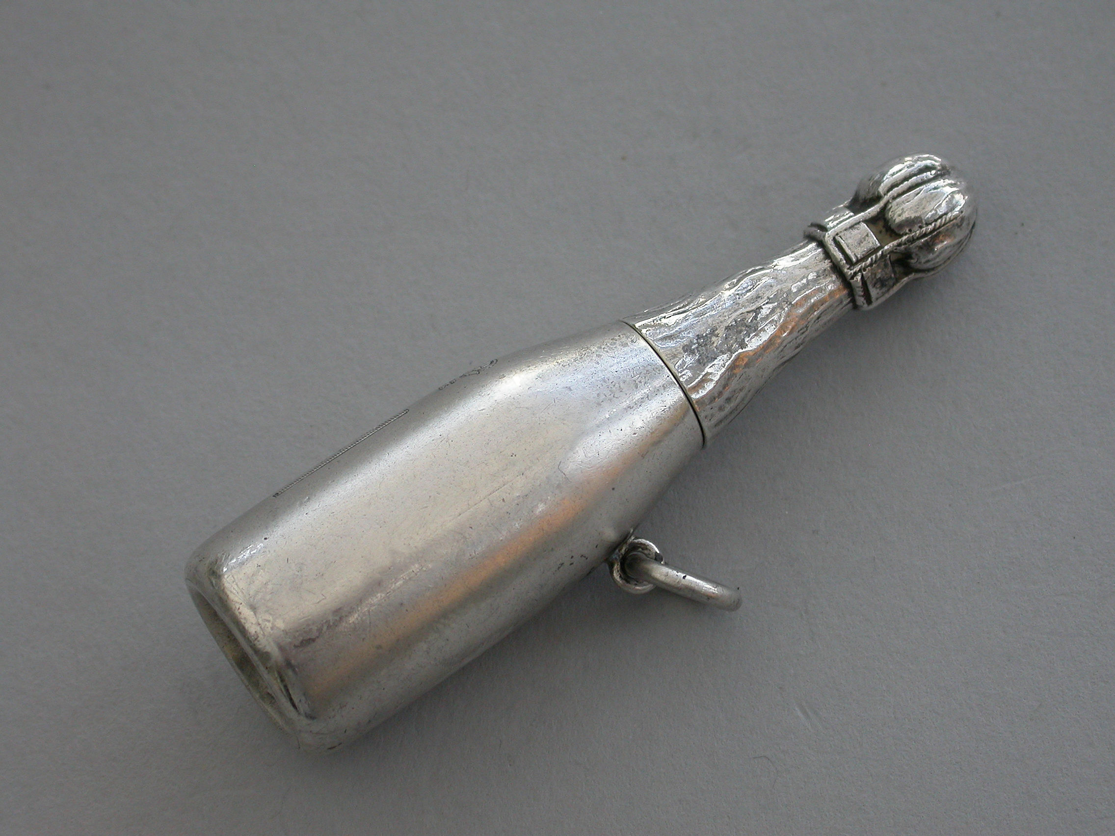 A rare Victorian novelty silver telescopic Propelling Pencil made in the form of a Champagne Bottle and of a larger than average size (probably to represent a Magnum bottle), with three drawer (rather than the more usual two drawer) telescopic action and attached suspension ring.