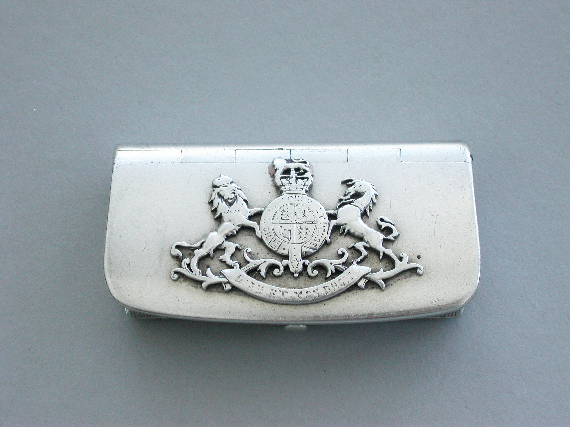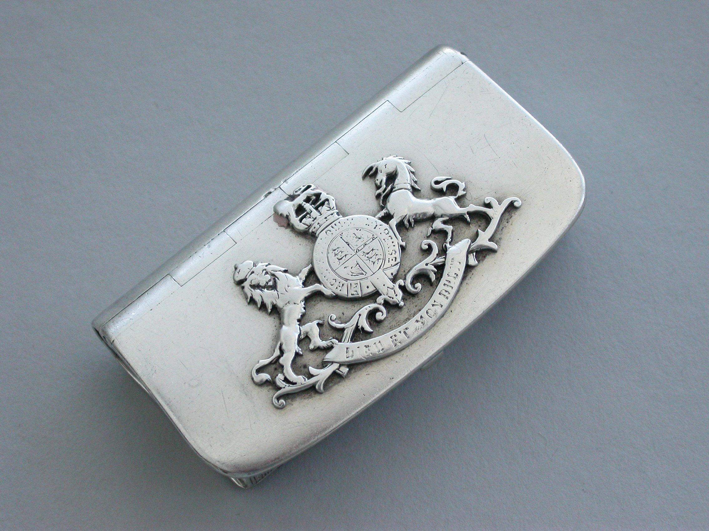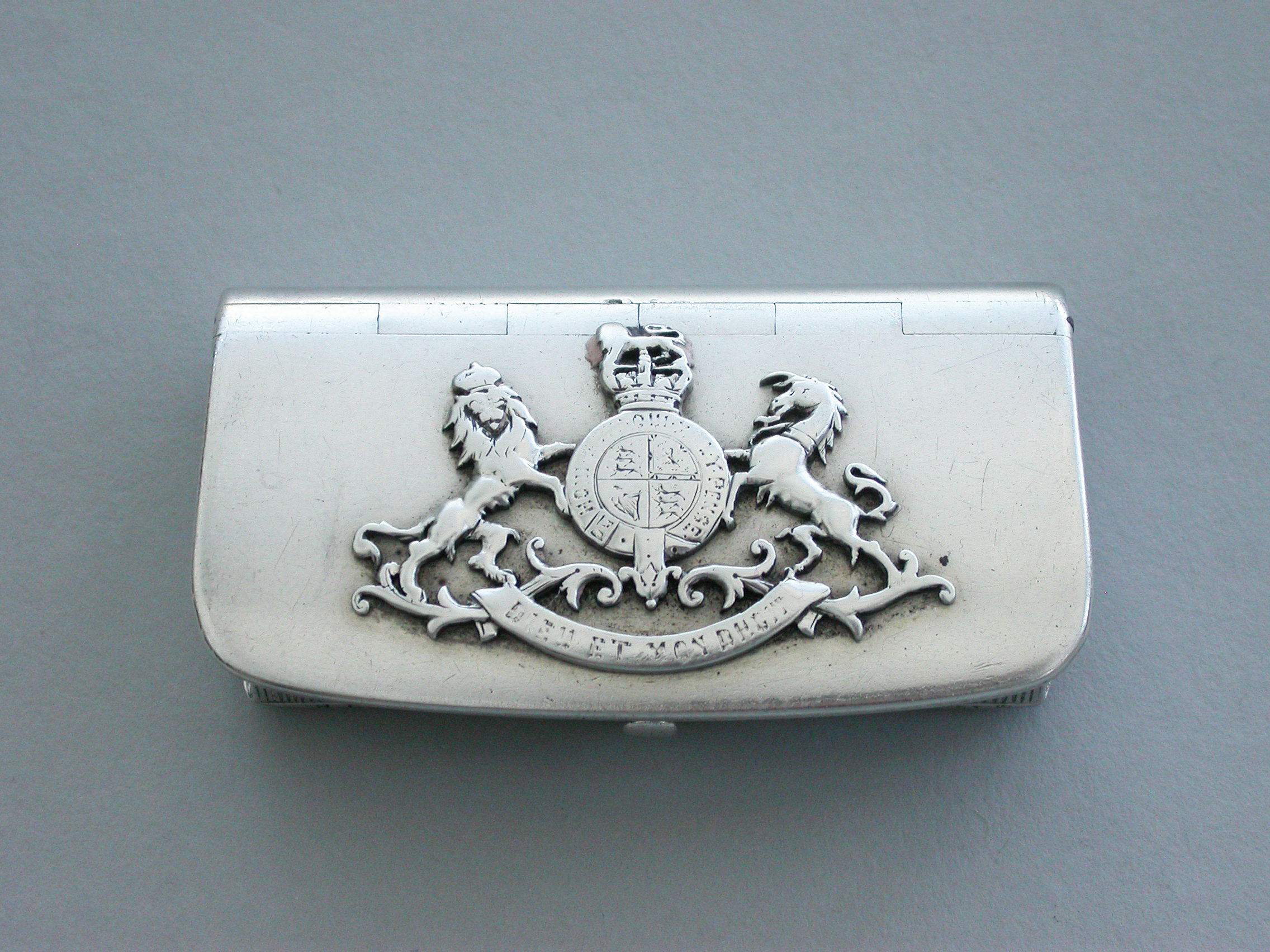 A rare Victorian novelty silver Vesta Case made in the form of a military leather cross-belt pouch with applied Royal coat of arms.