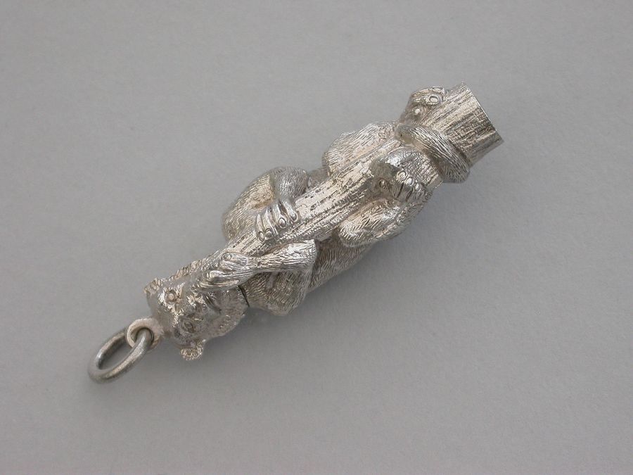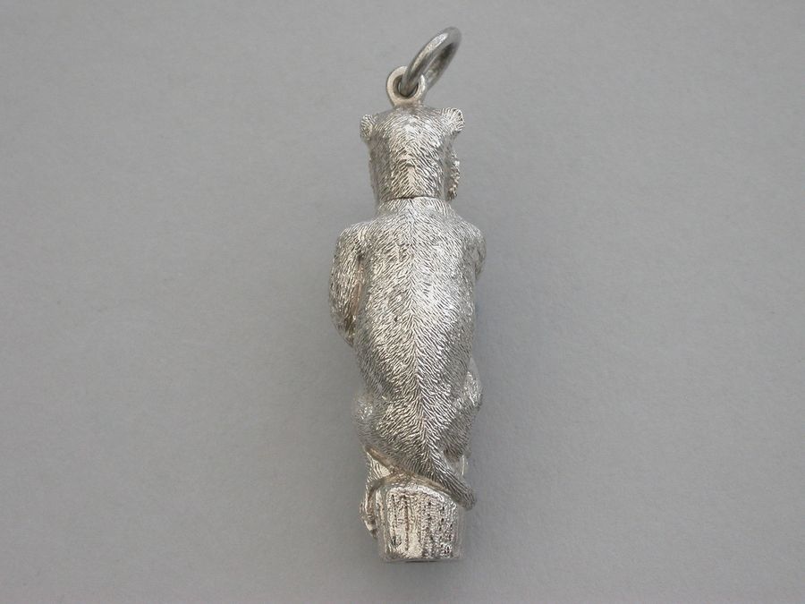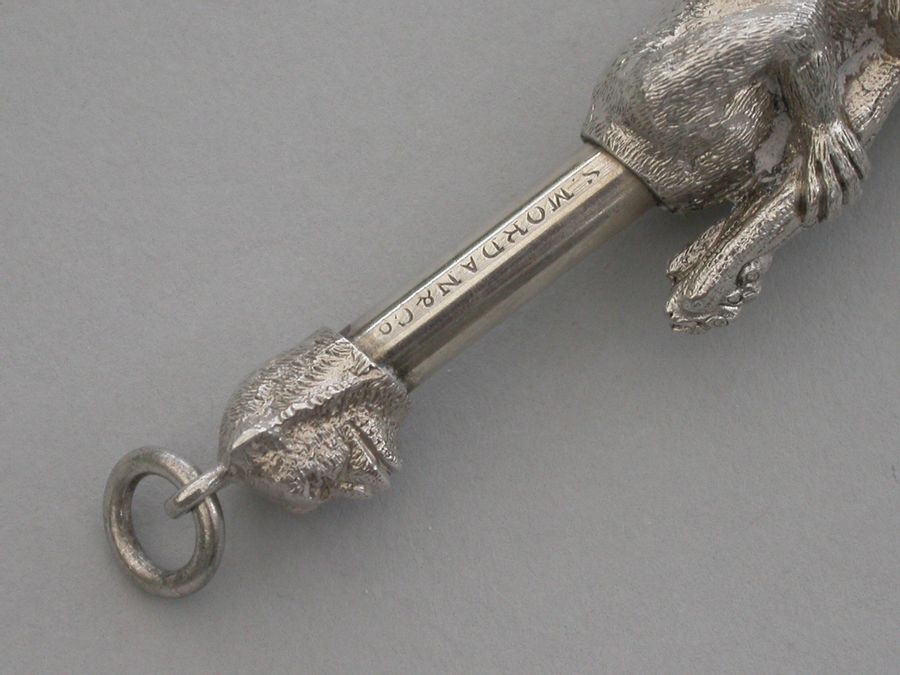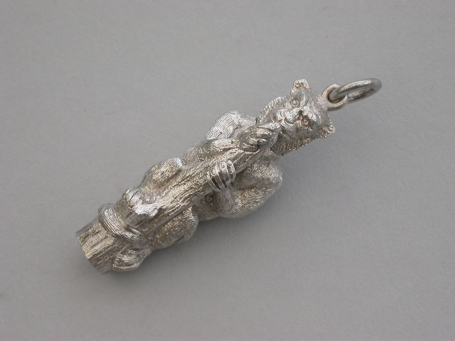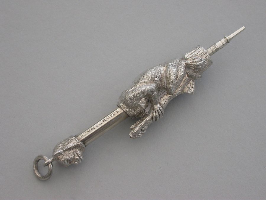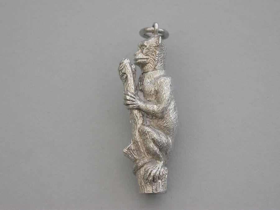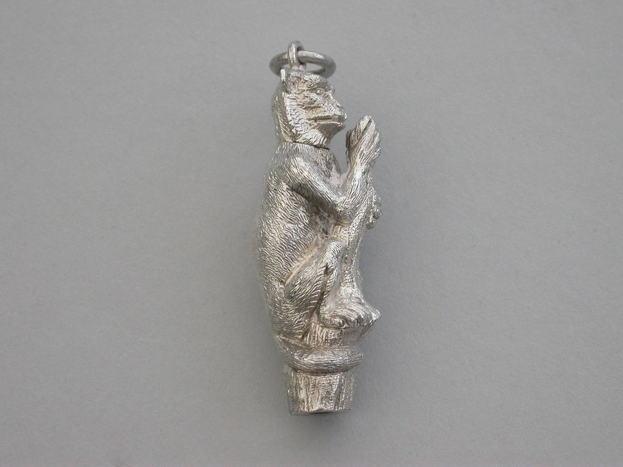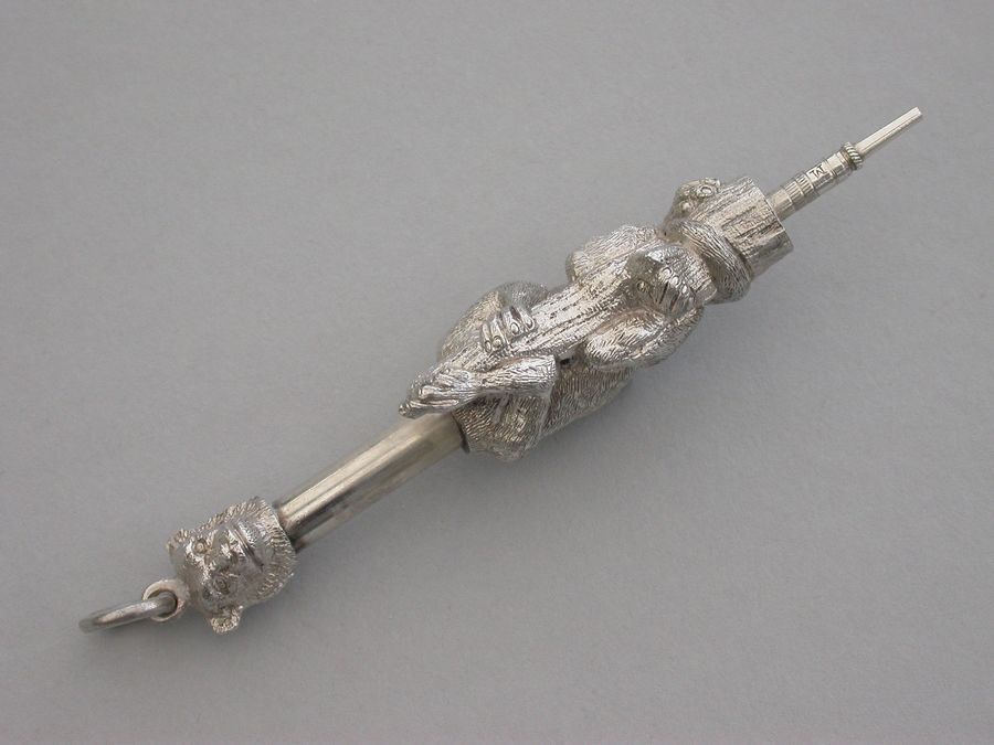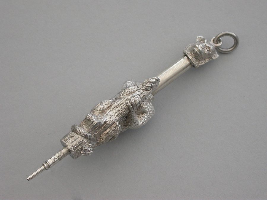 An extremely rare Victorian novelty silver telescopic Propelling Pencil made in the form of a Monkey holding a wooden staff, with attached suspension ring.