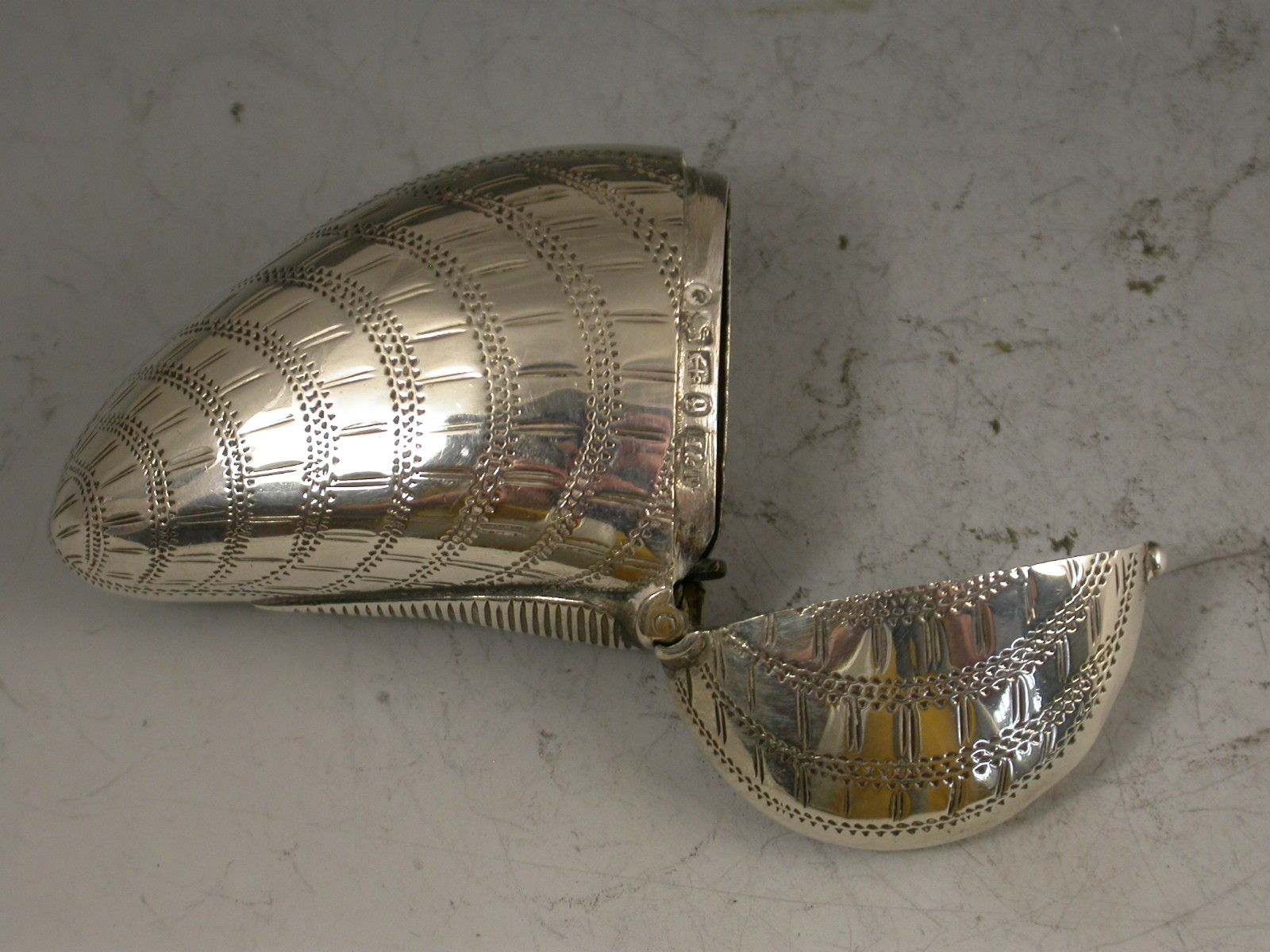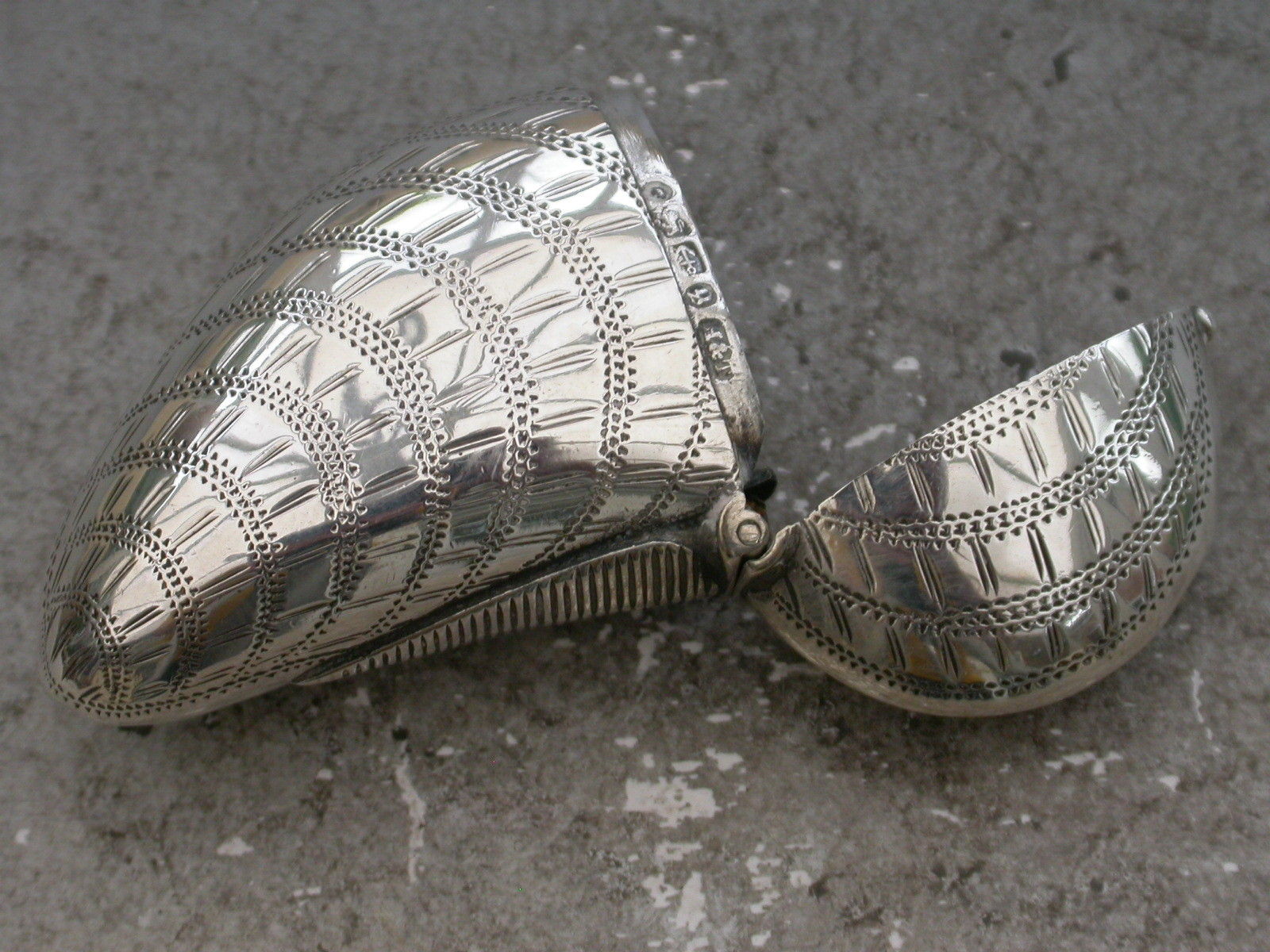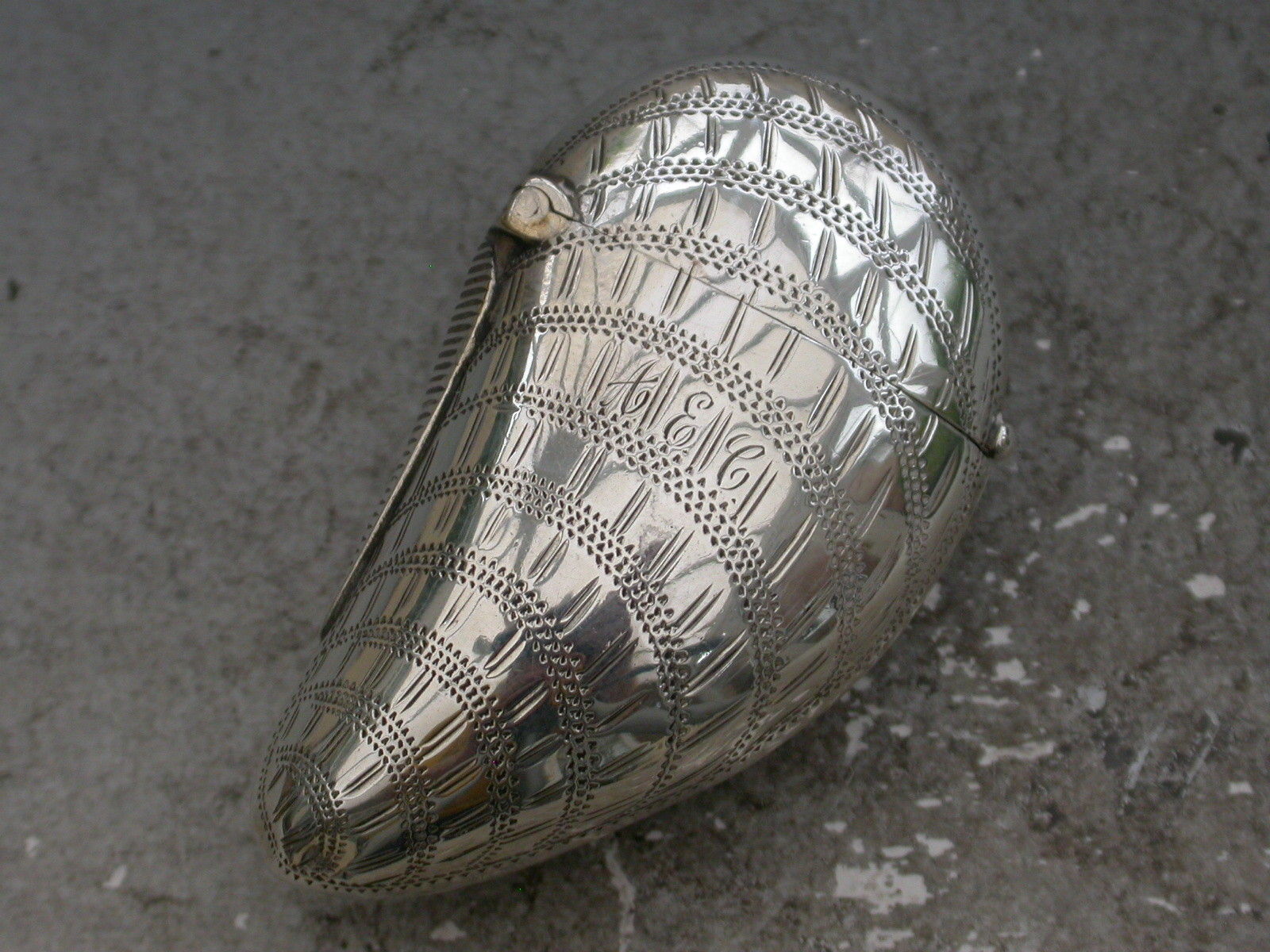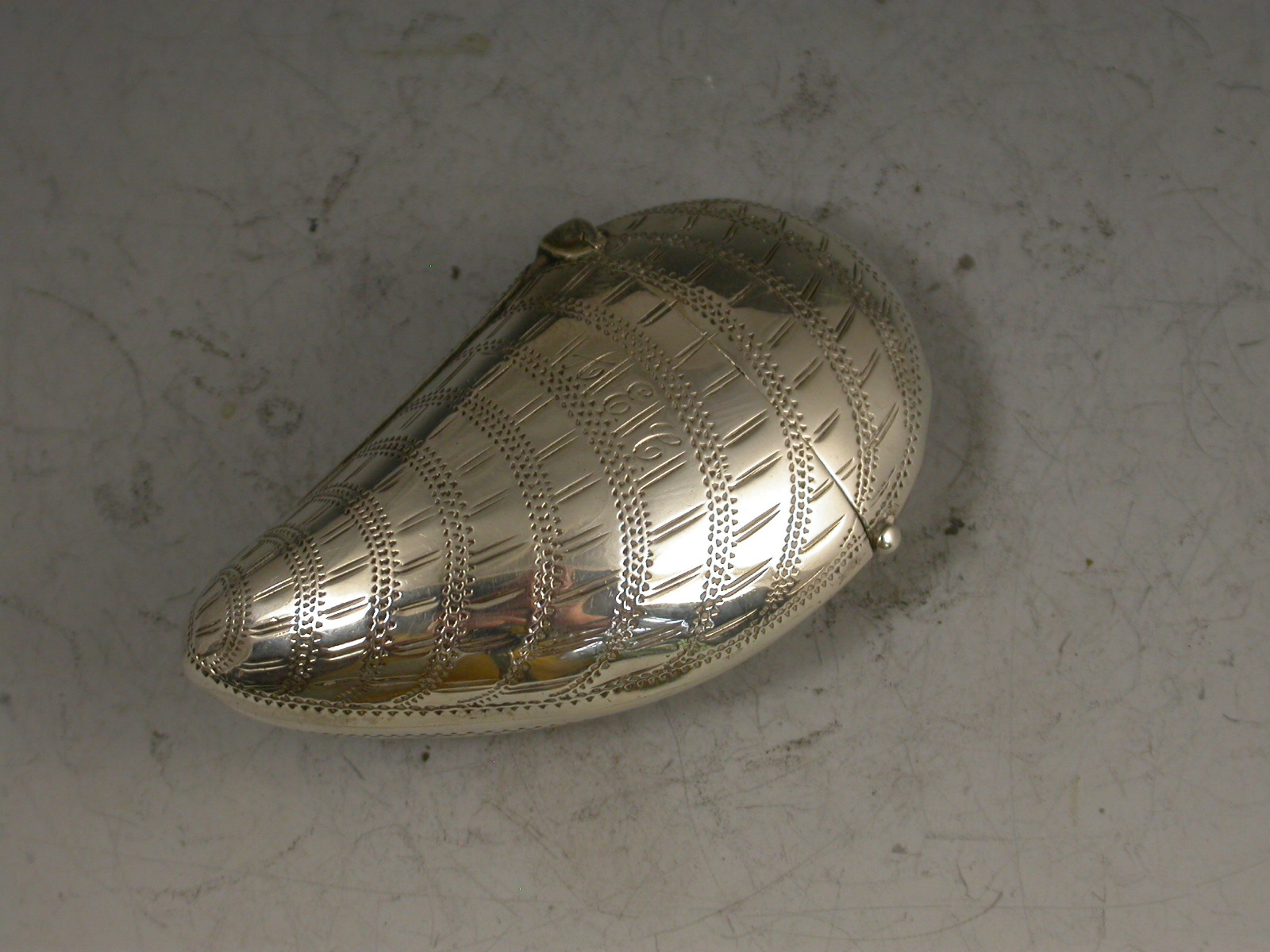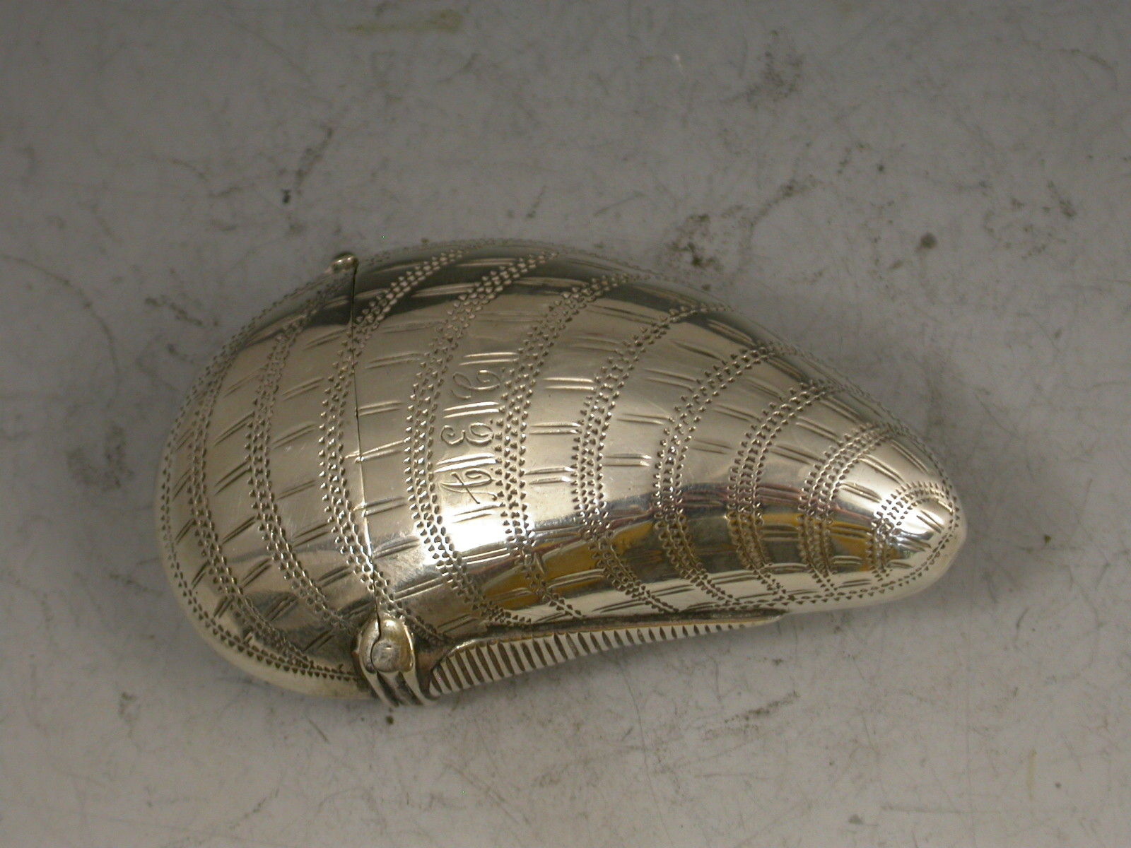 A rare Victorian novelty silver Vesta Case made in the form of a Mussel Shell with hinged flip-top lid and prick-dot engraved decoration to simulate a real shell. Engraved with contemporary initials 'AEC'.
