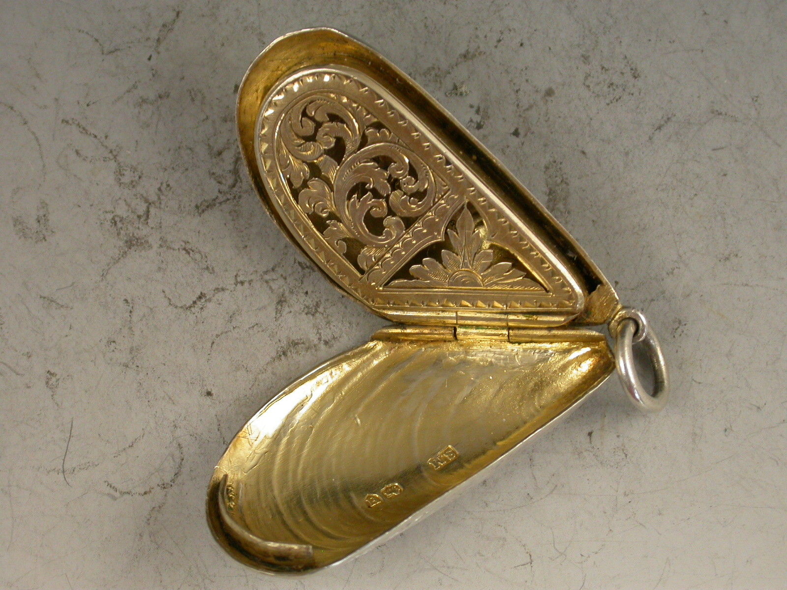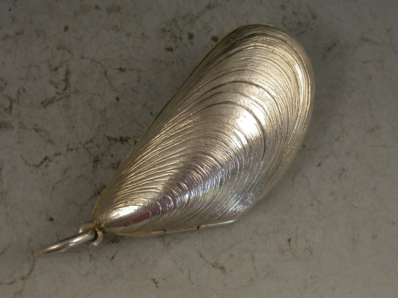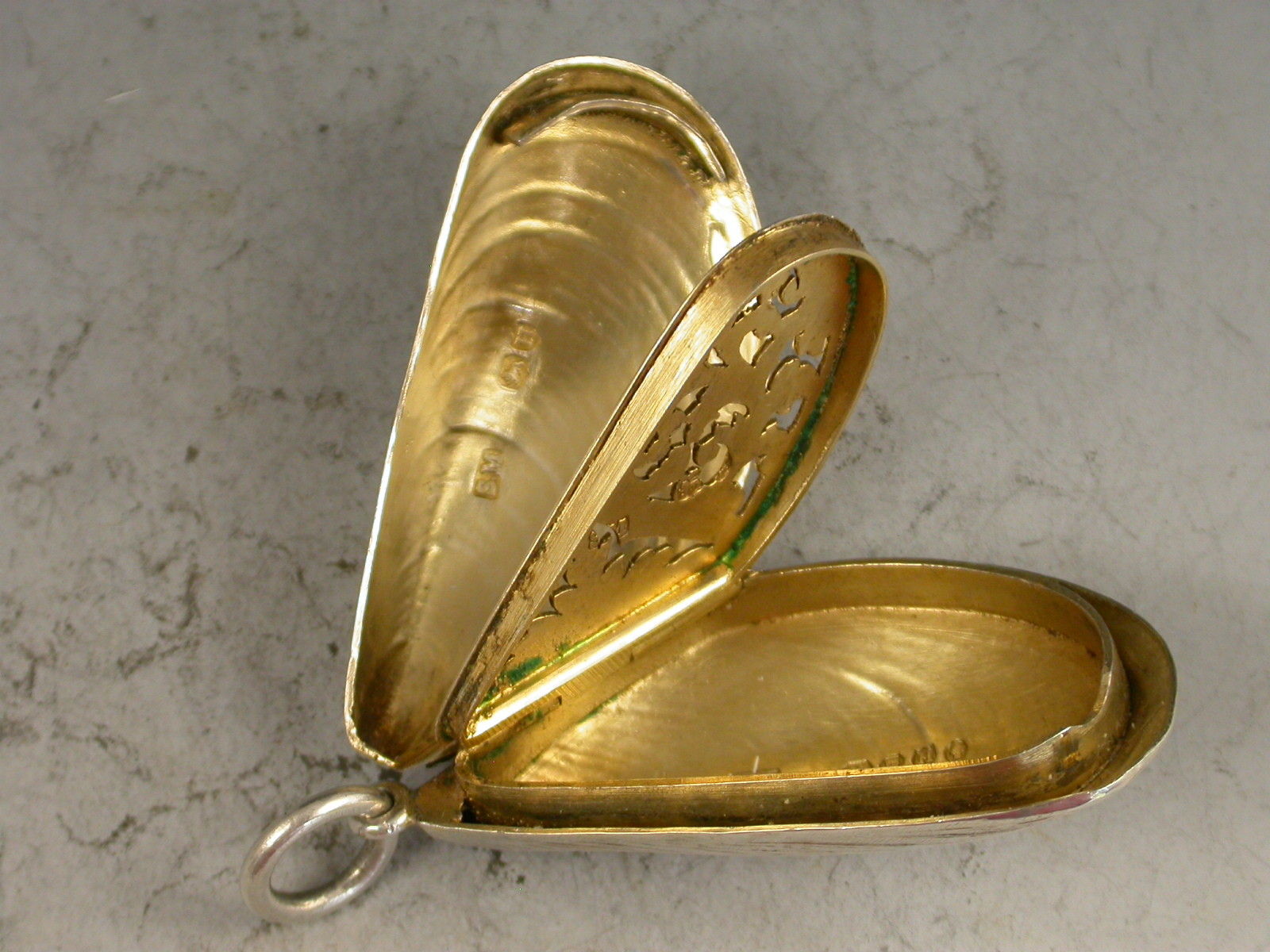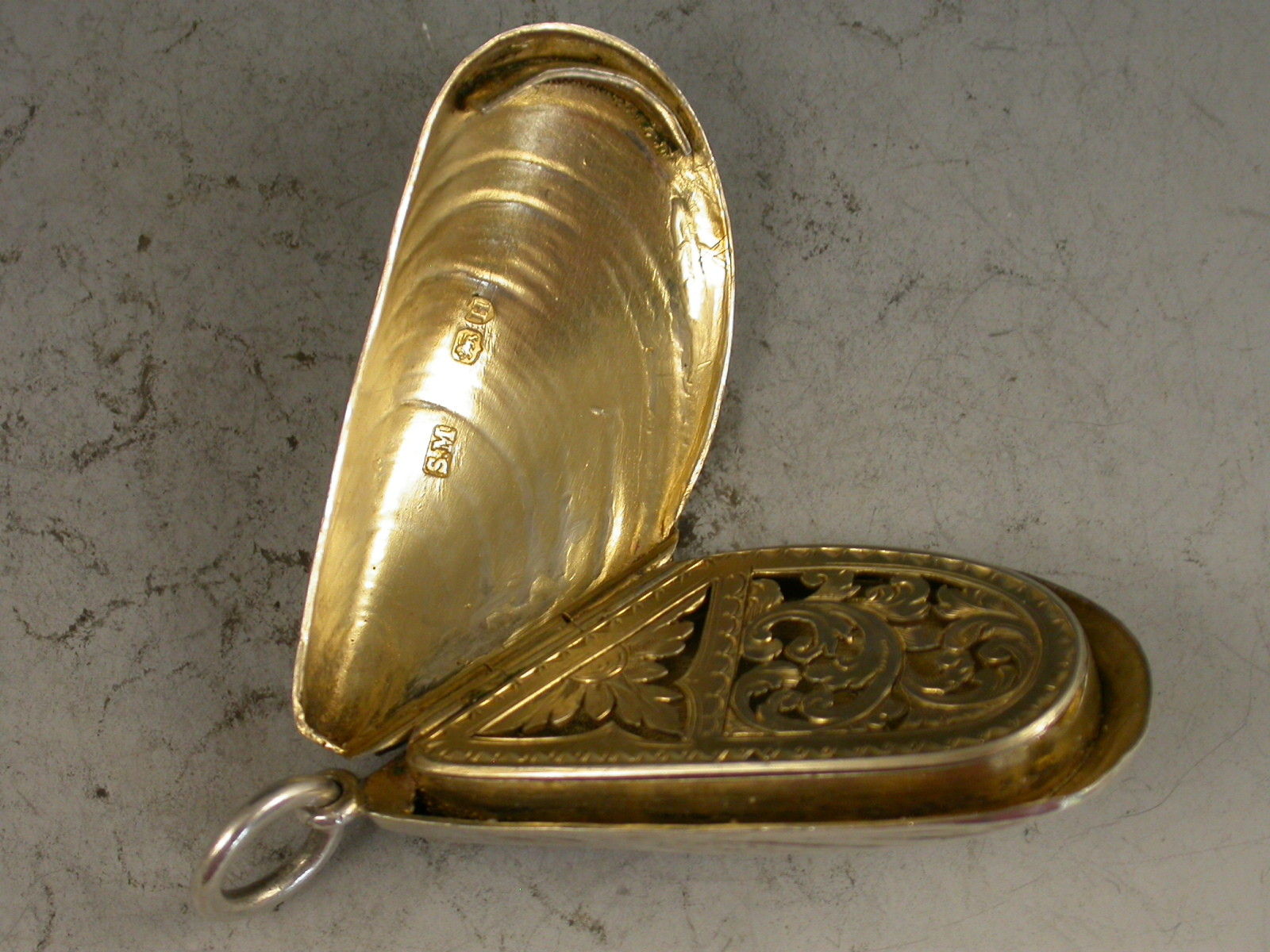 An extremely fine and rare fully hallmarked novelty silver Vinaigrette formed as a mussel shell, with a natralistically engraved exterior, the silver gilt interior with elaborately pierced grille. Attached suspension ring.