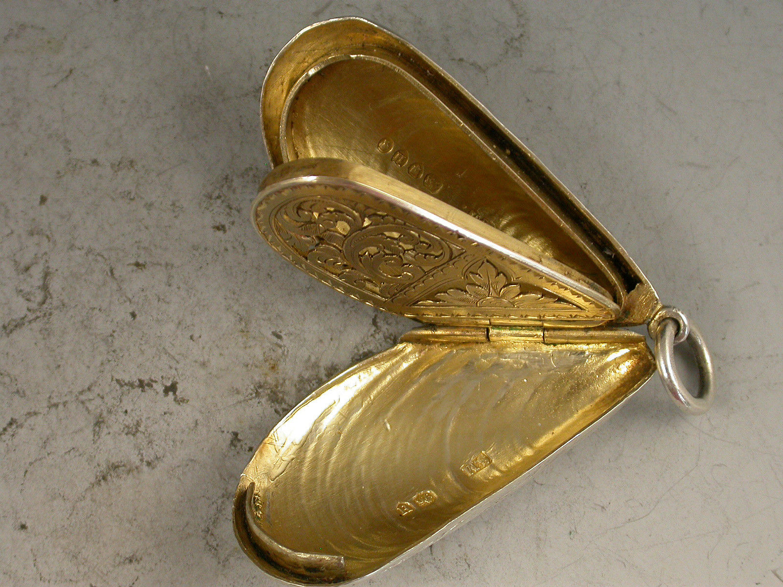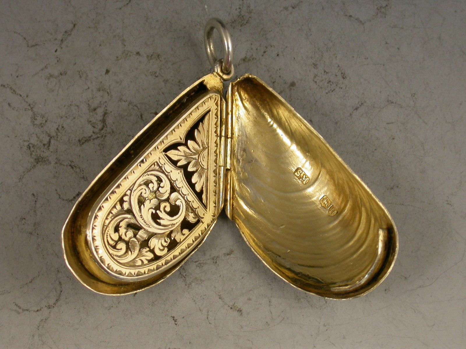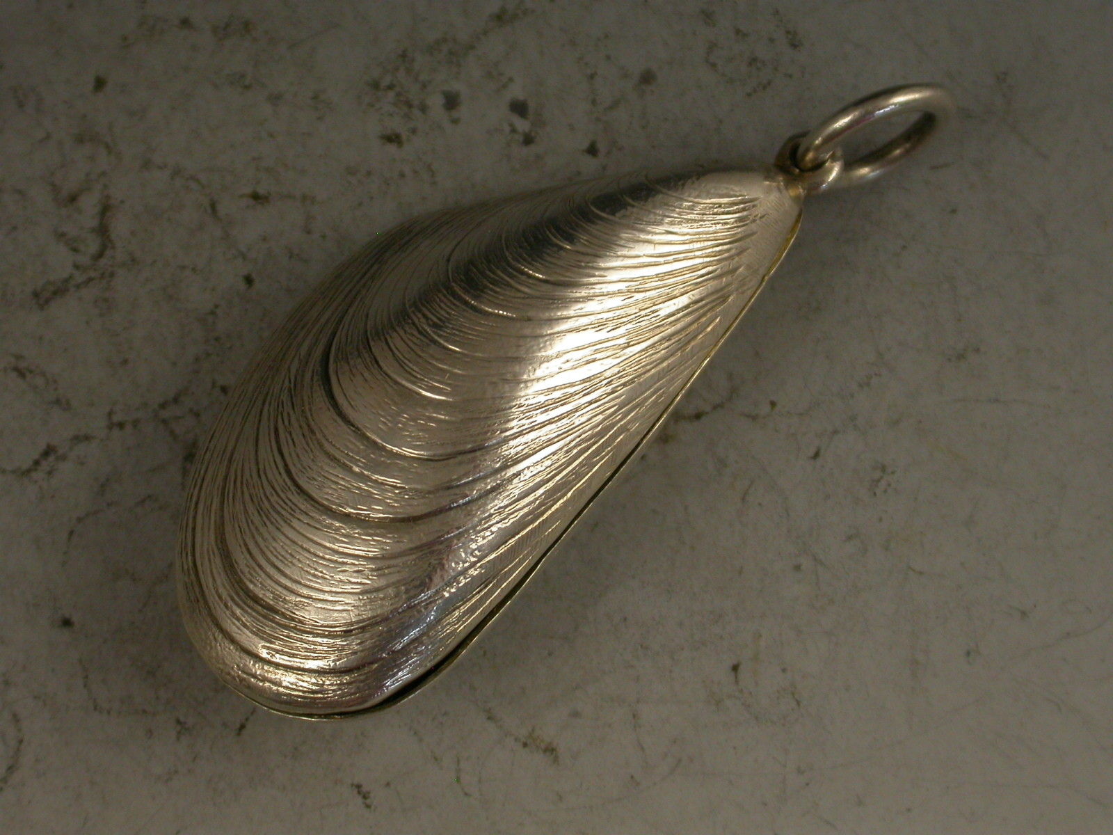 An extremely fine and rare fully hallmarked novelty silver Vinaigrette formed as a mussel shell, with a natralistically engraved exterior, the silver gilt interior with elaborately pierced grille. Attached suspension ring.