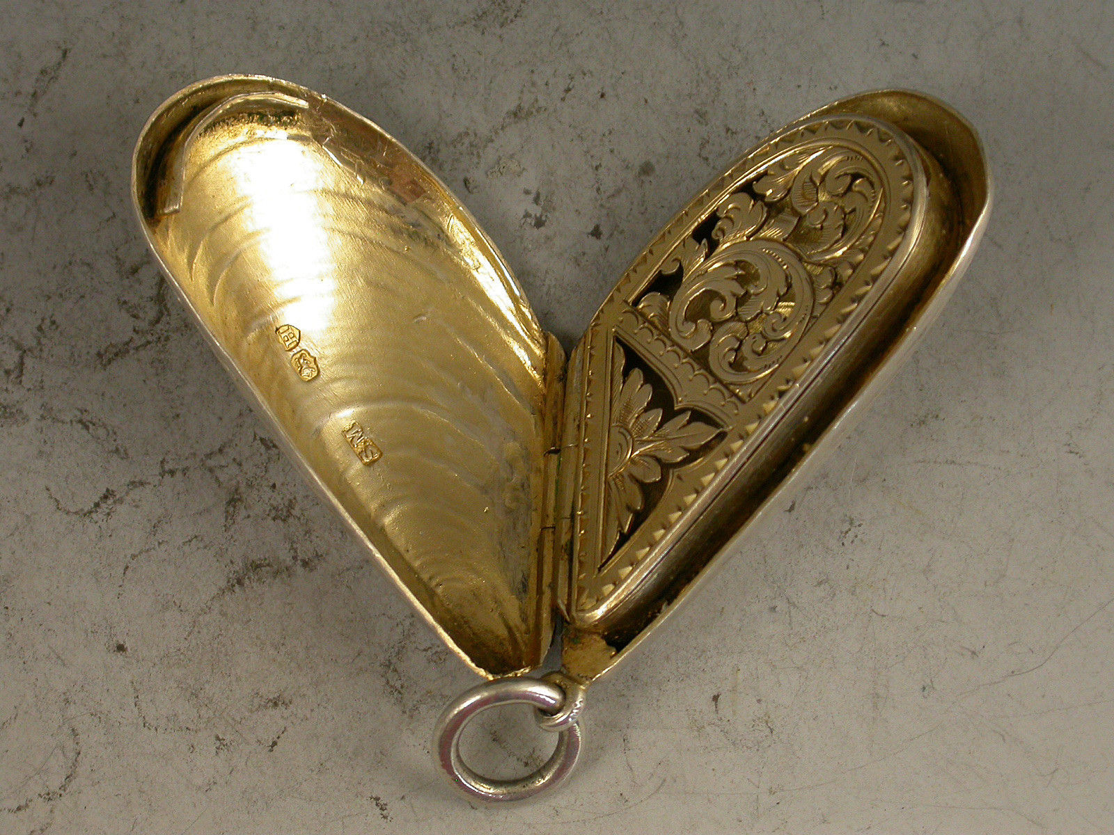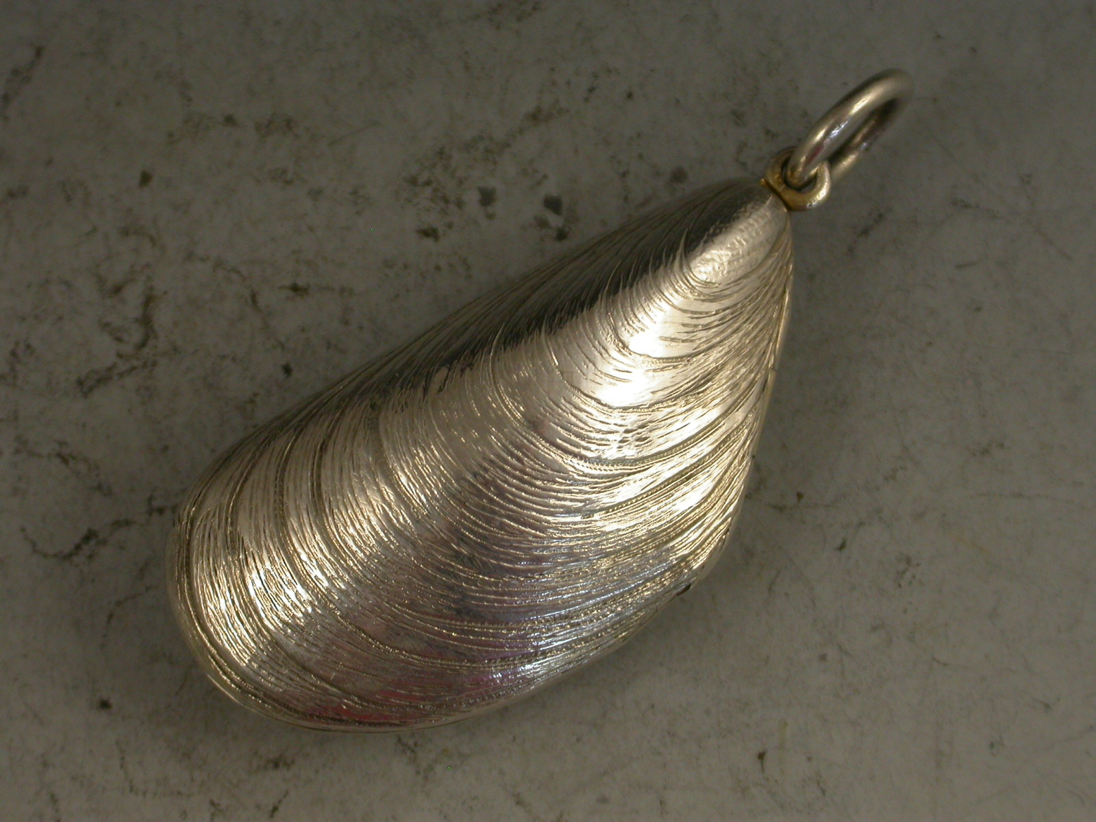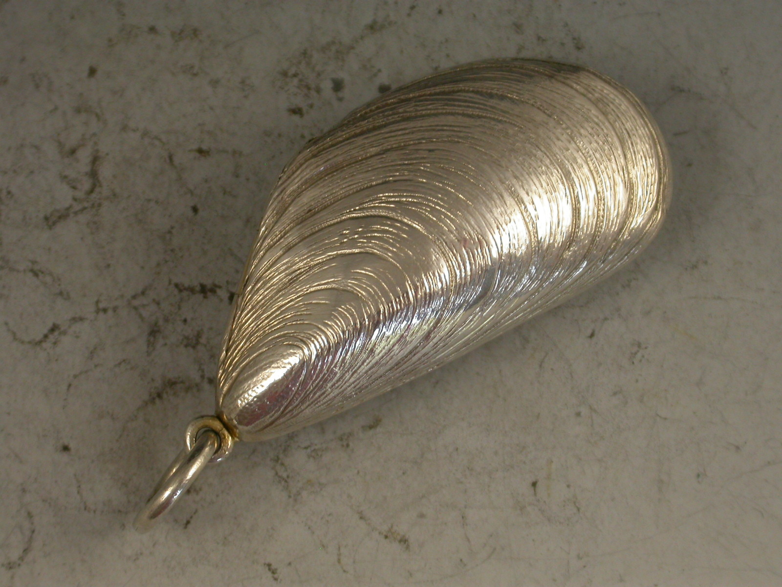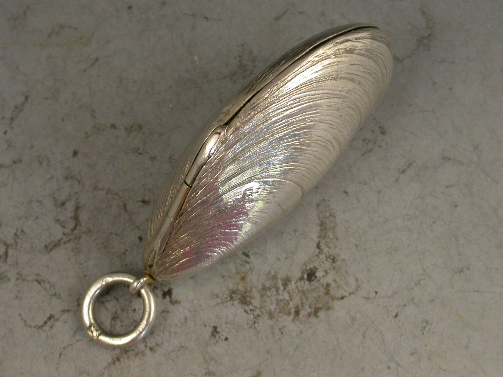 An extremely fine and rare fully hallmarked novelty silver Vinaigrette formed as a mussel shell, with a natralistically engraved exterior, the silver gilt interior with elaborately pierced grille. Attached suspension ring.