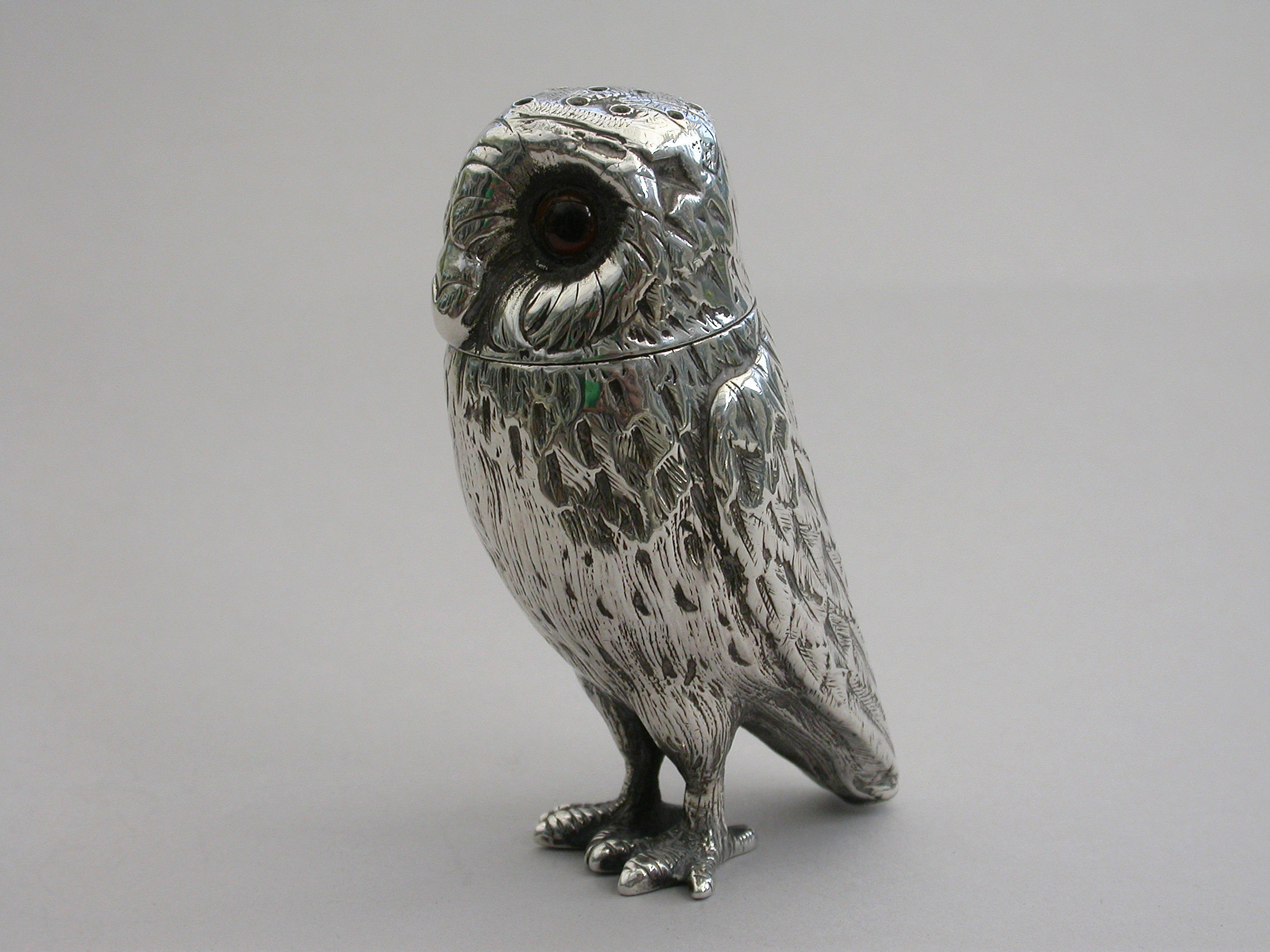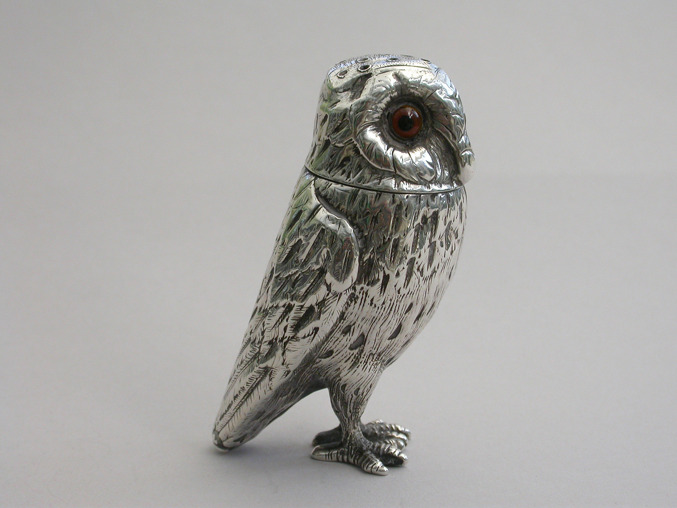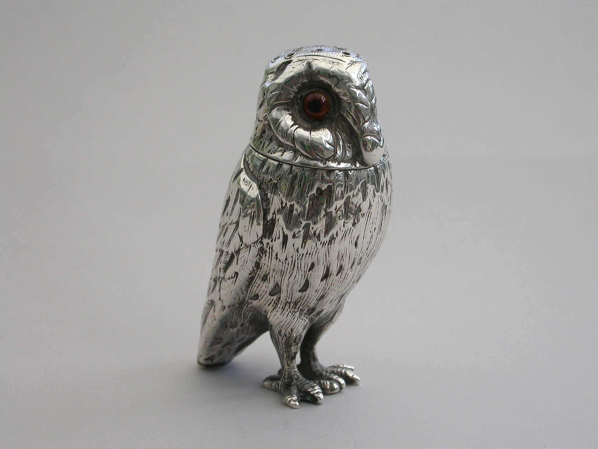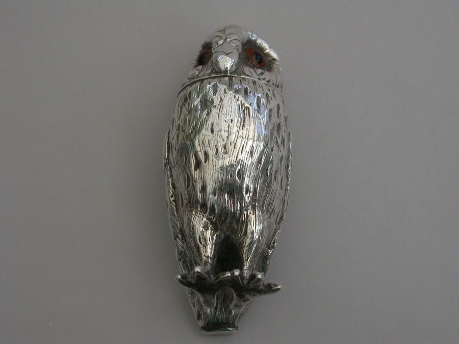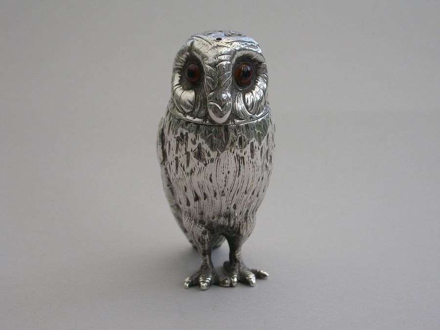 A good Victorian novelty silver Pepper, made in the form of a standing owl with amber glass eyes, pull-off pierced head and silver gilt interior.