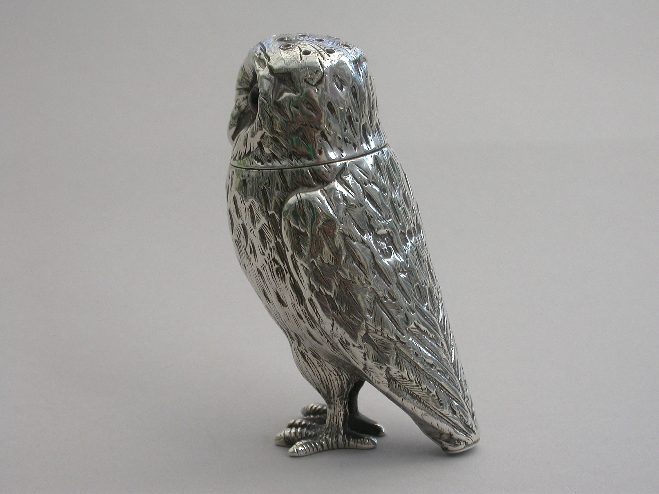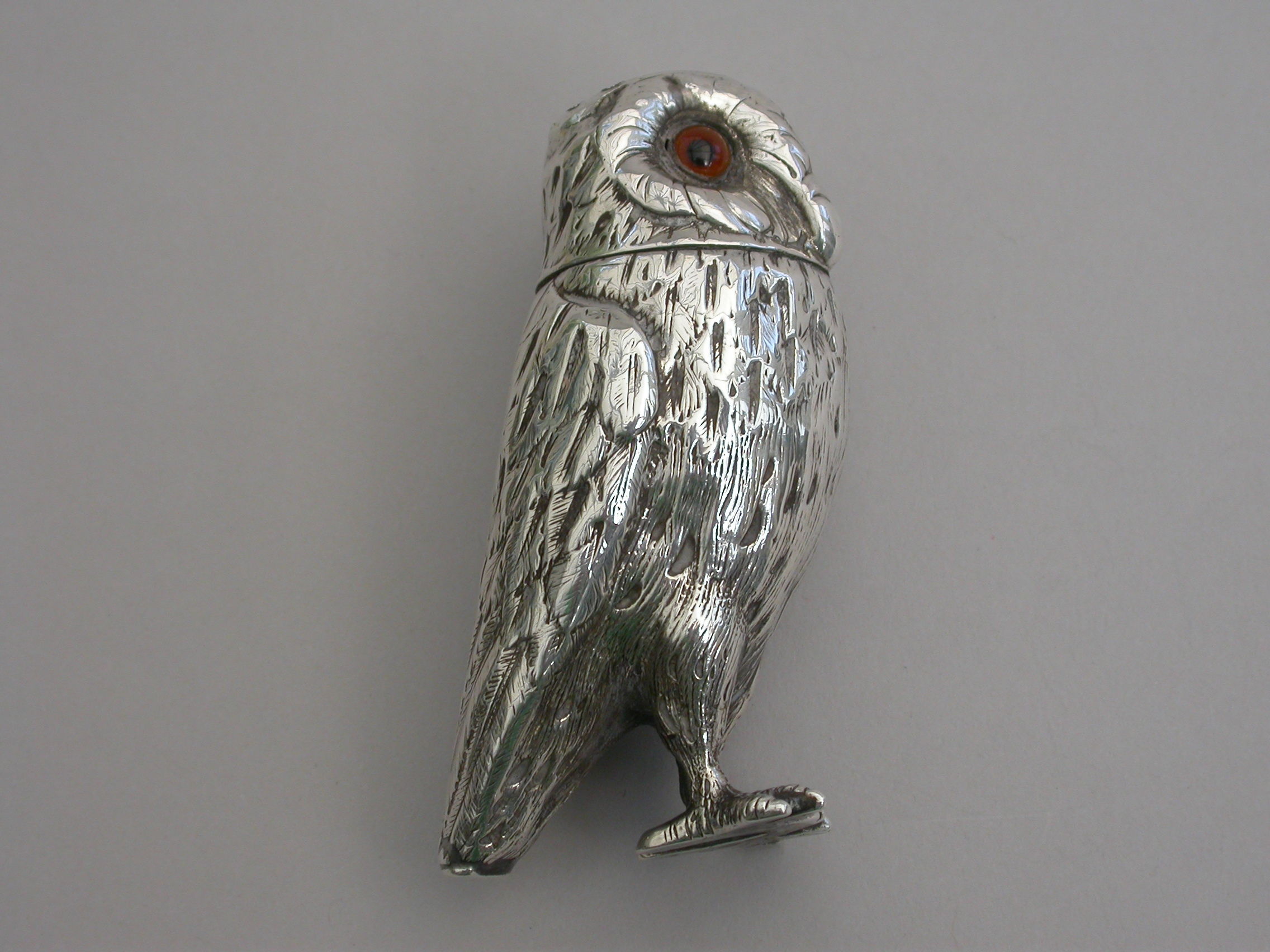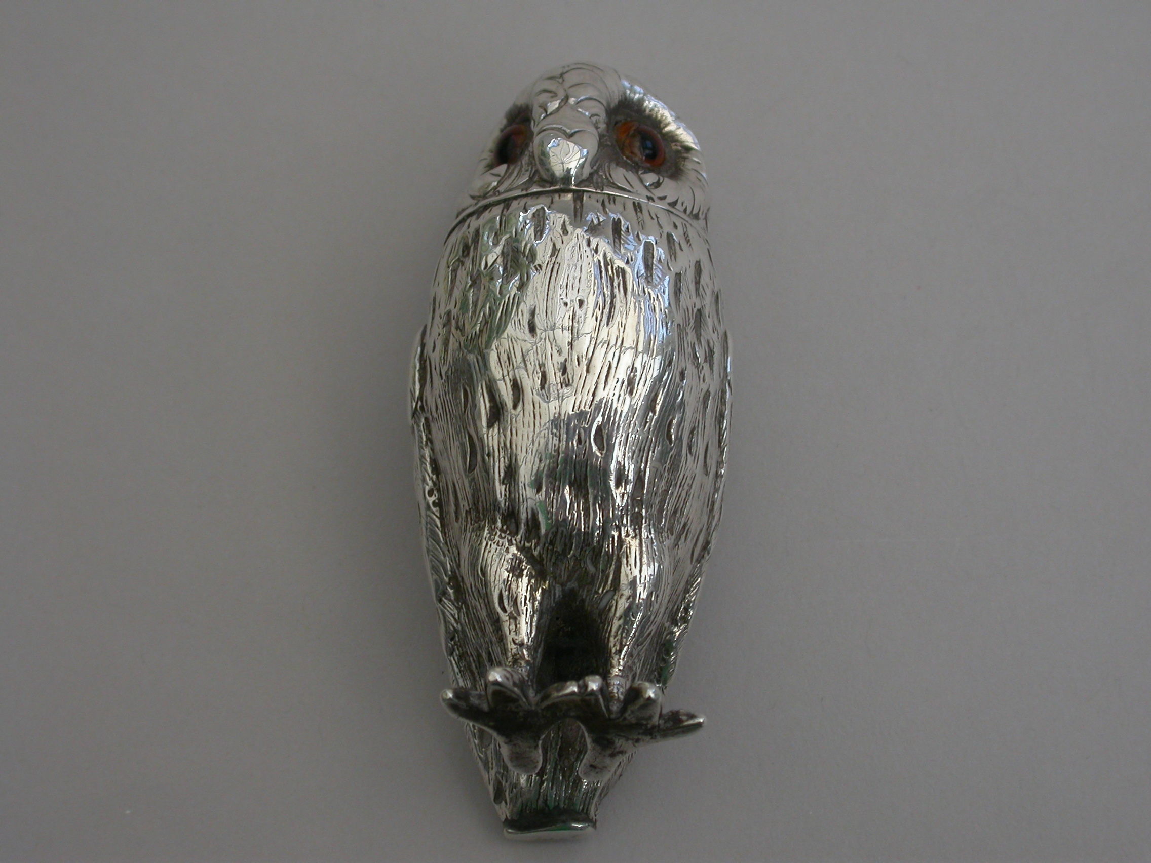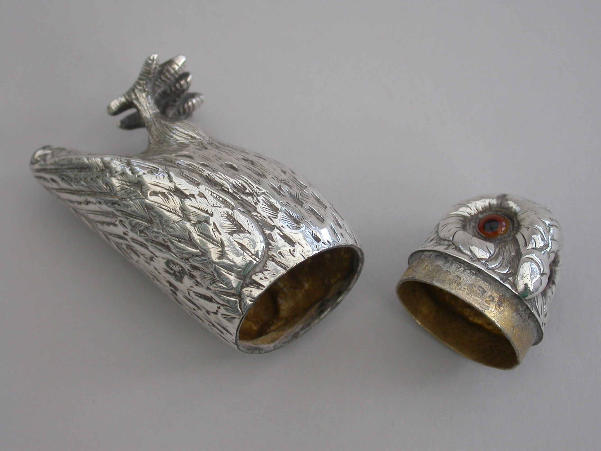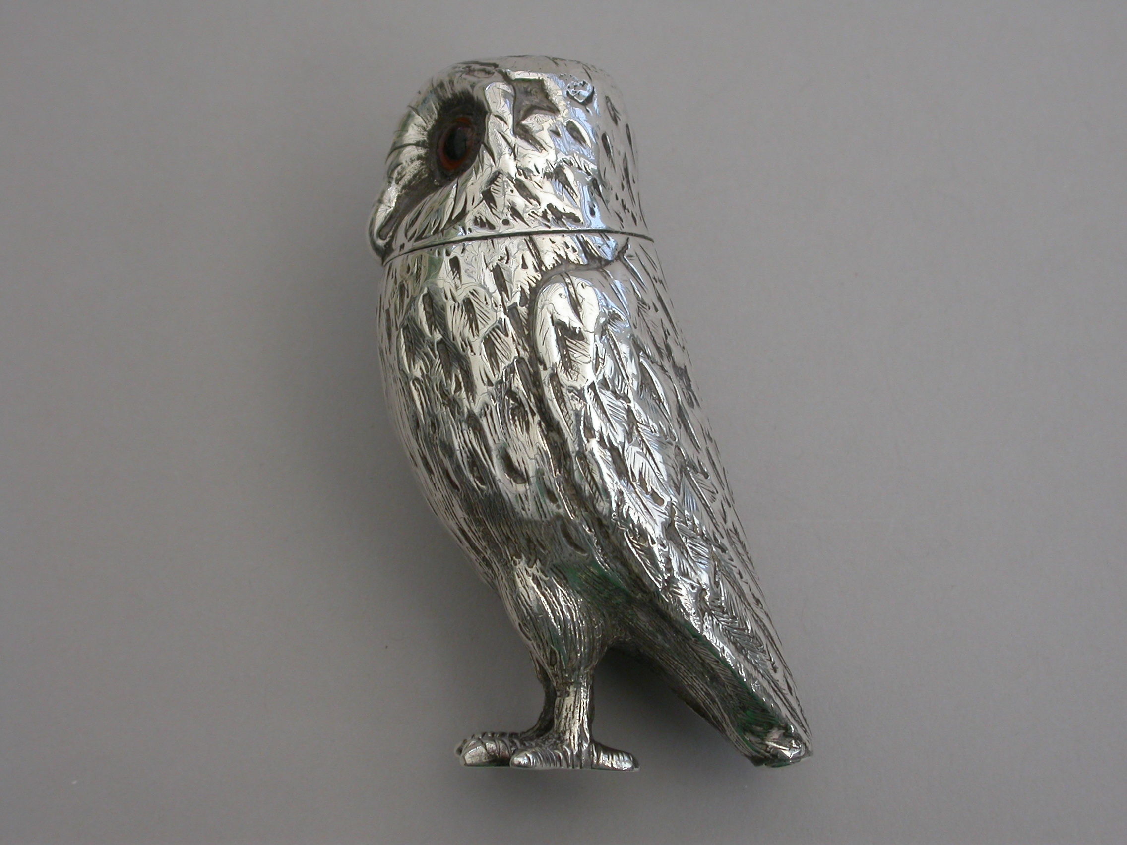 A good Victorian novelty silver Pepper, made in the form of a standing owl with amber glass eyes, pull-off pierced head and silver gilt interior.