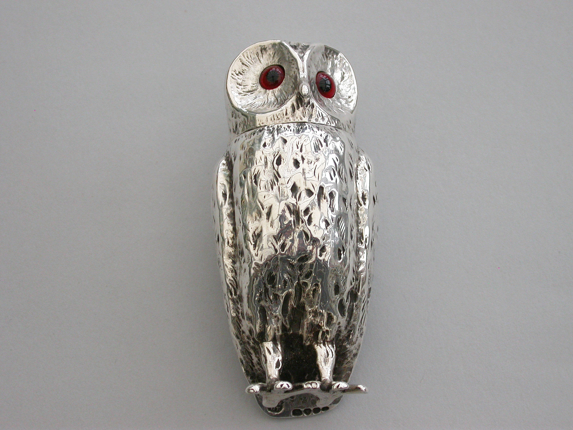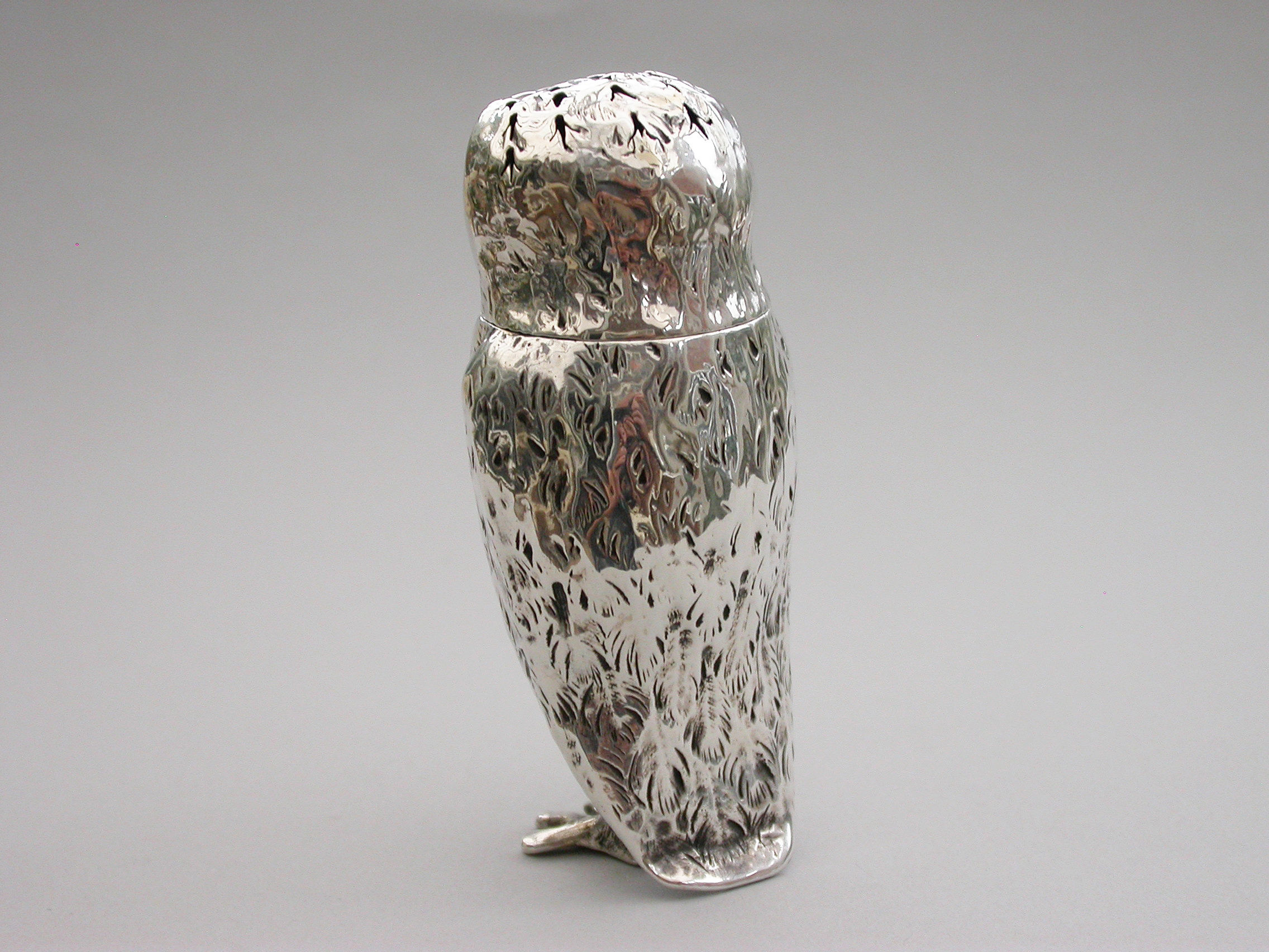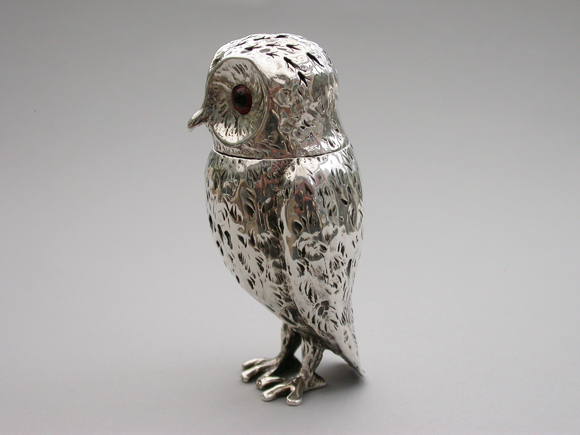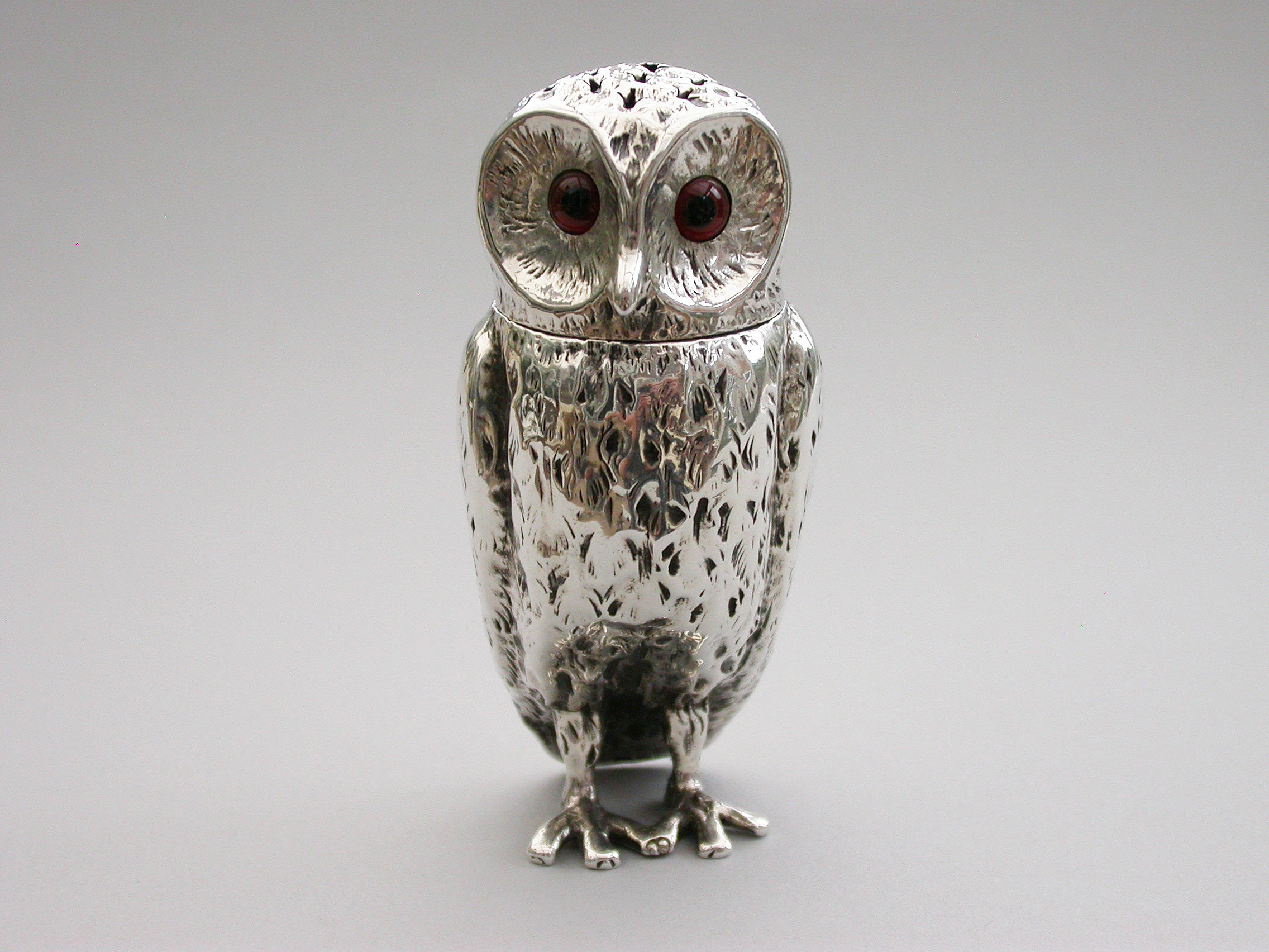 A good Victorian novelty silver Pepper, made in the form of a standing owl with amber glass eyes, pull-off pierced head and silver gilt interior.