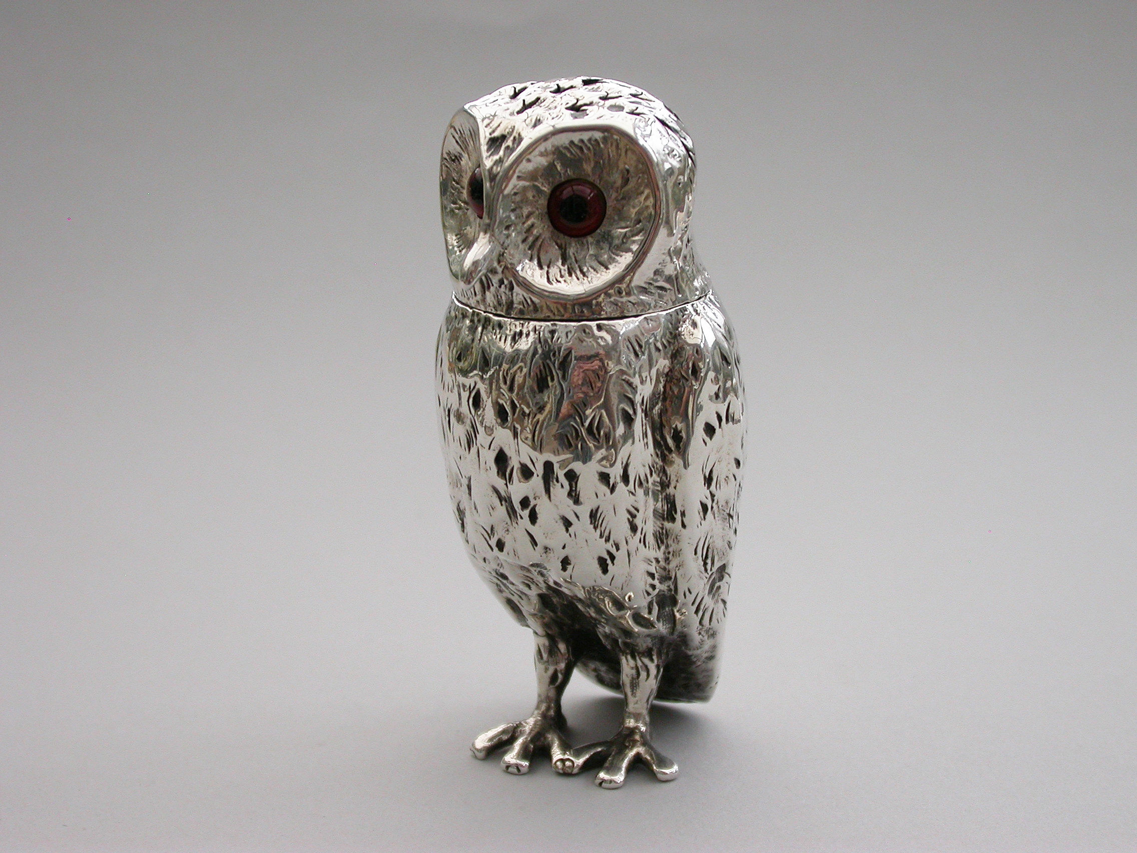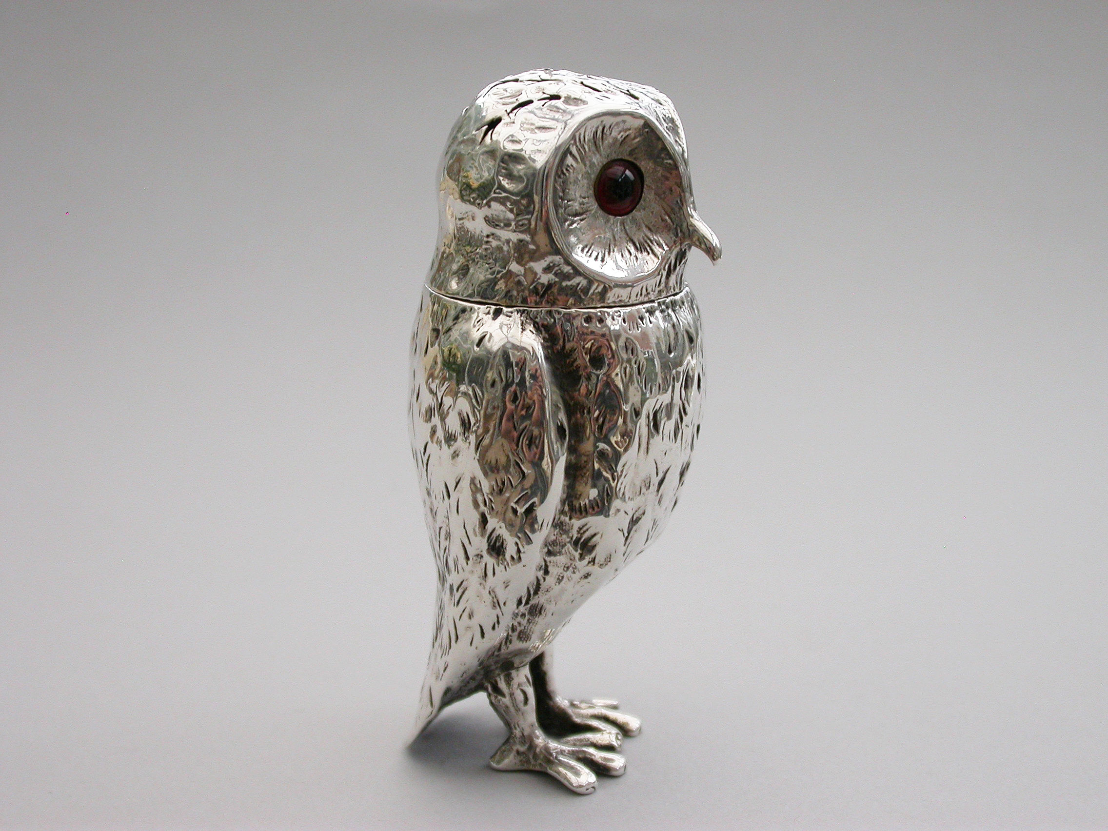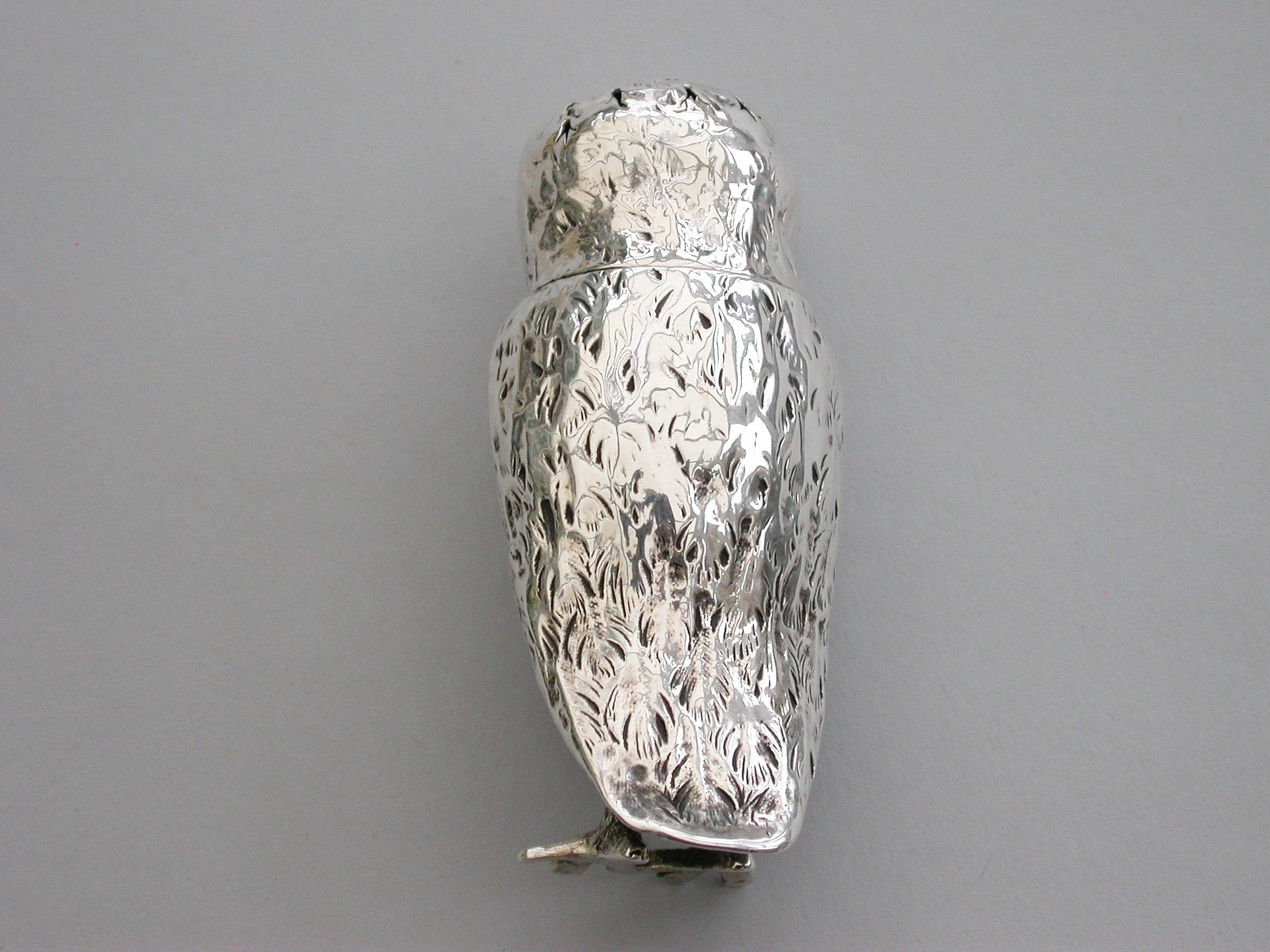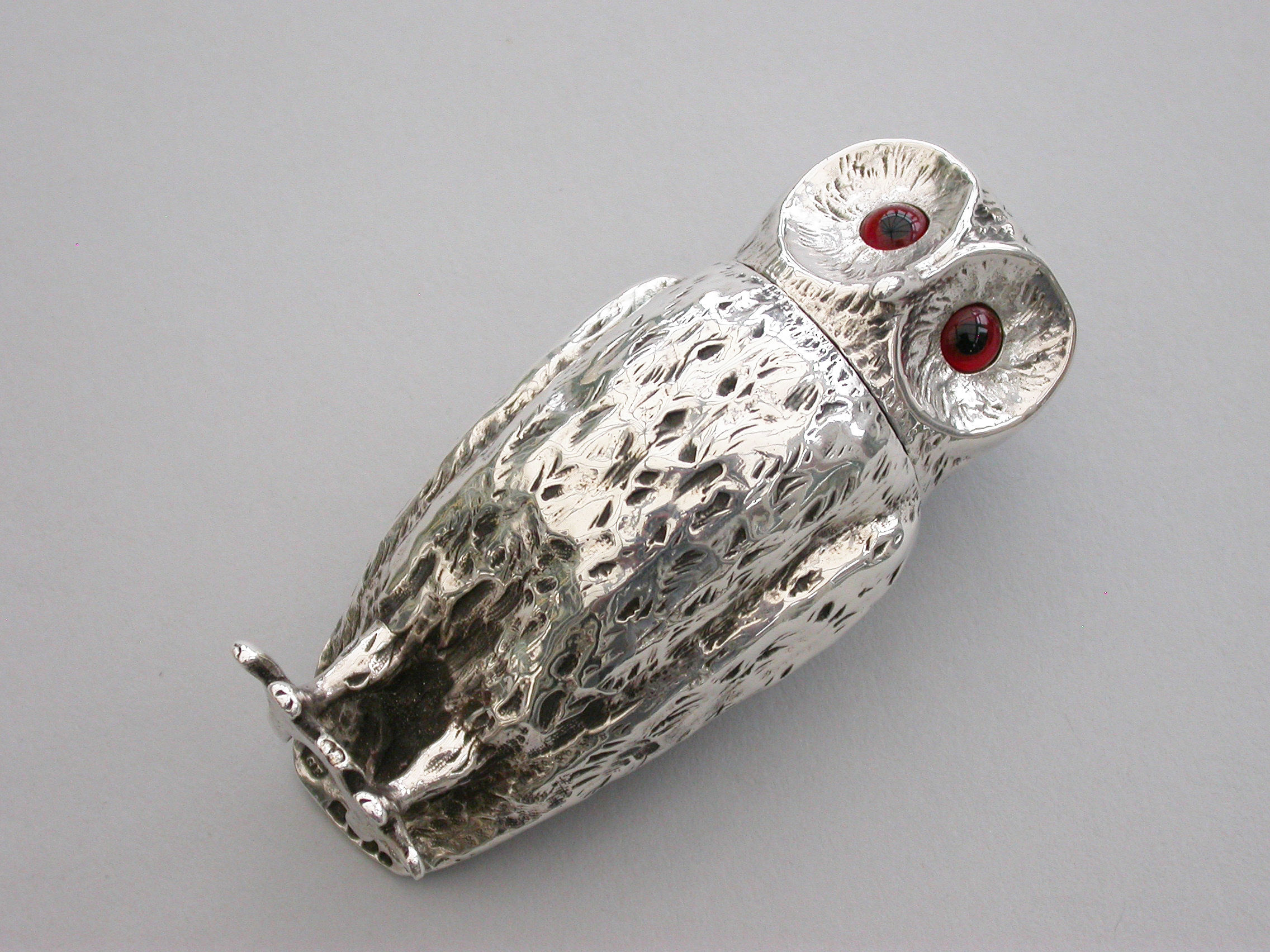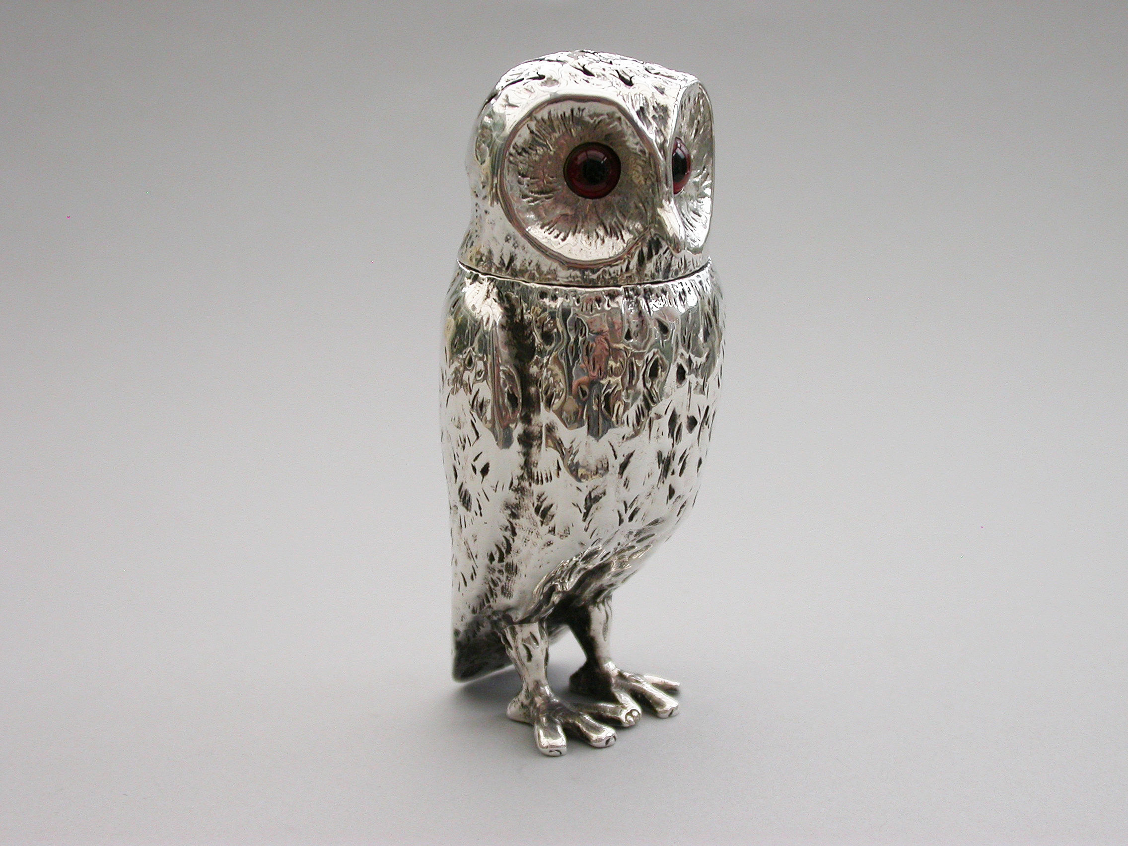 A good Victorian novelty silver Pepper, made in the form of a standing owl with amber glass eyes, pull-off pierced head and silver gilt interior.