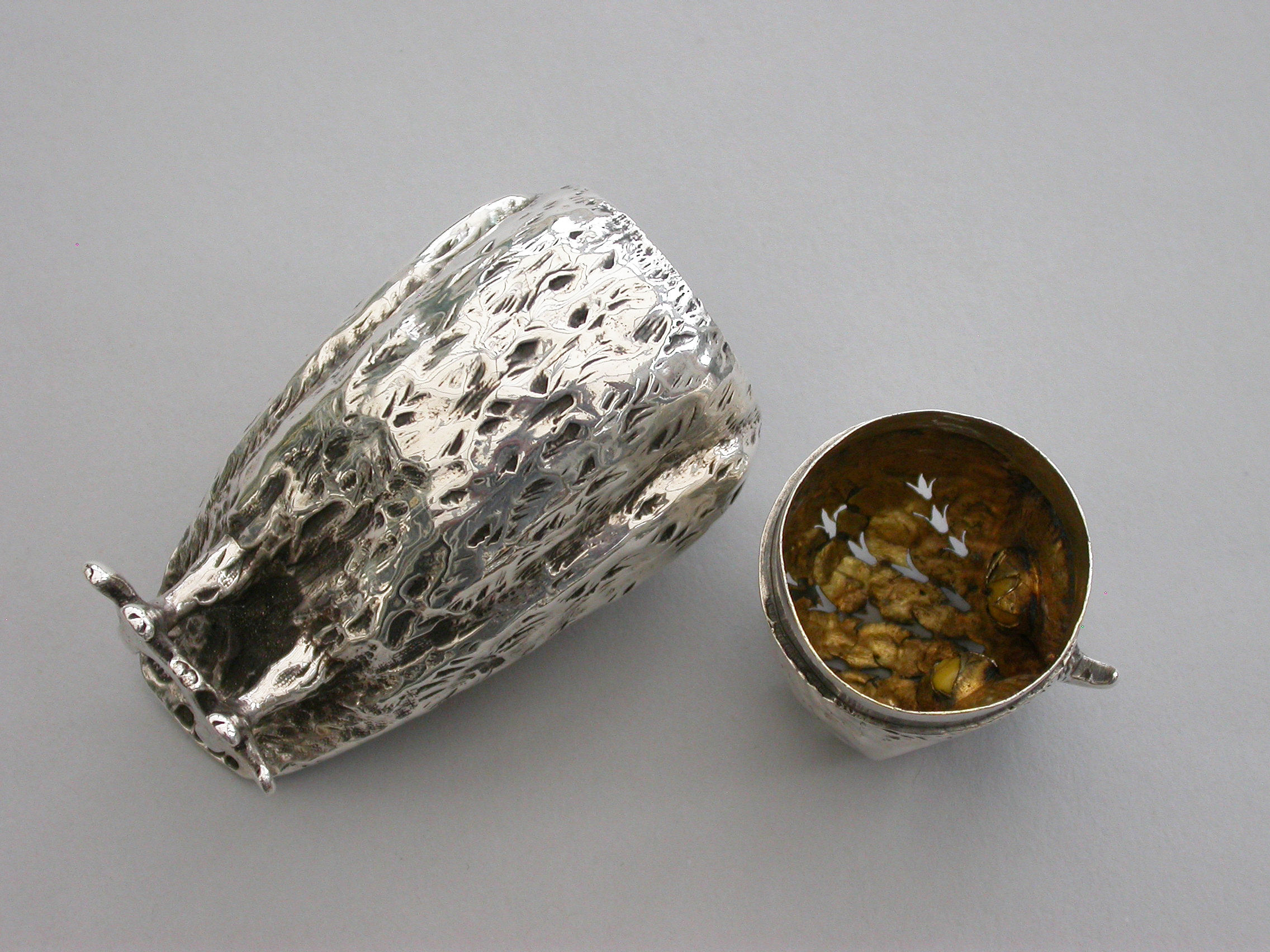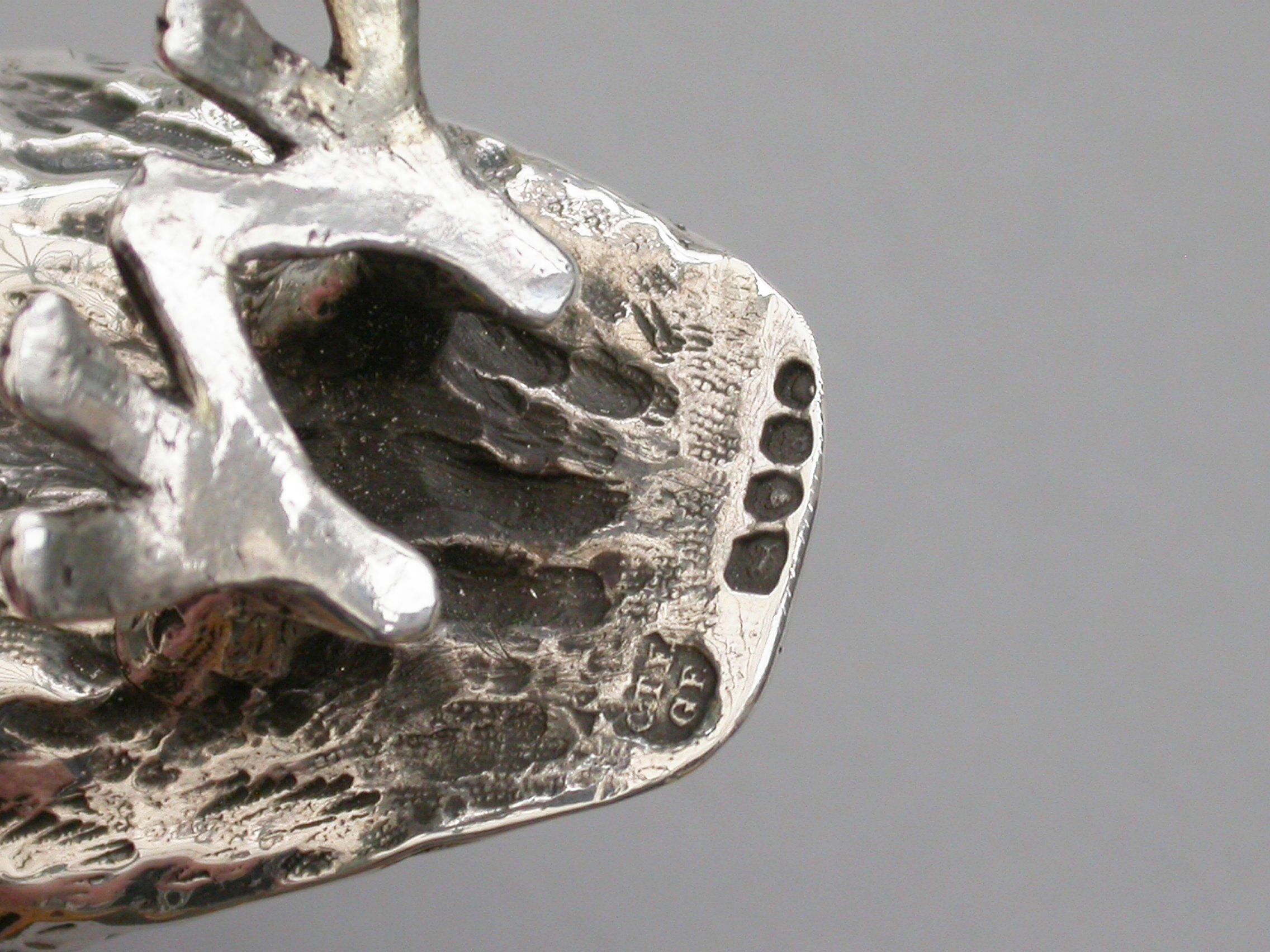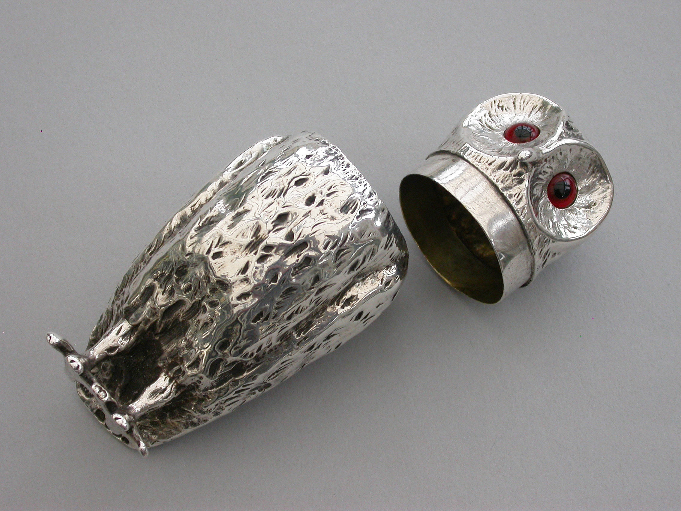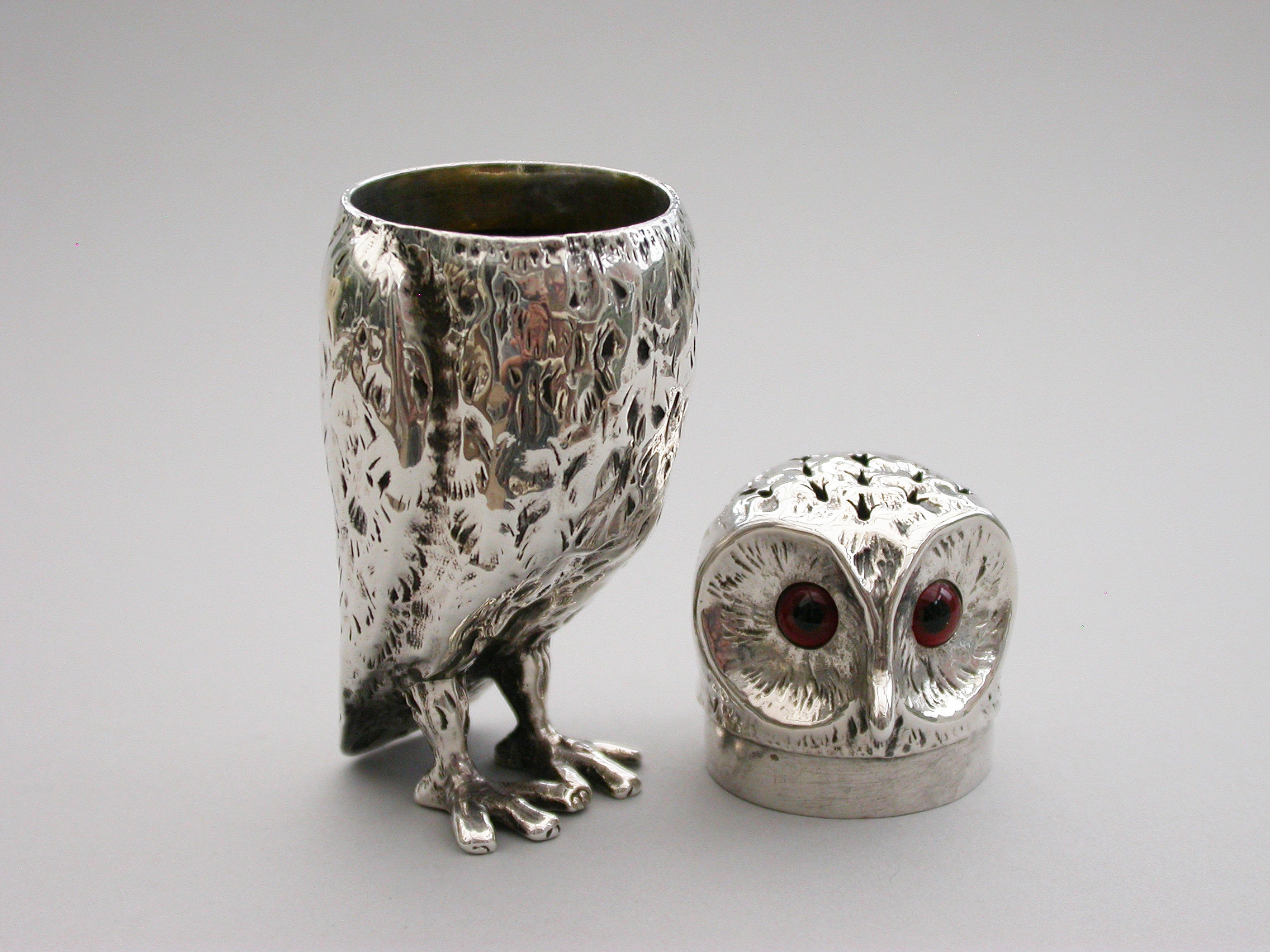 A good Victorian novelty silver Pepper, made in the form of a standing owl with amber glass eyes, pull-off pierced head and silver gilt interior.
