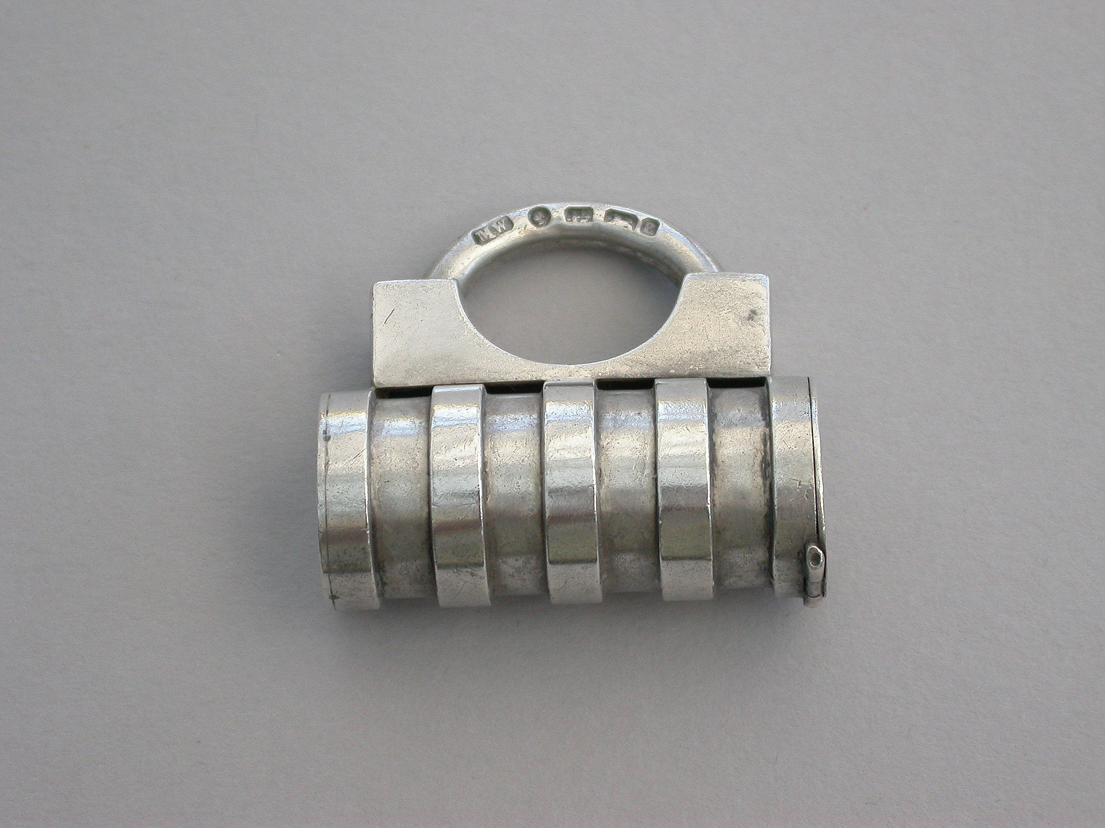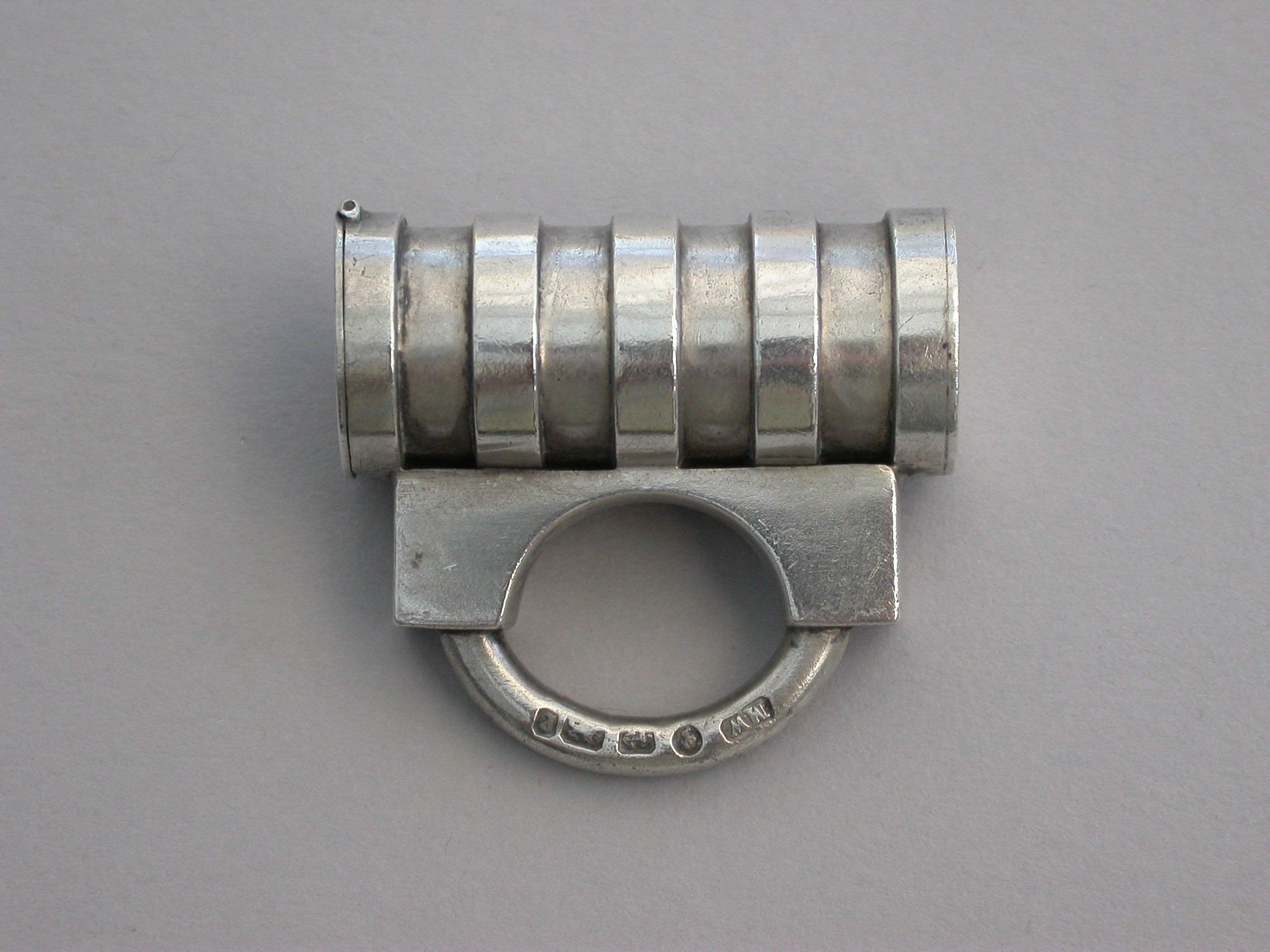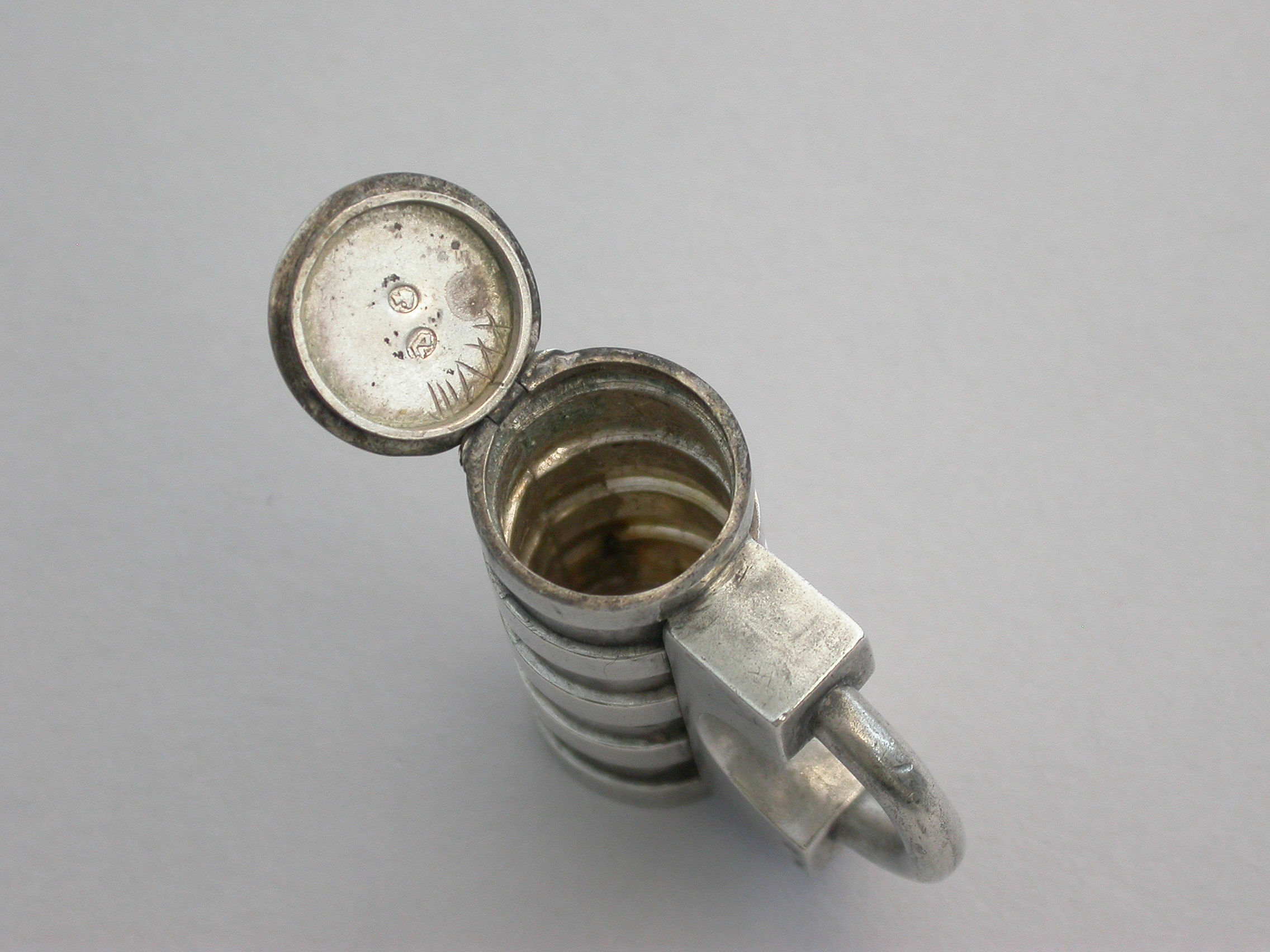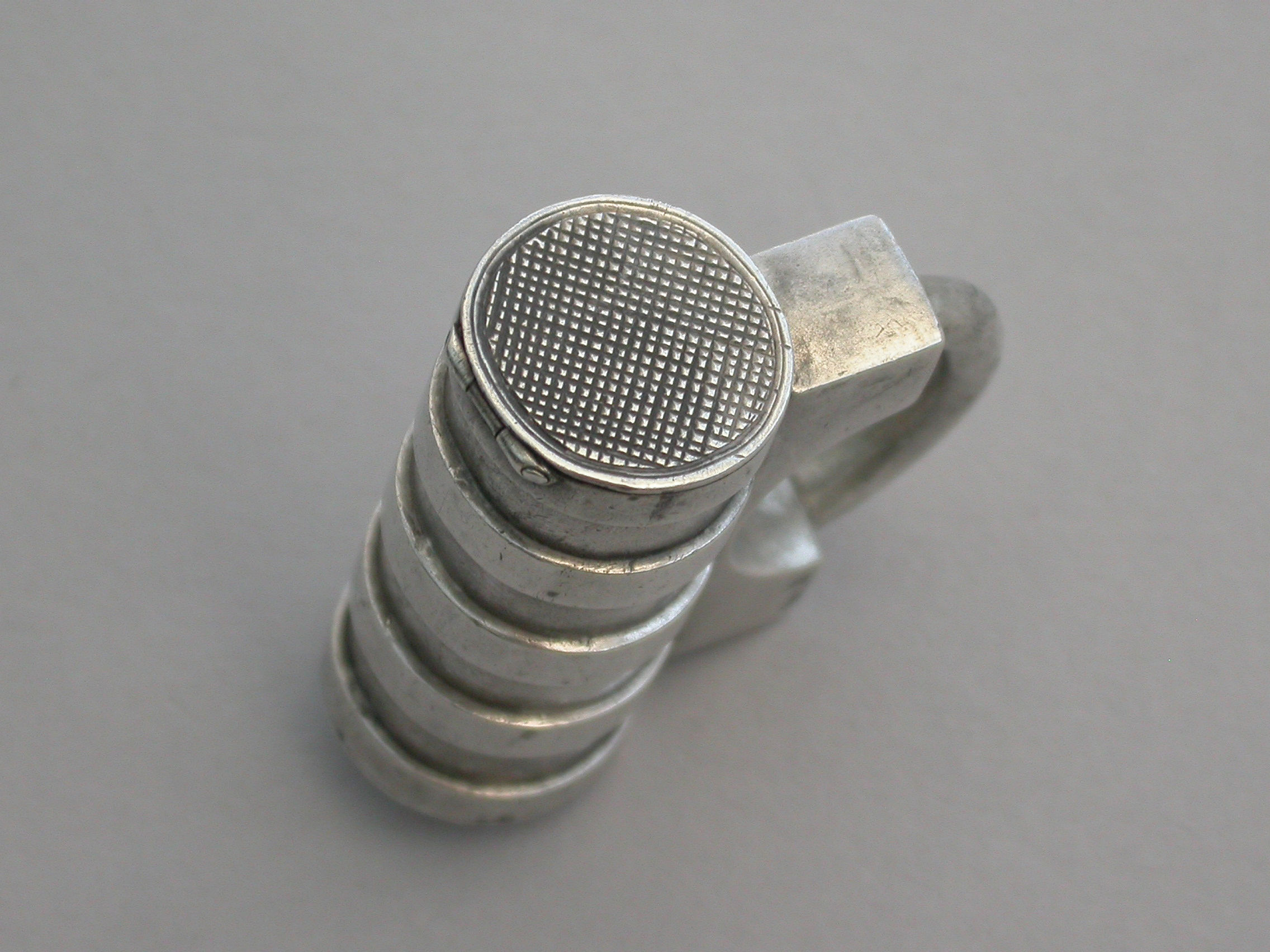 A rare Victorian novelty silver Vesta Case made in the form of a Padlock with cylindrical ribbed barrel, the striker to the top of the flat hinged lid.