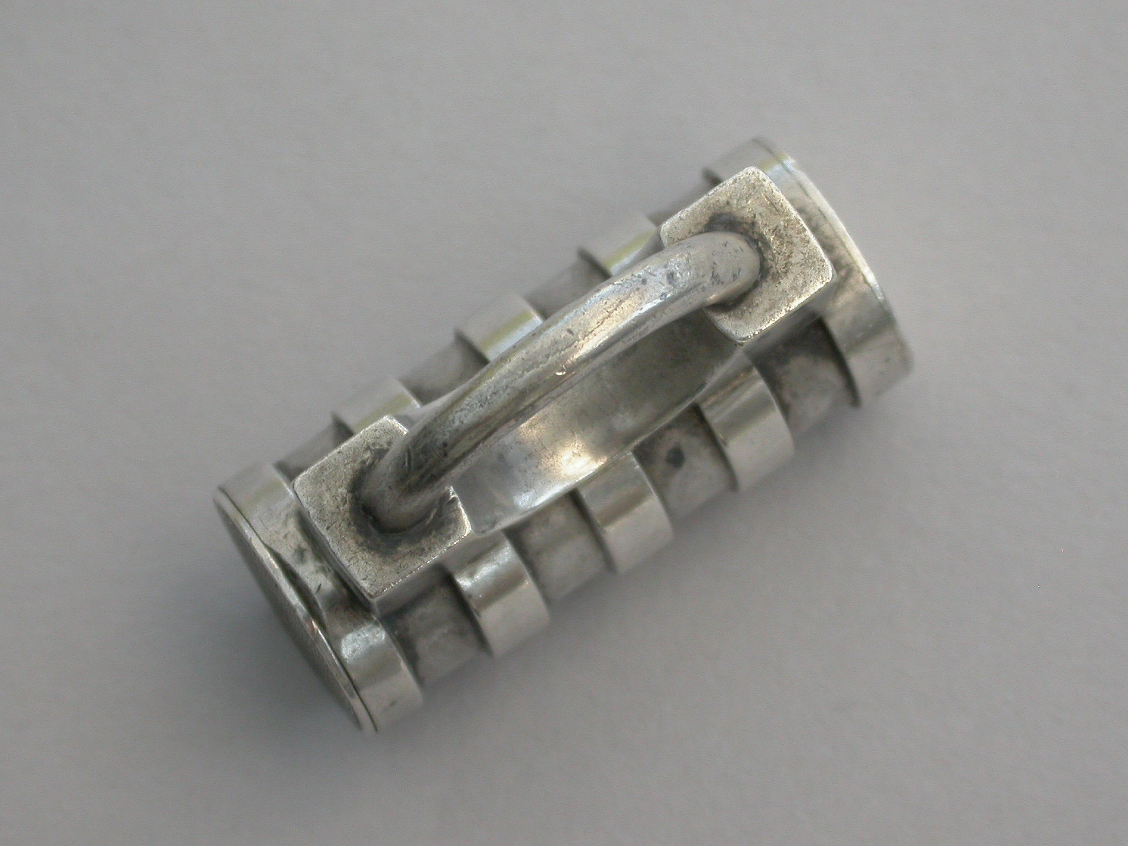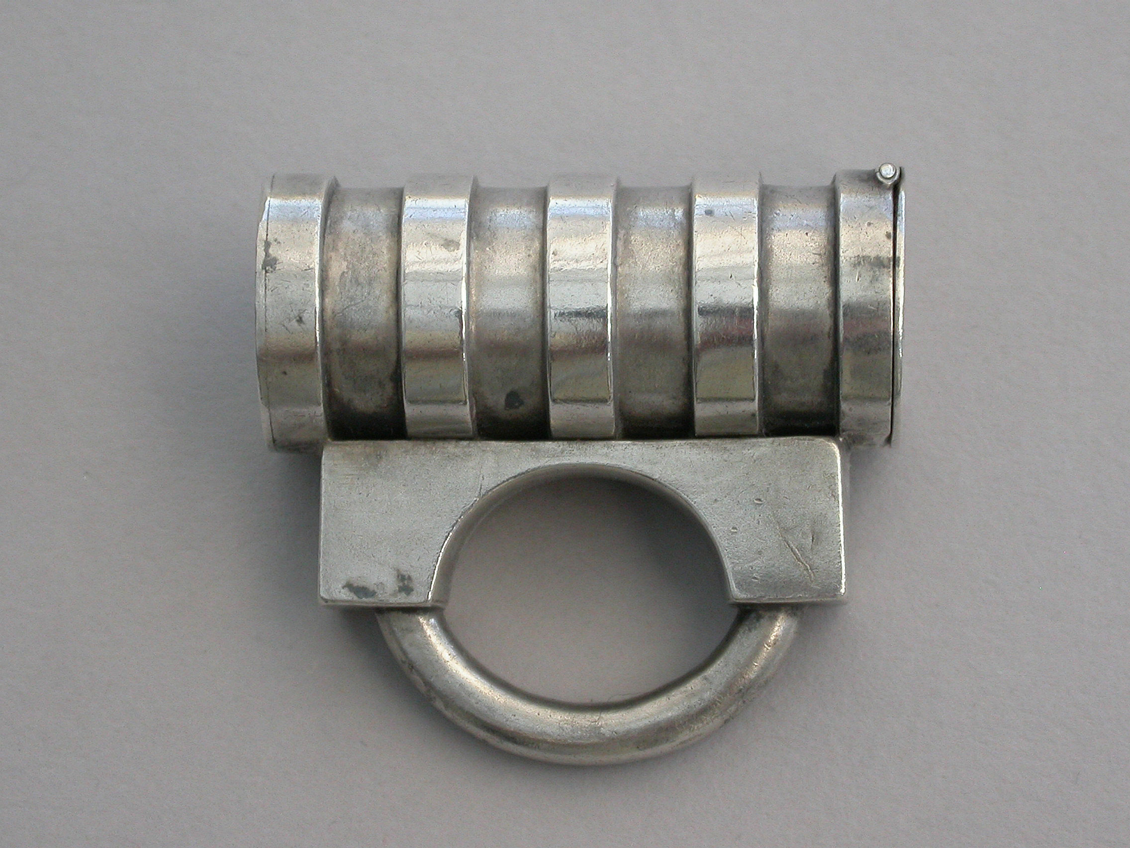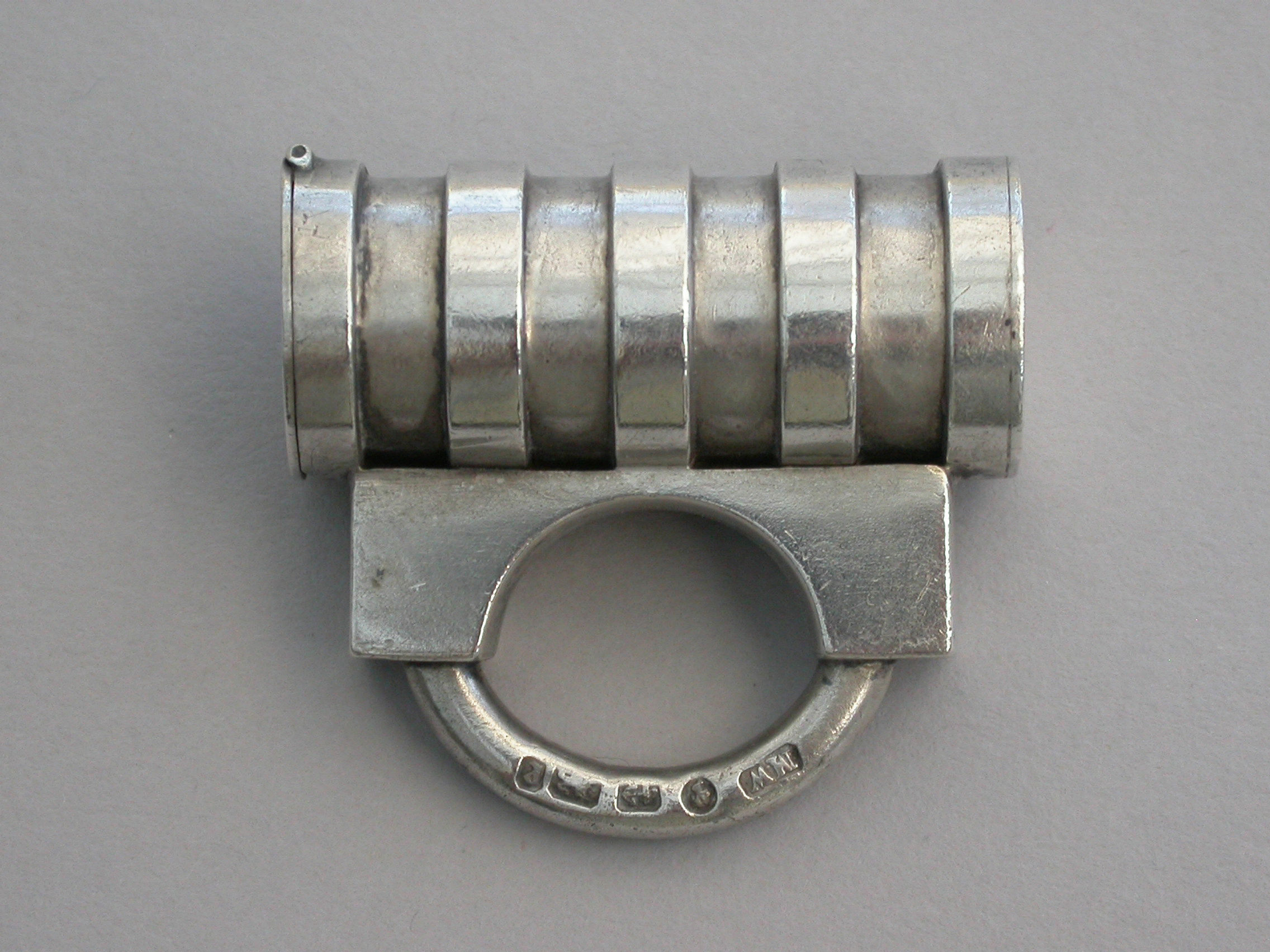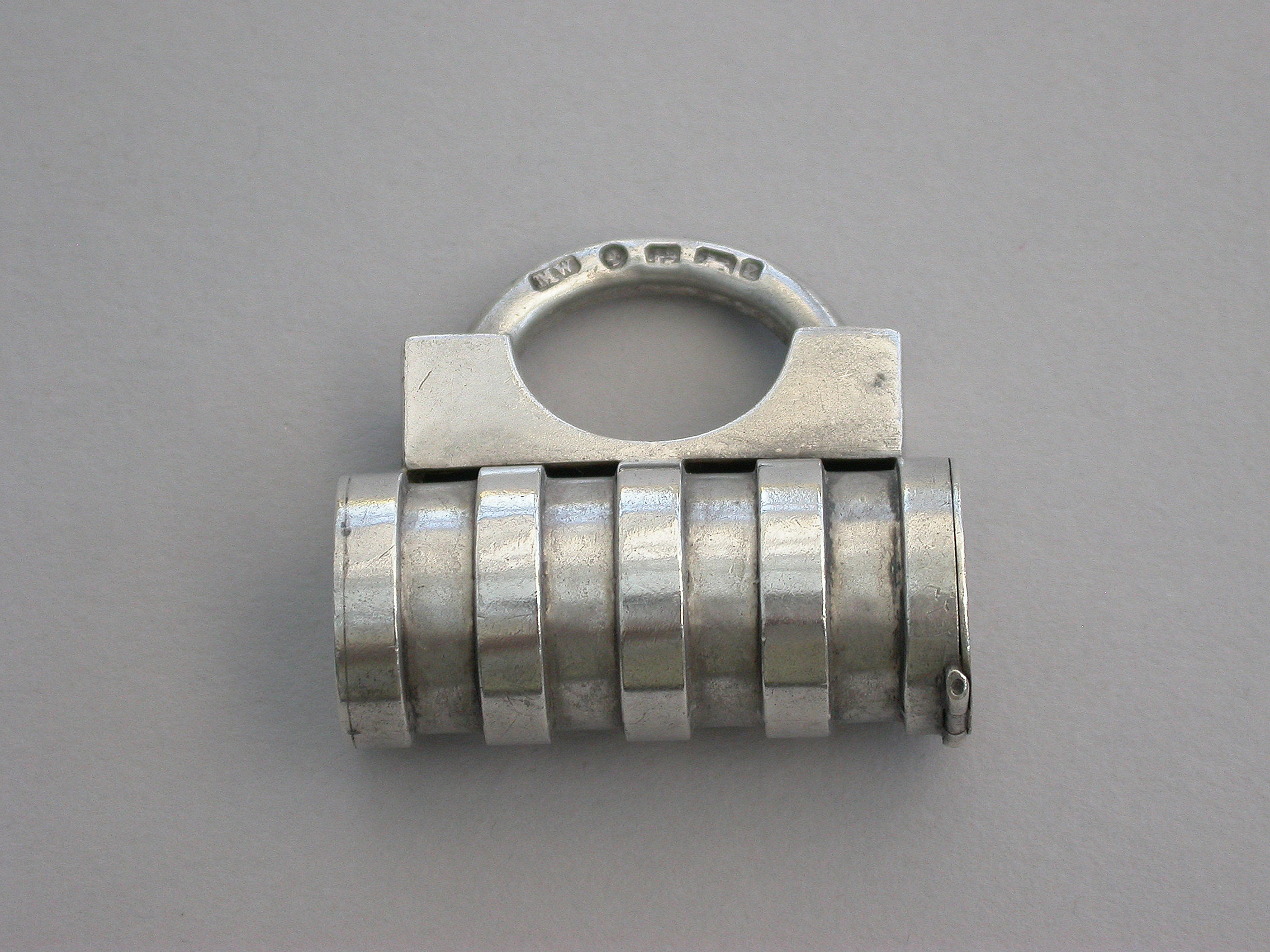 A rare Victorian novelty silver Vesta Case made in the form of a Padlock with cylindrical ribbed barrel, the striker to the top of the flat hinged lid.