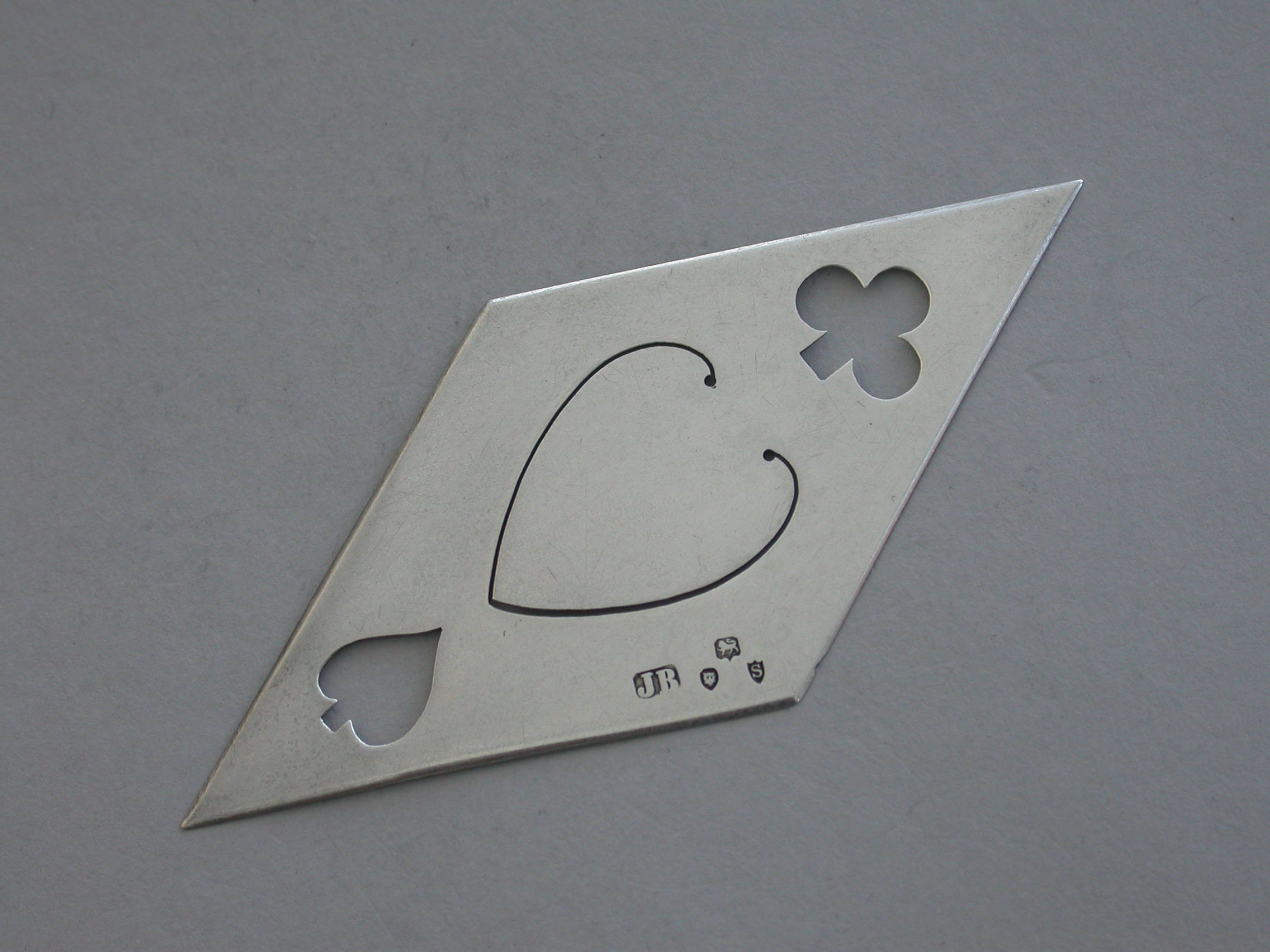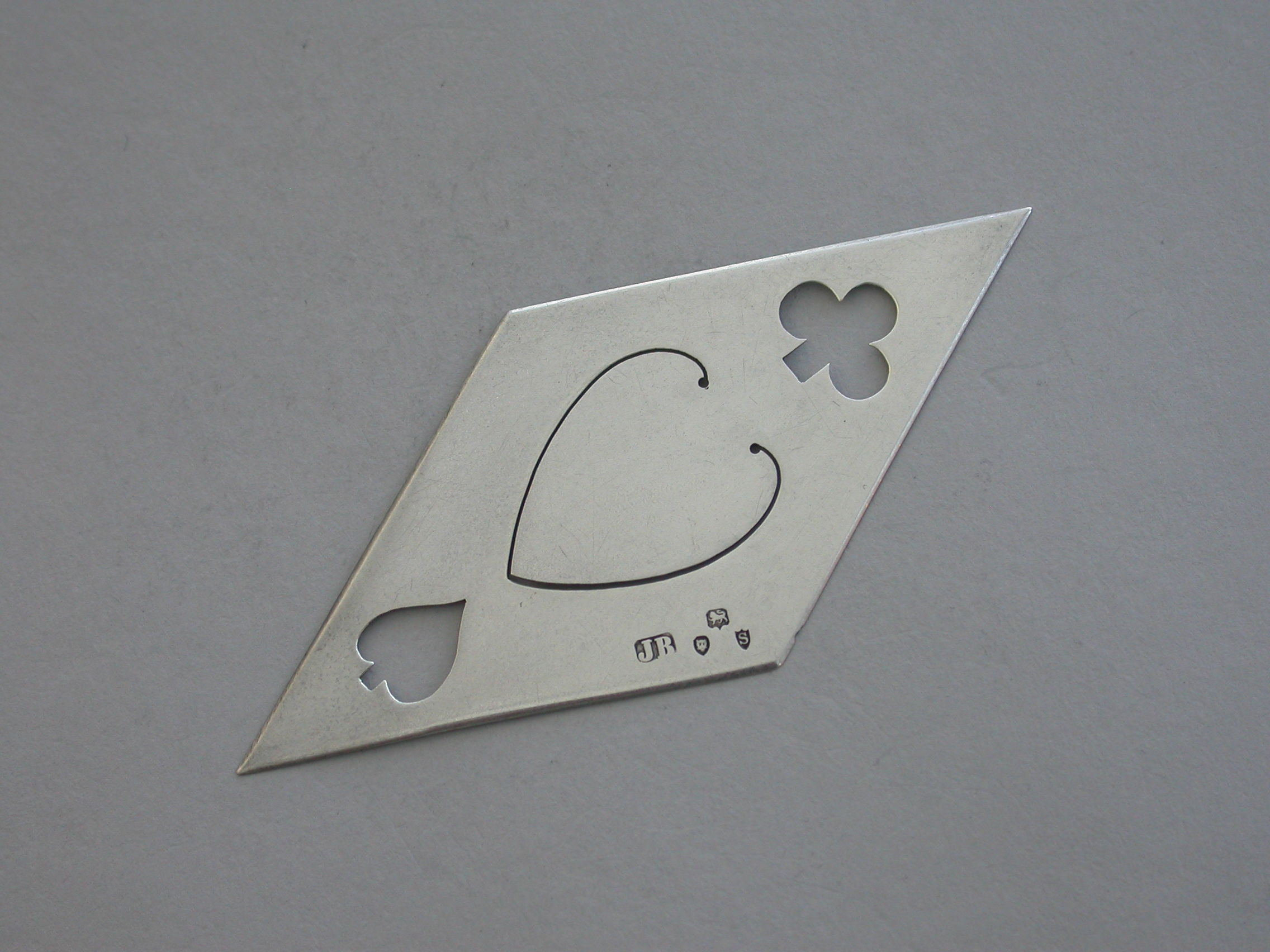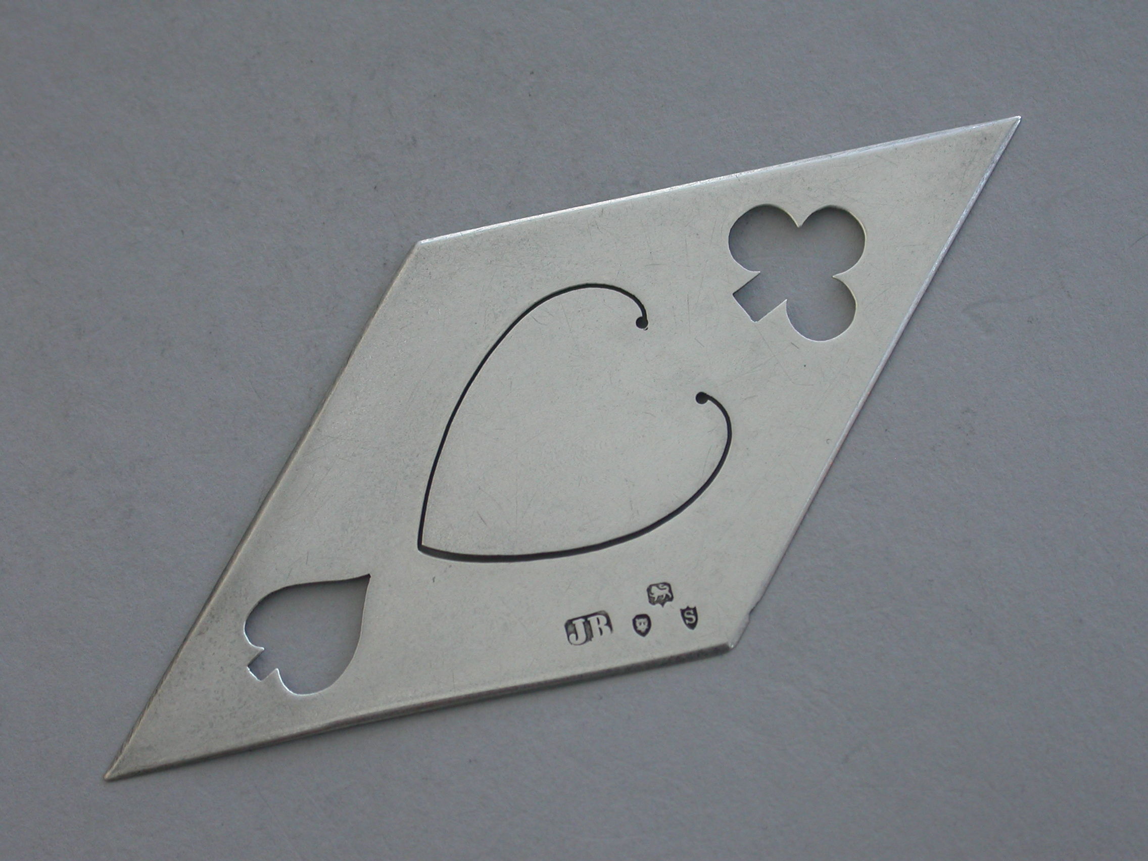 A rare and unusual Victorian novelty silver Bookmark depicting the four playing card suits - Diamonds, Hearts, Spades and Clubs, of pierced diamond shape.