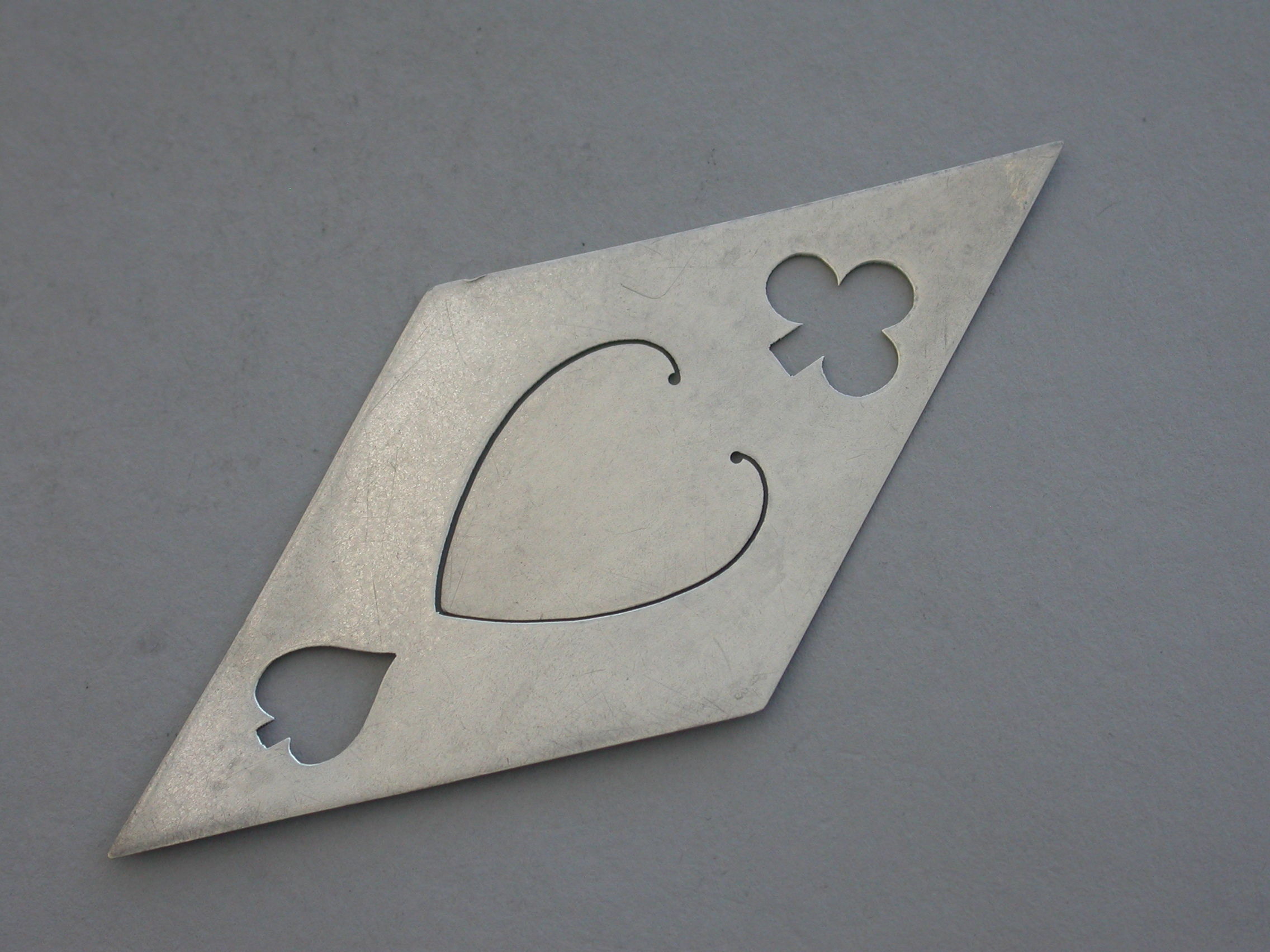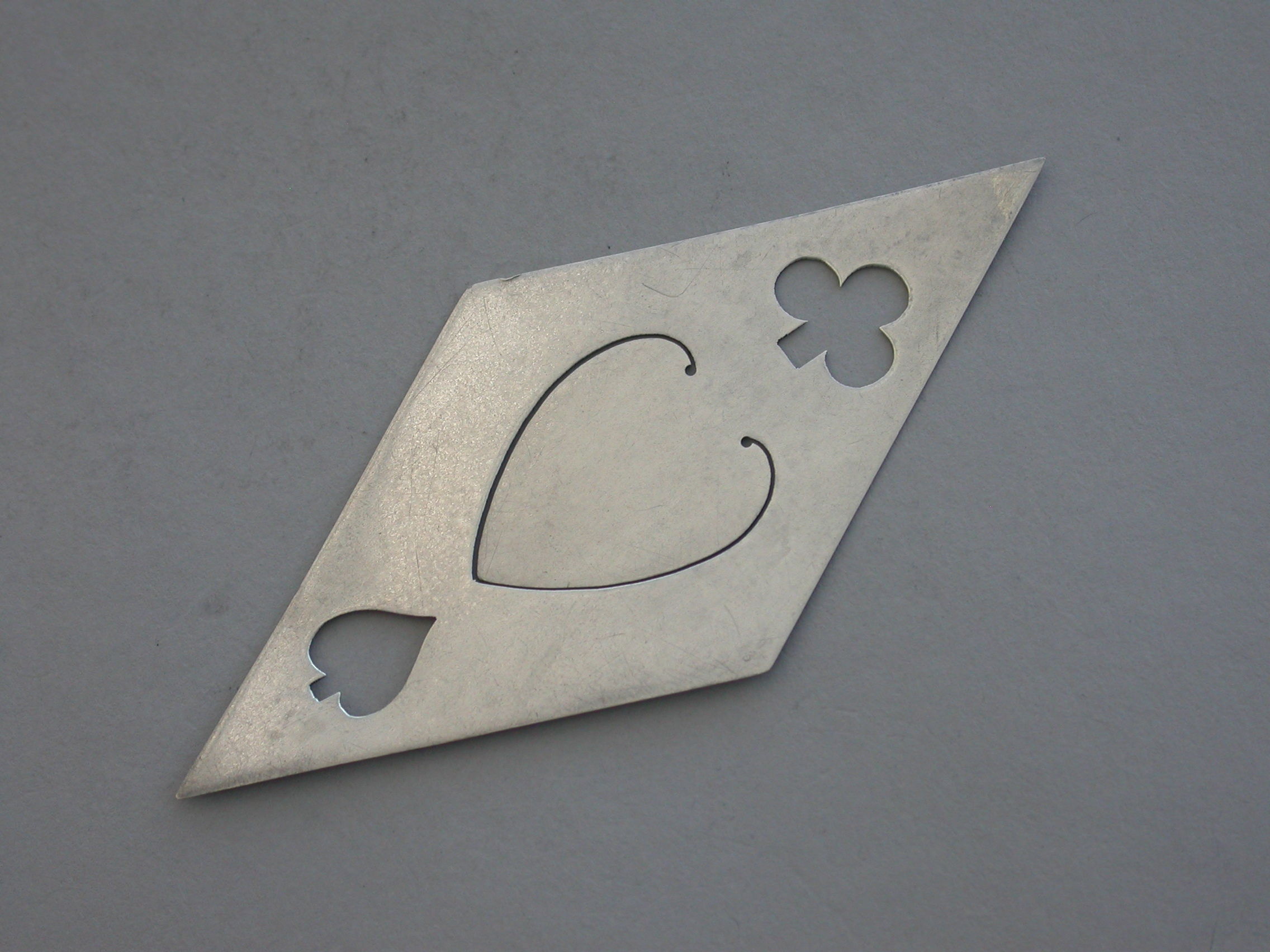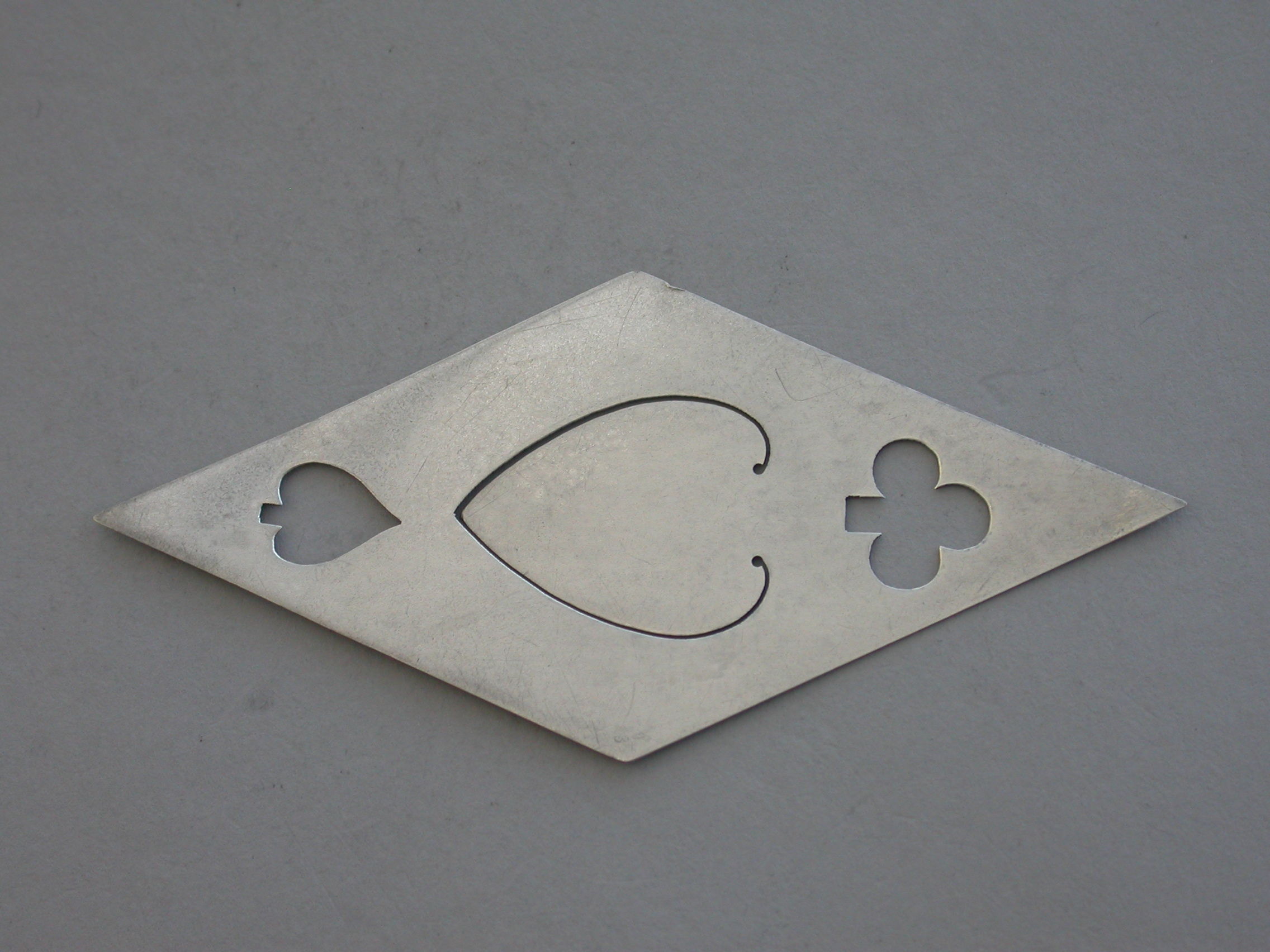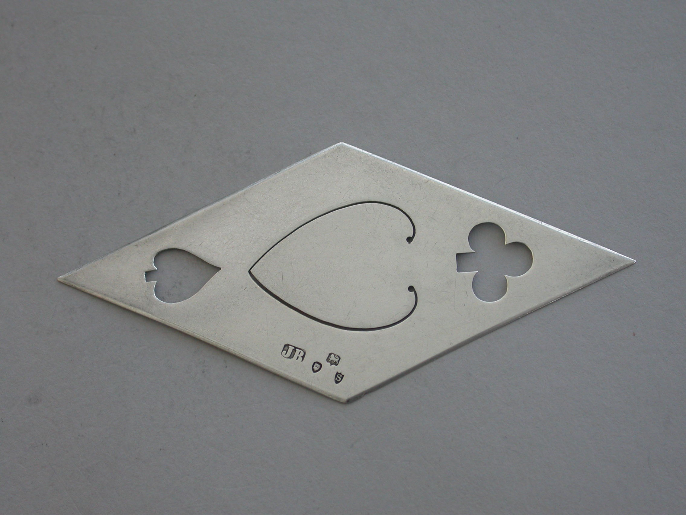 A rare and unusual Victorian novelty silver Bookmark depicting the four playing card suits - Diamonds, Hearts, Spades and Clubs, of pierced diamond shape.