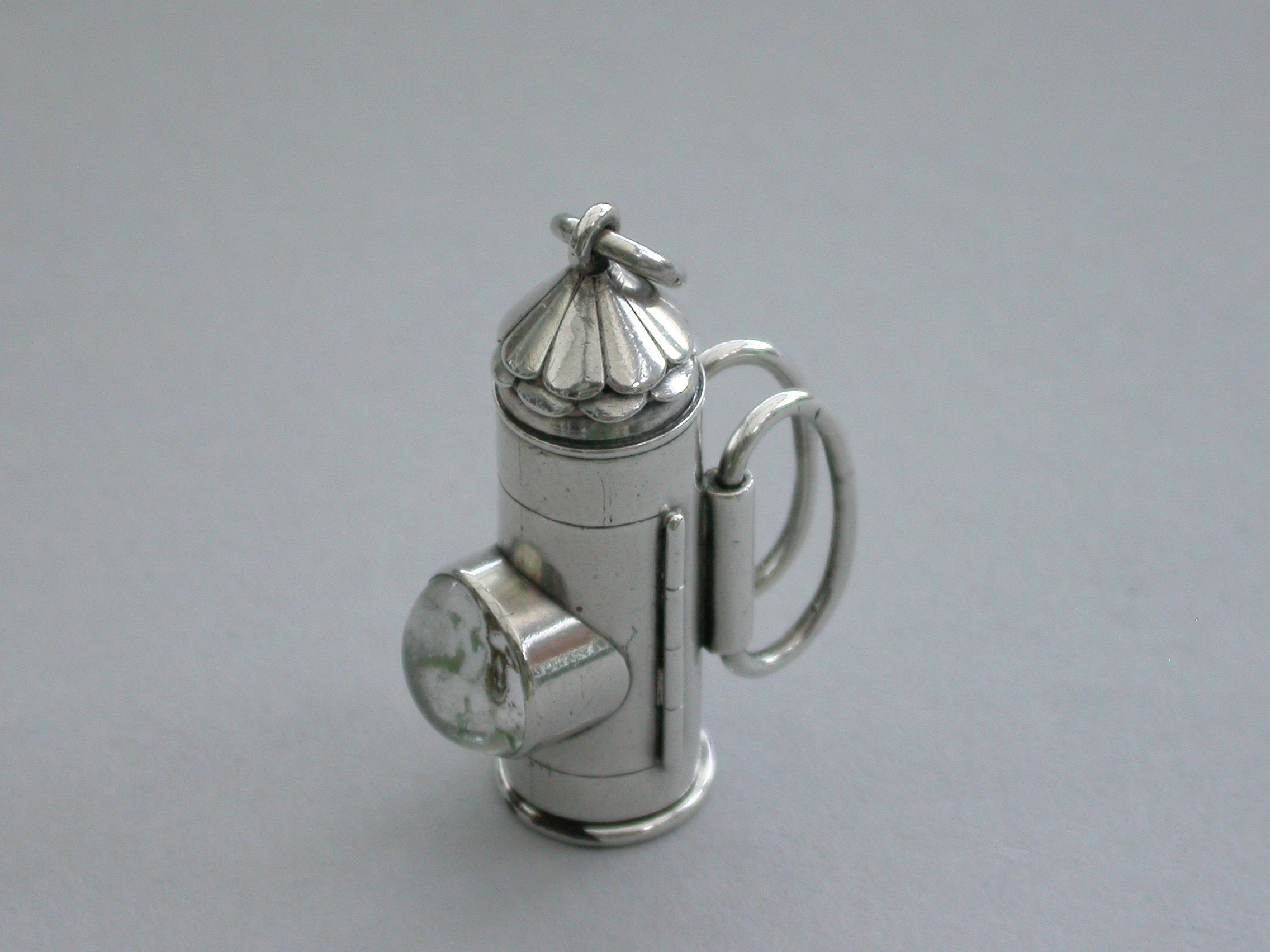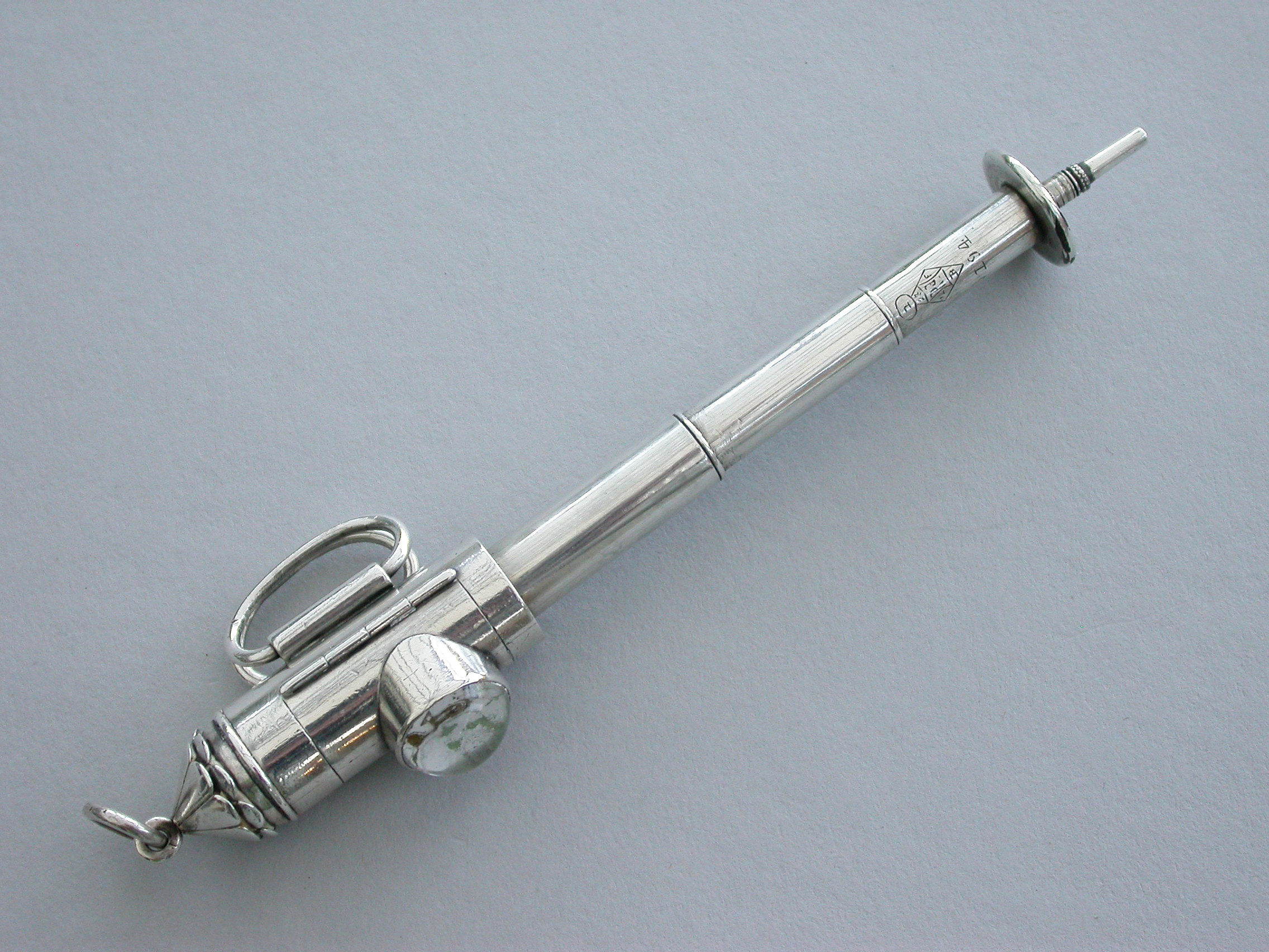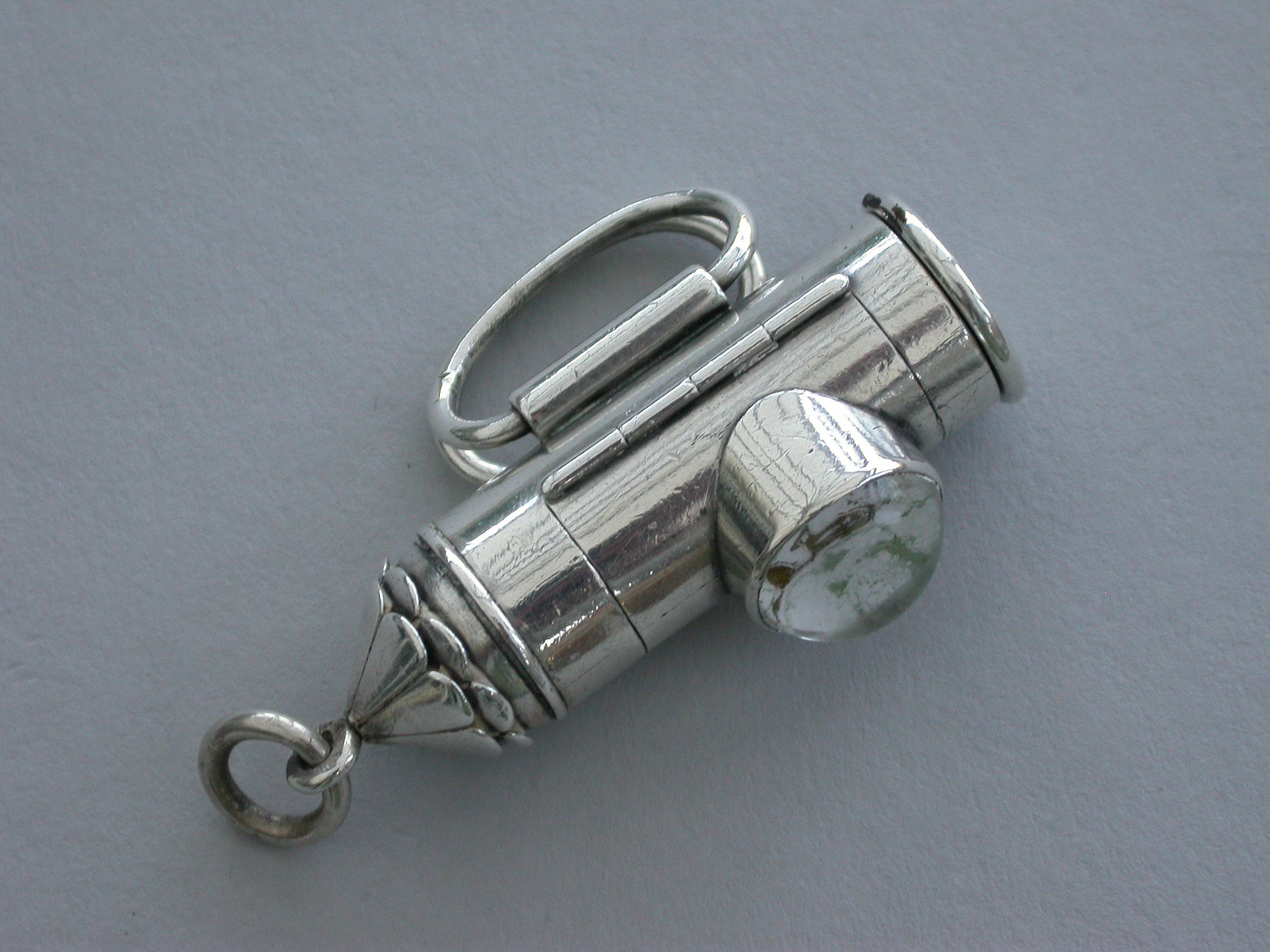 A rare Victorian novelty silver three drawer telescopic Propelling Pencil, made in the form of a Policeman's Bullseye Lantern, the body with a circular domed glass magnifying lens with green foil background. Two hinged carrying handles to the reverse and attached suspension ring. The telescopic pencil pulling out from the base.