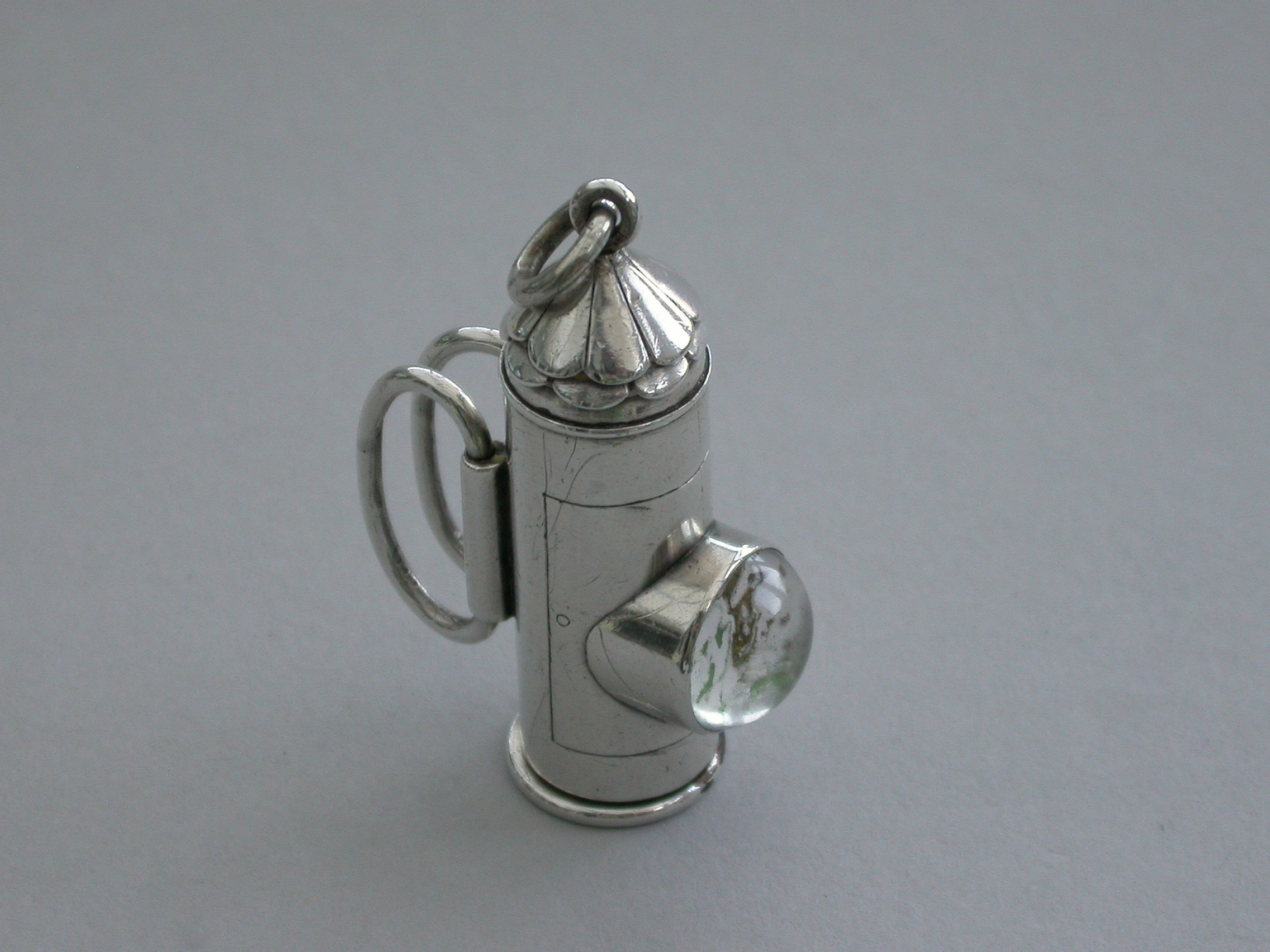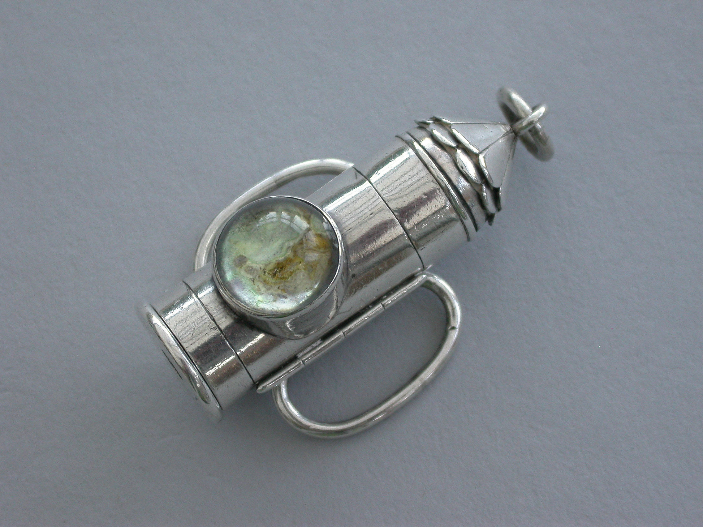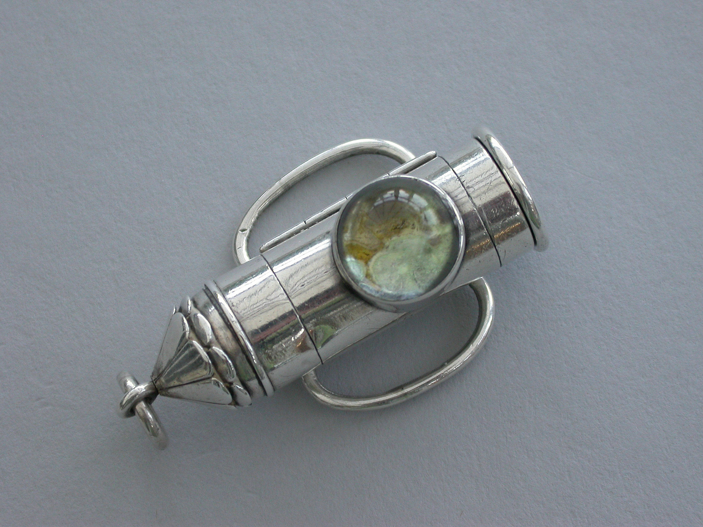 A rare Victorian novelty silver three drawer telescopic Propelling Pencil, made in the form of a Policeman's Bullseye Lantern, the body with a circular domed glass magnifying lens with green foil background. Two hinged carrying handles to the reverse and attached suspension ring. The telescopic pencil pulling out from the base.